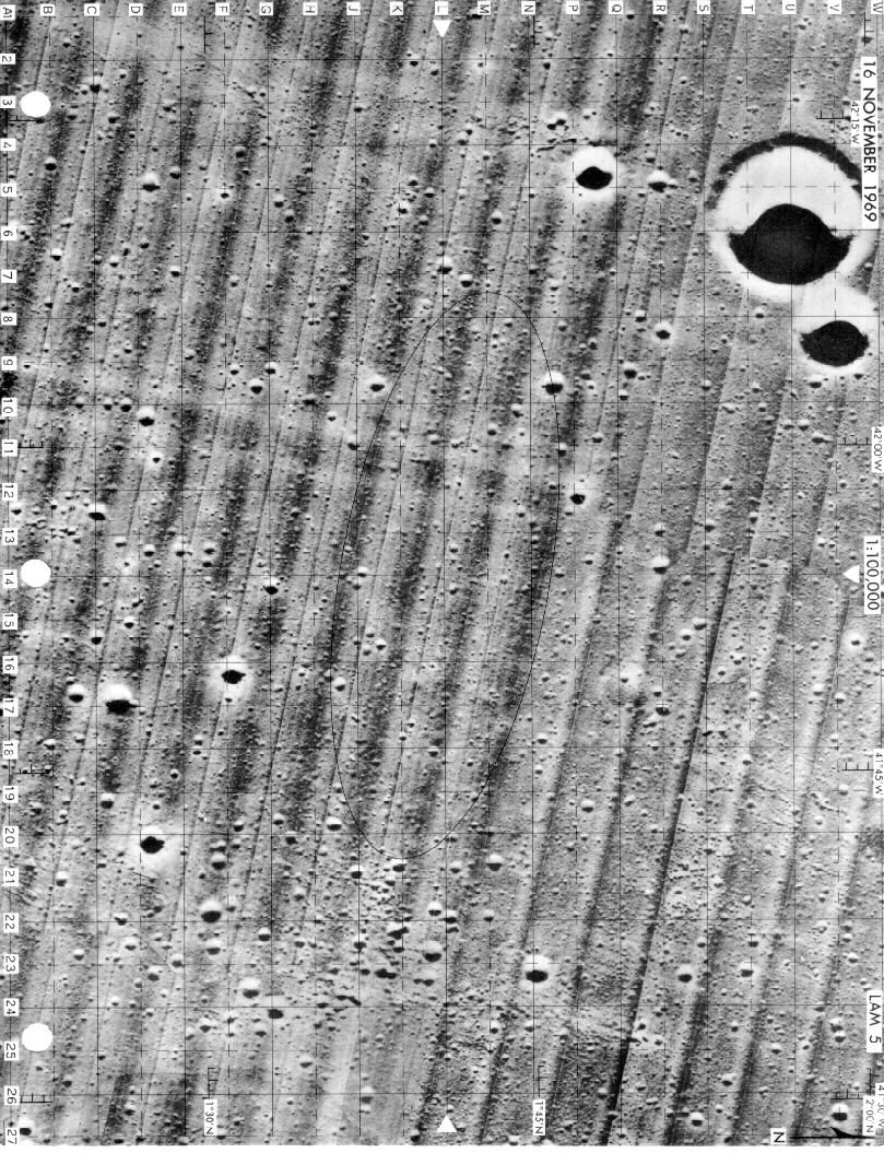 [Conrad - "Well, Neil's wasn't any biggie-wow spot, either. I mean, he wasn't ever going in the mountains or any of those places the other guys were going to do later. And we were just going in another mare, which was further west (than the Apollo 11 site) - I think."]