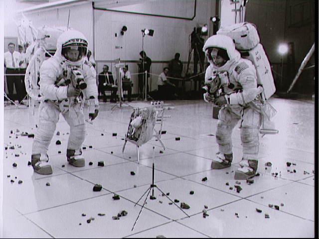 [The Close-up stereo camera to which Al referred is the so called Gold Camera, named for physicist Thomas (Tommy) Gold who had long maintained that the lunar surface was covered with a deep layer of very loosely compacted dust. This conjecture was due to radar reflections from the Moon which indicated a "fairy castle" structure. However, the radar waves only penetrated a very short distance into the surface and most people in the space community dismissed Gold's suggestion of a deep dust layer. Pictures transmitted by Luna 9 and by the Surveyor spacecraft showed large rocks sitting on the surface, proving to most people's satisfaction that the loose layer was only millimeters thick at most. The Gold Camera was a relic of the controversy, and was designed to provide close-up, stereo pictures of the surface. The pictures are striking but their scientific value probably doesn't match that of data returned by the other experiments flown during Apollo.]