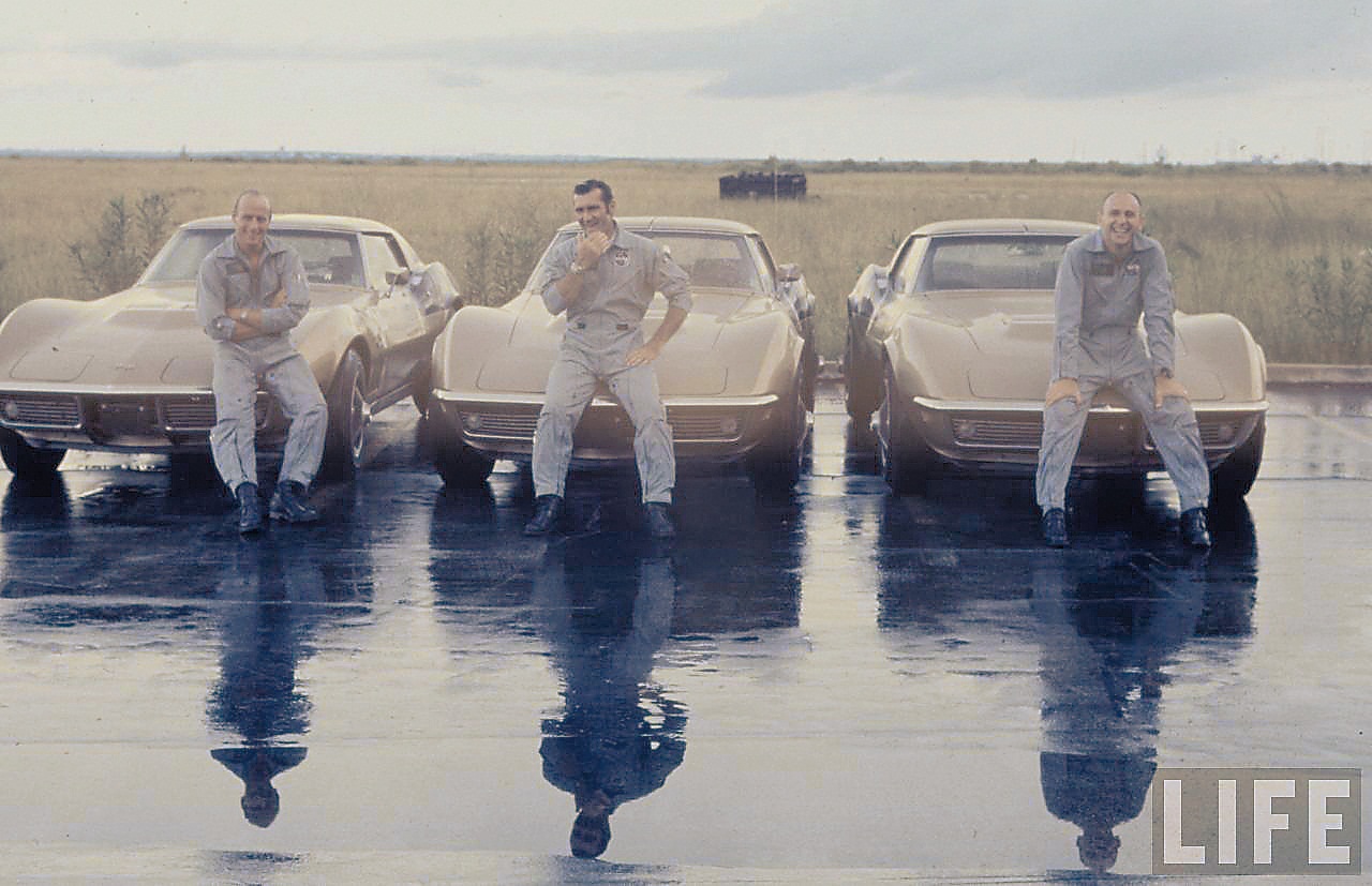 [During the Apollo era, Rathmann owned a car dealership at Cocoa Beach near the Cape. He was a friend of many of the astronauts. He was born in 1928 and, therefore, was only two years older than Pete and four years older than Al. Readers interested in the story of Rathmann and the crew's set of matching gold Corvettess should consult Andrew Chaikin's "A Man on the Moon". NASA photo KSC-69PC-621 shows Pete, Dick, and Al with one of the 'vettes. A Ralph Morse photo shows the crew with all three.]