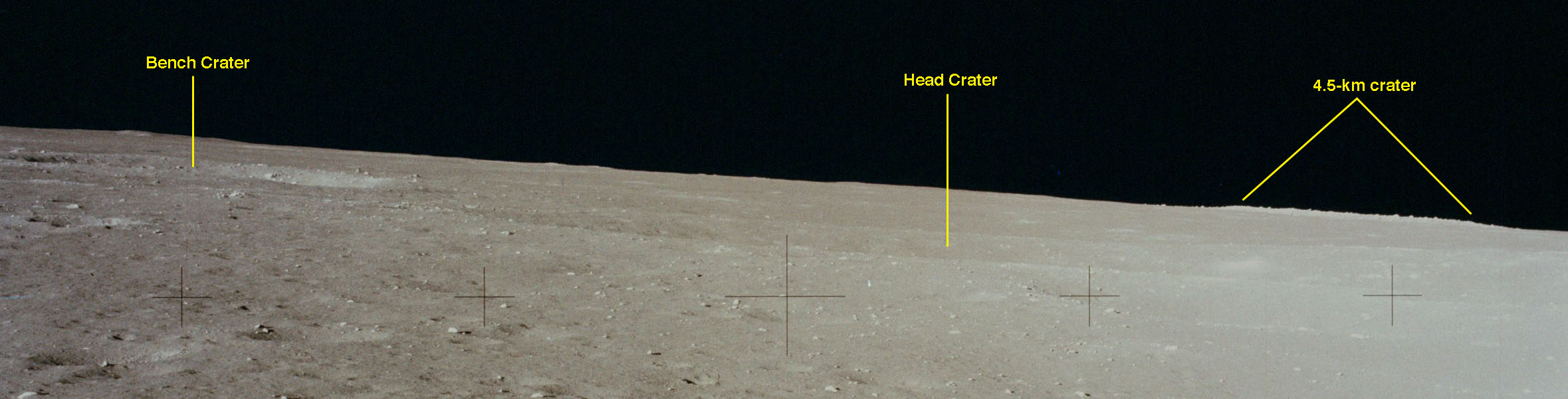 [The crater in question is Middle Crescent. It is about 450 meters (1500 feet) in diameter and the near rim is about 300 meters (1000 feet) from the spacecraft. As was common during Apollo, Al is underestimating distances and sizes.]113:04:57 Conrad: Also, Houston, I landed - not 20 feet behind me - if I peer around the corner of the window here, I'm right on the edge of another great big crater. (This is, of course, Surveyor Crater.) It falls away at a, oh, I'm going to say 10-degree slope at least, right behind us. We're right on the edge, we landed right past a fairly large crater. I'd say 300 to 400 feet in diameter. (Garbled) apparent to me to look for when I came in for a landing but (garbled) down (garbled) around the back. And I was going to (garbled) to keep them close to my (garbled) back about 50 feet.
