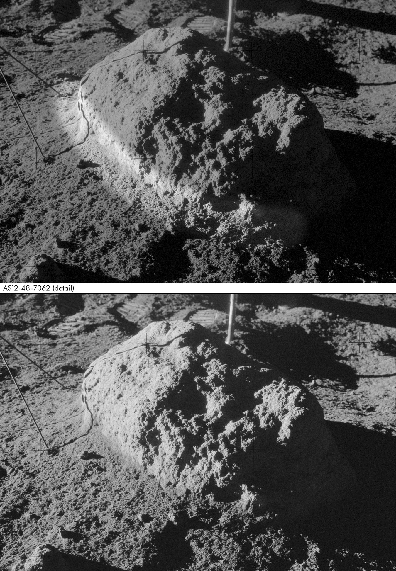 [Middle Crescent Crater is about 450-m across and the center of it is about 350 meters northwest of Head Crater at about F.0/8.0.]113:01:03 Bean: And I can't tell, of course, if it (the filleting)'s only from this direction or not (that is, he can only see the sides of the rocks facing the LM), but all these rocks seem to have the same characteristics, whether they are small or large. One interesting feature that is directly at our 12 o'clock, about 20 feet, is a whole surface area that's a bit different from the rest in the fact that it's got sort of parallel lines or parallel trenches or skin trenches perhaps an eighth of an inch deep and running what would be north to south to us; and you can see it from about my 2 or 3 o'clock position, all the way over to Pete's window. The left seems to... Some sort of force has apparently caused these traces to be made in the surface. I don't think it was our engine, because, as I say, they are perpendicular to the lines that our engine would have made. We'll be able to get a better look at that when we get out, of course; and we'll also be able to use that close-up stereo camera on it and just get some good pictures of it.[Many exposed lunar boulders have skirts of dirt surrounding them, called "fillets". On level surfaces away from the LM, the fillets are the result of ejecta from small impacts splashing against the sides of the rock and then building up at the base. To the extent that impacts of various sizes occur at random distances and directions, the fillet will tend to be the same height all the way around the base of the rock. Rocks which have been exposed longer than others will have higher fillets. In addition, a larger-than-normal nearby impact or a large, distant one could create a higher fillet on one side of a rock. On hillsides and on the inner walls of craters, fillets can build up on the upslope sides due to downslope movement of regolith; and, of course, near the LM some filleting would be expected due to the engine exhaust. A detail from AS12-48-7062 is shown in two versions, with the fillet highlighted in the upper version. ]