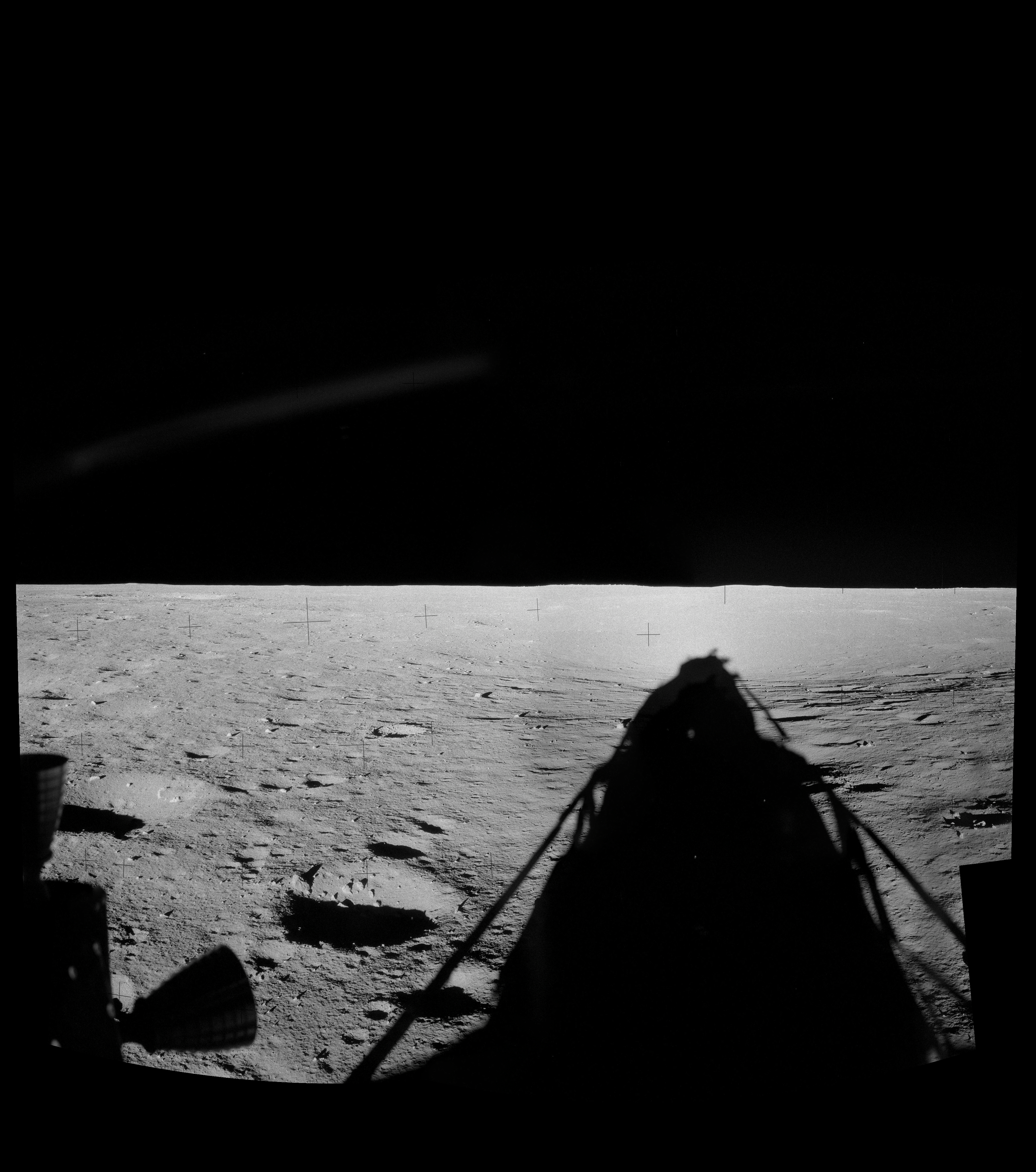 [In the window pans, note that the LM shadow is well to the left of the spacecraft center line.]