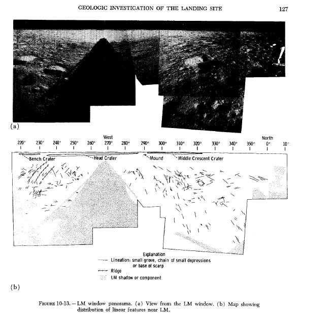 [The spacecraft is rotated about 10 degrees clockwise so that, if Al is using a spacecraft centered clock, 12 o'clock would correspond to an azimuth of about 280. If, on the other hand, he is using the LM shadow to define his clock, 12 o'clock would be an azimuth of 270. Each hour on the clock corresponds to 30 degrees of azimuth and, for a spacecraft-centered clock, 1 o'clock would correspond to an azimuth of about 310 which is, indeed, the direction of the center of Middle Crescent Crater.]113:01:58 Bean: Pete also pointed out that there doesn't seem to be any possibility here of seeing anything like a contact between different-colored surfaces. There may be a chance to notice the contacts or different materials by looking at the texture: for example, that area that I described as directly in front of the LM that has those north-south lines on them. But, other than that, it just looks like one uniform surface with many, many craters in it. There's no immediately-apparent white-rim craters near us. Most of the ones that I can see out my window don't have a raised rim at all. They don't have any particular elongation. They seem to be - just from glancing at them - about the same texture as the areas surrounding them. (Pause)[Bean - "I think the 12 o'clock is referenced to the spacecraft."]