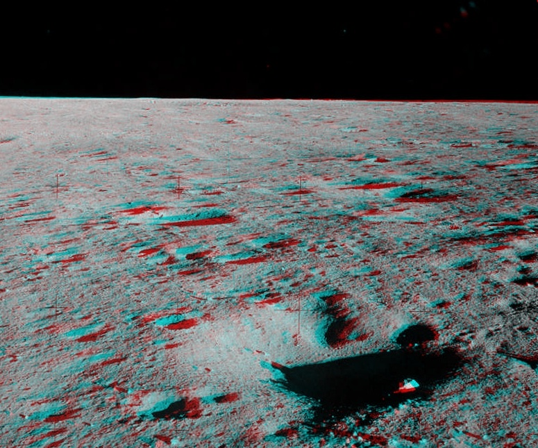 [A red-blue anaglyph ( 502k ) created by Erik van Meijgaarden from frames 7029 and 7032 shows a striking pattern of parallel, linear features. However, Al described the pattern as running north-south, whereas the pattern in the anaglyph appears to be oriented perhaps 10-20 degrees north of down-Sun.]113:01:54 Gibson: Roger, Intrepid.