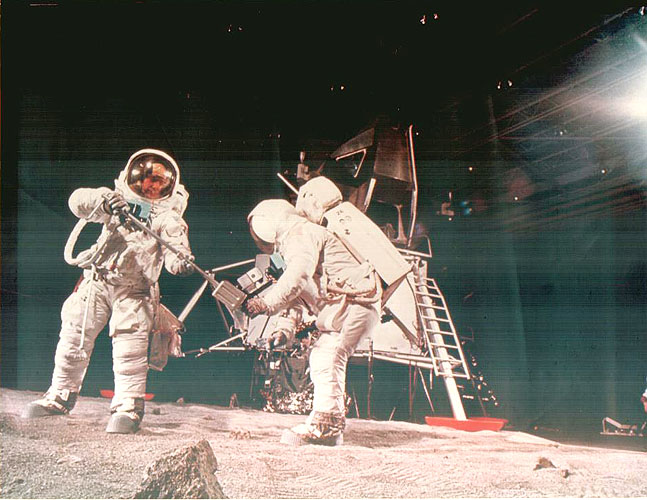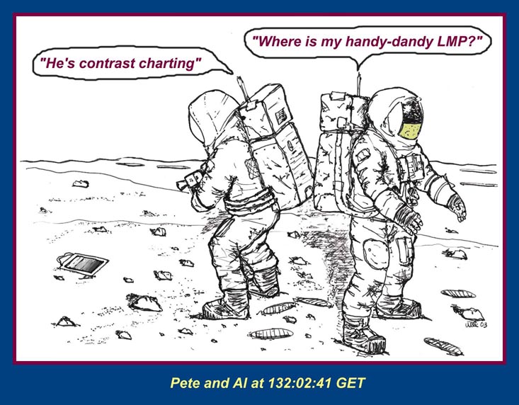[Comm Break. While he waits for Al to get the LEC and ETB ready, as per checklist, Pete is loading equipment on the Hand Tool Carrier. Note that Al is putting a color magazine in the ETB. This is intend for use in Surveyor Crater. Before they leave the LM, it ends up in Al's saddlebag but never gets used. Indeed, it is still in the saddlebag - or what's left of the saddlebag - in the ladder footpad.]131:40:25 Conrad: One of these contrast charts fell down here yesterday, Al. So there's only two good ones; the other one's too dirty.