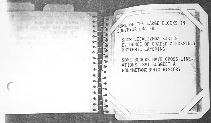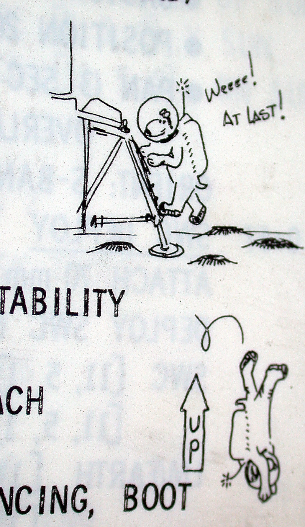 Detail showing the cartoon by Ernie Reyes (541k). Note, also, the bonus comment that begins, "Color/Albeano Variations". Normally, this would read "Color/Albedo Variations" Pete Conrad and others referred to Al Bean as "Beano" Al Bean told Lotzmann in a September 2000 conversation that he didn't remember having noticed the play-on-words before. Lotzmann reports that Al got a good laugh, more than thirty years after the back-up crew first wrote the joke. As a follow-up, in September 2002 Lotzmann wrote to CapCom Ed Gibson, "In the attached checklist page, you'll find the term ALBEANO, instead or ALBEDO. Did you have something to do with this 'modification' of the geological term?" Gibson replied, "I'm afraid so. We used that term several times in training, just to pull Al's chain, although I think he was concentrating so much on the procedures it went right by him."EVA-2 Surveyor Site 2+00 (Doc. Sample, Surveyor Activities) ( 72k )