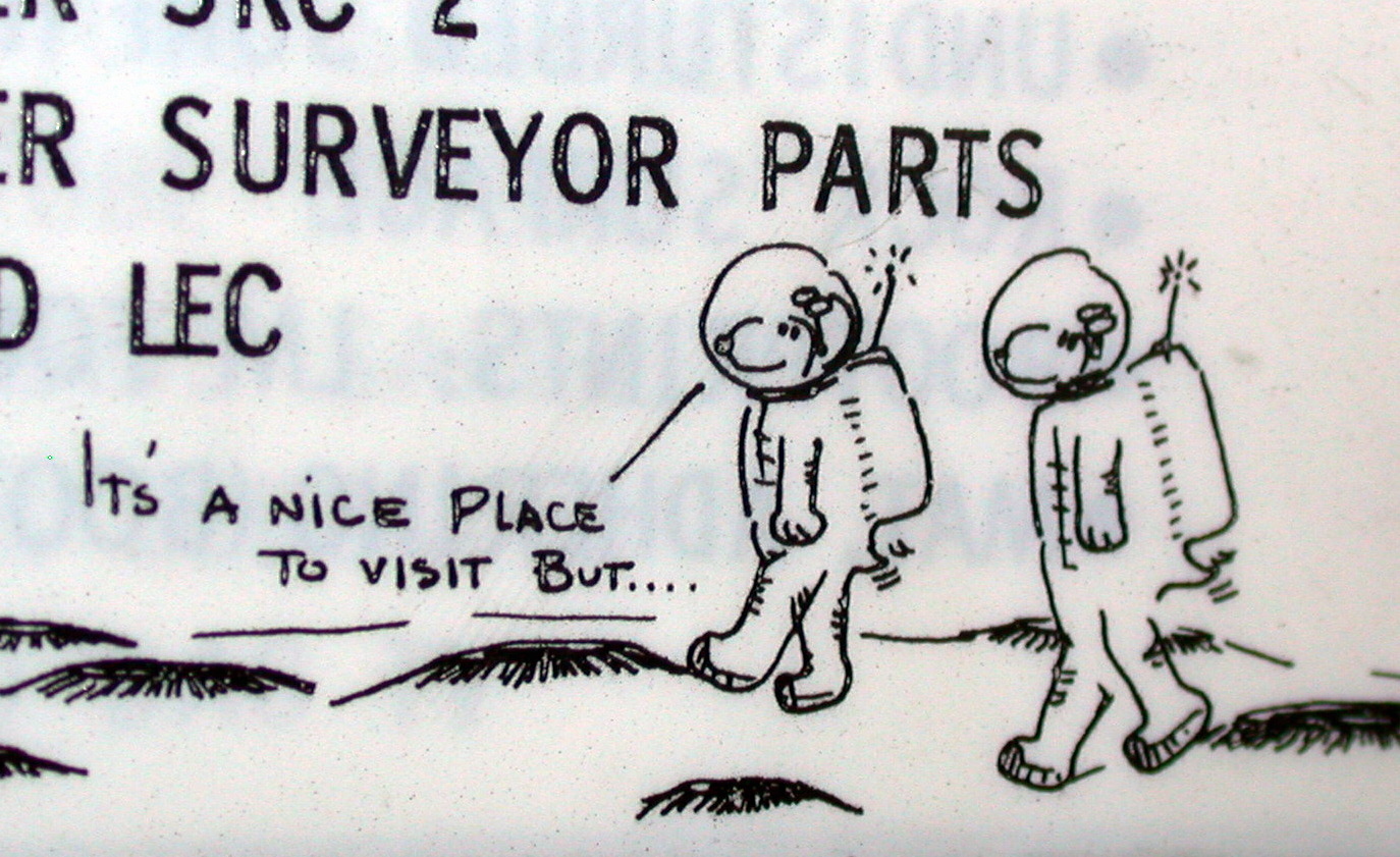 Detail showing the cartoon by Ernie Reyes (307k).EVA-2 LMP Activities at Surveyor and 2+45 (Trav Complete, Stereo Close-ups) ( 1148k )