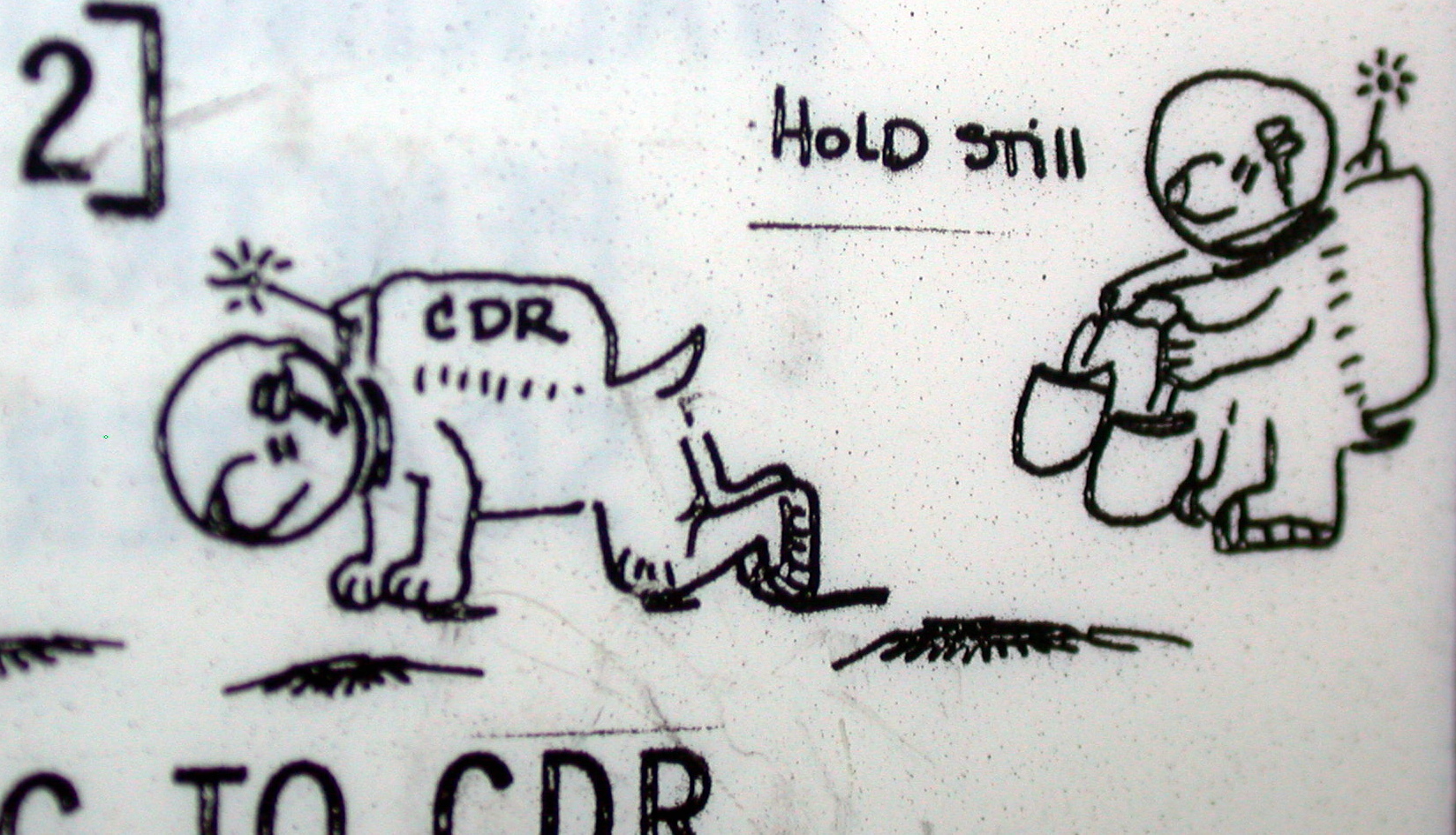 Detail showing the cartoon by Ernie Reyes (299k).EVA-2 0+10 to 0+18 (Pre-Egress, LMP Egress) ( 60k )