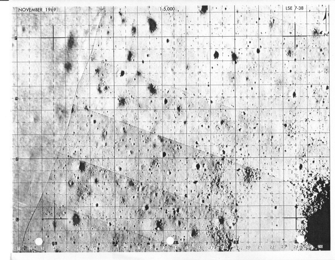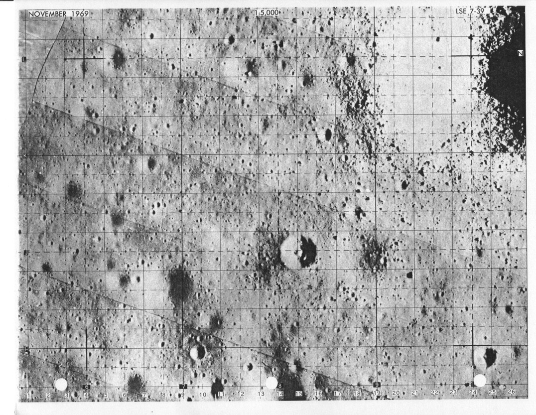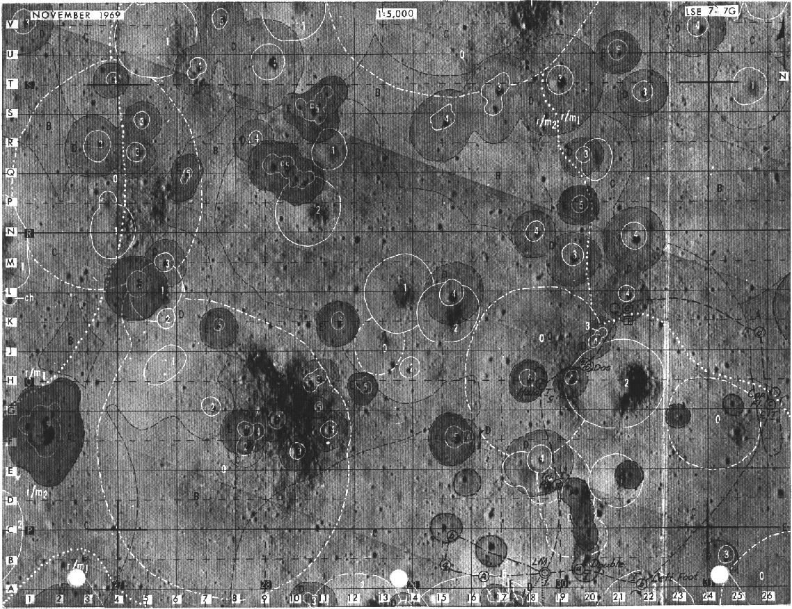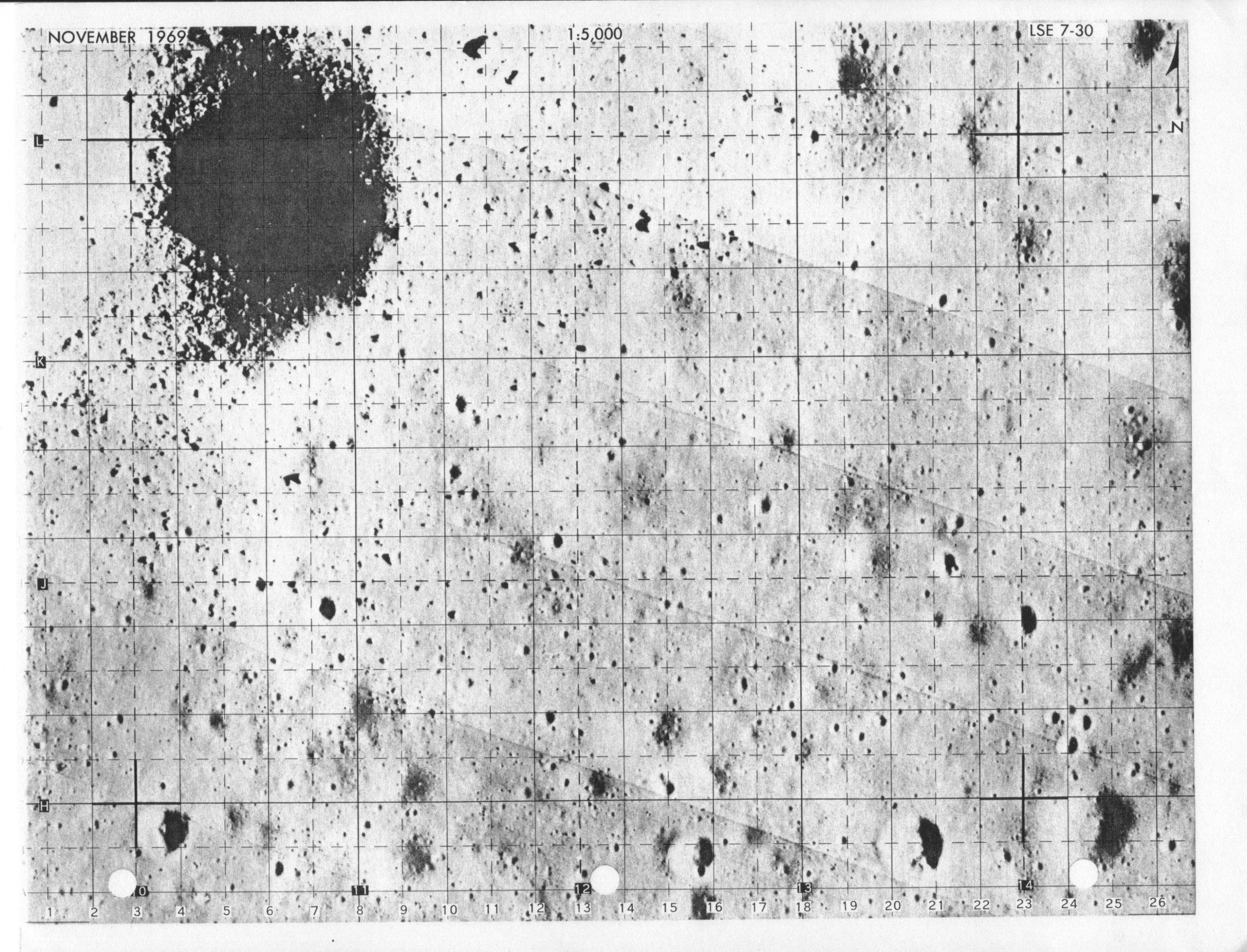 This later map shows five regions, each of which contains one of the five possible Apollo Landing Sites considered for the first landings. These sites were numbered, from east to west, ALS-1 to ALS-5. The sites initially considered for Apollo 12 were ALS-4 and ALS-5, which are in IIIP-11 and IIP-13, respectively. Don Wilhelms's book, To a Rocky Moon, contains a wealth of information about site selection. Data from the first three Lunar Orbiter missions are discussed in pages 150-161; and selection of the Apollo 12 site is discussed in pages 213-217. A labelled version shows the actual Apollo 12 site.Lunar Orbiter View of the Landing Ellipse (S69-57076) ( 2.1 Mb or 0.4 Mb )