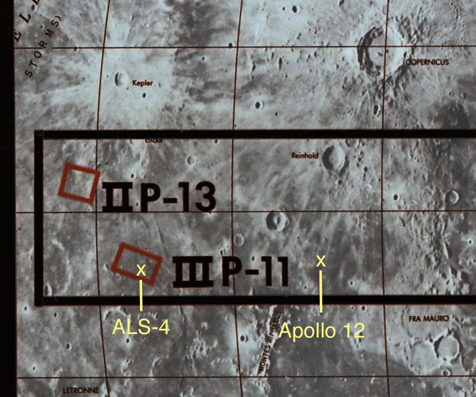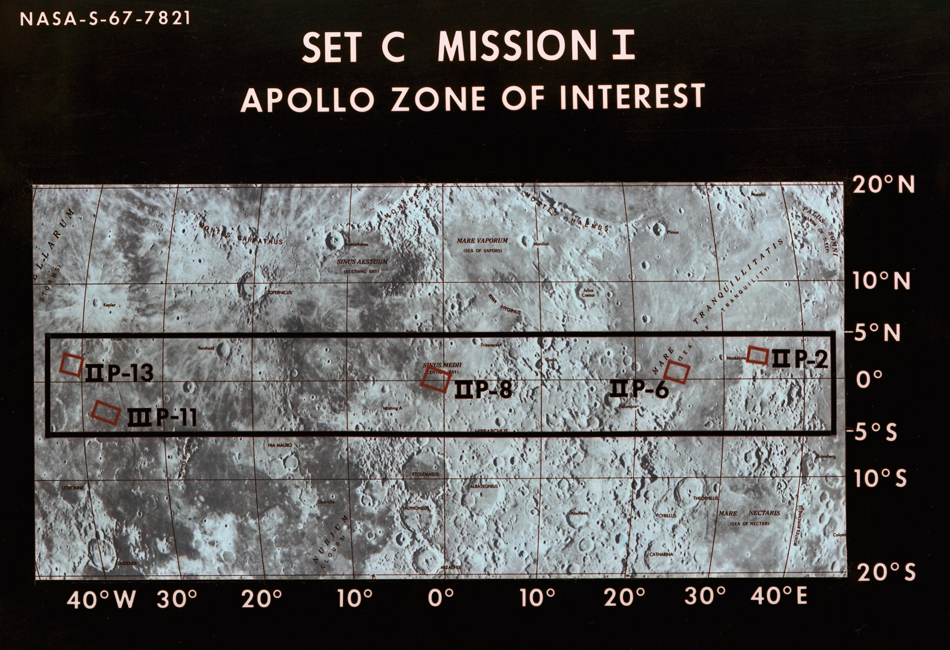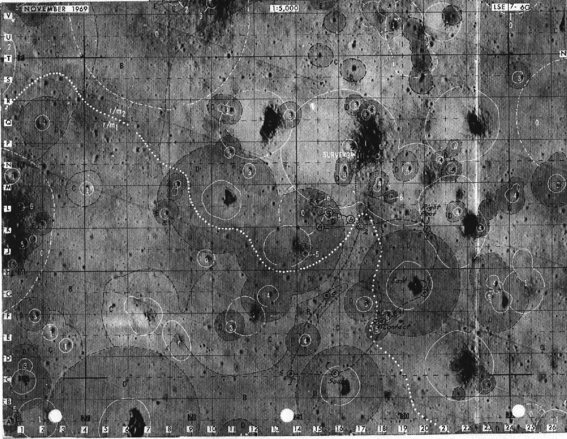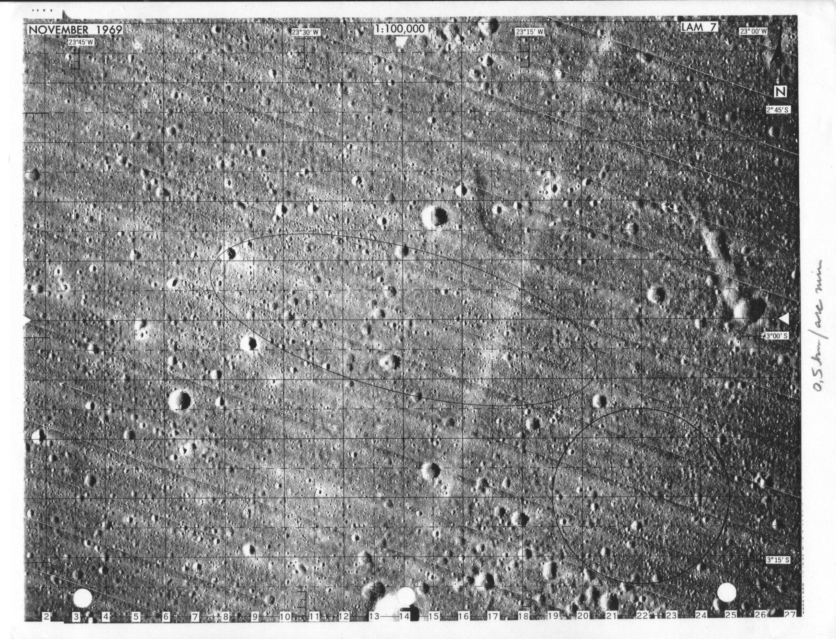 This later map shows five regions, each of which contains one of the five possible Apollo Landing Sites considered for the first landings. These sites were numbered, from east to west, ALS-1 to ALS-5. The sites initially considered for Apollo 12 were ALS-4 and ALS-5, which are in IIIP-11 and IIP-13, respectively. Don Wilhelms's book, To a Rocky Moon, contains a wealth of information about site selection. Data from the first three Lunar Orbiter missions are discussed in pages 150-161; and selection of the Apollo 12 site is discussed in pages 213-217. A labelled version shows the actual Apollo 12 site.Lunar Orbiter View of the Landing Ellipse (S69-57076) ( 2.1 Mb or 0.4 Mb )
