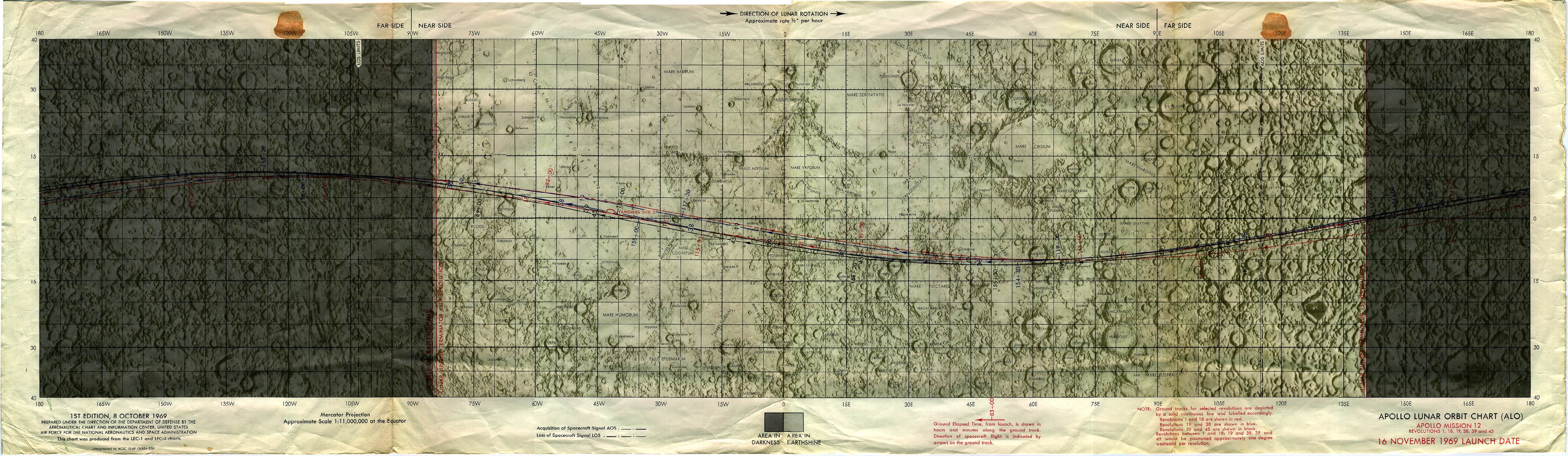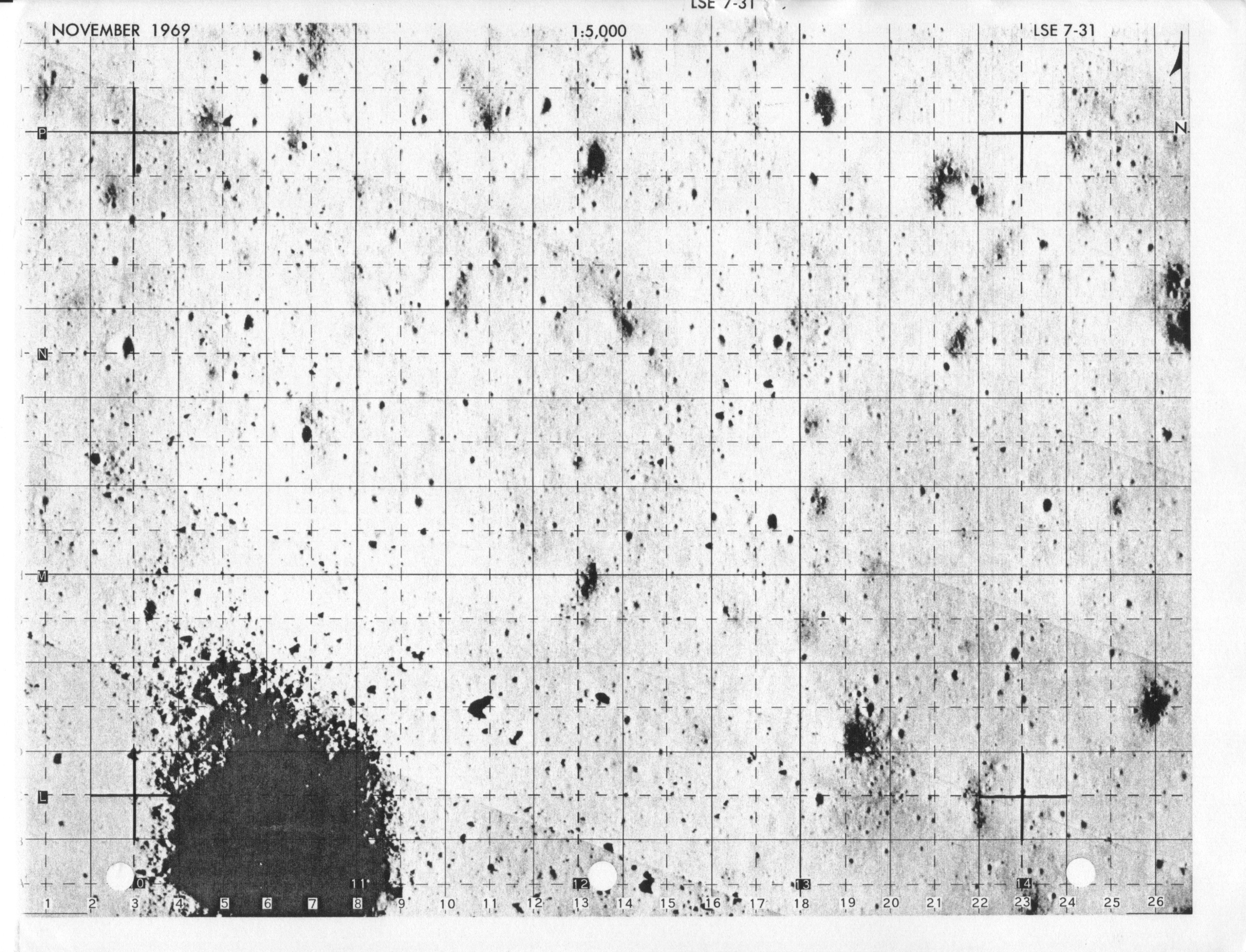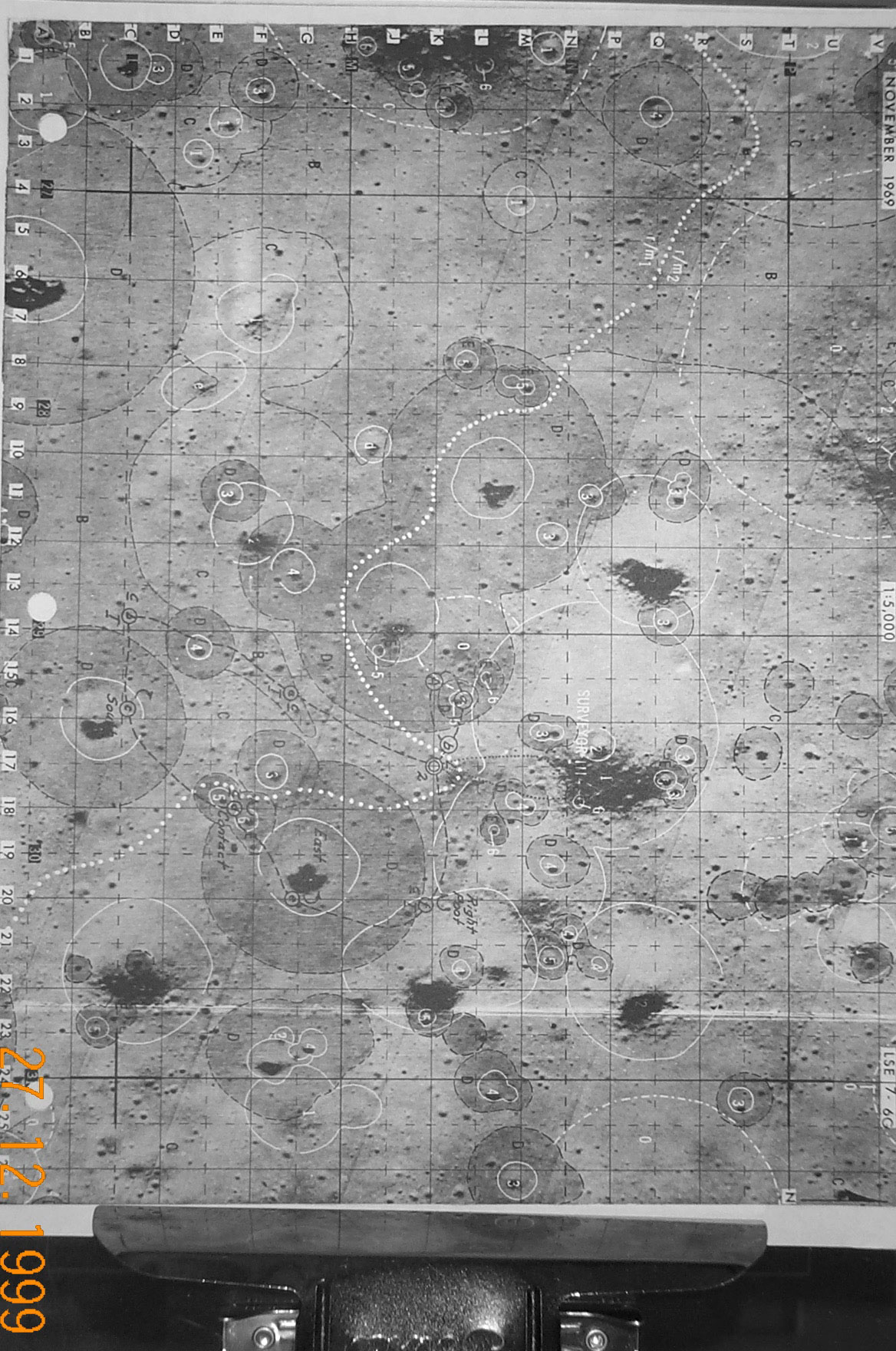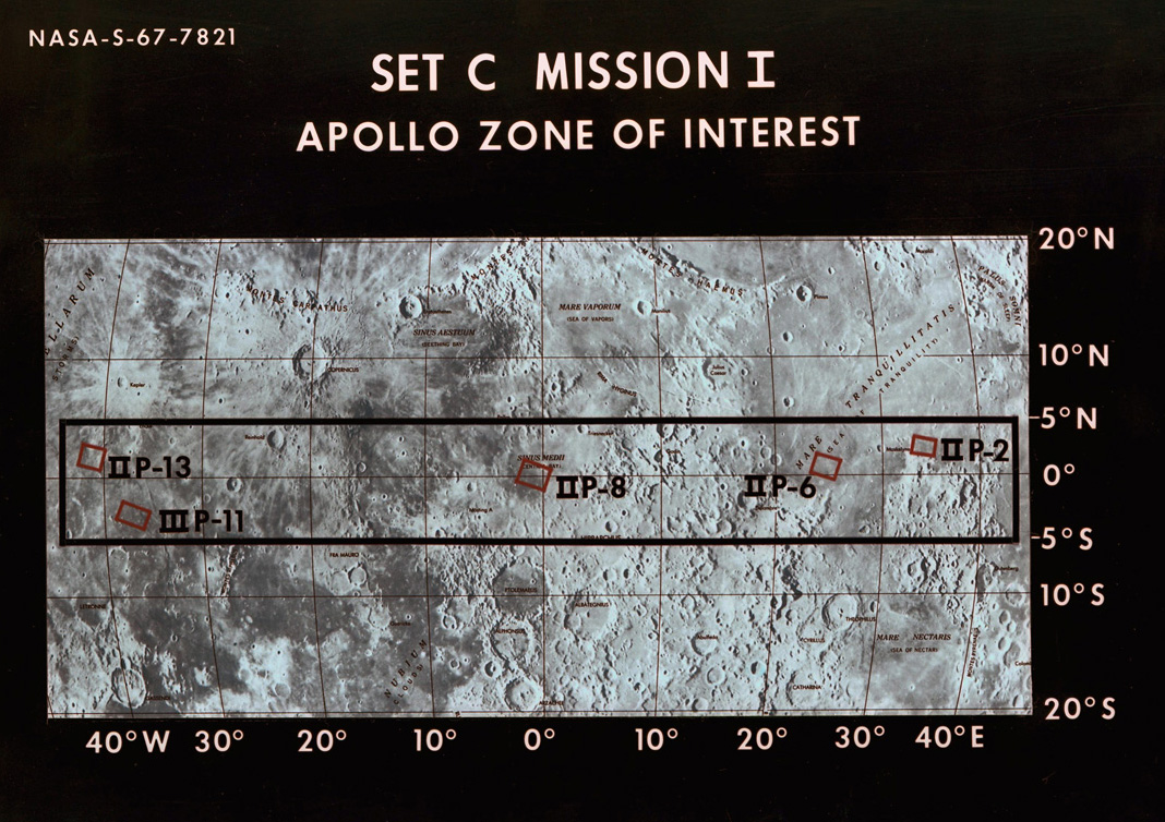 This later map shows five regions, each of which contains one of the five possible Apollo Landing Sites considered for the first landings. These sites were numbered, from east to west, ALS-1 to ALS-5. The sites initially considered for Apollo 12 were ALS-4 and ALS-5, which are in IIIP-11 and IIP-13, respectively. Don Wilhelms's book, To a Rocky Moon, contains a wealth of information about site selection. Data from the first three Lunar Orbiter missions are discussed in pages 150-161; and selection of the Apollo 12 site is discussed in pages 213-217. A labelled version shows the actual Apollo 12 site.Lunar Orbiter View of the Landing Ellipse (S69-57076) ( 2.1 Mb or 0.4 Mb )