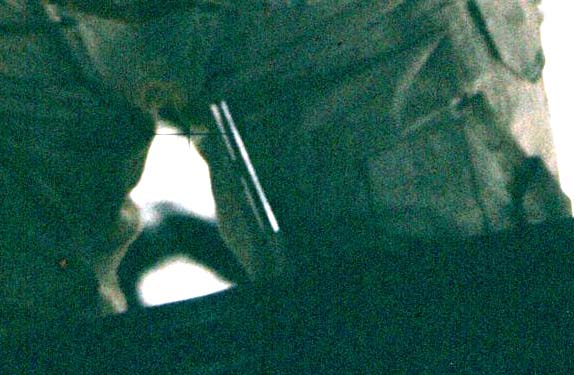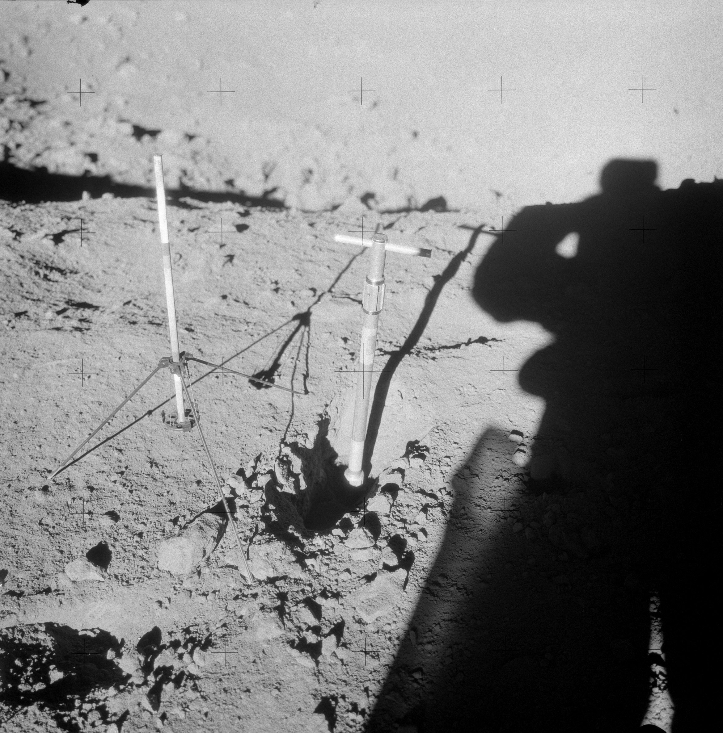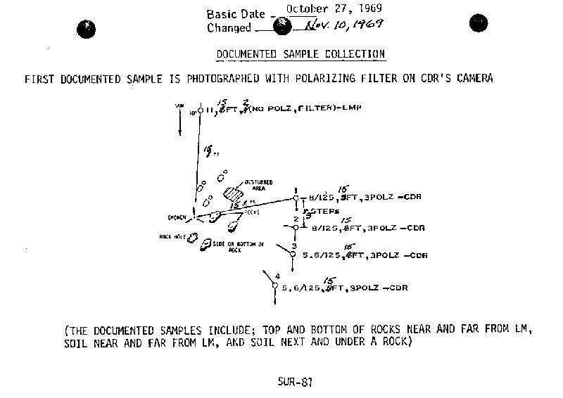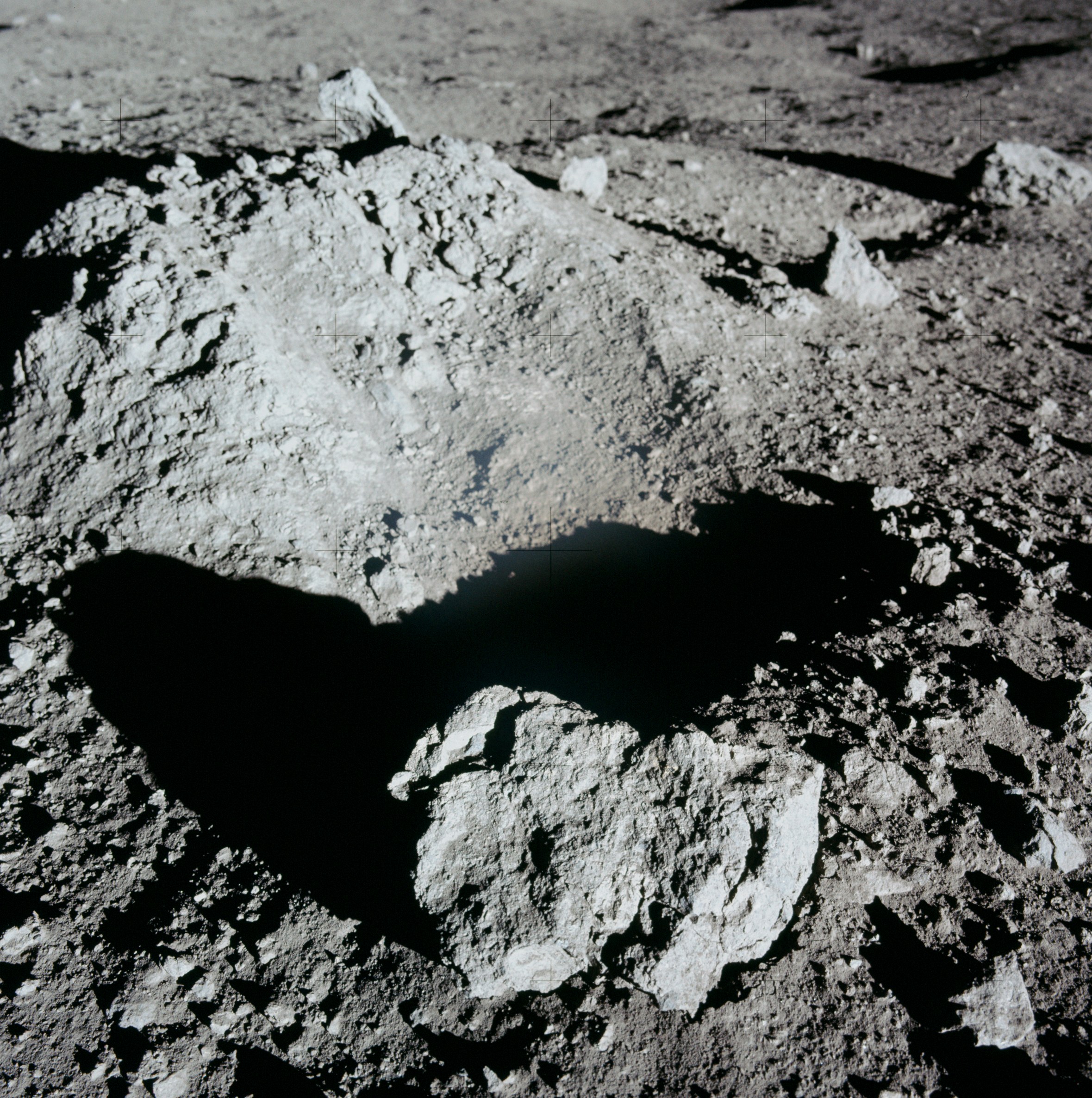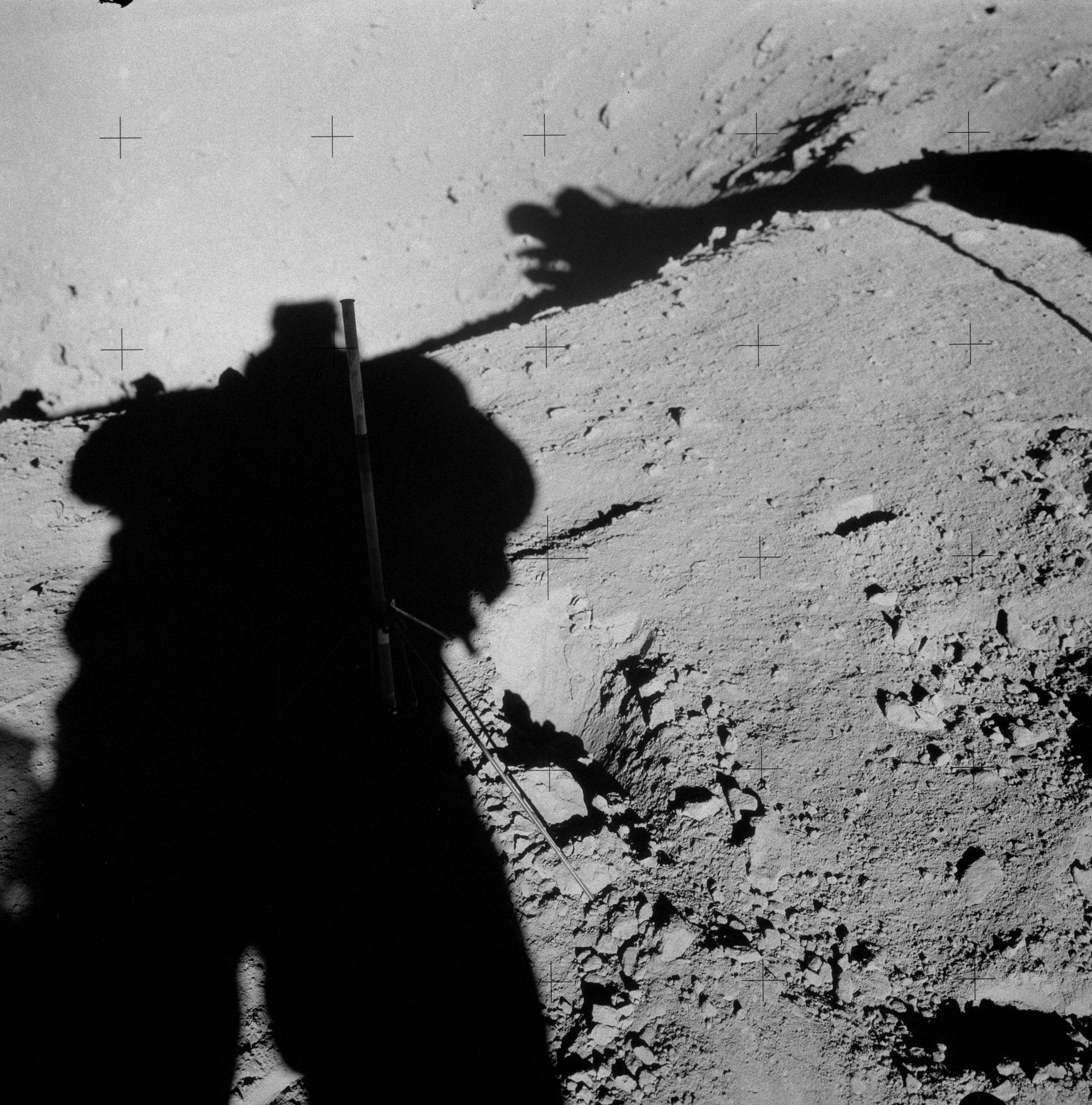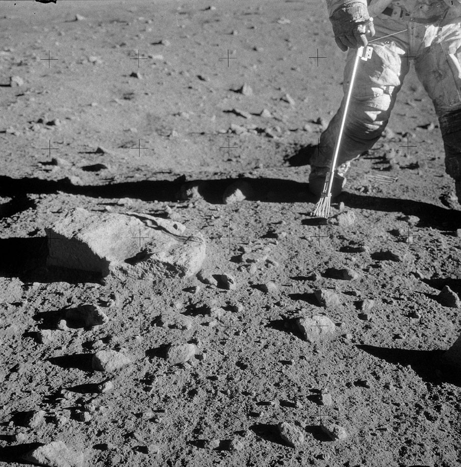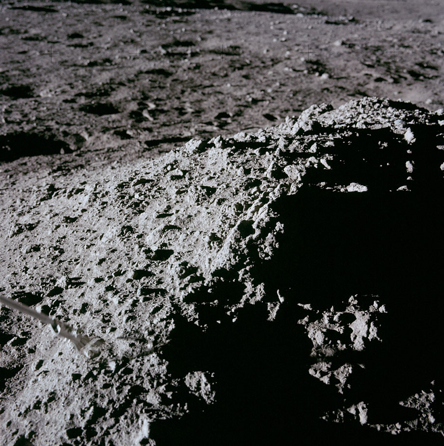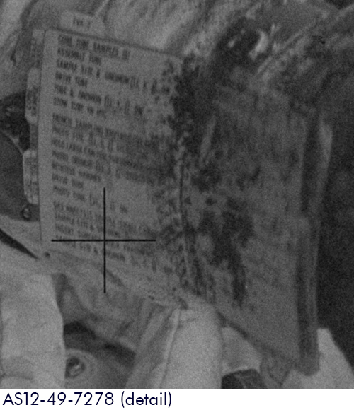 133:38:37 Pete has just collected a sample and is holding the scoop just above the spot so that Al can take a documentation photo. Ideally, the crew was to have taken a "before" picture of the sample to show its pristine condition and an "after" to show which of the rocks in the before scene was the one actually collected. At the very least, this photo gives a view of the rock so that, in the event that it becomes separated from its sample bag, it can still be identified. Remarkably, this rock seems not to have made it back to Earth. One possibility is that it fell out of the HTC, unnoticed, while Pete and Al were rummaging among the samples starting at 134:00.AS12-49-7313 (OF300) ( 212k or 1100k )