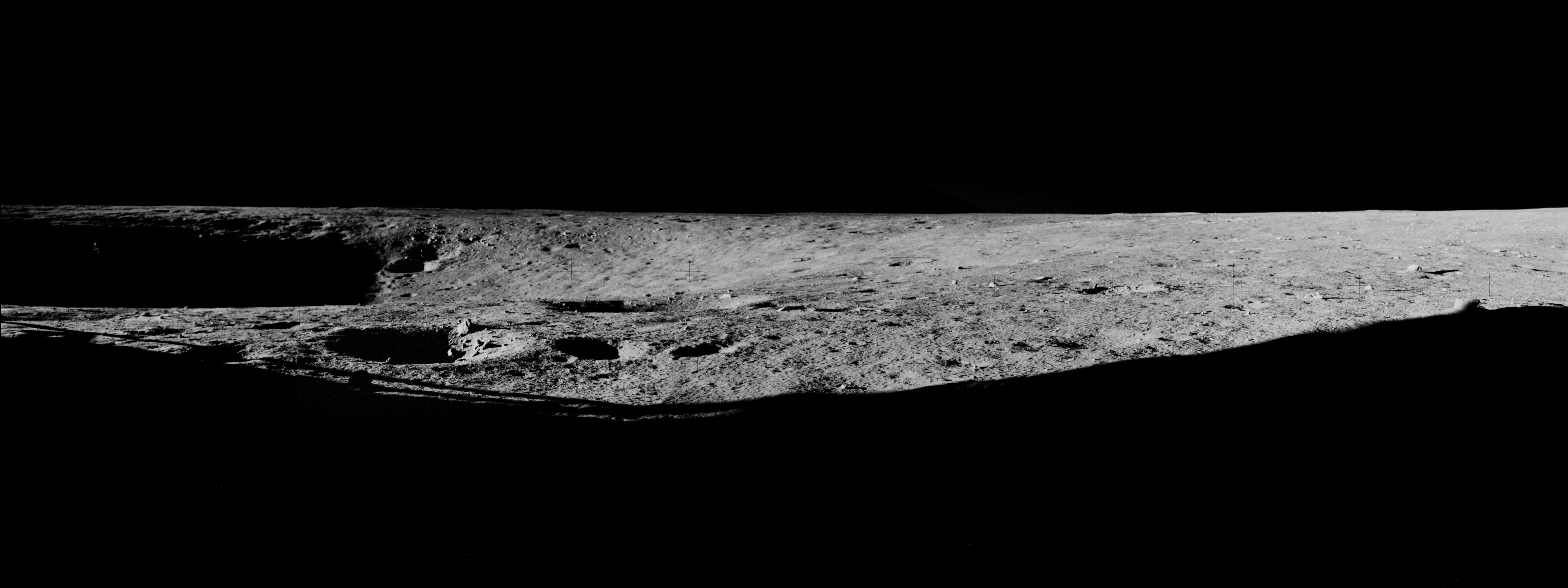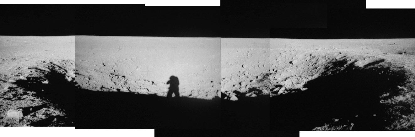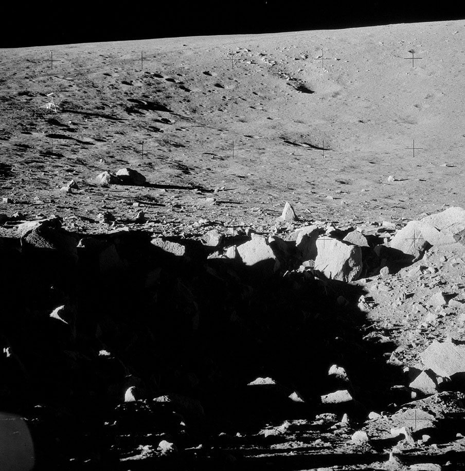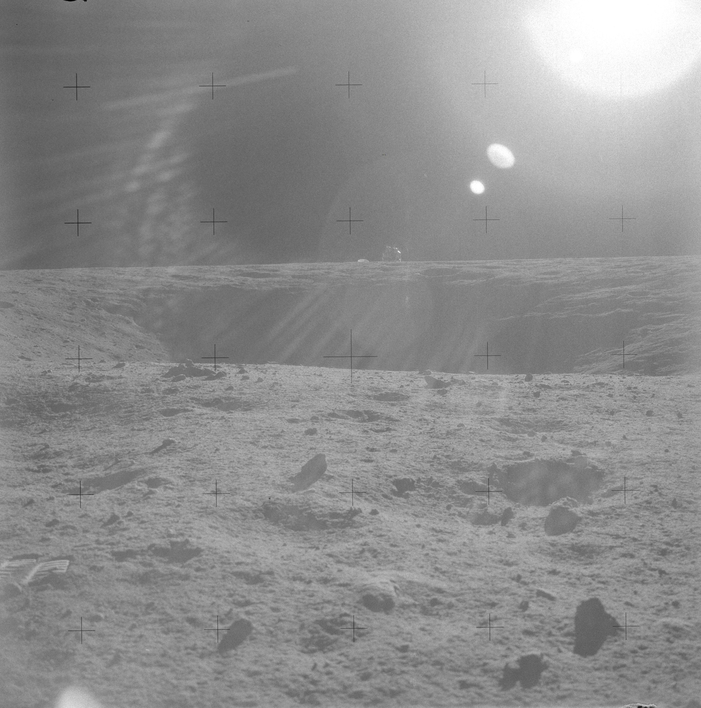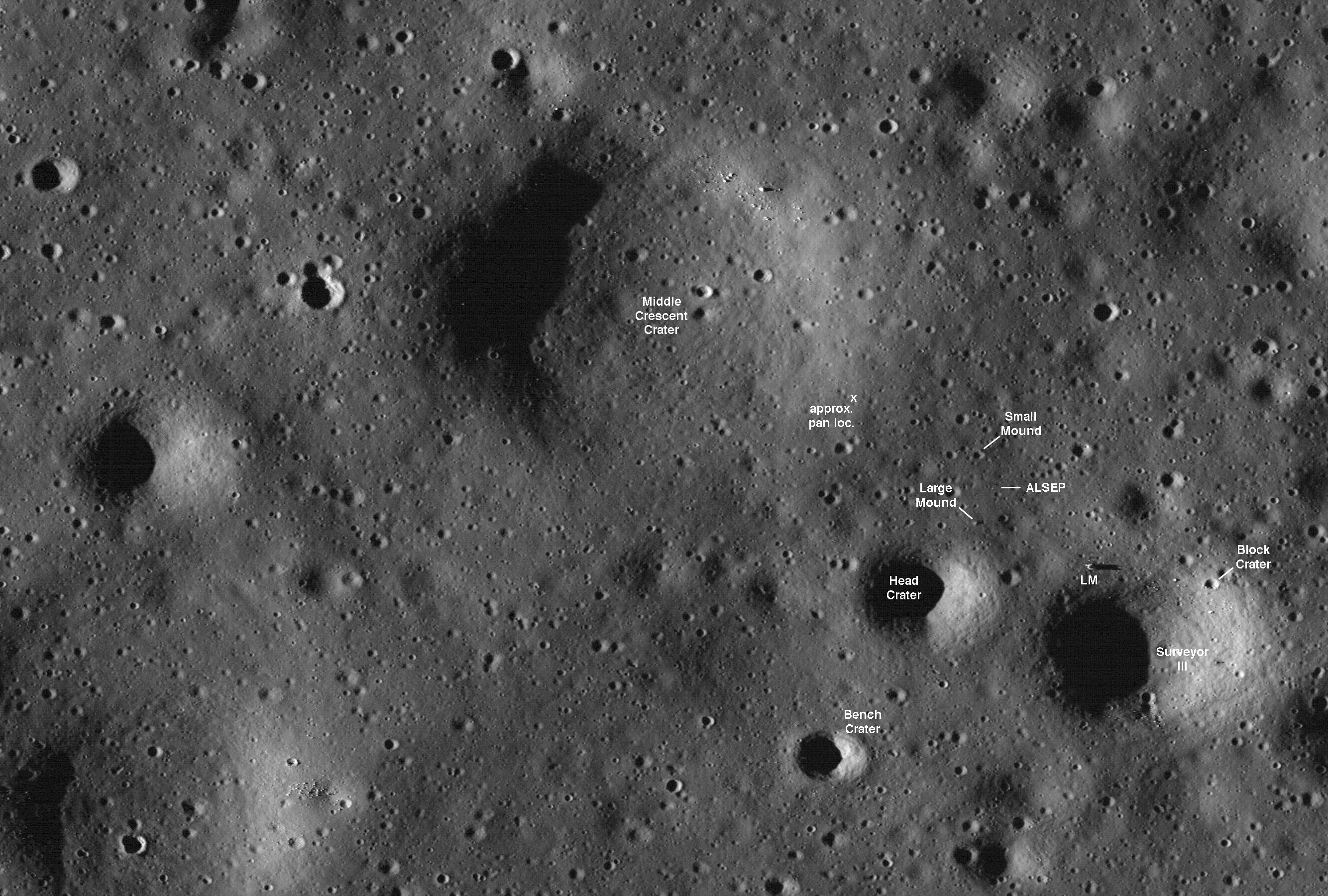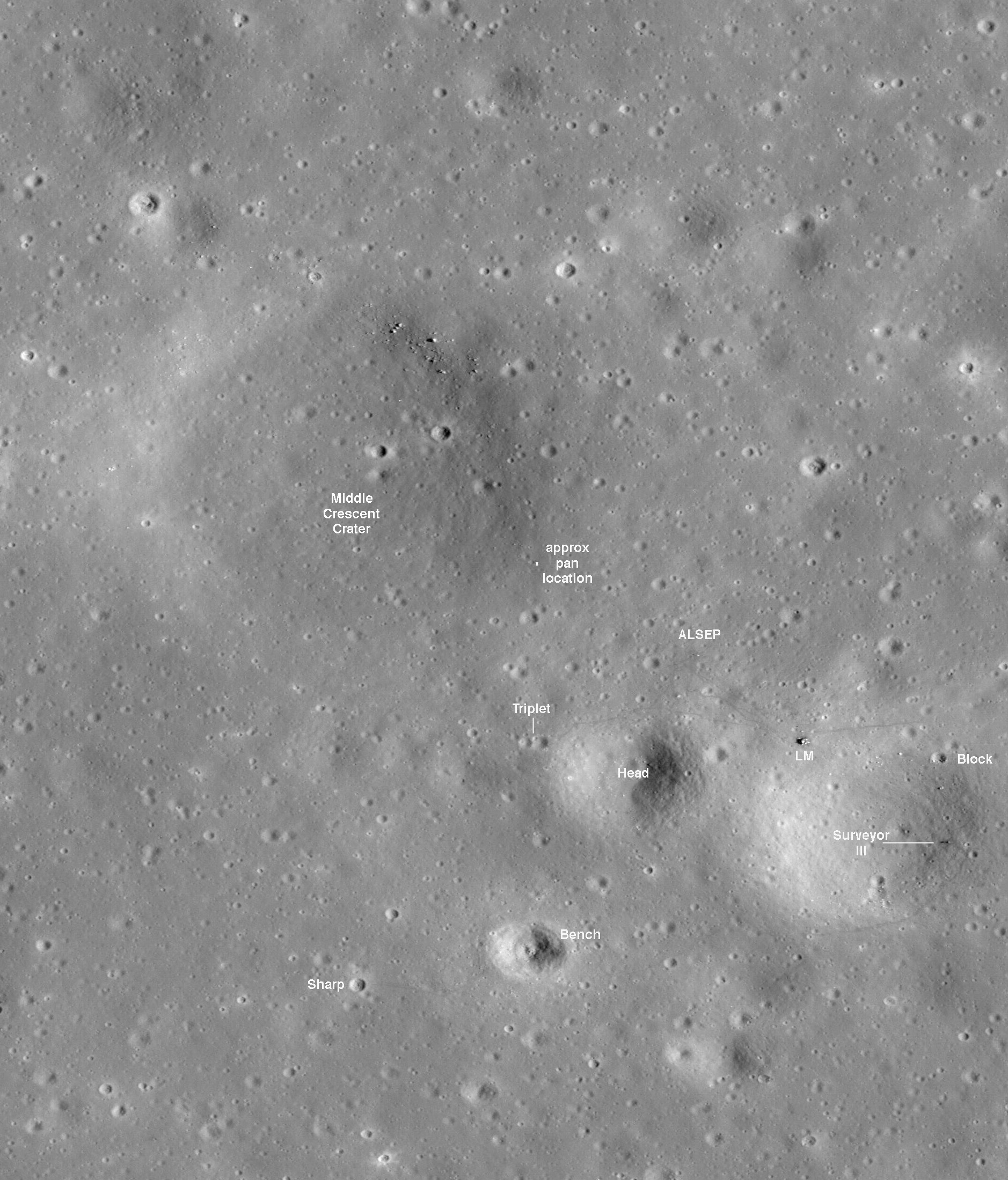 The raw image is M114104917R. See, also, a labeled version ( 0.8 Mb ). A labeled 2x detail shows features at the ALSEP site. Late in EVA-1, Pete and Al ran out to the rim of Middle Crescent Crater, where Pete took a pair of partial pans showing the crater. A variety of craters and boulders in the crater are identified in a comparison ( 5.1 Mb ) between Pete's first pan and the 29 Nov 2009 LROC image.09 January 2010 04:27:29 UTC; Solar El/Az 9.3/270.5; LRO altitude 43.1 km; resolution 0.49m/pixel ( 8.4 Mb )Deconvolved, 0.25 m/pixel (3.1 Mb TIF) and 0.5 m/pixel (3.4 Mb TIF) versions by GoneToPlaid.