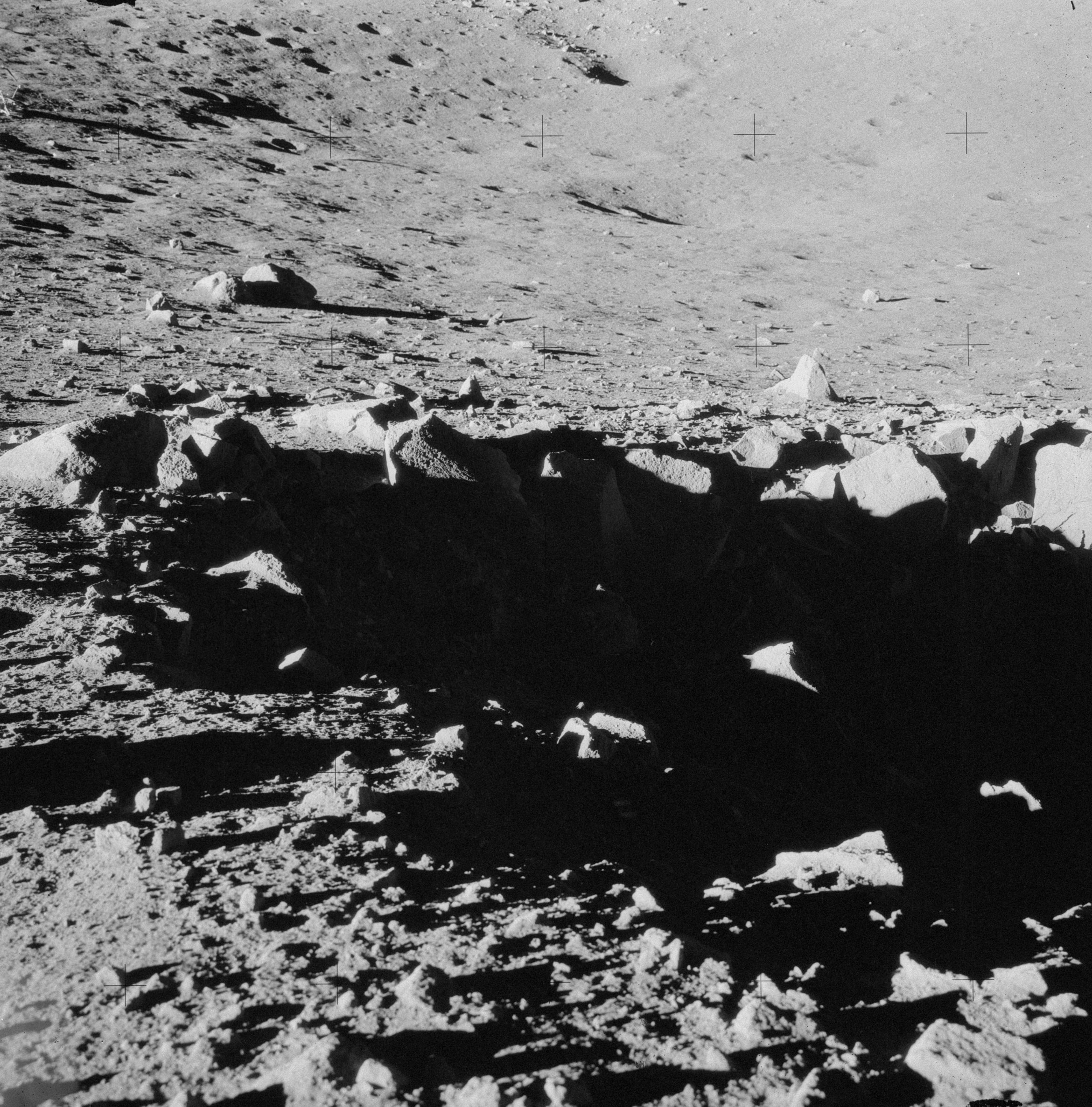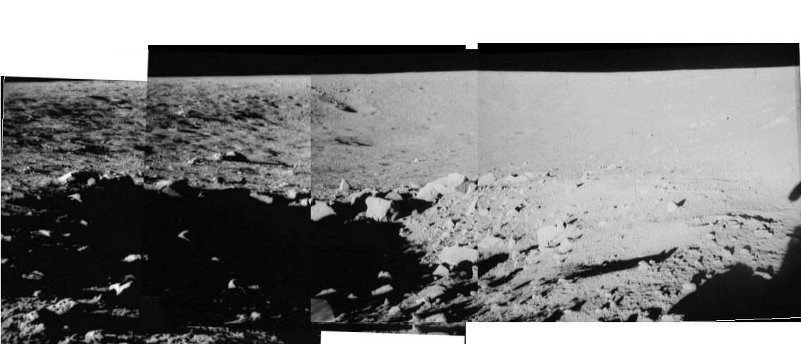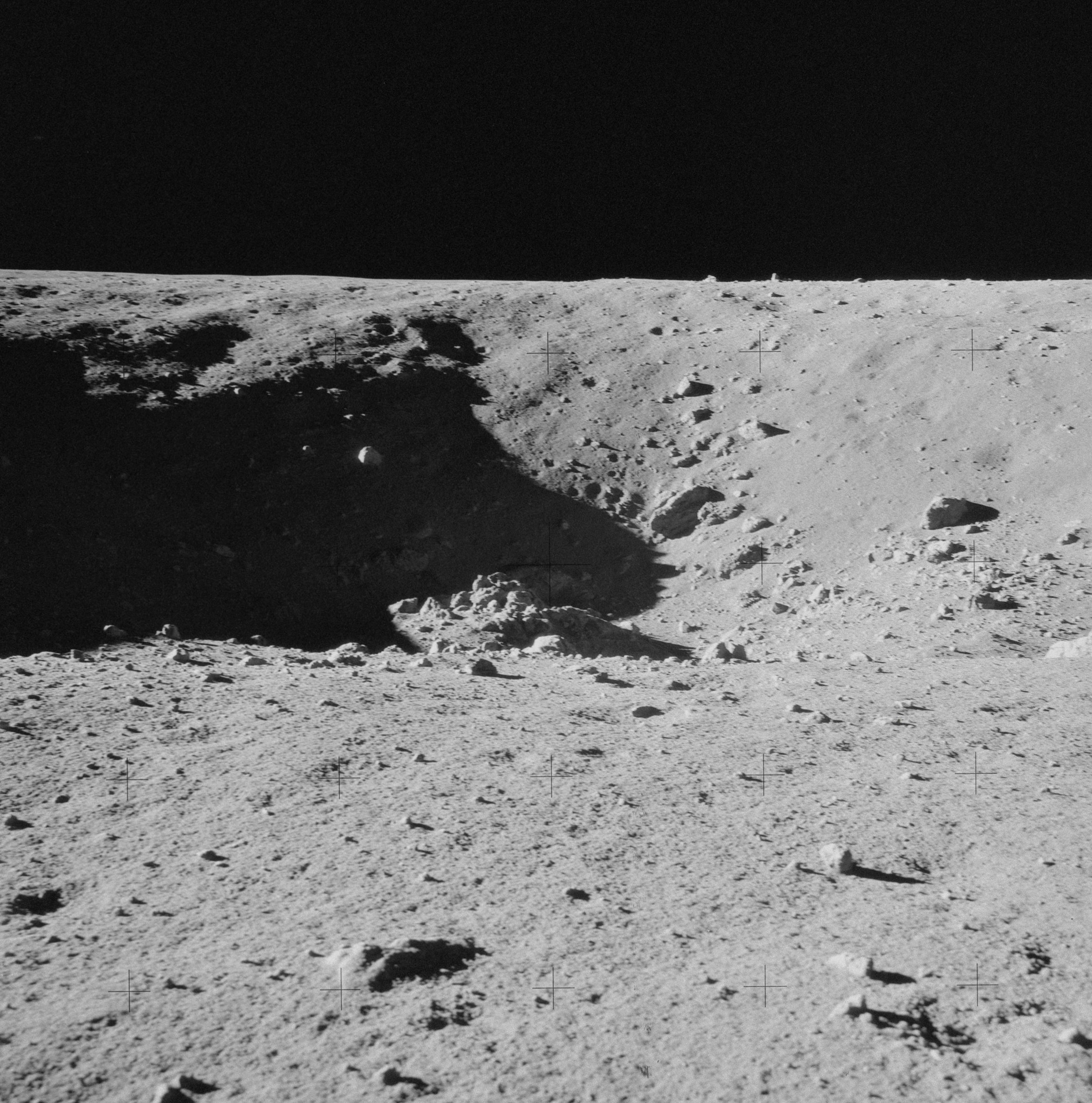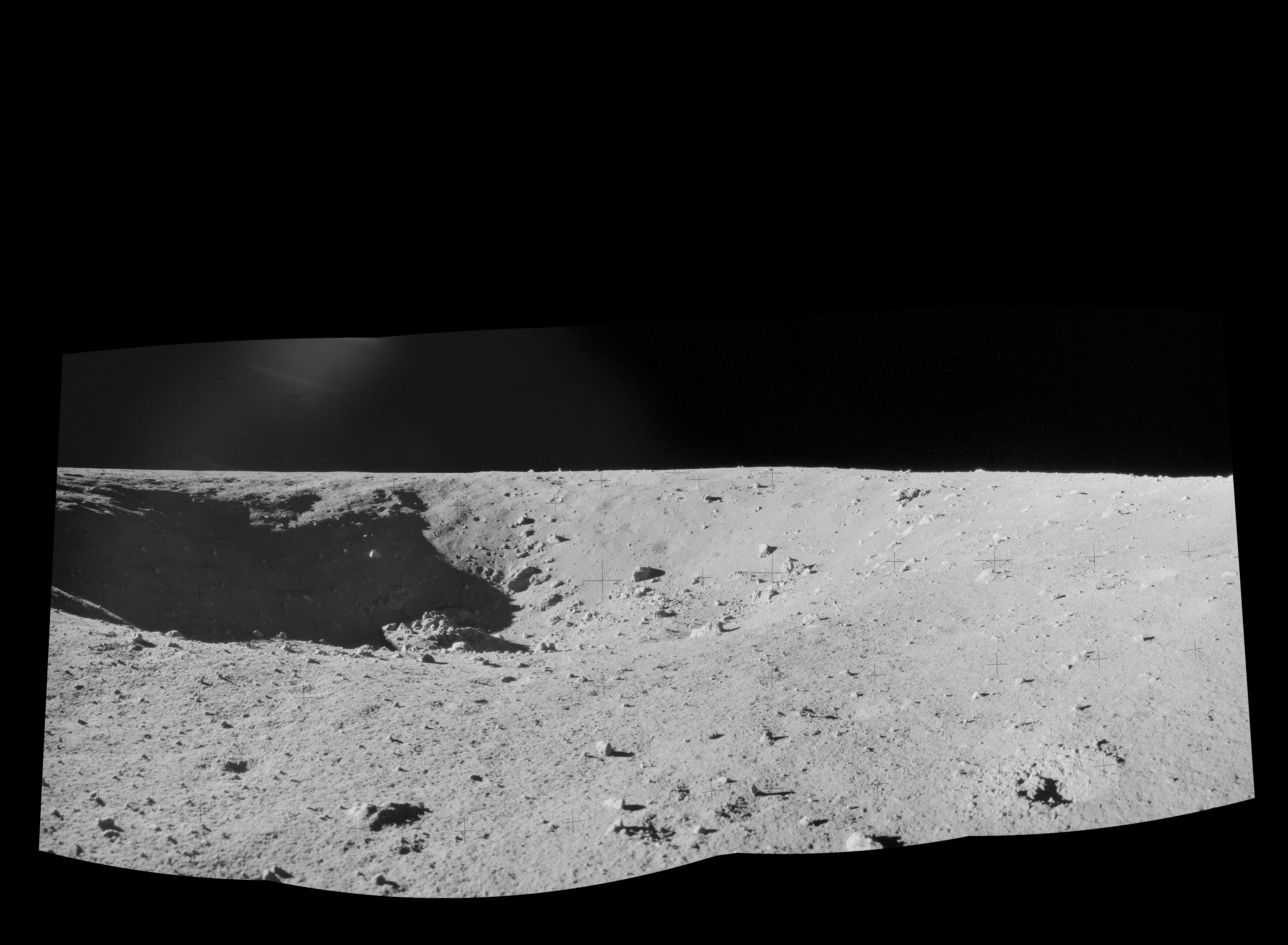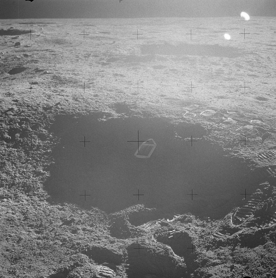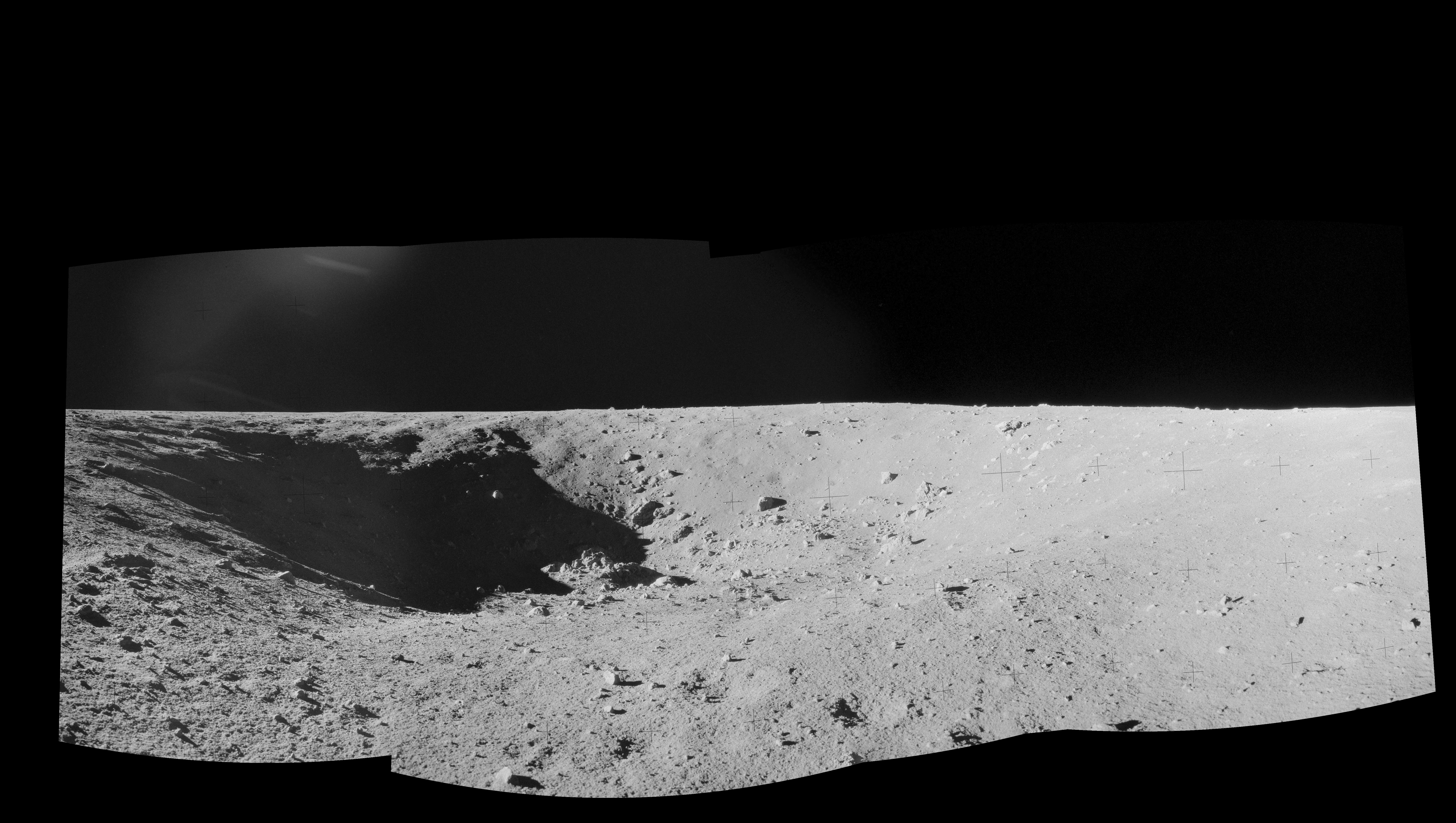 The raw image is M114104917R. See, also, a labeled version ( 0.8 Mb ). A labeled 2x detail shows features at the ALSEP site. Late in EVA-1, Pete and Al ran out to the rim of Middle Crescent Crater, where Pete took a pair of partial pans showing the crater. A variety of craters and boulders in the crater are identified in a comparison ( 5.1 Mb ) between Pete's first pan and the 29 Nov 2009 LROC image.09 January 2010 04:27:29 UTC; Solar El/Az 9.3/270.5; LRO altitude 43.1 km; resolution 0.49m/pixel ( 8.4 Mb )Deconvolved, 0.25 m/pixel (3.1 Mb TIF) and 0.5 m/pixel (3.4 Mb TIF) versions by GoneToPlaid.