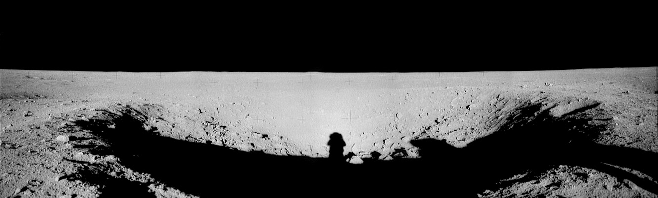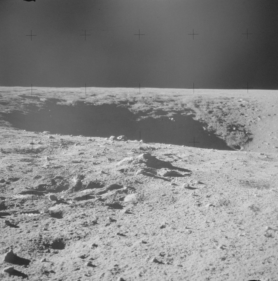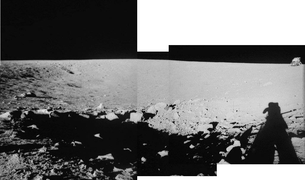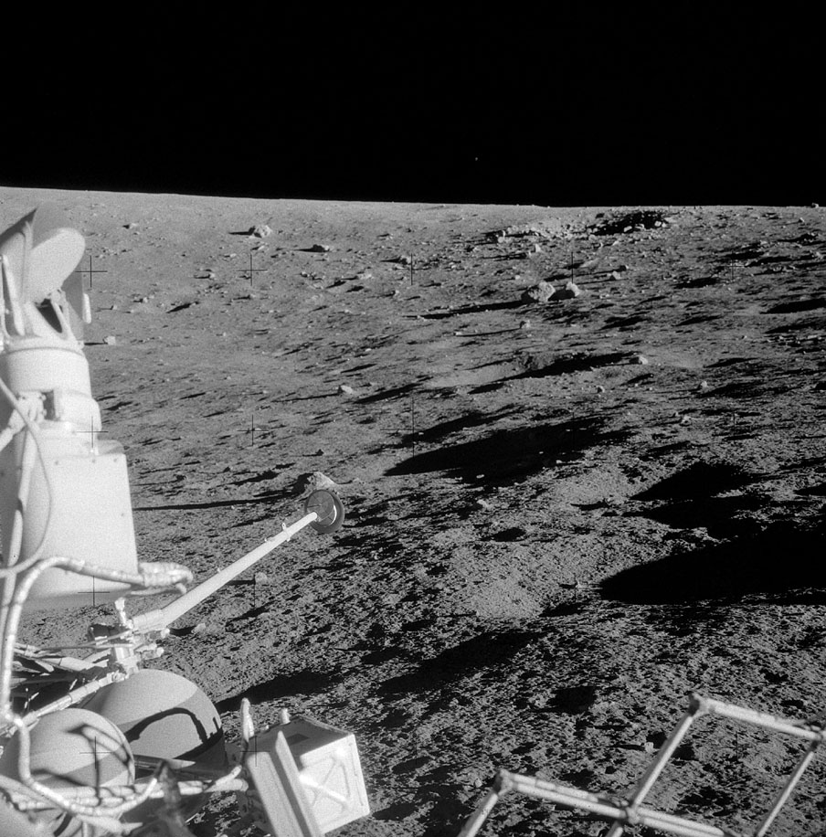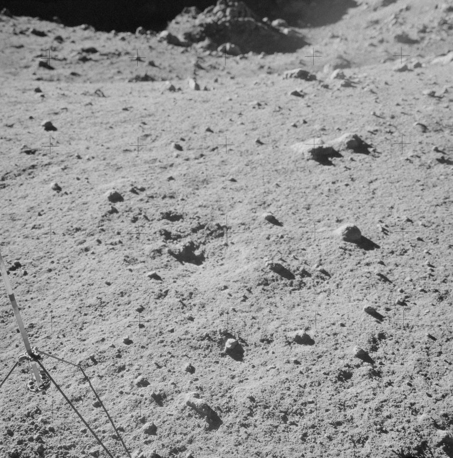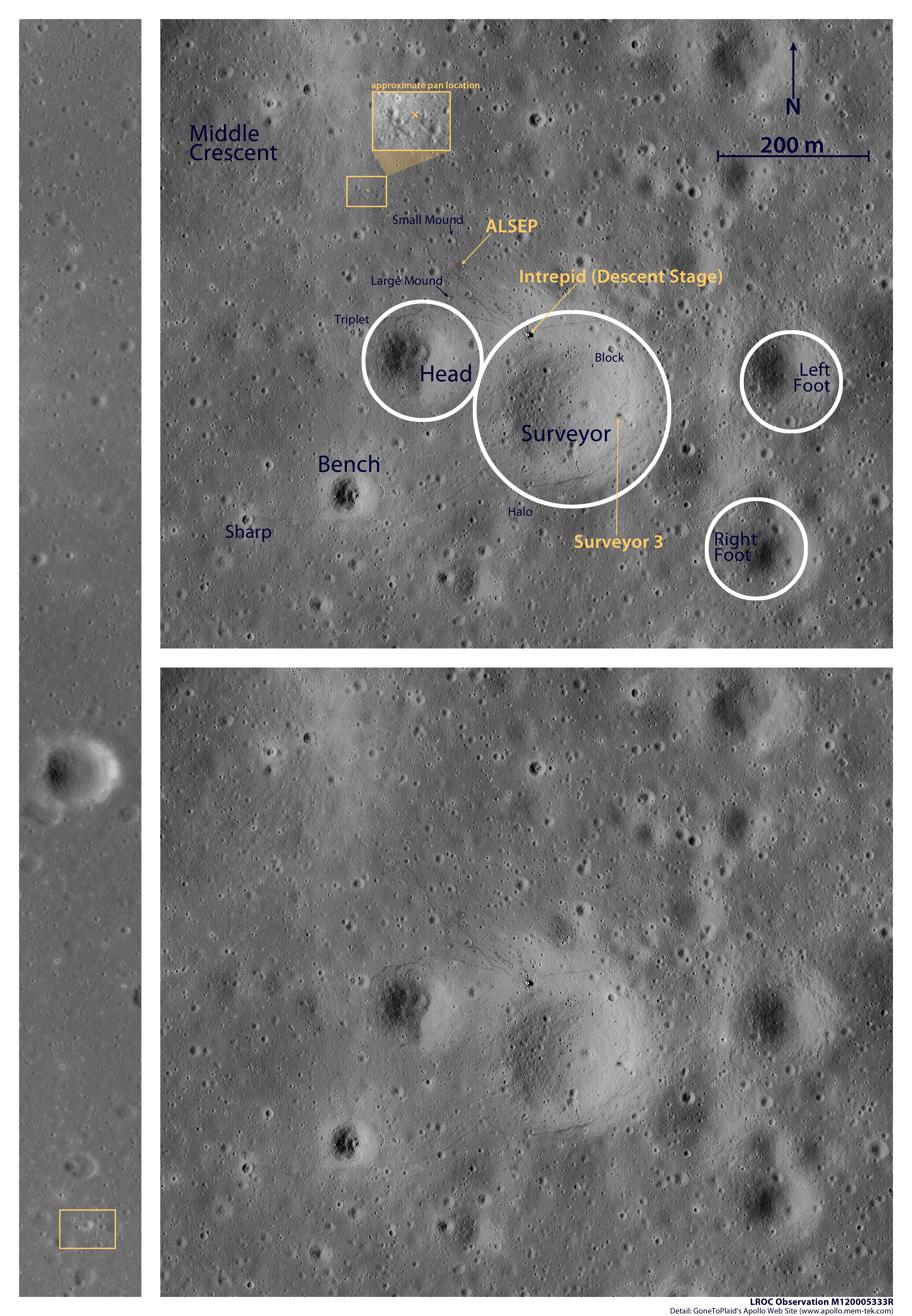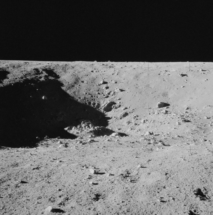 The raw image is M114104917R. See, also, a labeled version ( 0.8 Mb ). A labeled 2x detail shows features at the ALSEP site. Late in EVA-1, Pete and Al ran out to the rim of Middle Crescent Crater, where Pete took a pair of partial pans showing the crater. A variety of craters and boulders in the crater are identified in a comparison ( 5.1 Mb ) between Pete's first pan and the 29 Nov 2009 LROC image.09 January 2010 04:27:29 UTC; Solar El/Az 9.3/270.5; LRO altitude 43.1 km; resolution 0.49m/pixel ( 8.4 Mb )Deconvolved, 0.25 m/pixel (3.1 Mb TIF) and 0.5 m/pixel (3.4 Mb TIF) versions by GoneToPlaid.