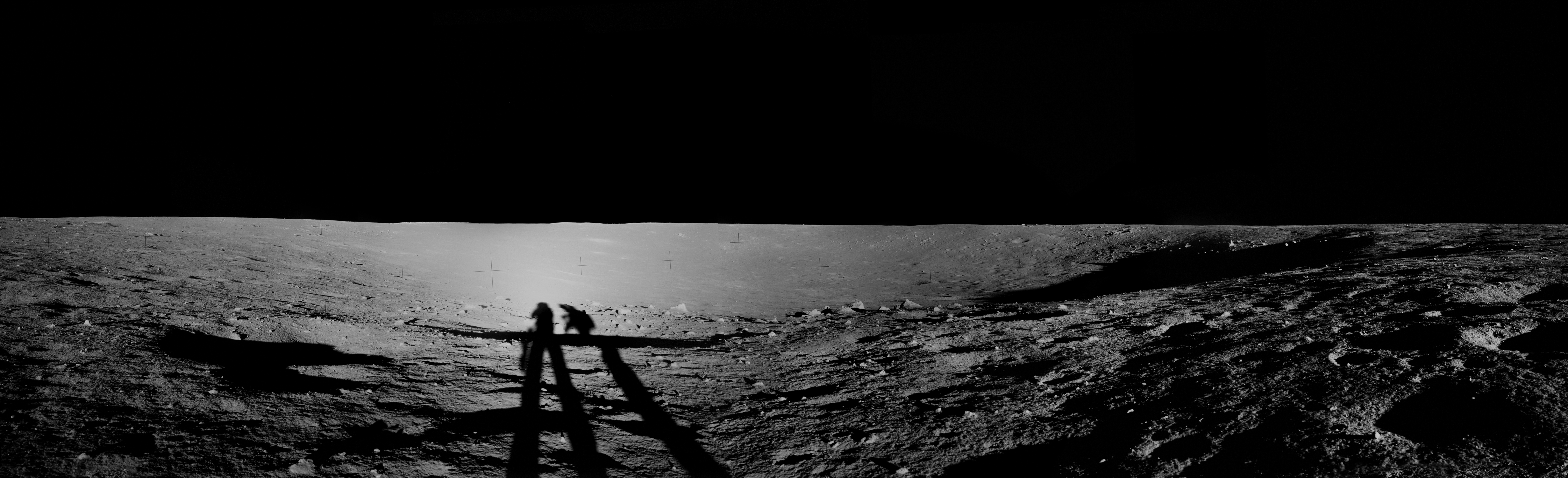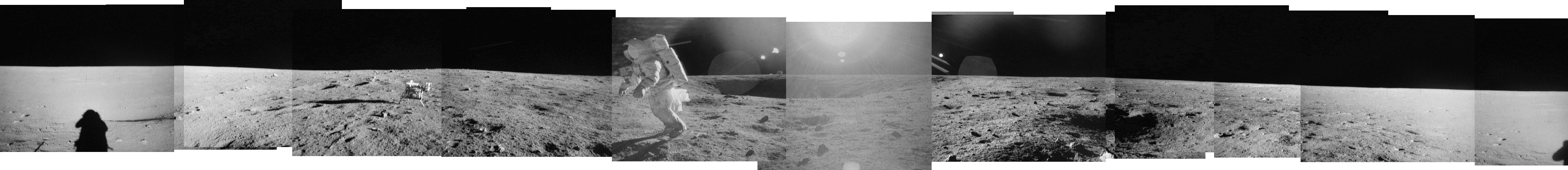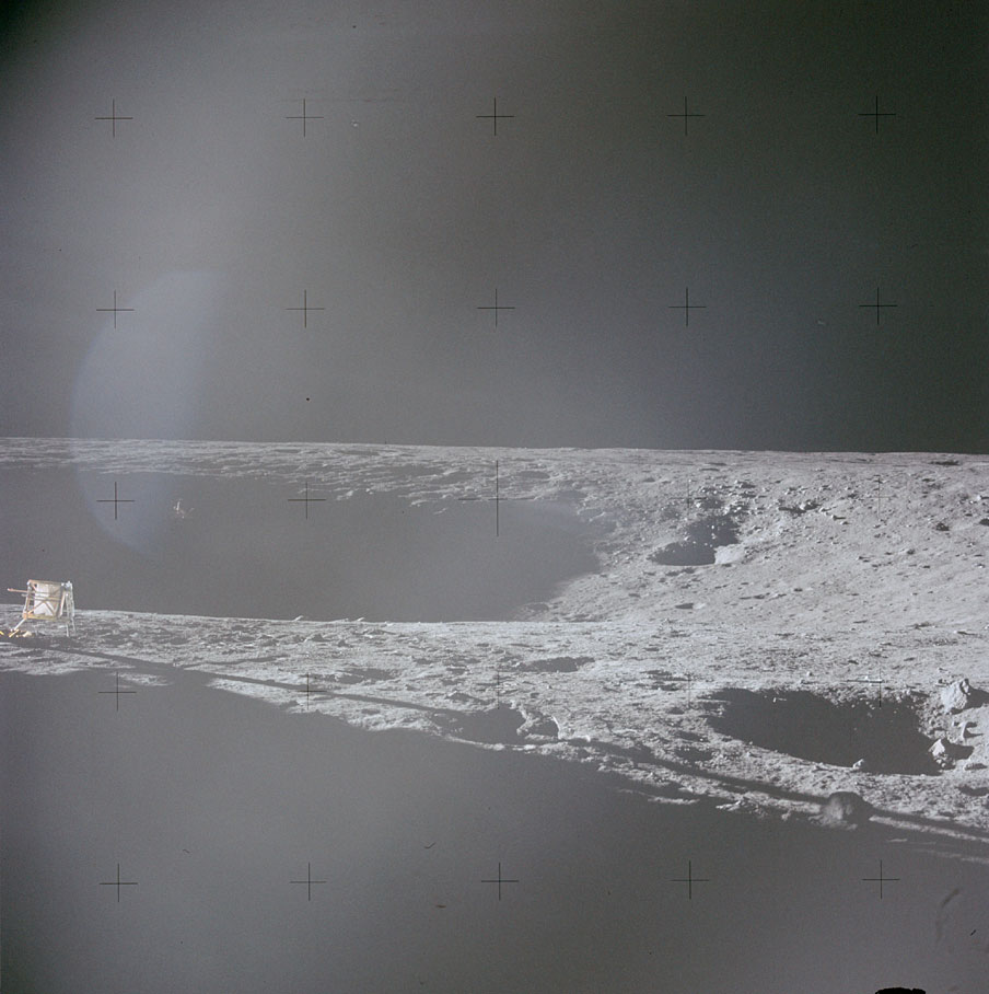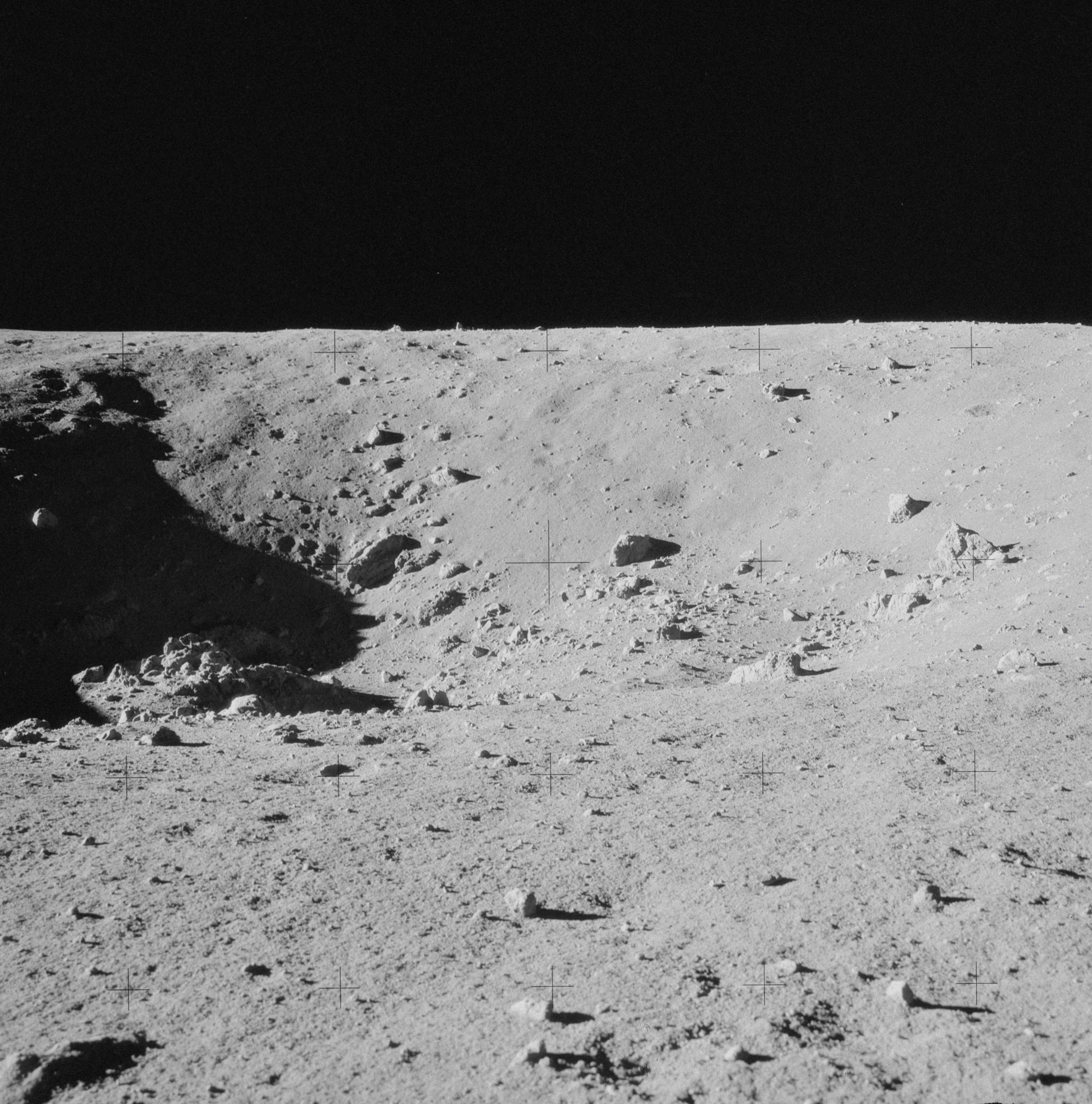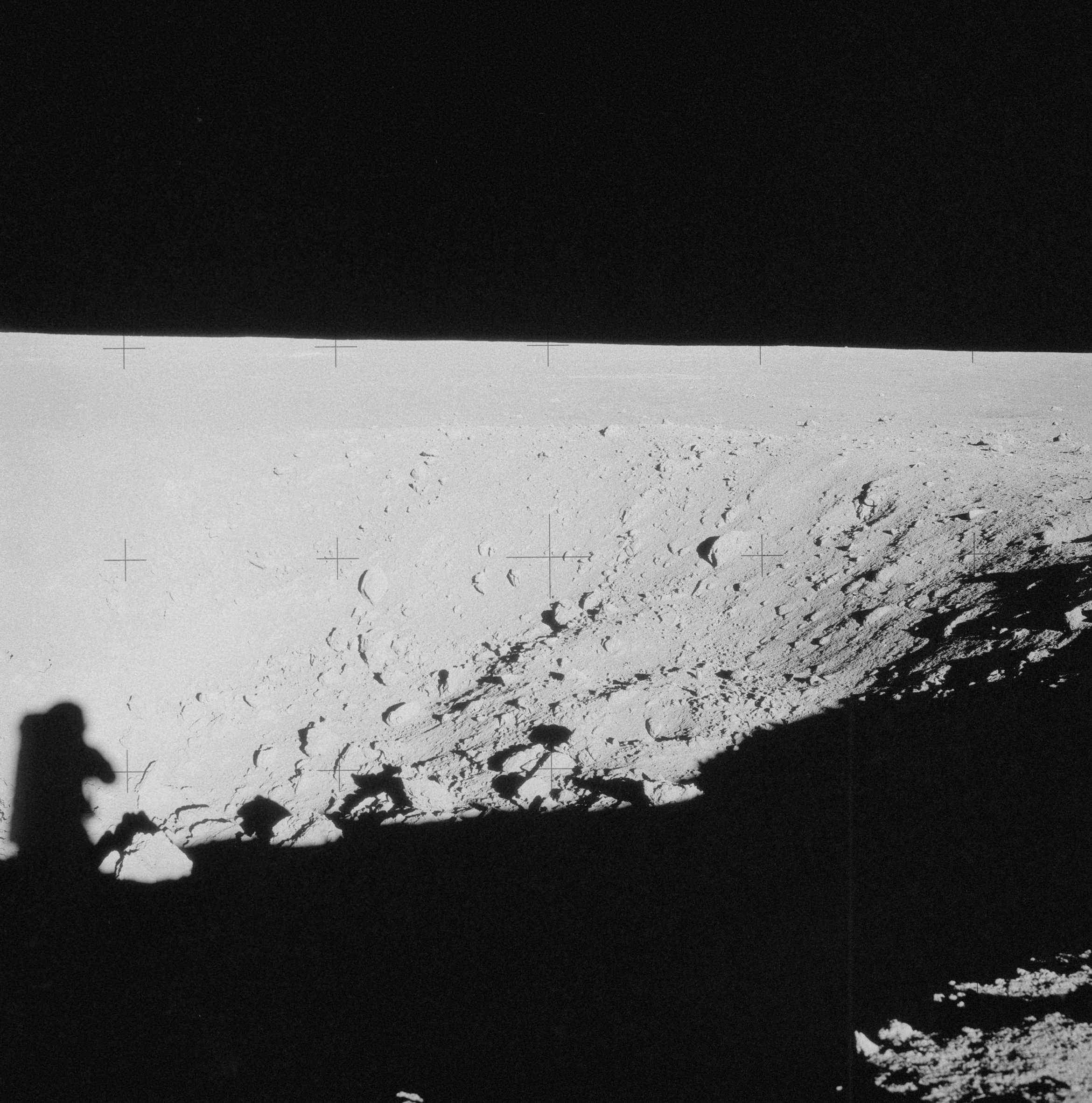 The raw image is M114104917R. See, also, a labeled version ( 0.8 Mb ). A labeled 2x detail shows features at the ALSEP site. Late in EVA-1, Pete and Al ran out to the rim of Middle Crescent Crater, where Pete took a pair of partial pans showing the crater. A variety of craters and boulders in the crater are identified in a comparison ( 5.1 Mb ) between Pete's first pan and the 29 Nov 2009 LROC image.09 January 2010 04:27:29 UTC; Solar El/Az 9.3/270.5; LRO altitude 43.1 km; resolution 0.49m/pixel ( 8.4 Mb )Deconvolved, 0.25 m/pixel (3.1 Mb TIF) and 0.5 m/pixel (3.4 Mb TIF) versions by GoneToPlaid.