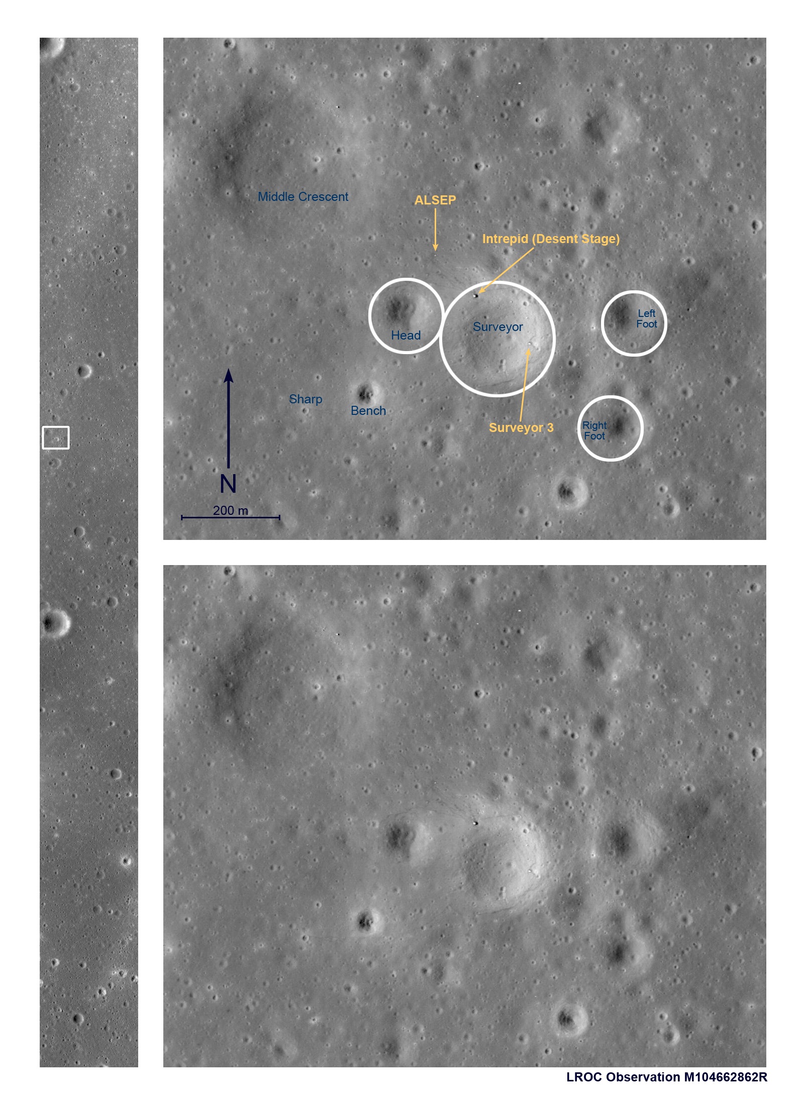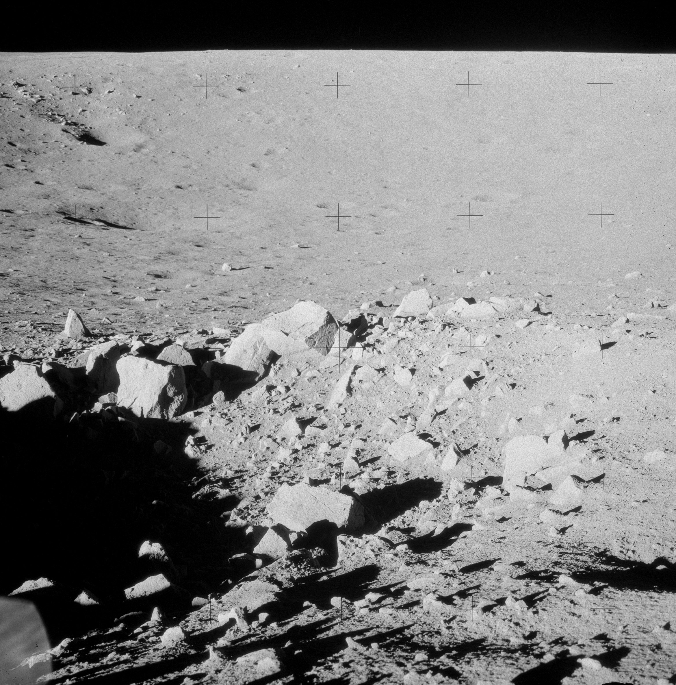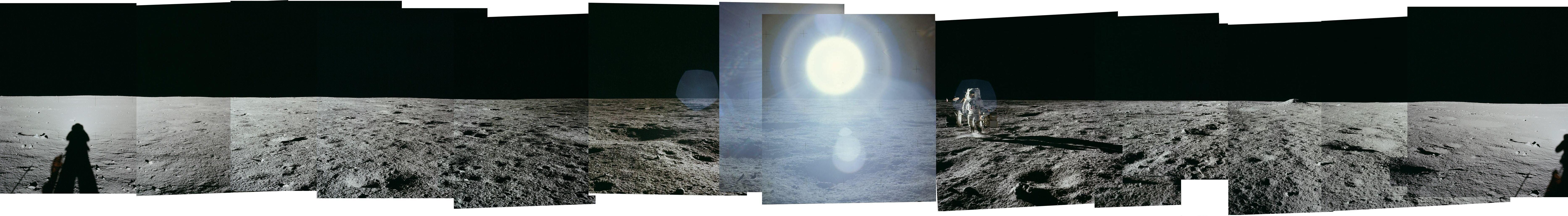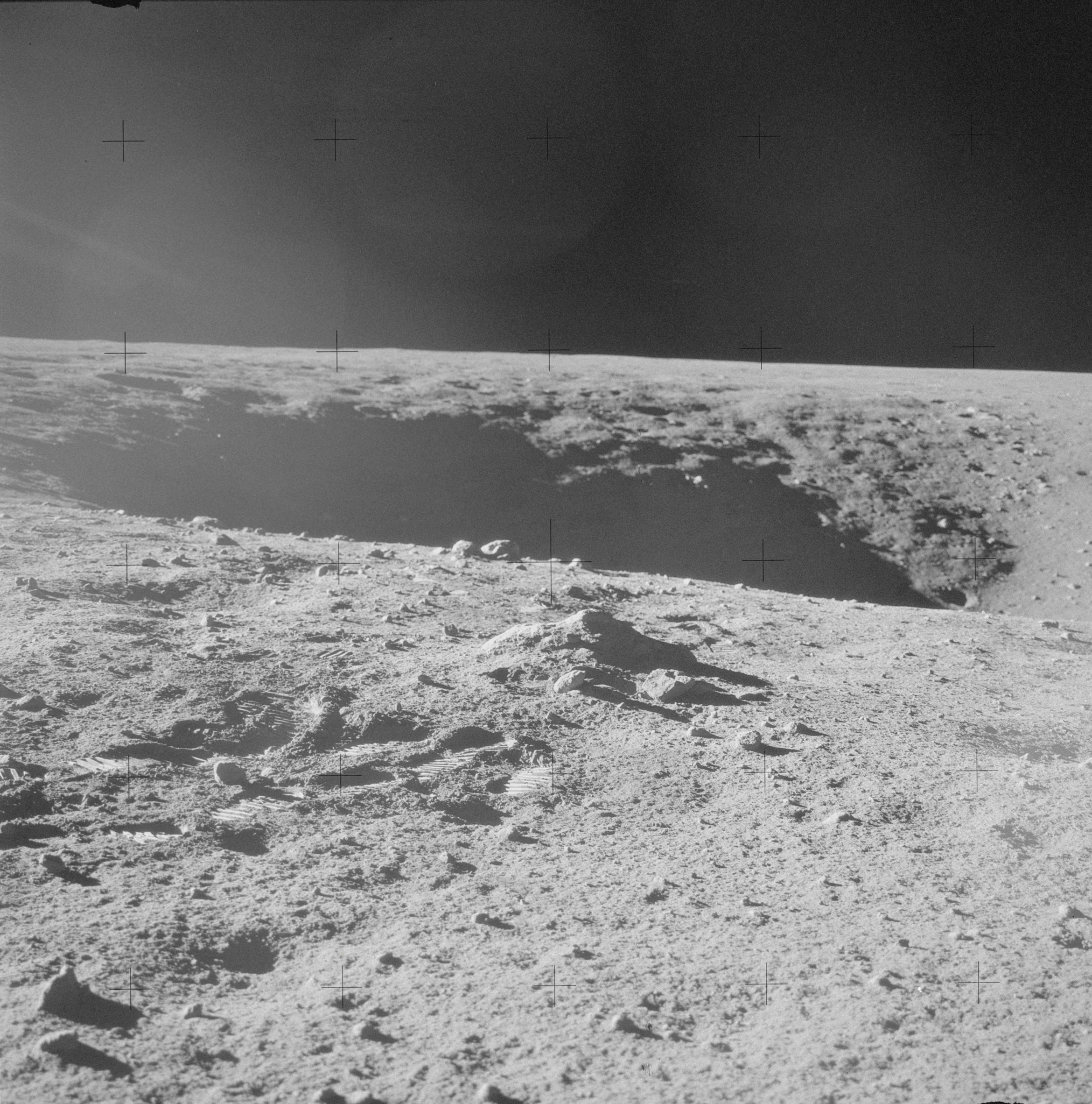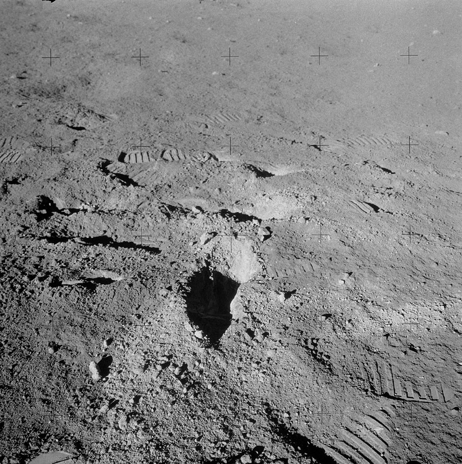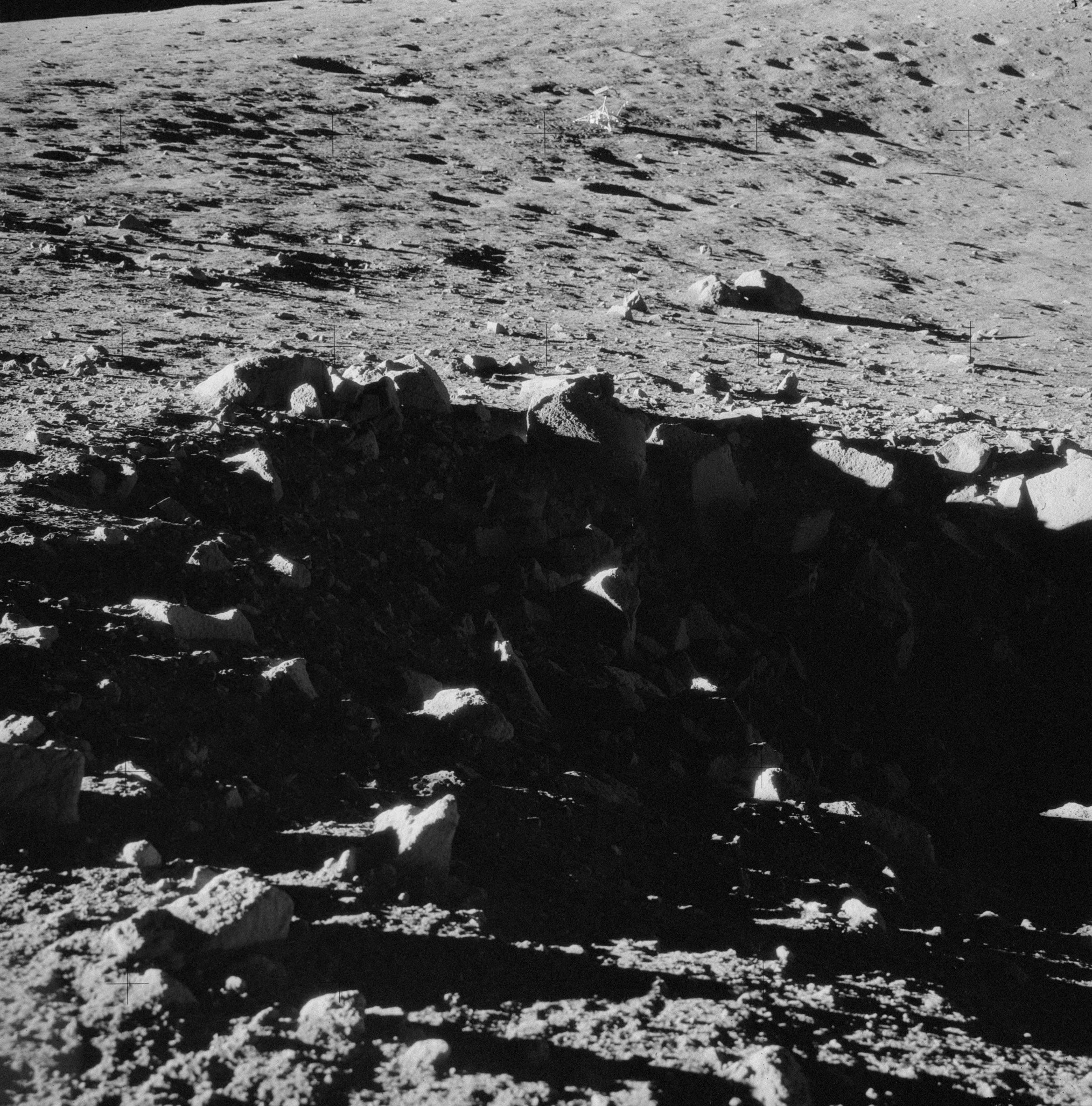 The raw image is M114104917R. See, also, a labeled version ( 0.8 Mb ). A labeled 2x detail shows features at the ALSEP site. Late in EVA-1, Pete and Al ran out to the rim of Middle Crescent Crater, where Pete took a pair of partial pans showing the crater. A variety of craters and boulders in the crater are identified in a comparison ( 5.1 Mb ) between Pete's first pan and the 29 Nov 2009 LROC image.09 January 2010 04:27:29 UTC; Solar El/Az 9.3/270.5; LRO altitude 43.1 km; resolution 0.49m/pixel ( 8.4 Mb )Deconvolved, 0.25 m/pixel (3.1 Mb TIF) and 0.5 m/pixel (3.4 Mb TIF) versions by GoneToPlaid.