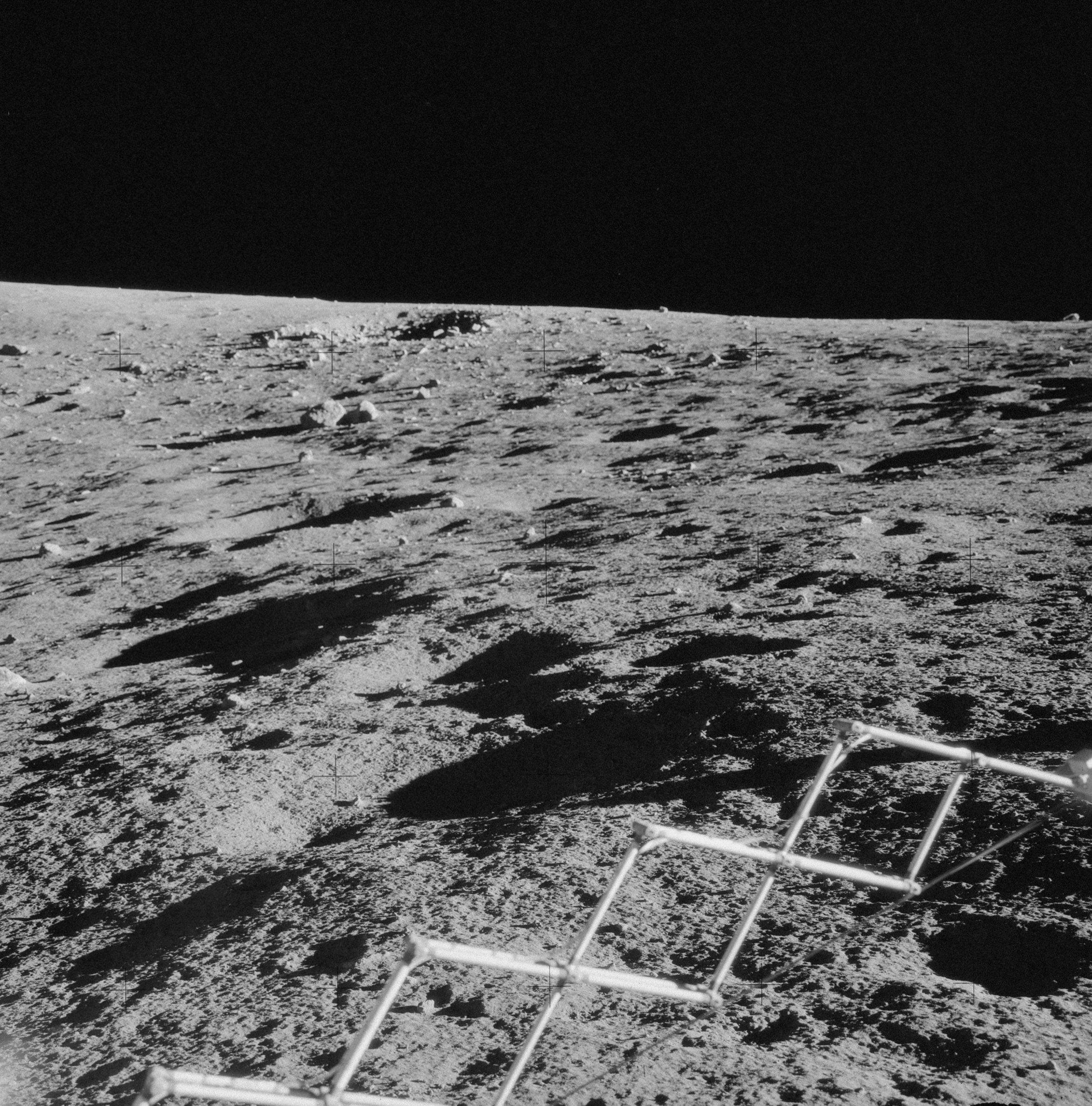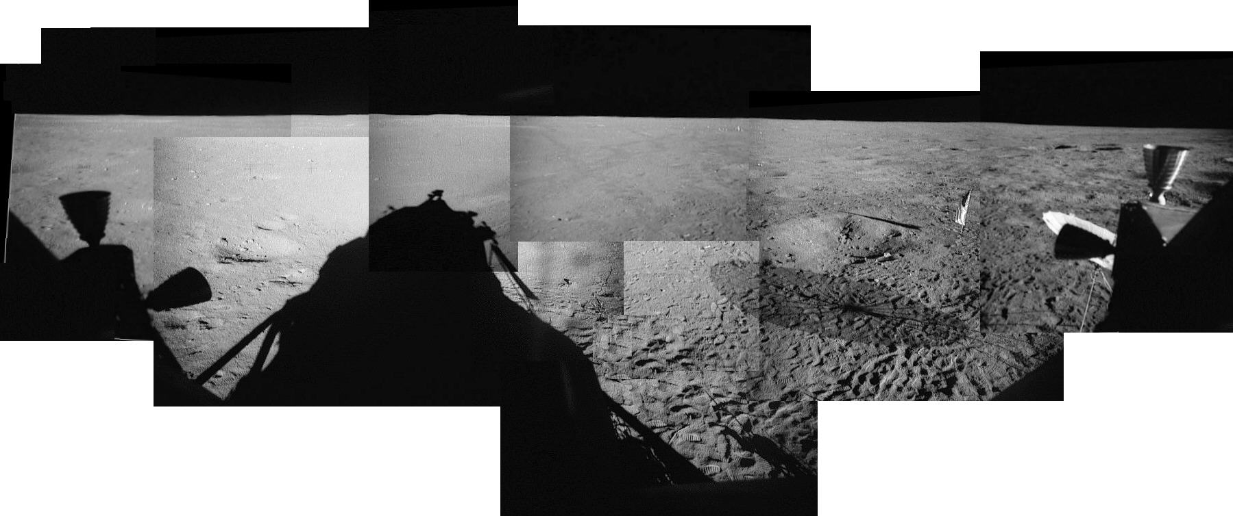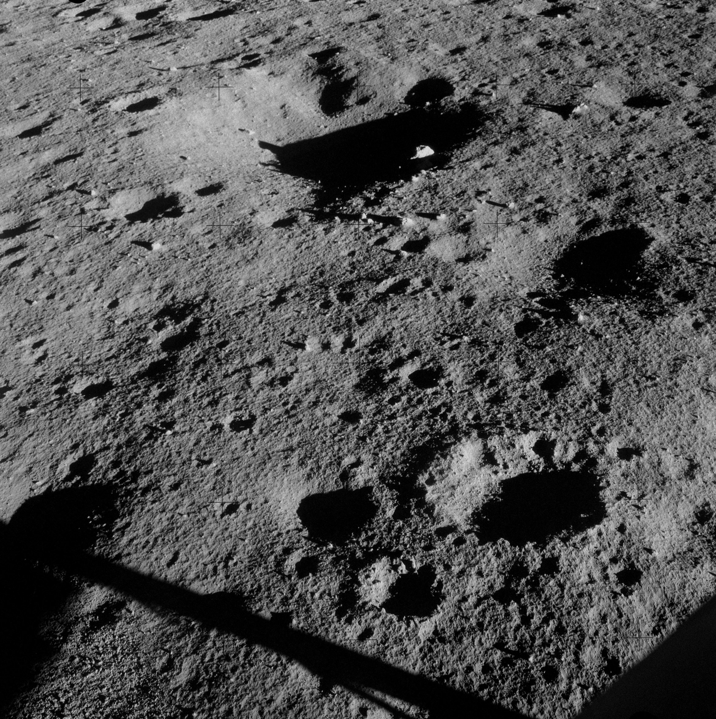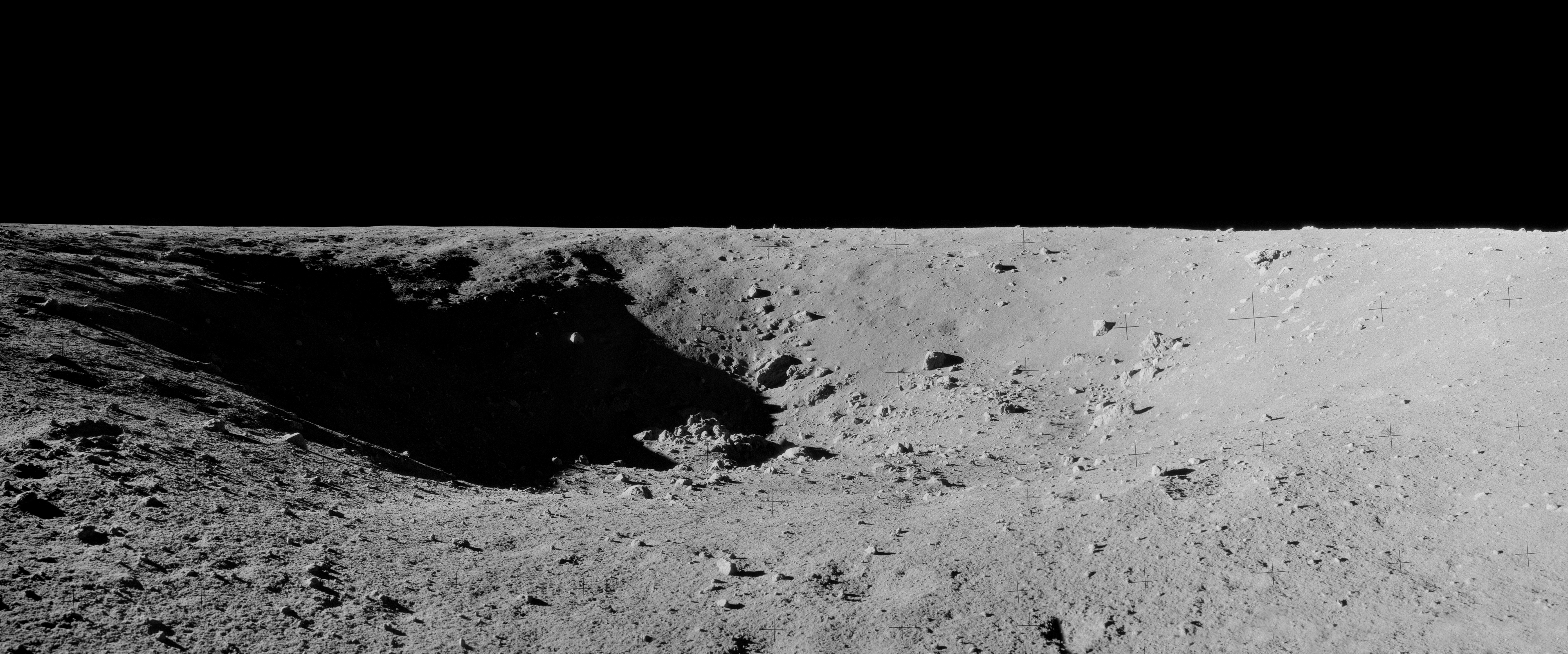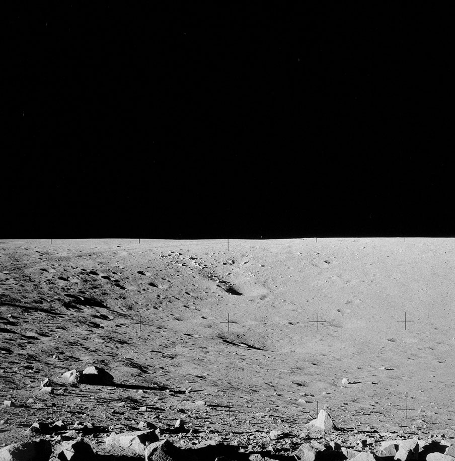 The raw image is M114104917R. See, also, a labeled version ( 0.8 Mb ). A labeled 2x detail shows features at the ALSEP site. Late in EVA-1, Pete and Al ran out to the rim of Middle Crescent Crater, where Pete took a pair of partial pans showing the crater. A variety of craters and boulders in the crater are identified in a comparison ( 5.1 Mb ) between Pete's first pan and the 29 Nov 2009 LROC image.09 January 2010 04:27:29 UTC; Solar El/Az 9.3/270.5; LRO altitude 43.1 km; resolution 0.49m/pixel ( 8.4 Mb )Deconvolved, 0.25 m/pixel (3.1 Mb TIF) and 0.5 m/pixel (3.4 Mb TIF) versions by GoneToPlaid.