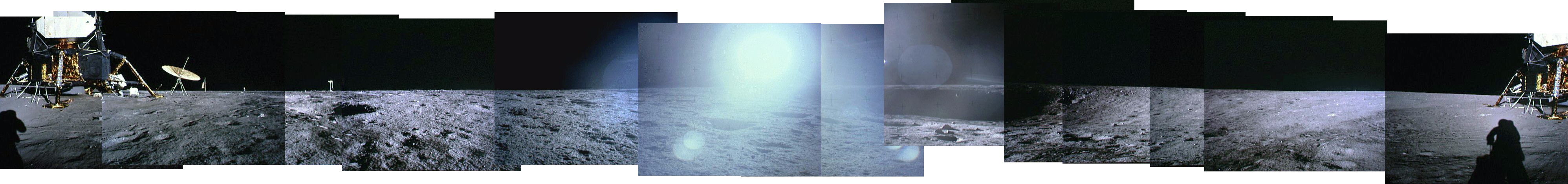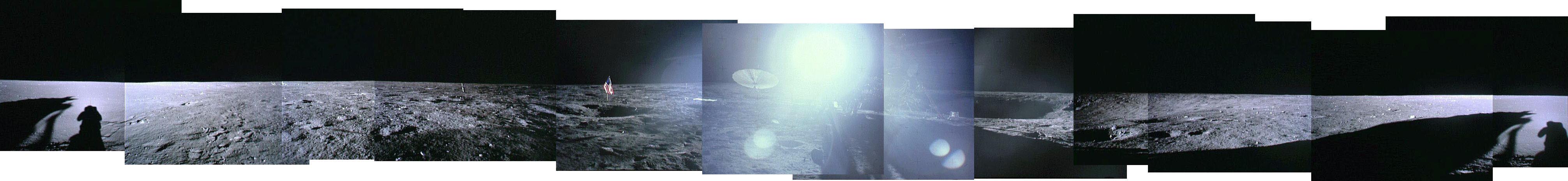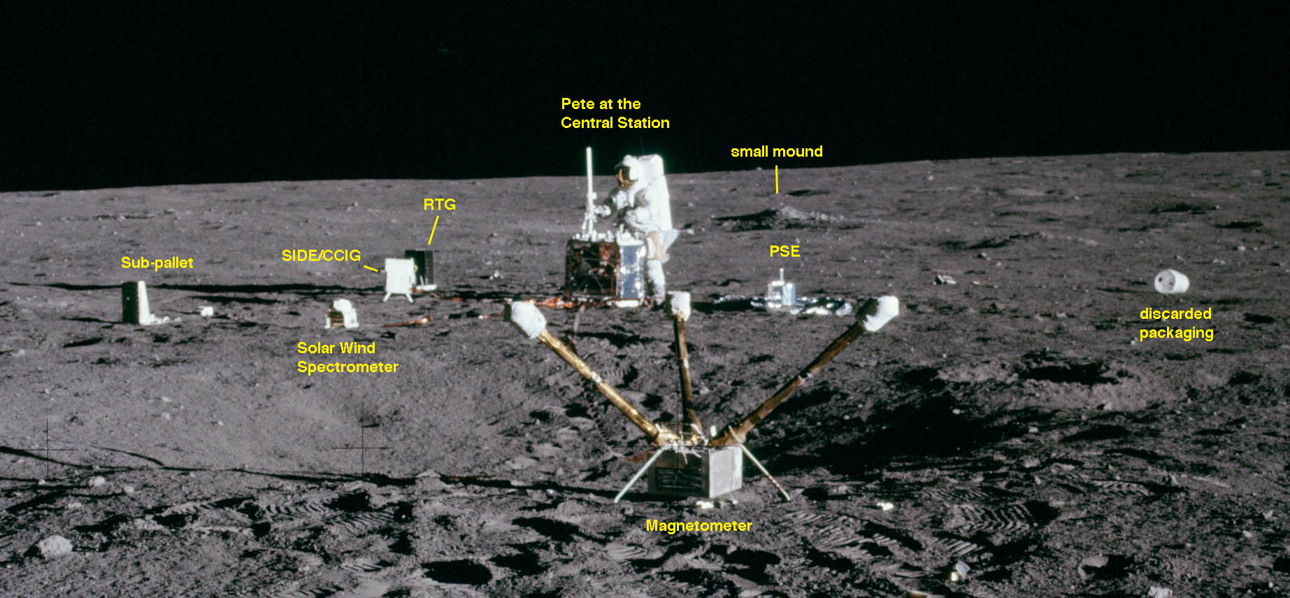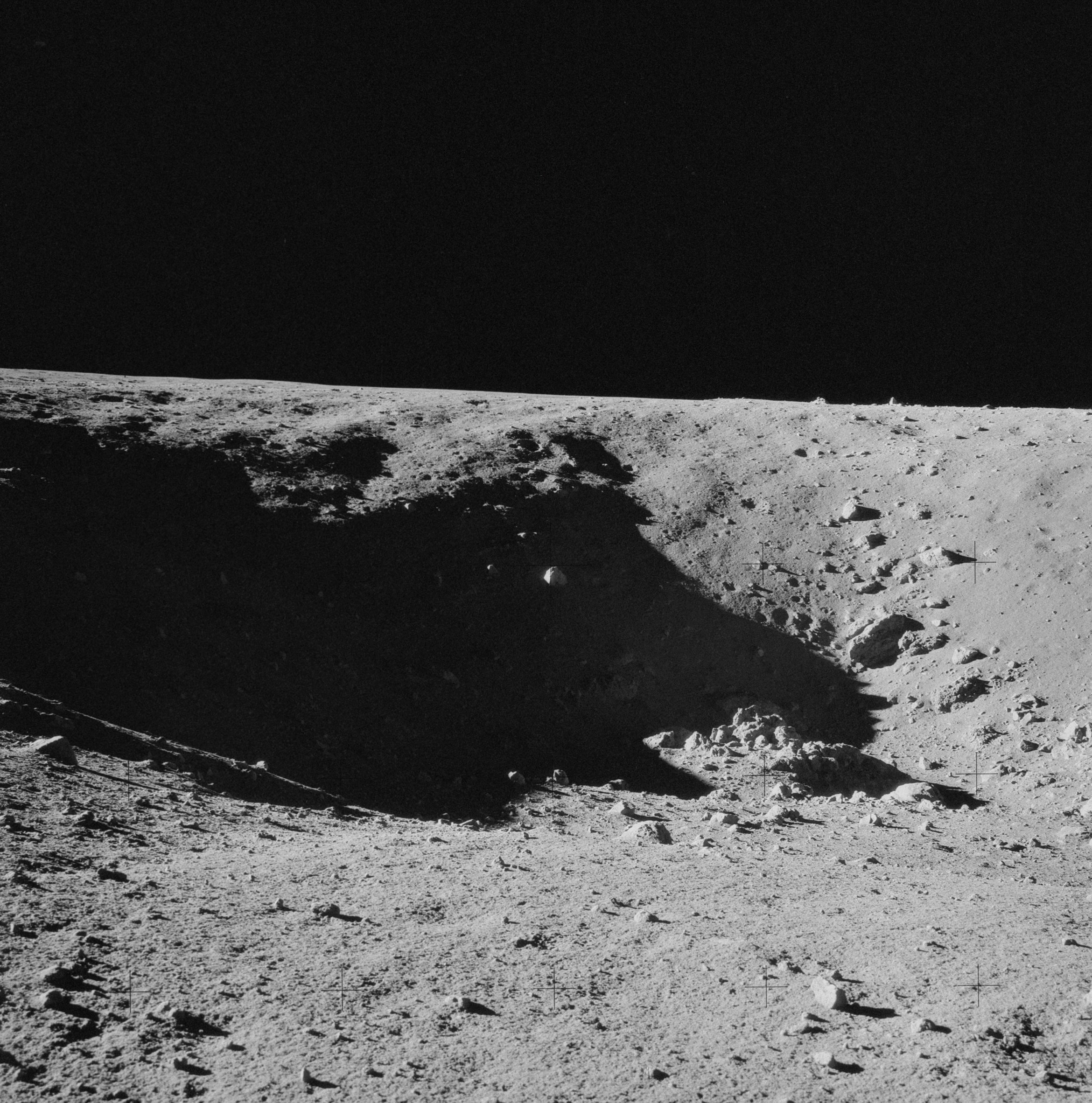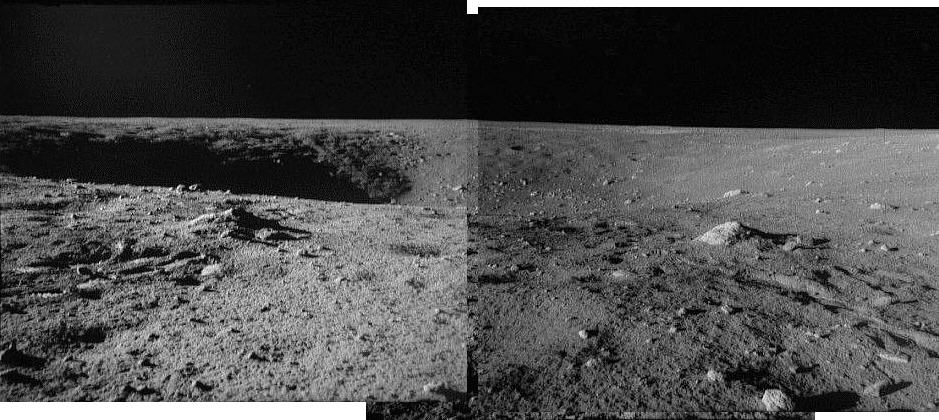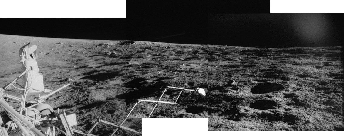 The raw image is M114104917R. See, also, a labeled version ( 0.8 Mb ). A labeled 2x detail shows features at the ALSEP site. Late in EVA-1, Pete and Al ran out to the rim of Middle Crescent Crater, where Pete took a pair of partial pans showing the crater. A variety of craters and boulders in the crater are identified in a comparison ( 5.1 Mb ) between Pete's first pan and the 29 Nov 2009 LROC image.09 January 2010 04:27:29 UTC; Solar El/Az 9.3/270.5; LRO altitude 43.1 km; resolution 0.49m/pixel ( 8.4 Mb )Deconvolved, 0.25 m/pixel (3.1 Mb TIF) and 0.5 m/pixel (3.4 Mb TIF) versions by GoneToPlaid.