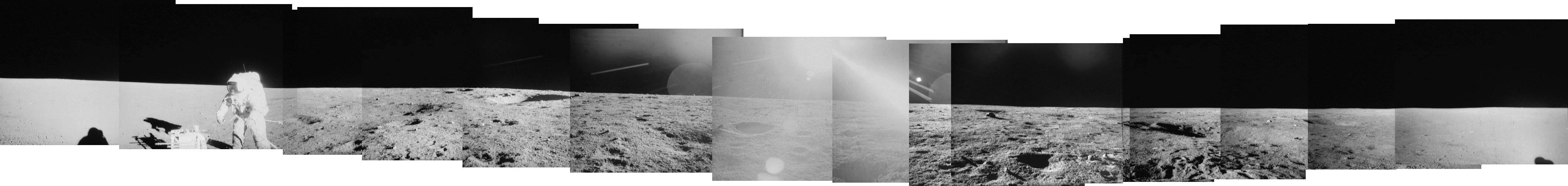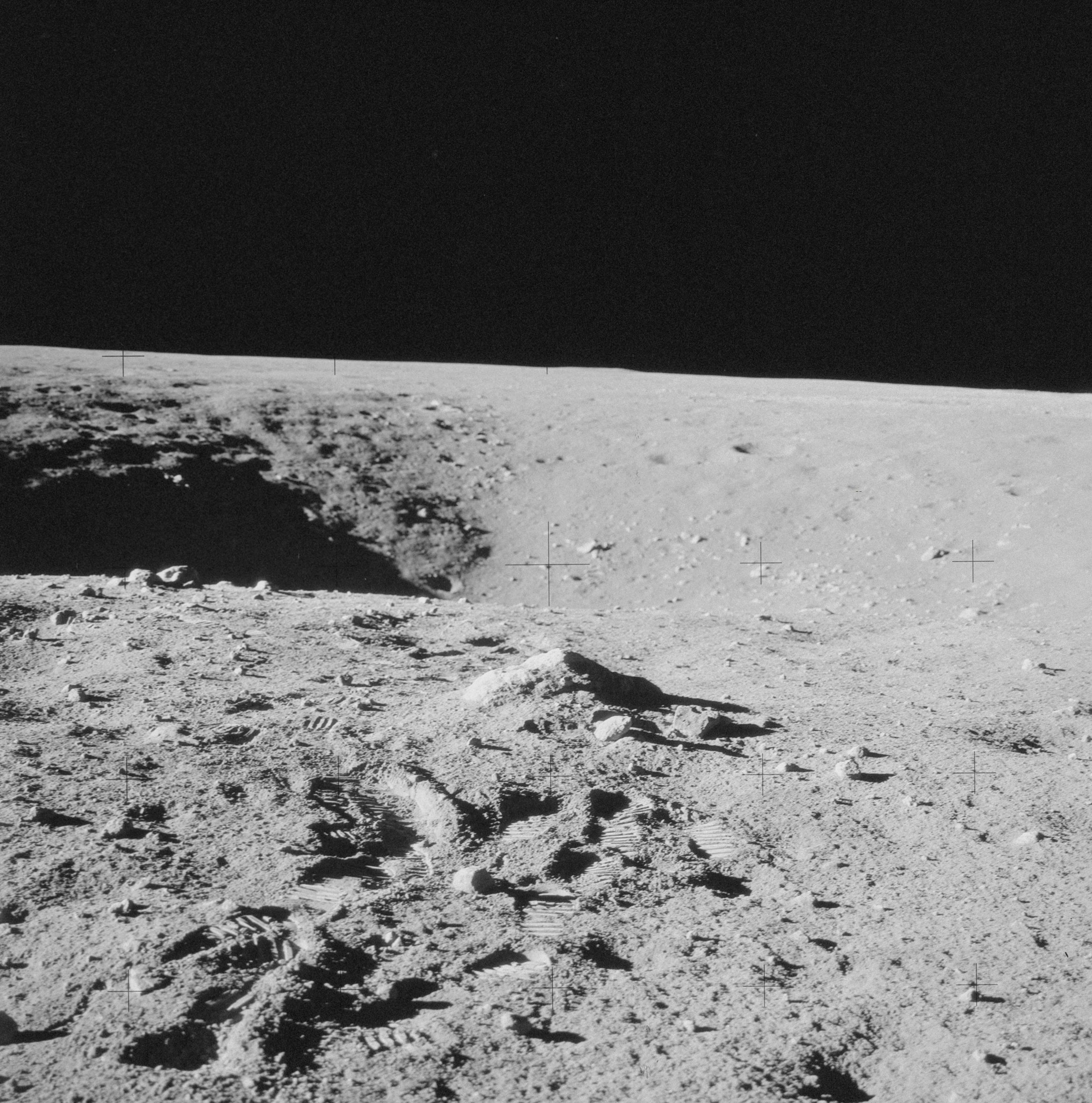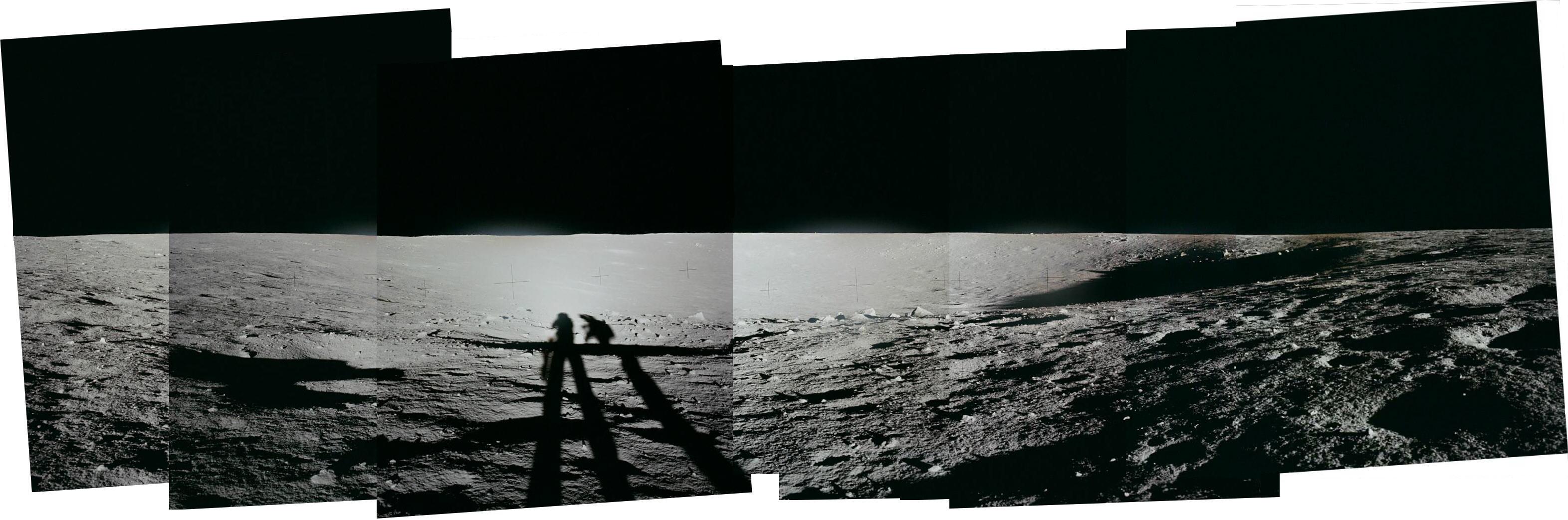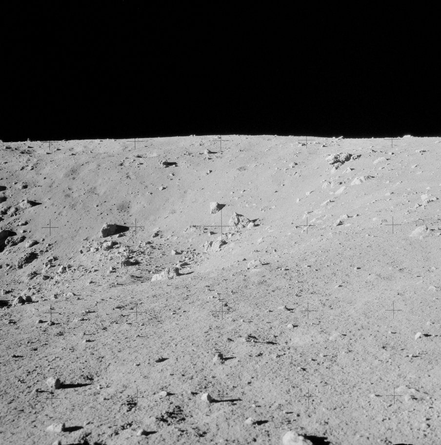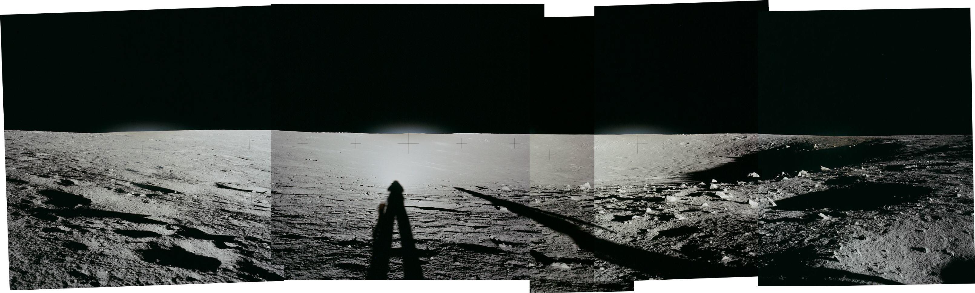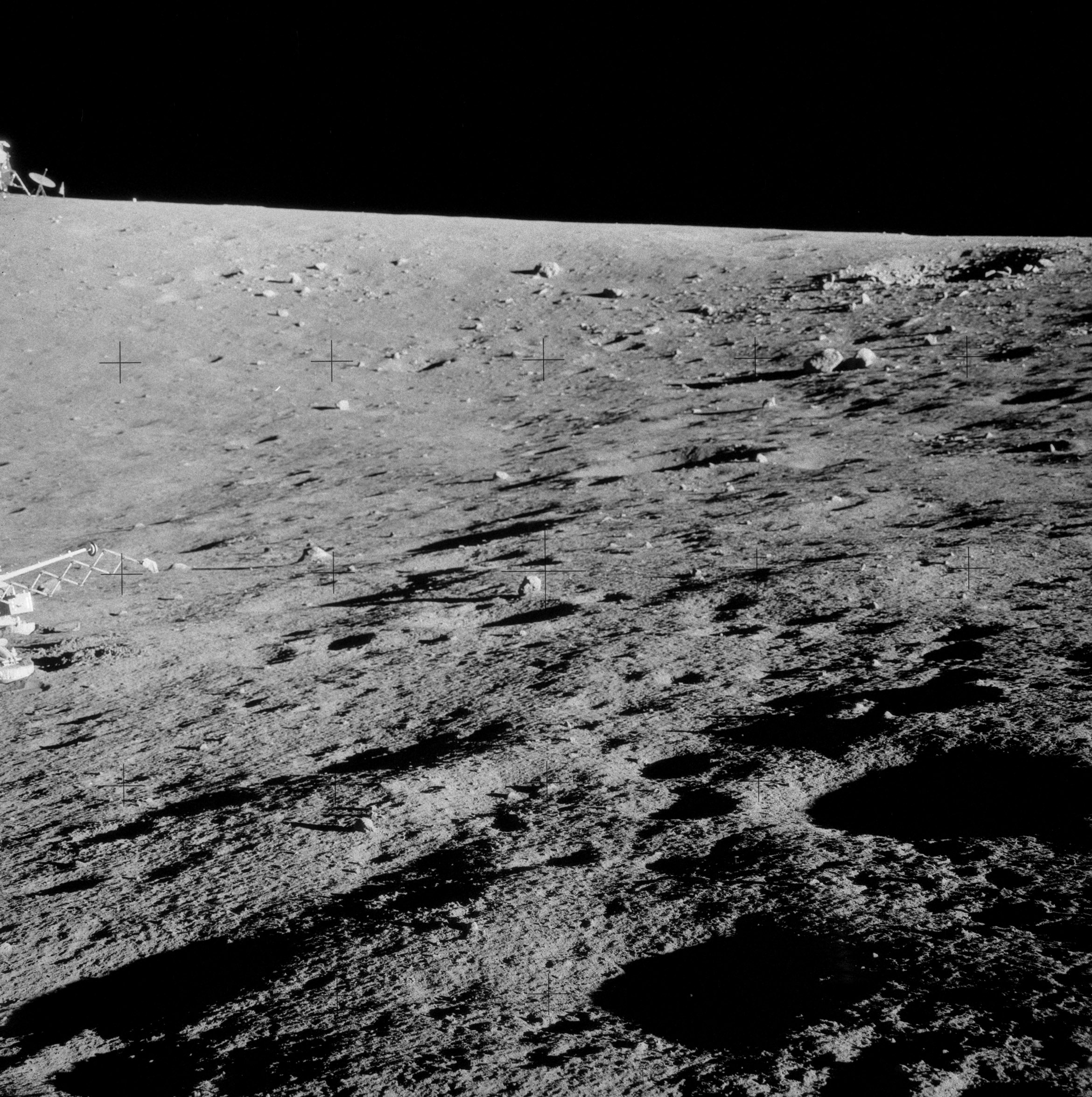 The raw image is M114104917R. See, also, a labeled version ( 0.8 Mb ). A labeled 2x detail shows features at the ALSEP site. Late in EVA-1, Pete and Al ran out to the rim of Middle Crescent Crater, where Pete took a pair of partial pans showing the crater. A variety of craters and boulders in the crater are identified in a comparison ( 5.1 Mb ) between Pete's first pan and the 29 Nov 2009 LROC image.09 January 2010 04:27:29 UTC; Solar El/Az 9.3/270.5; LRO altitude 43.1 km; resolution 0.49m/pixel ( 8.4 Mb )Deconvolved, 0.25 m/pixel (3.1 Mb TIF) and 0.5 m/pixel (3.4 Mb TIF) versions by GoneToPlaid.