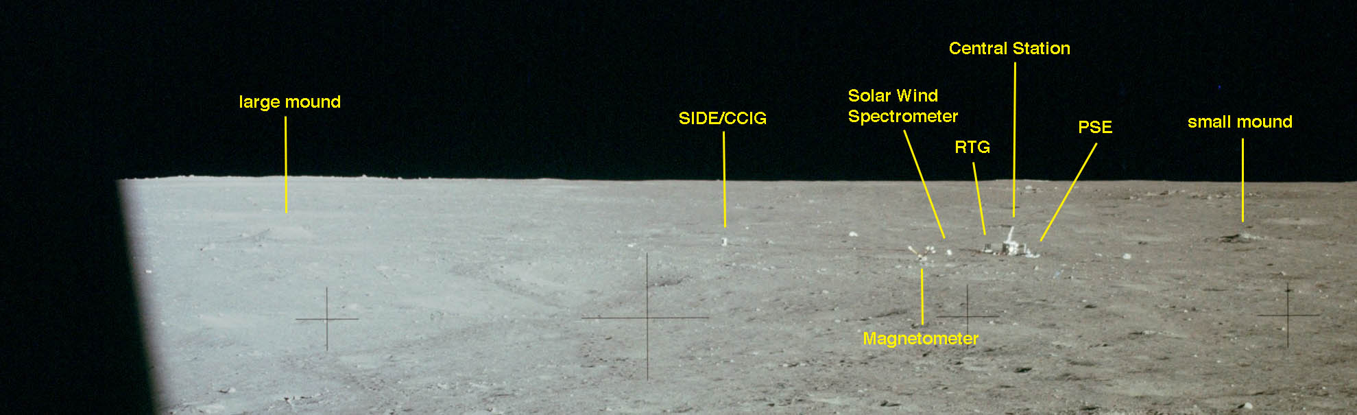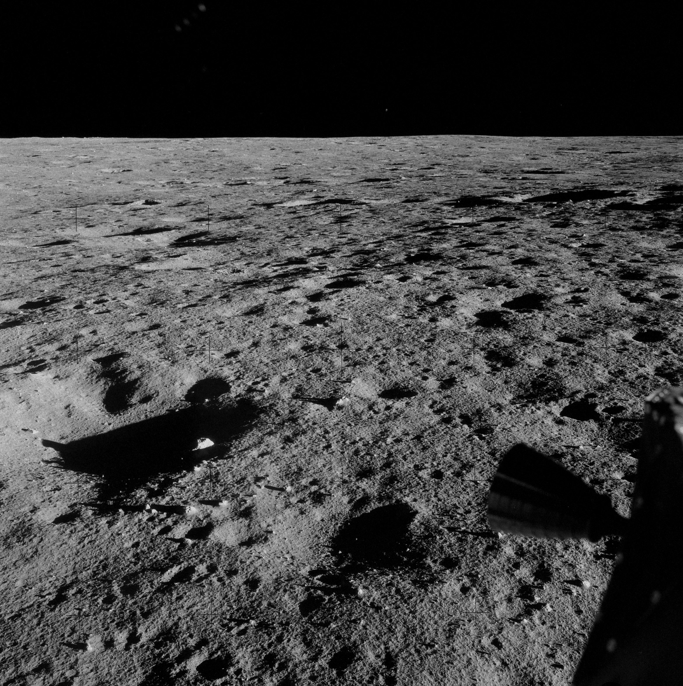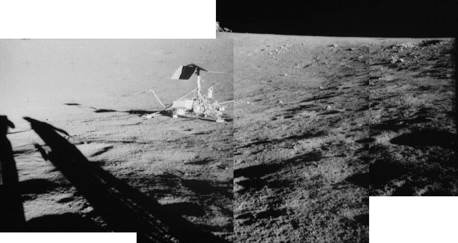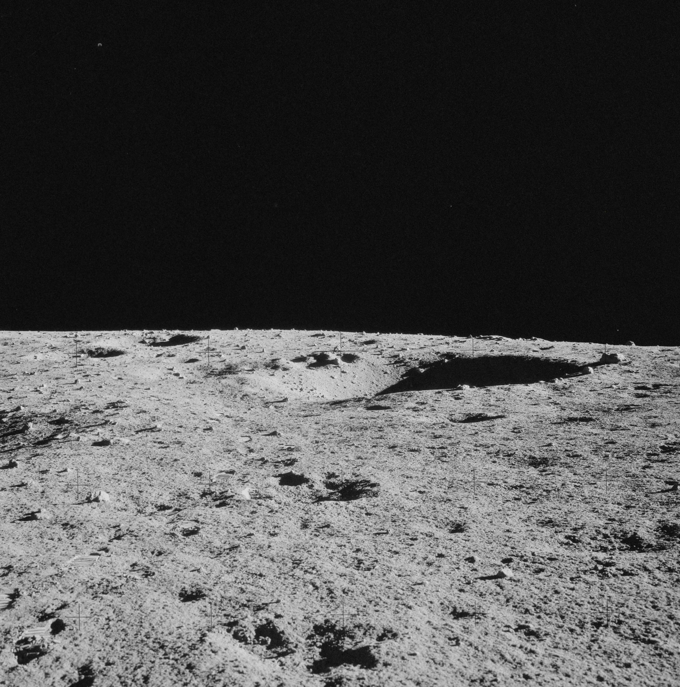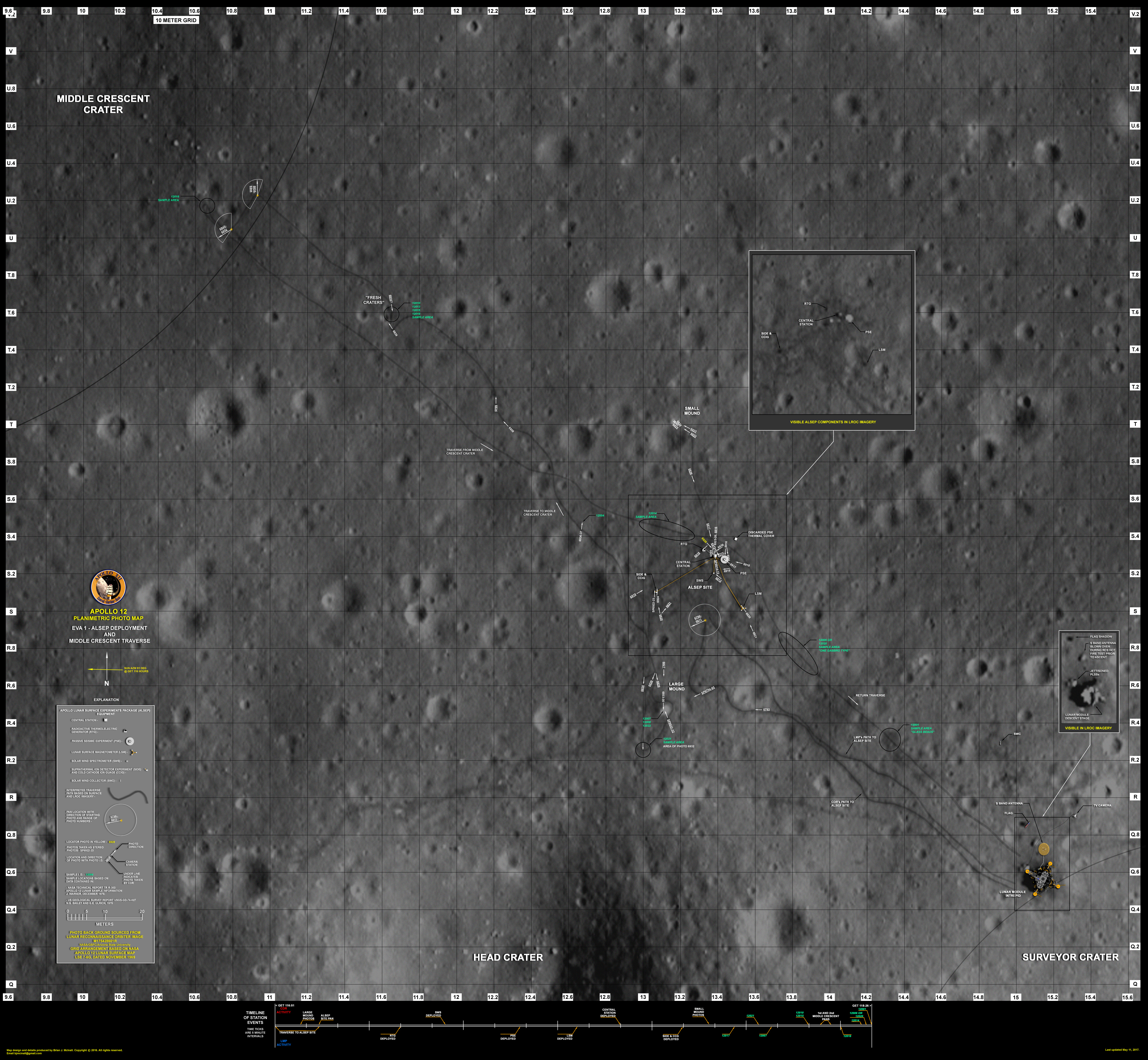 The raw image is M114104917R. See, also, a labeled version ( 0.8 Mb ). A labeled 2x detail shows features at the ALSEP site. Late in EVA-1, Pete and Al ran out to the rim of Middle Crescent Crater, where Pete took a pair of partial pans showing the crater. A variety of craters and boulders in the crater are identified in a comparison ( 5.1 Mb ) between Pete's first pan and the 29 Nov 2009 LROC image.09 January 2010 04:27:29 UTC; Solar El/Az 9.3/270.5; LRO altitude 43.1 km; resolution 0.49m/pixel ( 8.4 Mb )Deconvolved, 0.25 m/pixel (3.1 Mb TIF) and 0.5 m/pixel (3.4 Mb TIF) versions by GoneToPlaid.