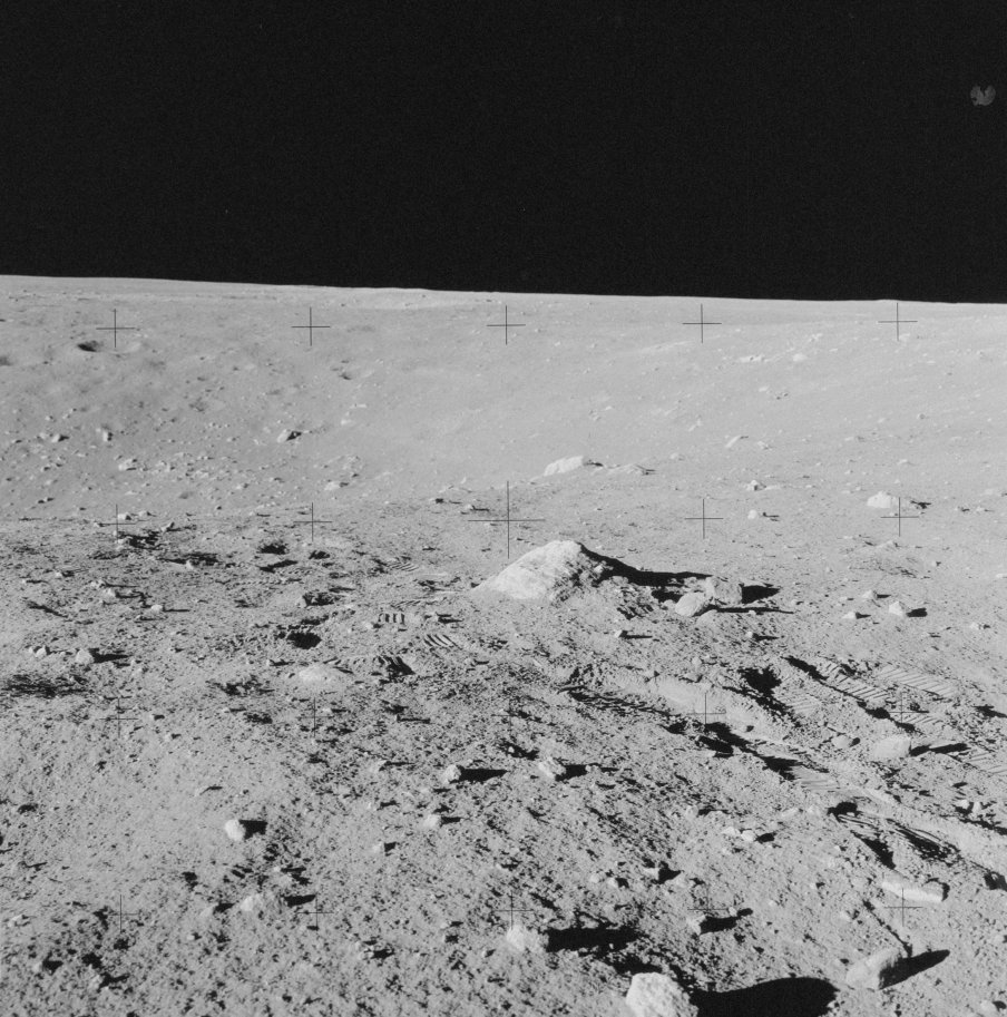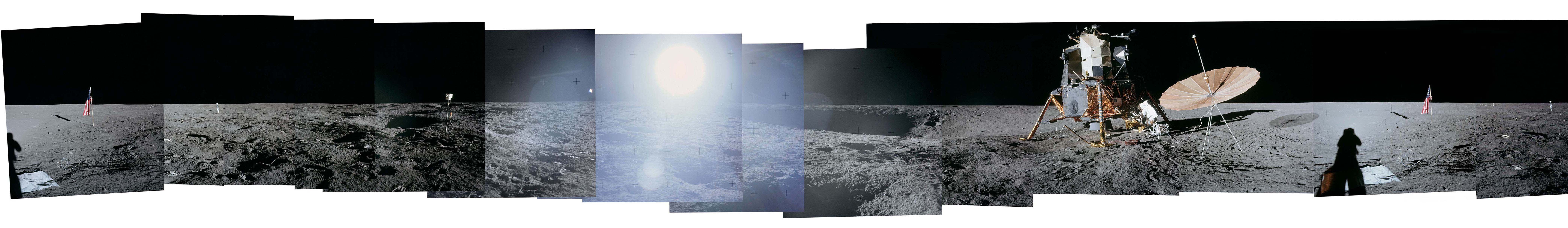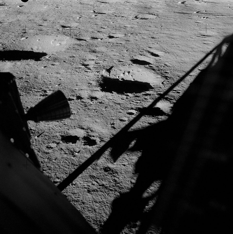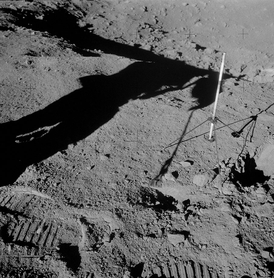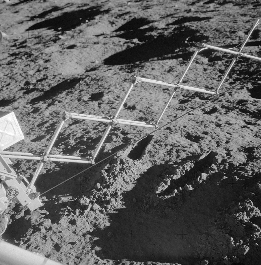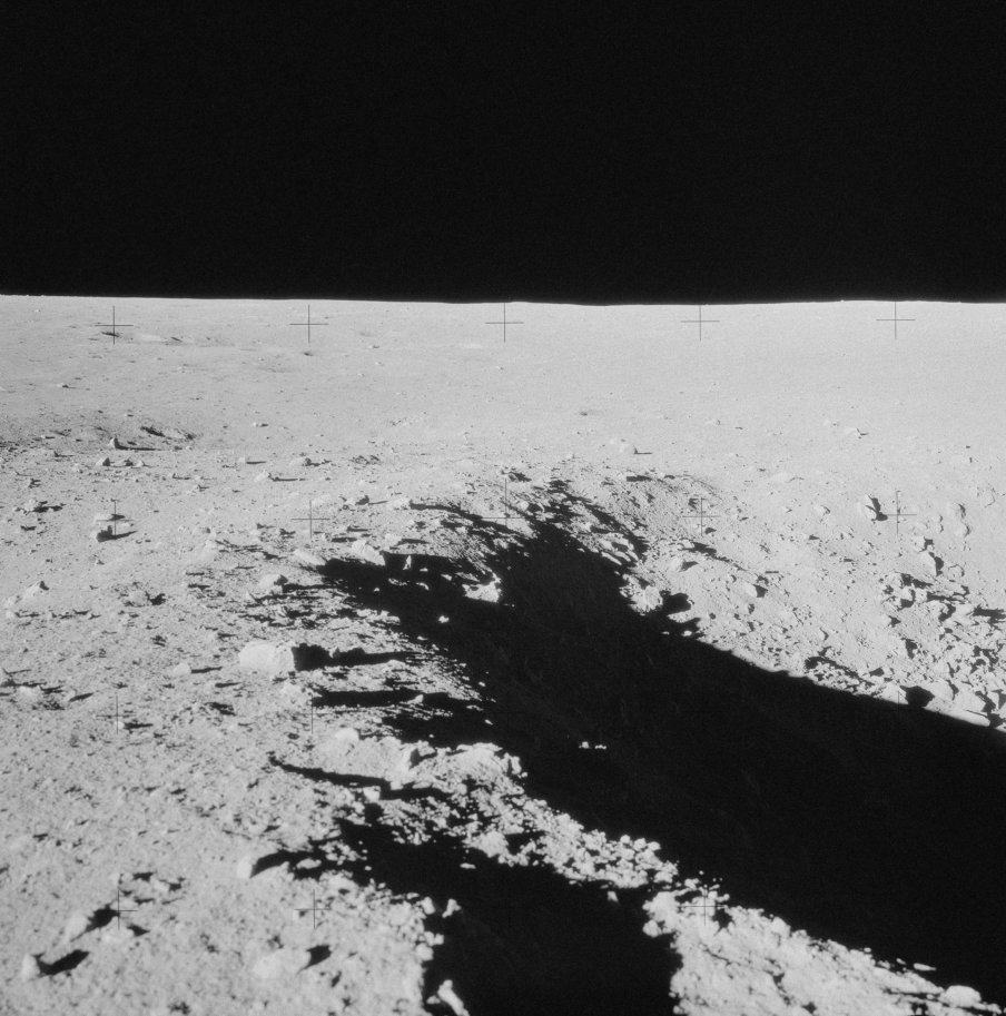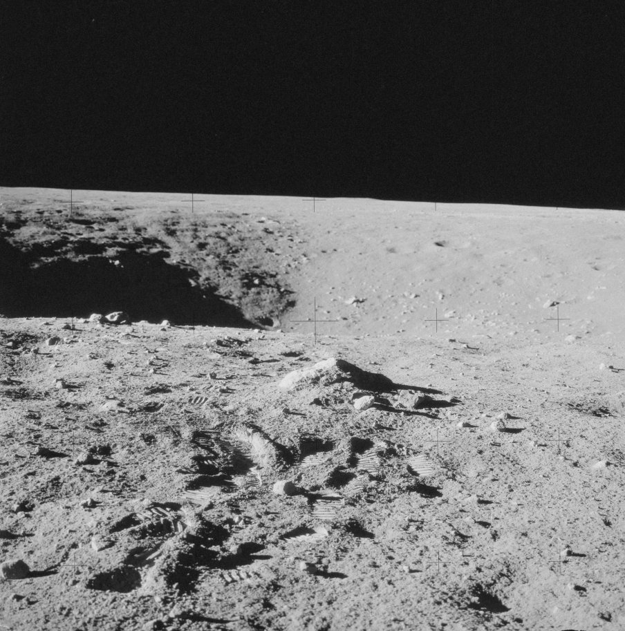 The raw image is M114104917R. See, also, a labeled version ( 0.8 Mb ). A labeled 2x detail shows features at the ALSEP site. Late in EVA-1, Pete and Al ran out to the rim of Middle Crescent Crater, where Pete took a pair of partial pans showing the crater. A variety of craters and boulders in the crater are identified in a comparison ( 5.1 Mb ) between Pete's first pan and the 29 Nov 2009 LROC image.09 January 2010 04:27:29 UTC; Solar El/Az 9.3/270.5; LRO altitude 43.1 km; resolution 0.49m/pixel ( 8.4 Mb )Deconvolved, 0.25 m/pixel (3.1 Mb TIF) and 0.5 m/pixel (3.4 Mb TIF) versions by GoneToPlaid.