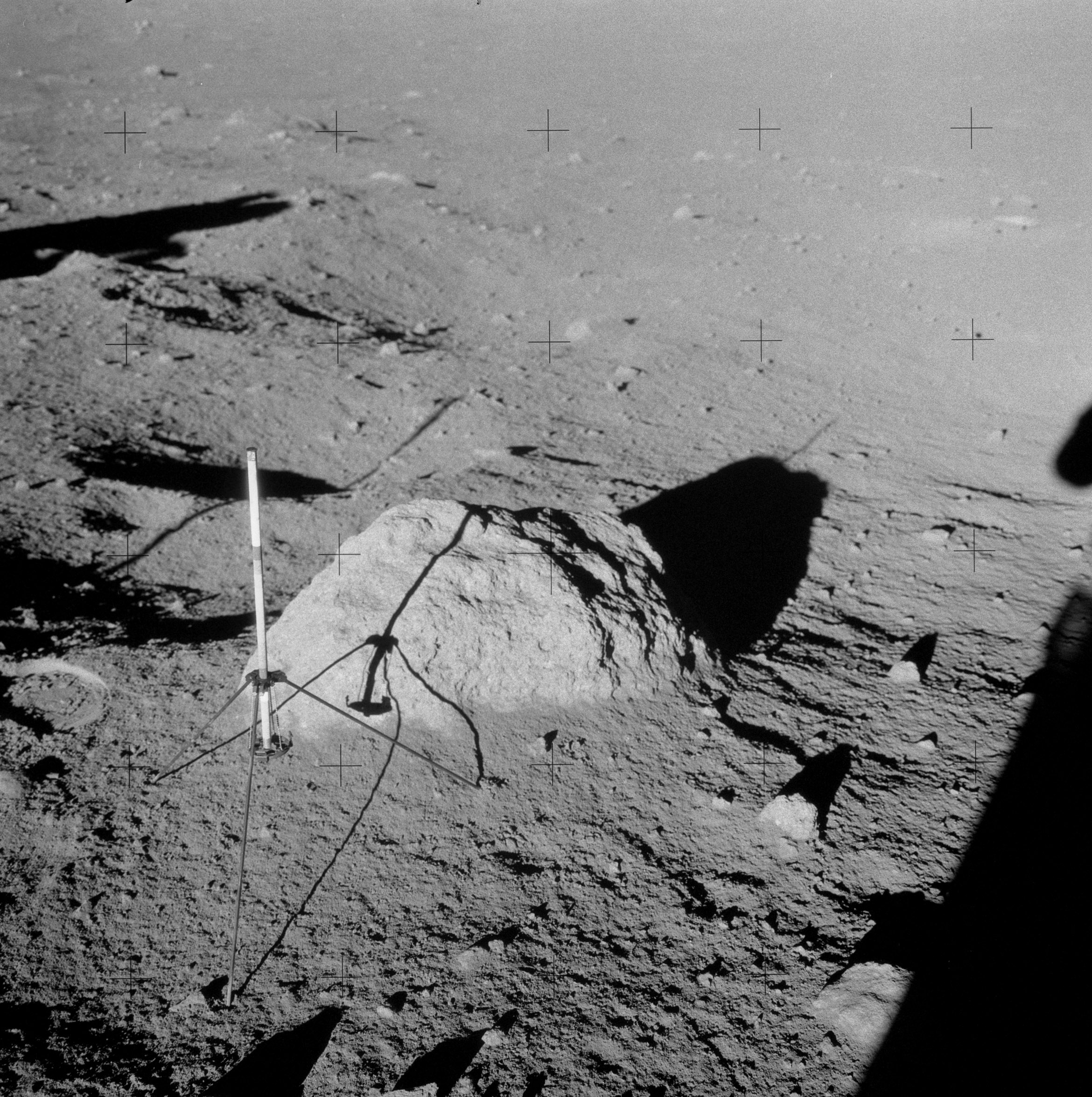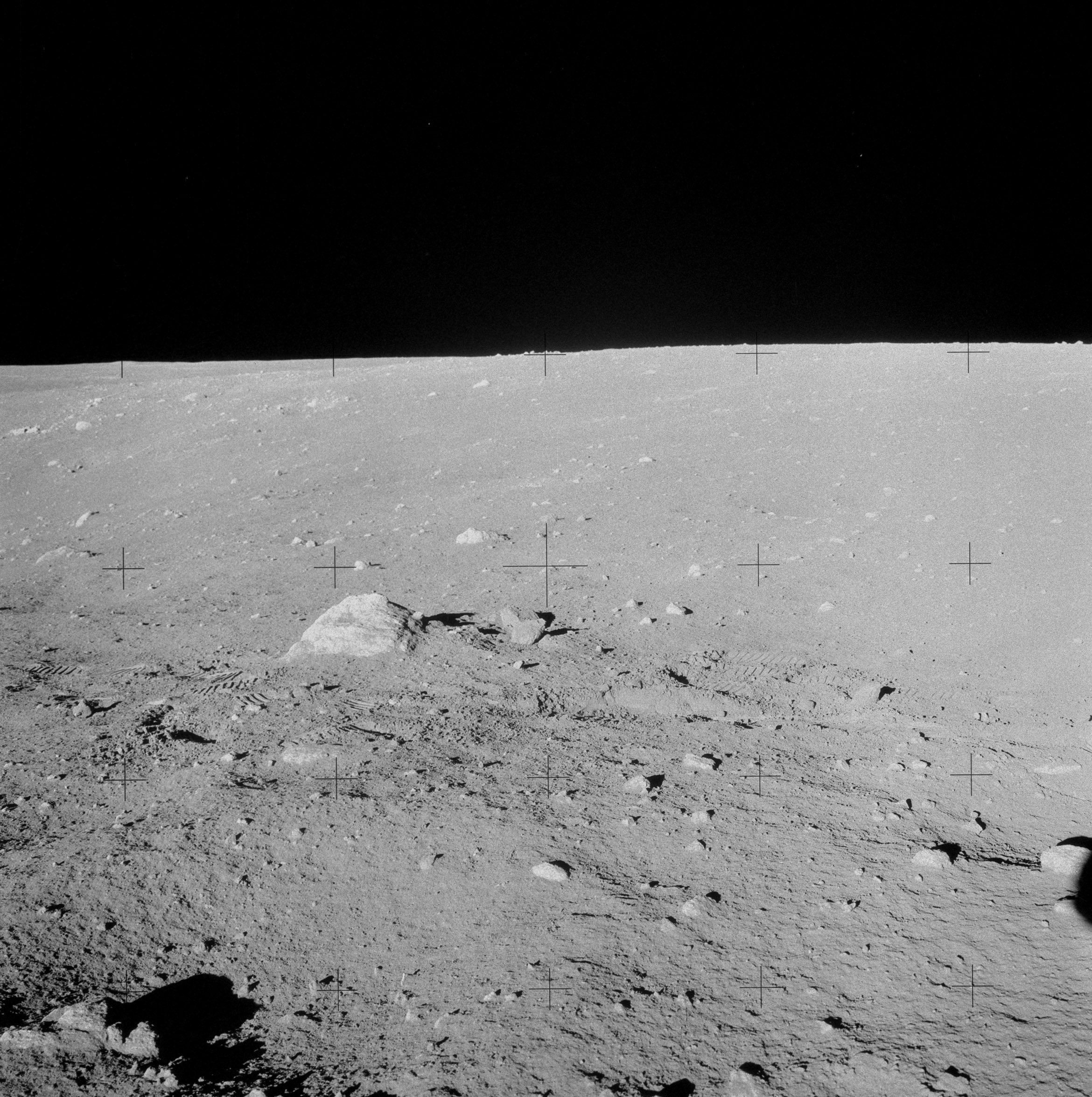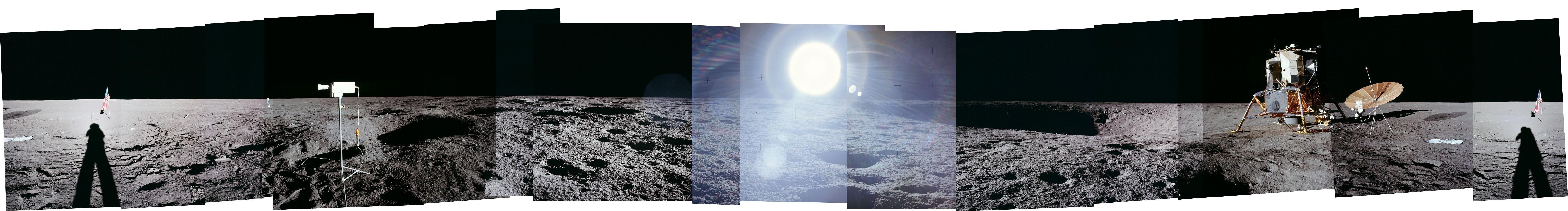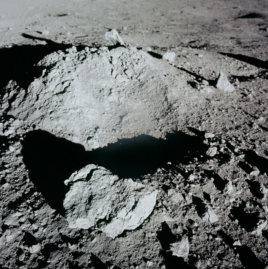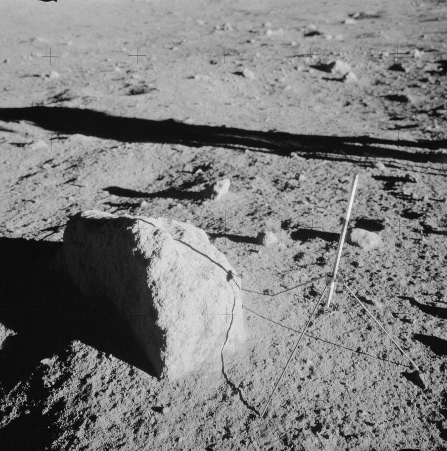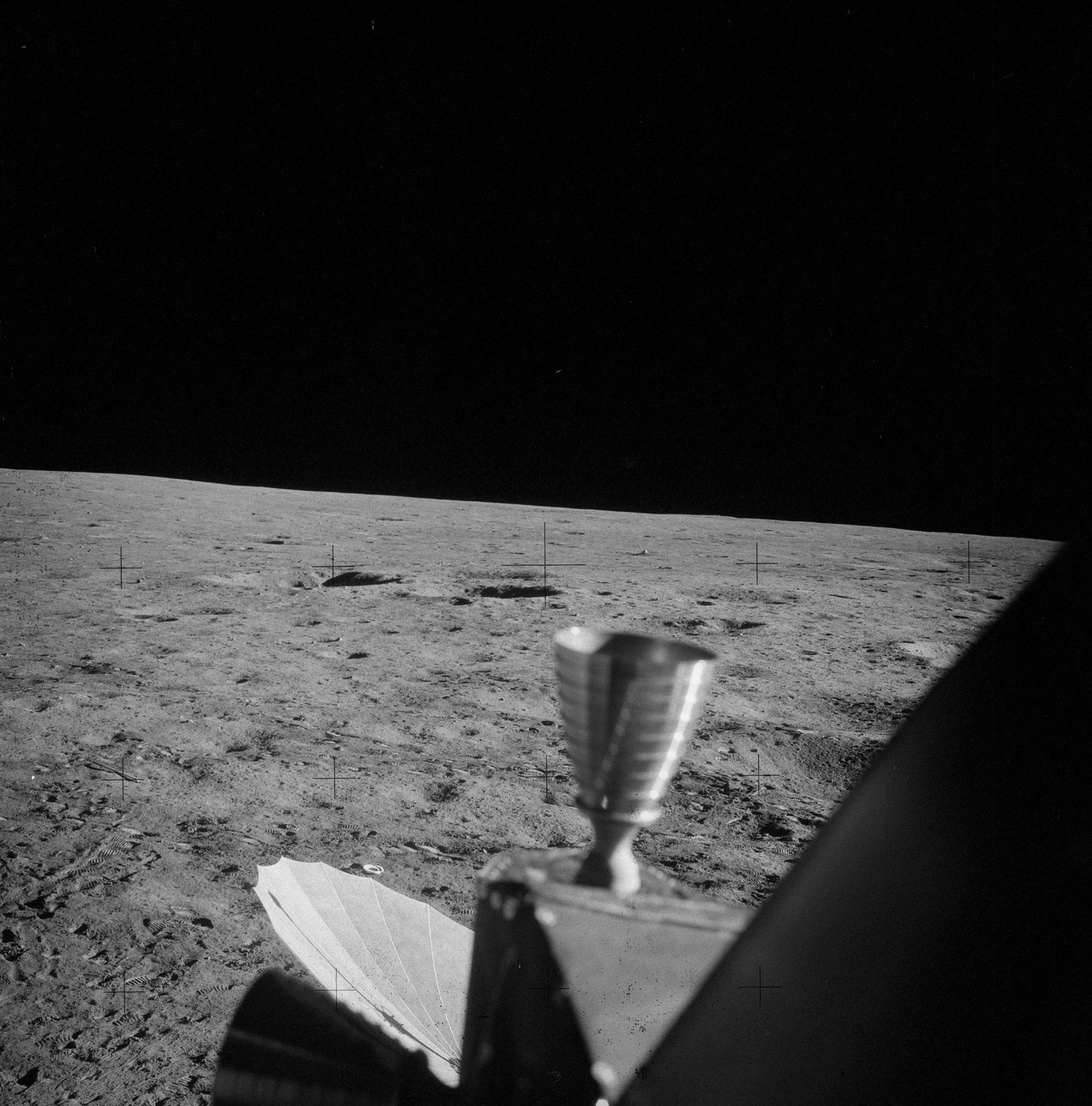 The raw image is M114104917R. See, also, a labeled version ( 0.8 Mb ). A labeled 2x detail shows features at the ALSEP site. Late in EVA-1, Pete and Al ran out to the rim of Middle Crescent Crater, where Pete took a pair of partial pans showing the crater. A variety of craters and boulders in the crater are identified in a comparison ( 5.1 Mb ) between Pete's first pan and the 29 Nov 2009 LROC image.09 January 2010 04:27:29 UTC; Solar El/Az 9.3/270.5; LRO altitude 43.1 km; resolution 0.49m/pixel ( 8.4 Mb )Deconvolved, 0.25 m/pixel (3.1 Mb TIF) and 0.5 m/pixel (3.4 Mb TIF) versions by GoneToPlaid.
