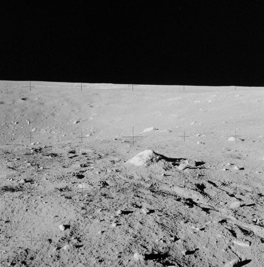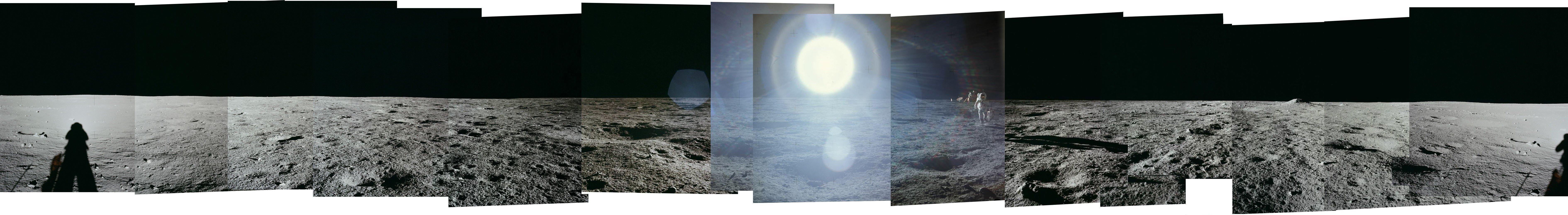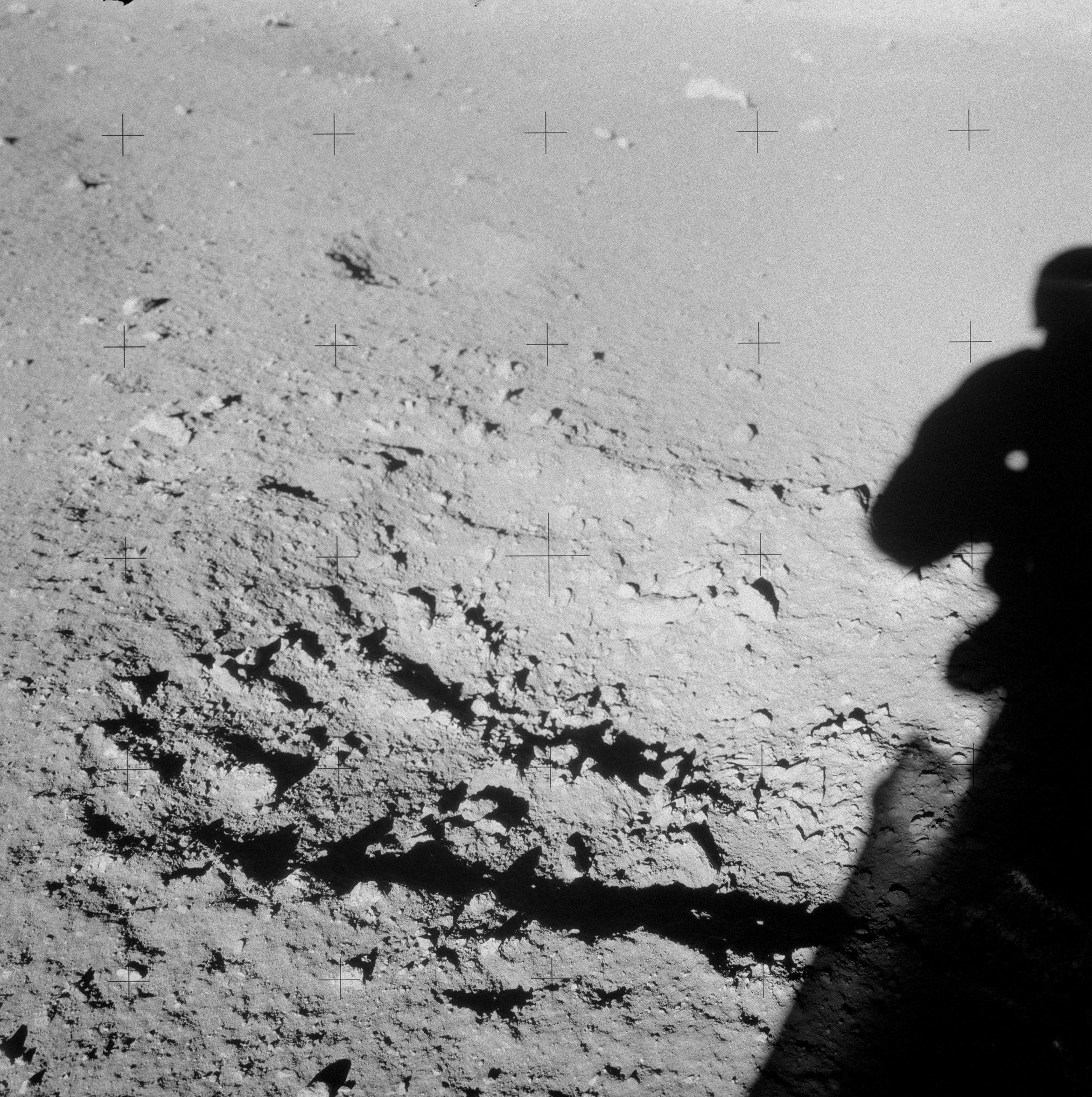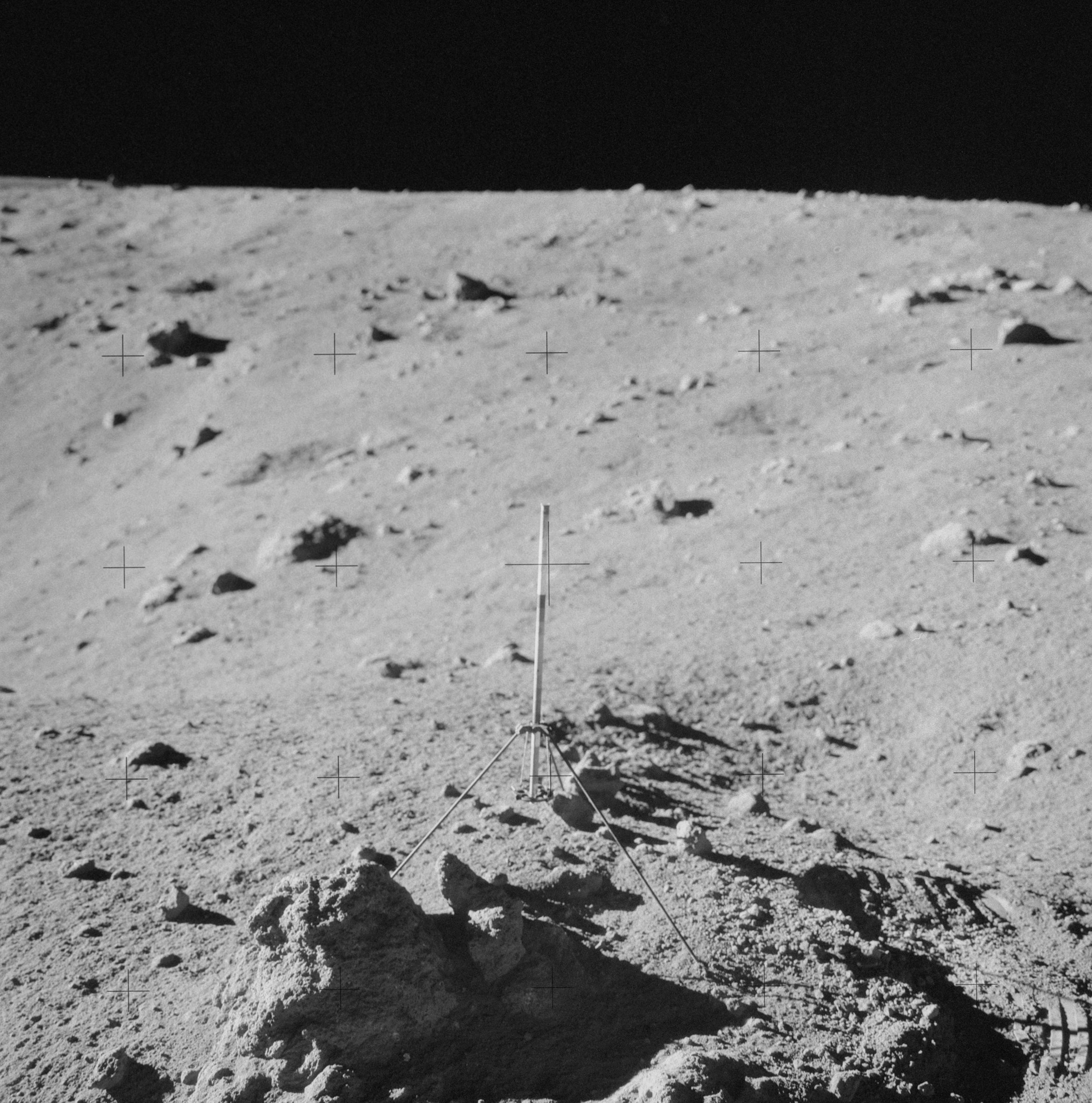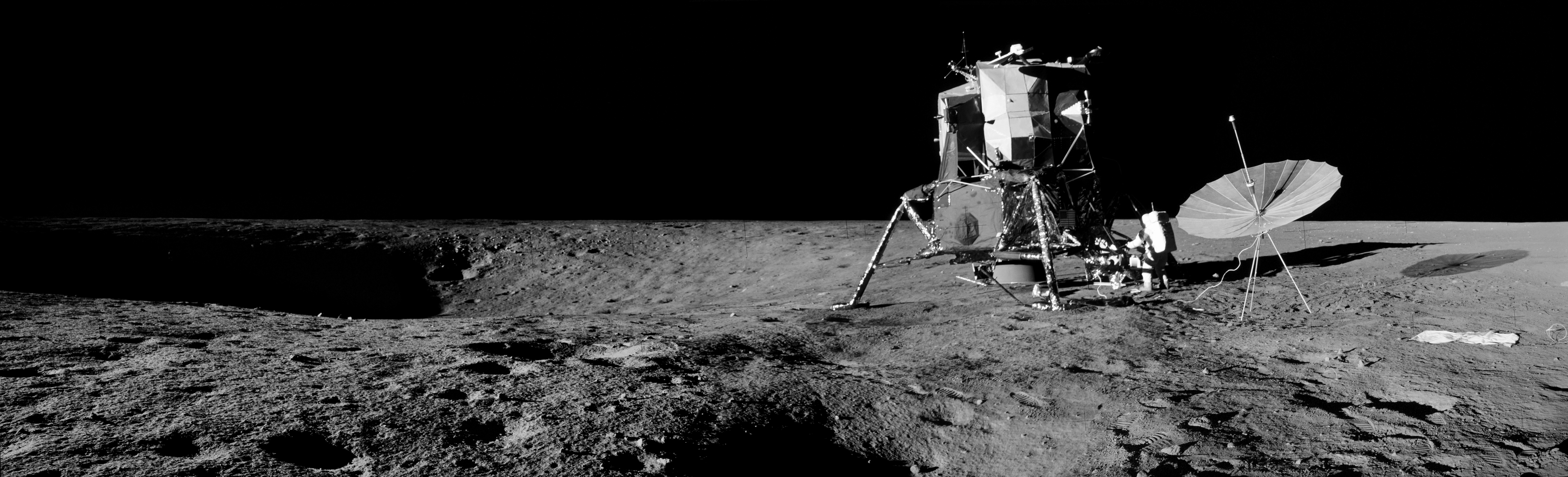 The raw image is M114104917R. See, also, a labeled version ( 0.8 Mb ). A labeled 2x detail shows features at the ALSEP site. Late in EVA-1, Pete and Al ran out to the rim of Middle Crescent Crater, where Pete took a pair of partial pans showing the crater. A variety of craters and boulders in the crater are identified in a comparison ( 5.1 Mb ) between Pete's first pan and the 29 Nov 2009 LROC image.09 January 2010 04:27:29 UTC; Solar El/Az 9.3/270.5; LRO altitude 43.1 km; resolution 0.49m/pixel ( 8.4 Mb )Deconvolved, 0.25 m/pixel (3.1 Mb TIF) and 0.5 m/pixel (3.4 Mb TIF) versions by GoneToPlaid.