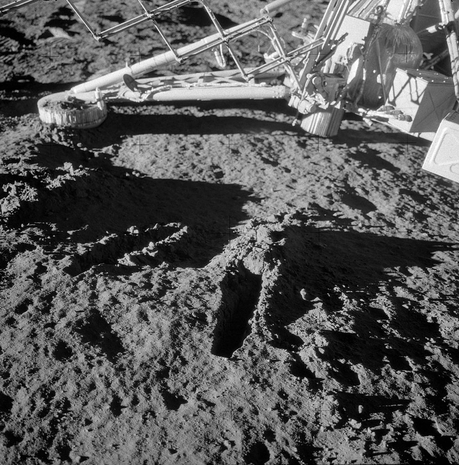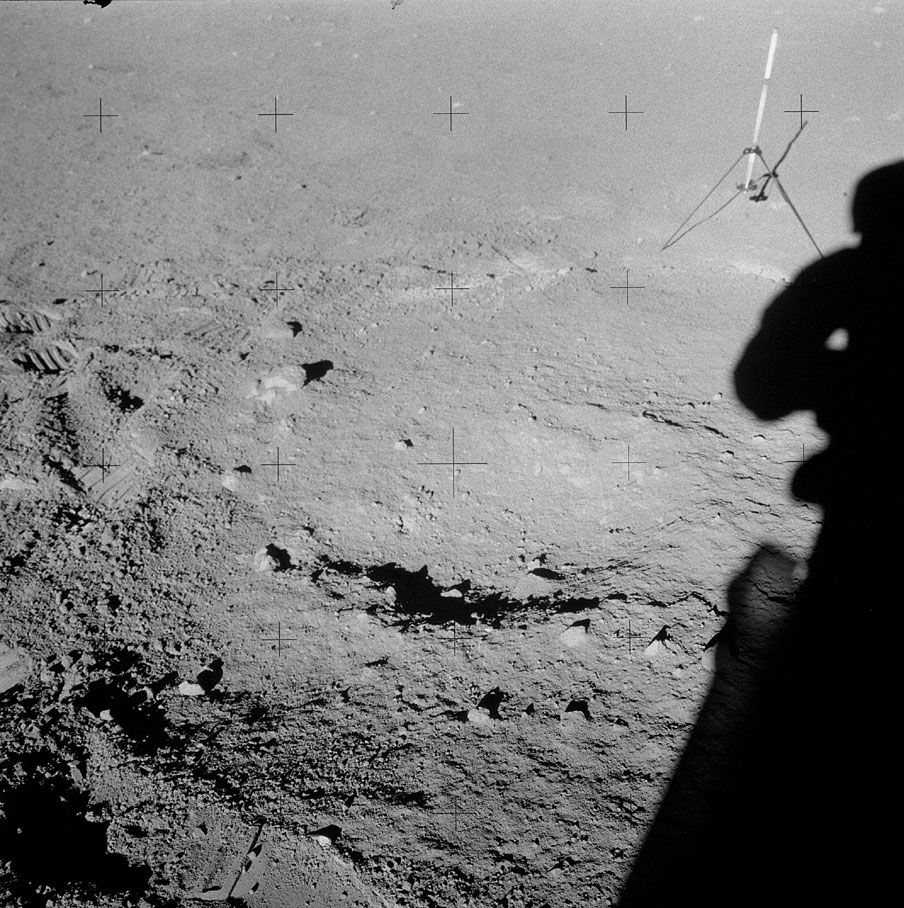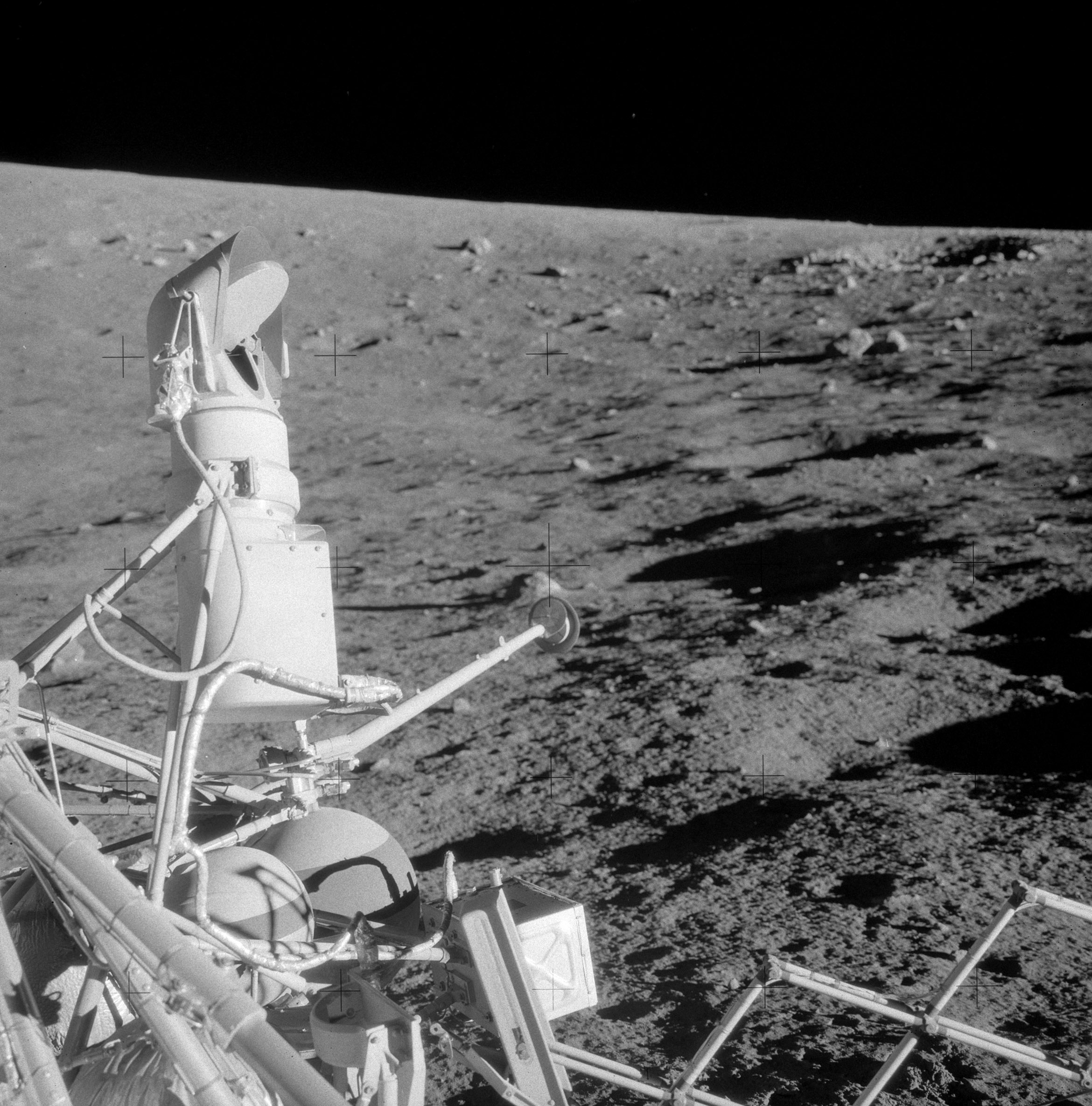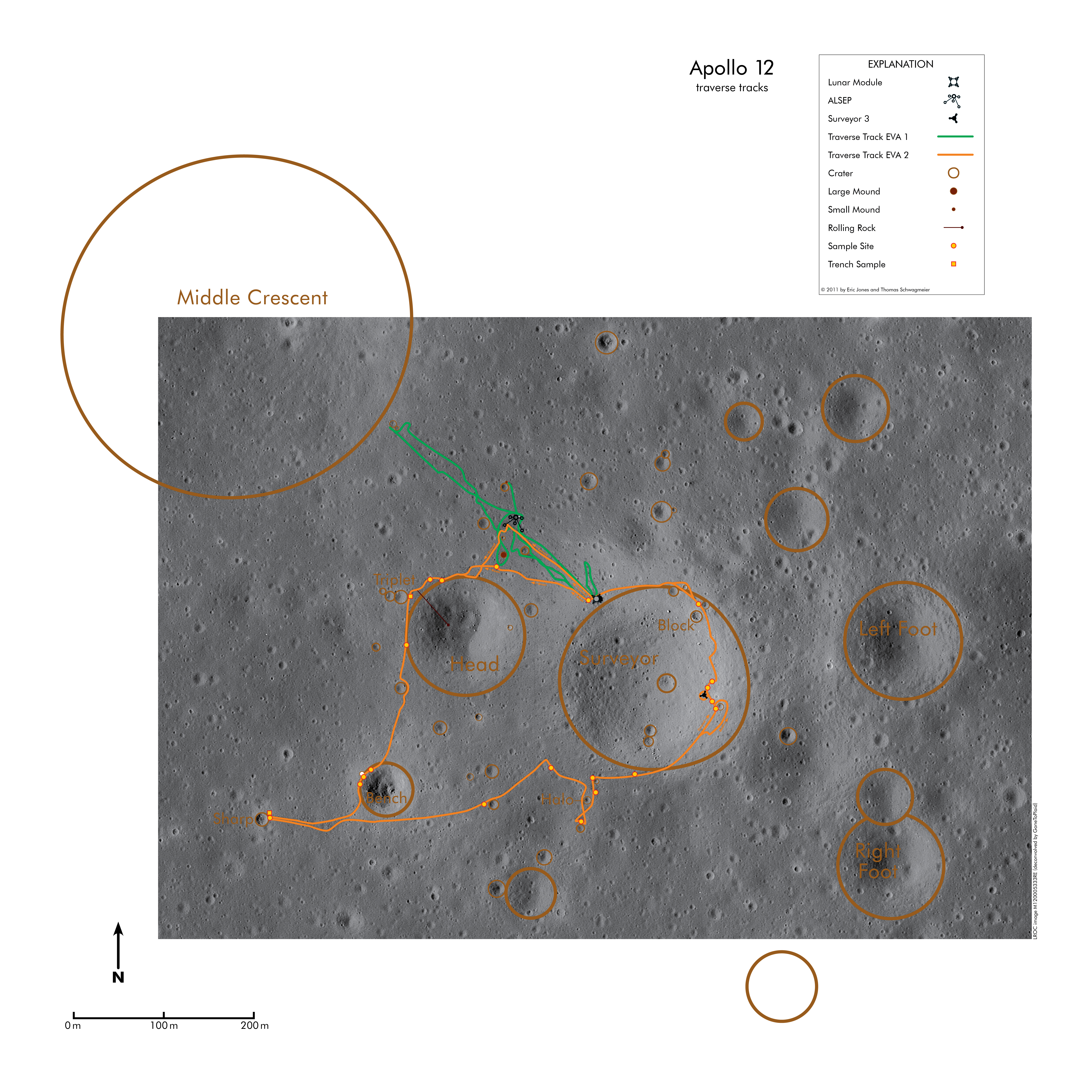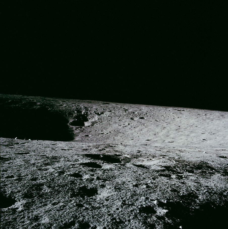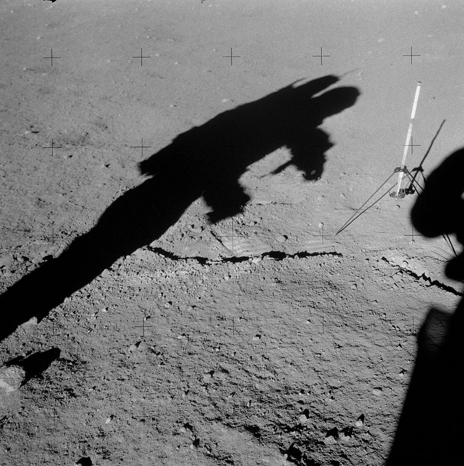 The raw image is M114104917R. See, also, a labeled version ( 0.8 Mb ). A labeled 2x detail shows features at the ALSEP site. Late in EVA-1, Pete and Al ran out to the rim of Middle Crescent Crater, where Pete took a pair of partial pans showing the crater. A variety of craters and boulders in the crater are identified in a comparison ( 5.1 Mb ) between Pete's first pan and the 29 Nov 2009 LROC image.09 January 2010 04:27:29 UTC; Solar El/Az 9.3/270.5; LRO altitude 43.1 km; resolution 0.49m/pixel ( 8.4 Mb )Deconvolved, 0.25 m/pixel (3.1 Mb TIF) and 0.5 m/pixel (3.4 Mb TIF) versions by GoneToPlaid.
