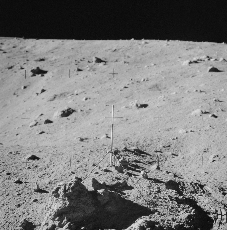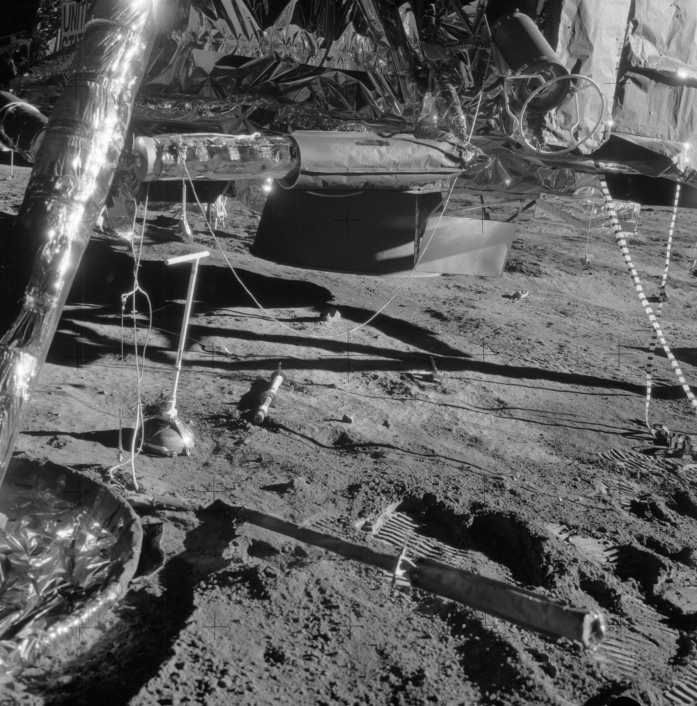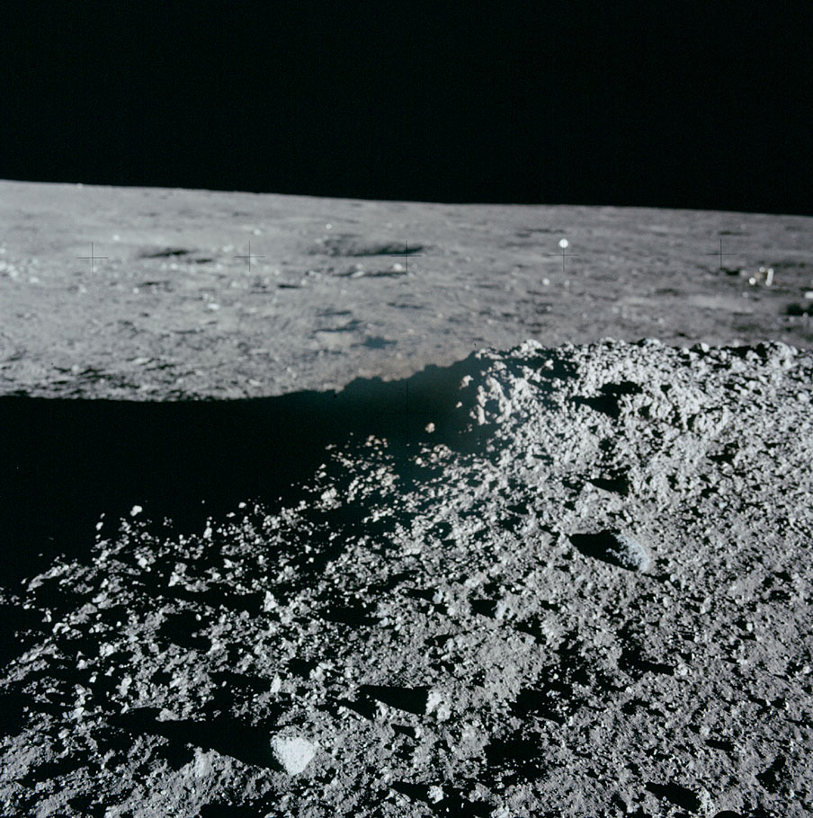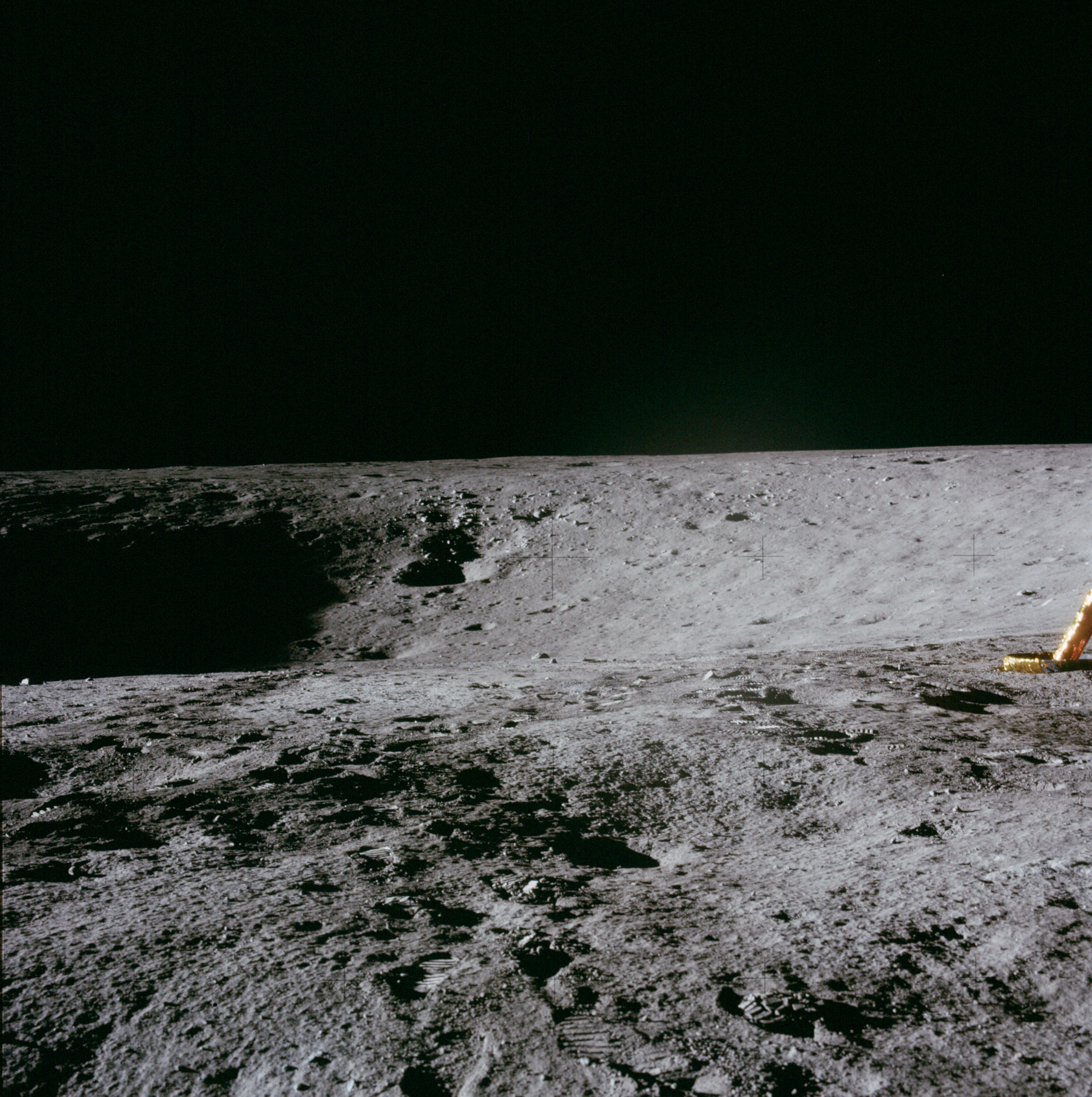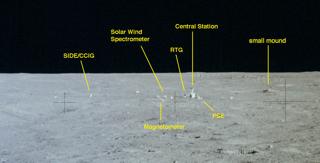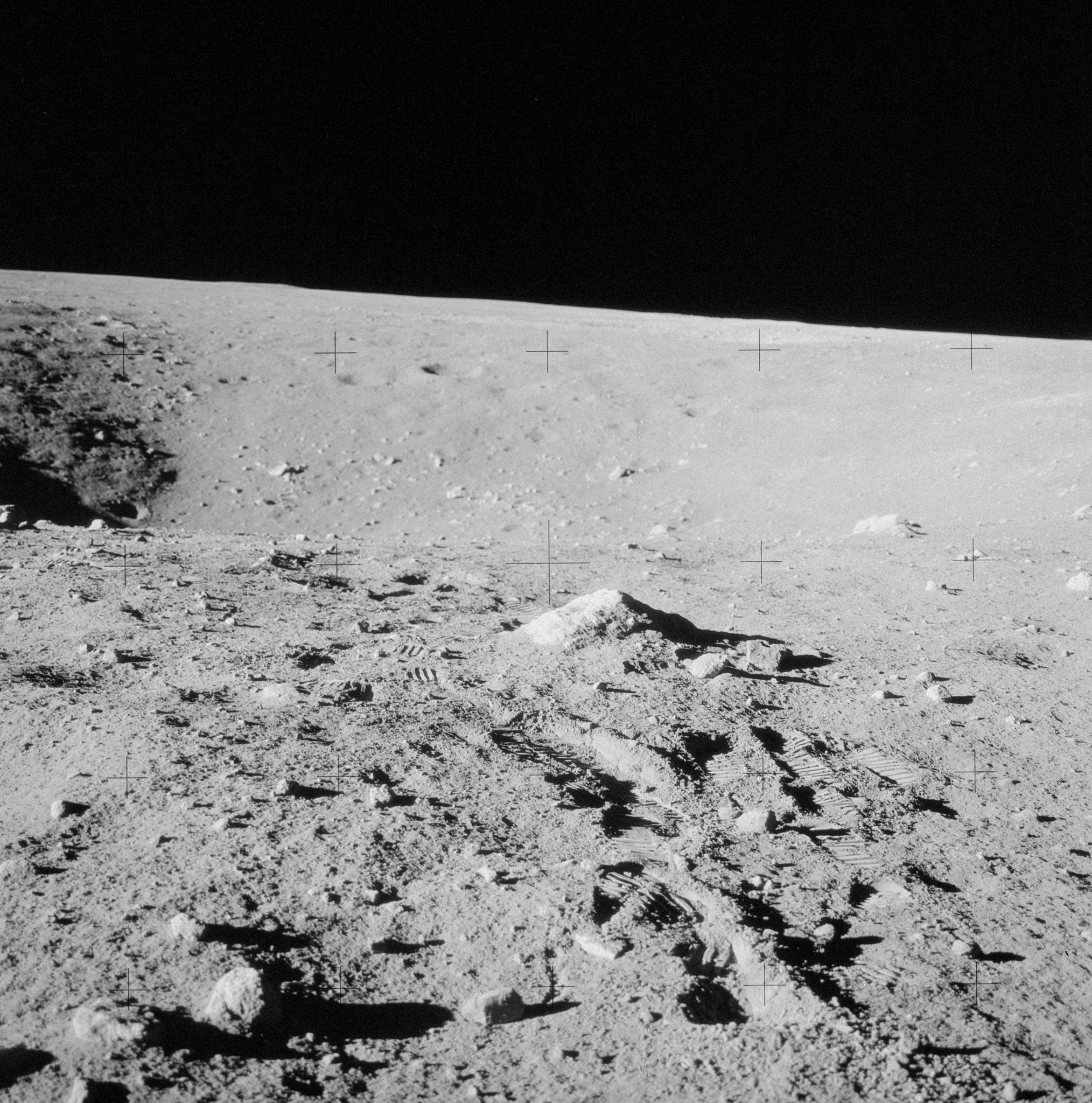 The raw image is M114104917R. See, also, a labeled version ( 0.8 Mb ). A labeled 2x detail shows features at the ALSEP site. Late in EVA-1, Pete and Al ran out to the rim of Middle Crescent Crater, where Pete took a pair of partial pans showing the crater. A variety of craters and boulders in the crater are identified in a comparison ( 5.1 Mb ) between Pete's first pan and the 29 Nov 2009 LROC image.09 January 2010 04:27:29 UTC; Solar El/Az 9.3/270.5; LRO altitude 43.1 km; resolution 0.49m/pixel ( 8.4 Mb )Deconvolved, 0.25 m/pixel (3.1 Mb TIF) and 0.5 m/pixel (3.4 Mb TIF) versions by GoneToPlaid.