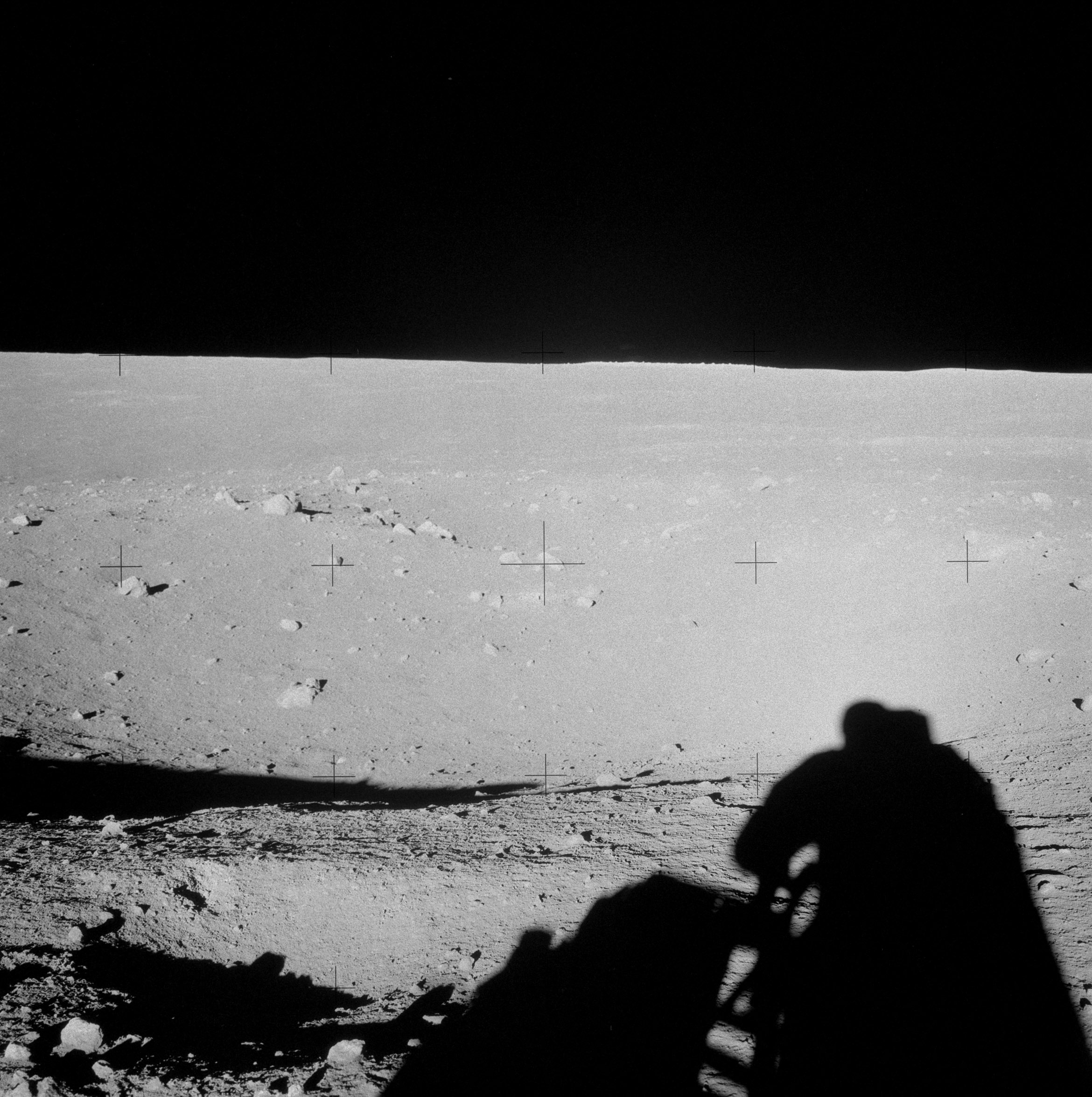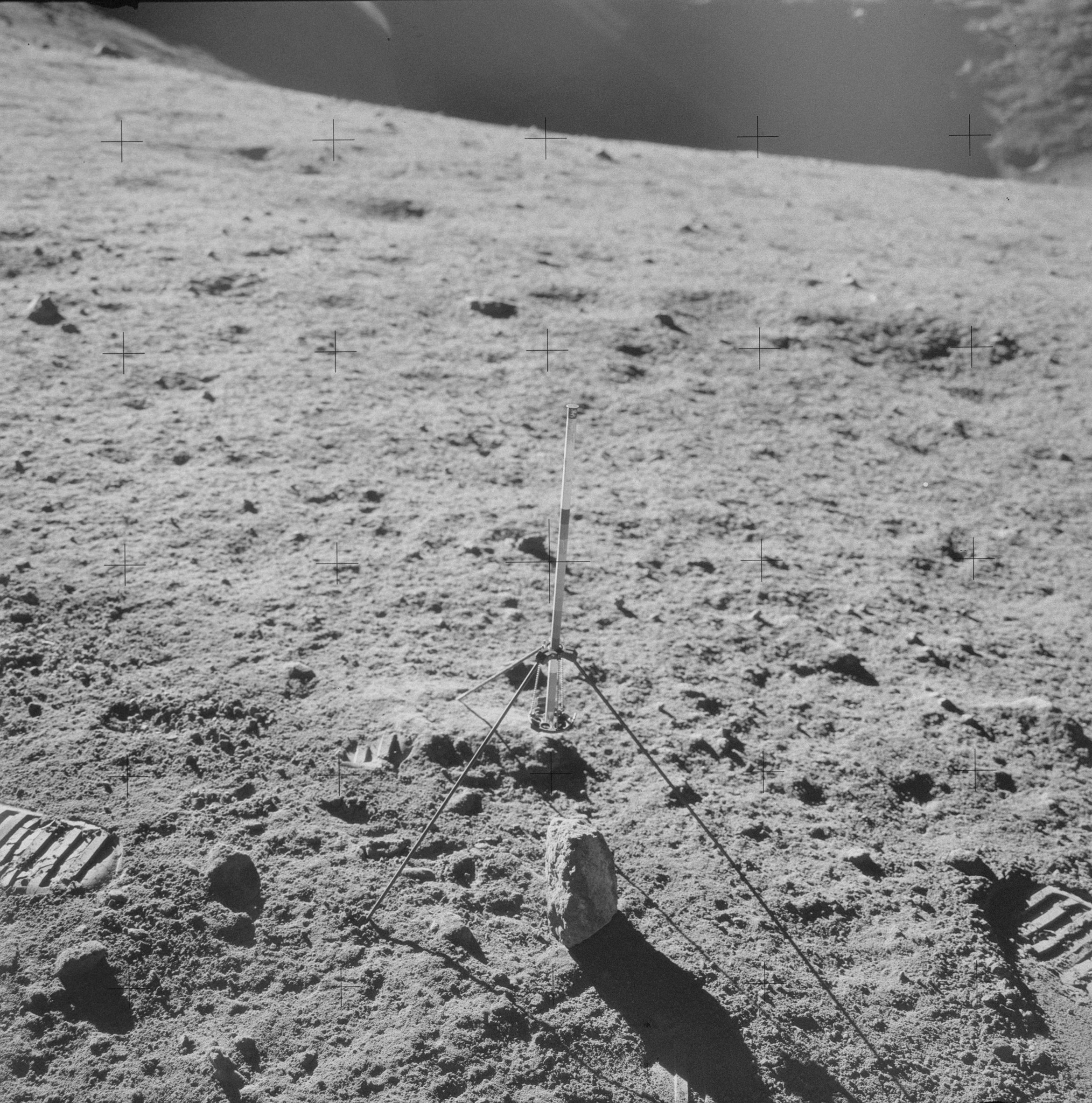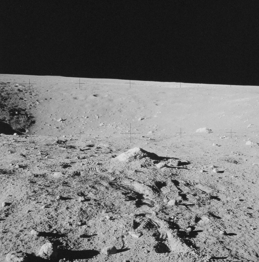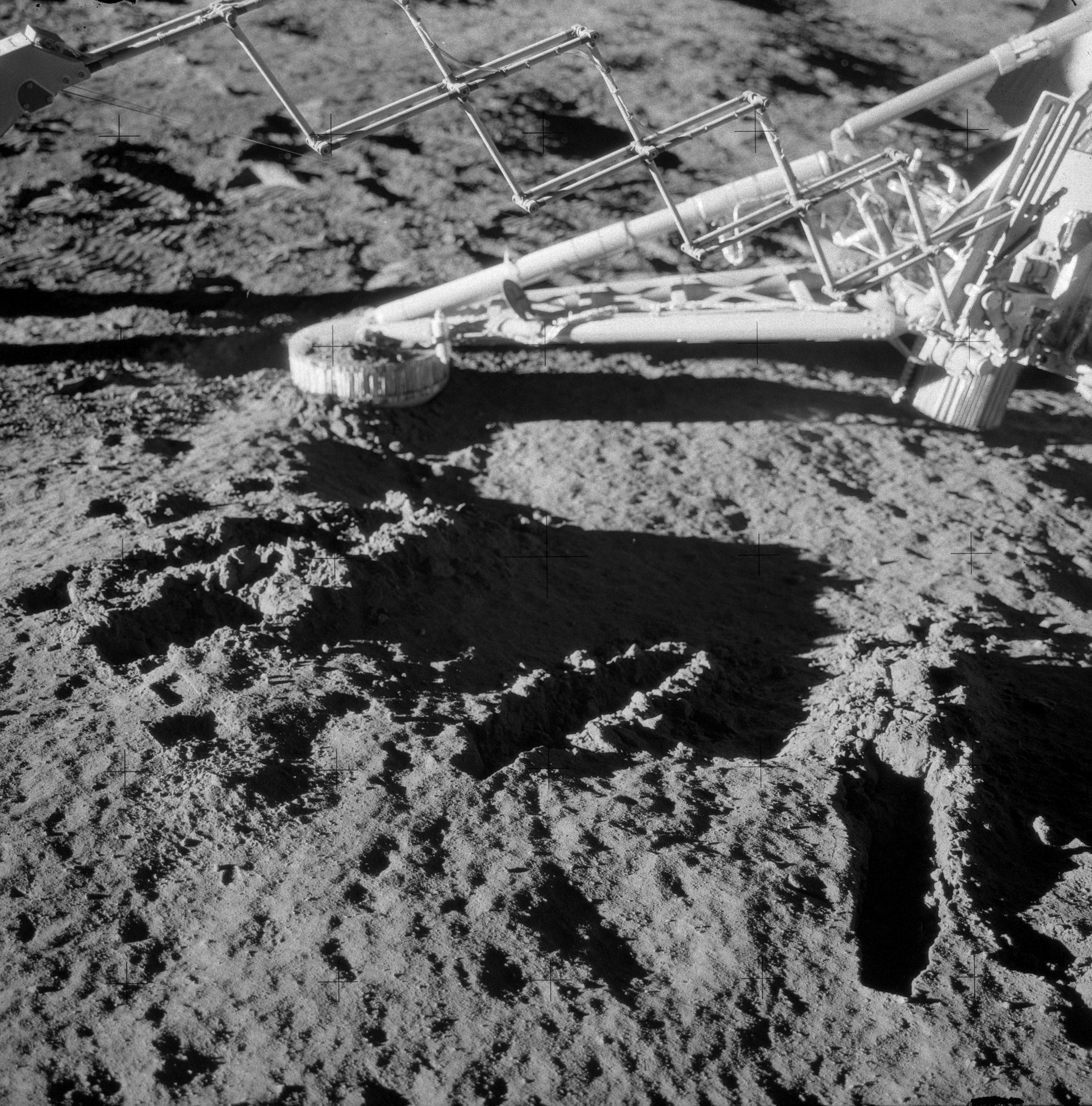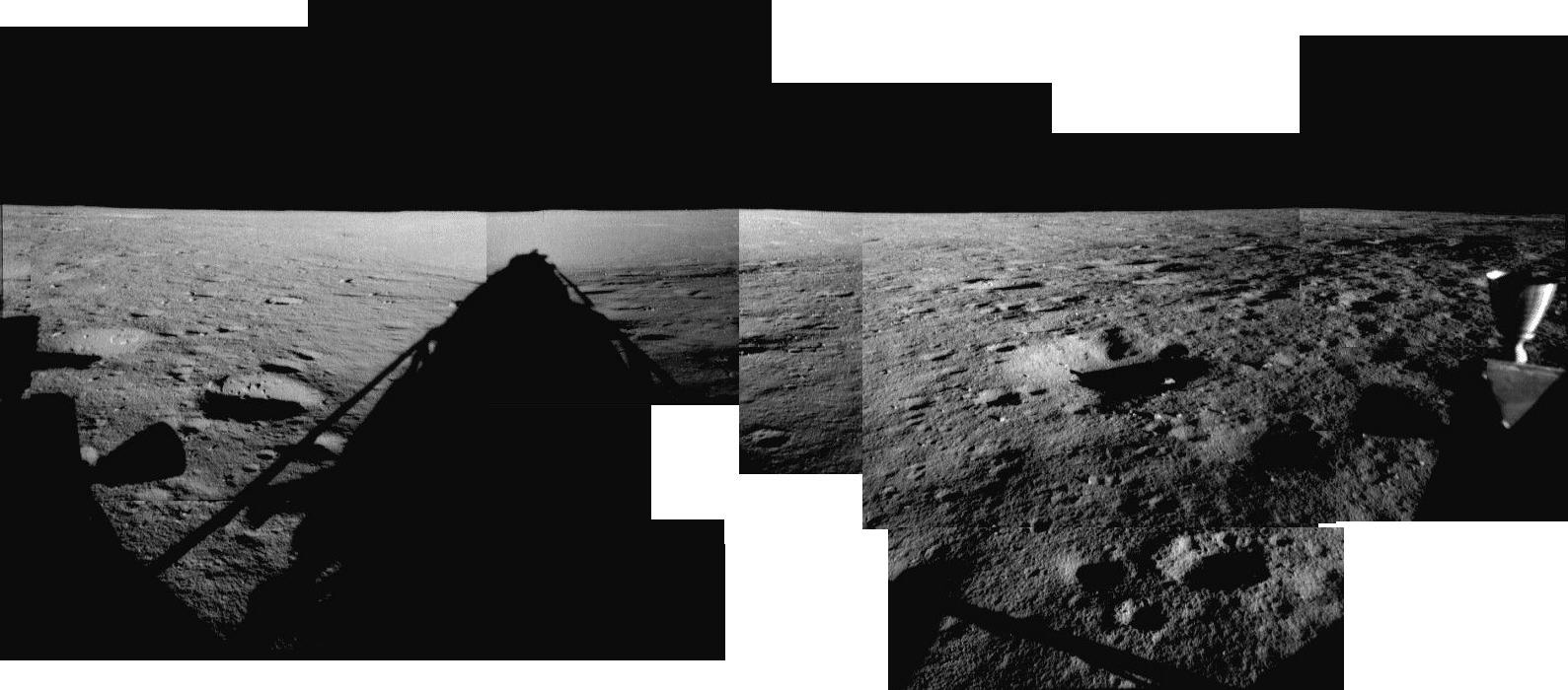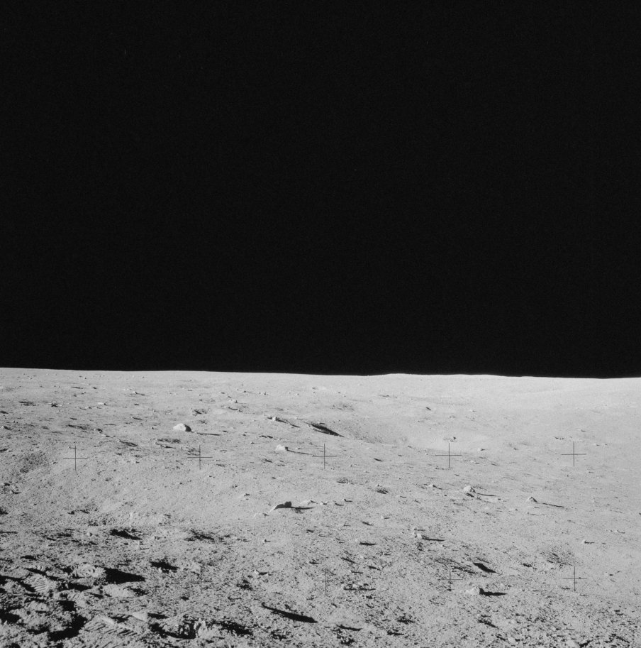 The raw image is M114104917R. See, also, a labeled version ( 0.8 Mb ). A labeled 2x detail shows features at the ALSEP site. Late in EVA-1, Pete and Al ran out to the rim of Middle Crescent Crater, where Pete took a pair of partial pans showing the crater. A variety of craters and boulders in the crater are identified in a comparison ( 5.1 Mb ) between Pete's first pan and the 29 Nov 2009 LROC image.09 January 2010 04:27:29 UTC; Solar El/Az 9.3/270.5; LRO altitude 43.1 km; resolution 0.49m/pixel ( 8.4 Mb )Deconvolved, 0.25 m/pixel (3.1 Mb TIF) and 0.5 m/pixel (3.4 Mb TIF) versions by GoneToPlaid.