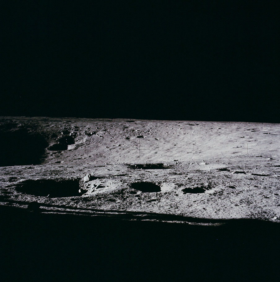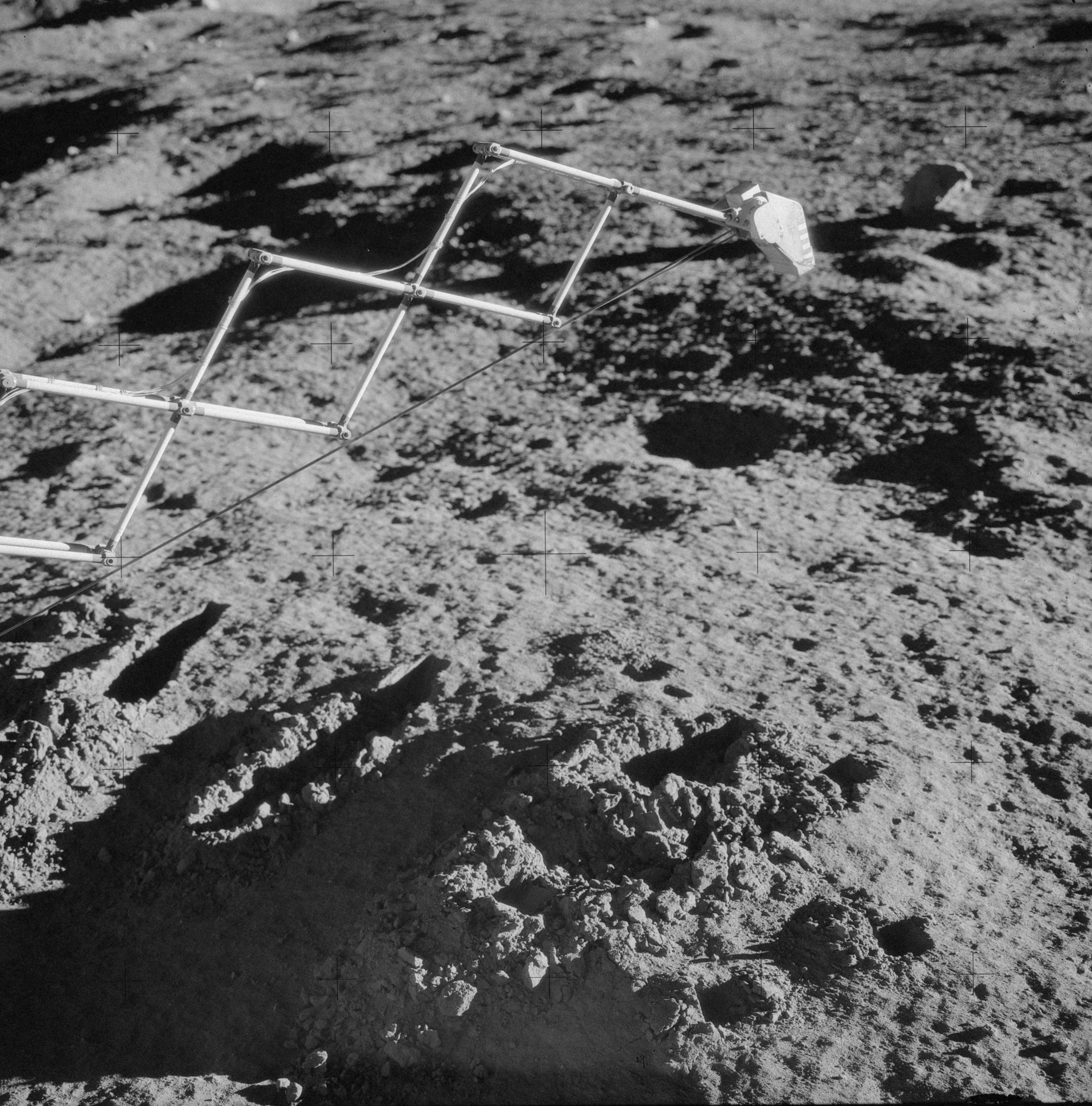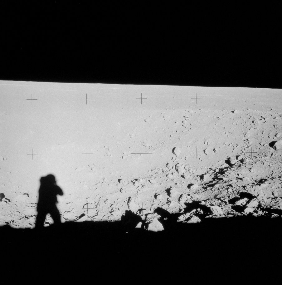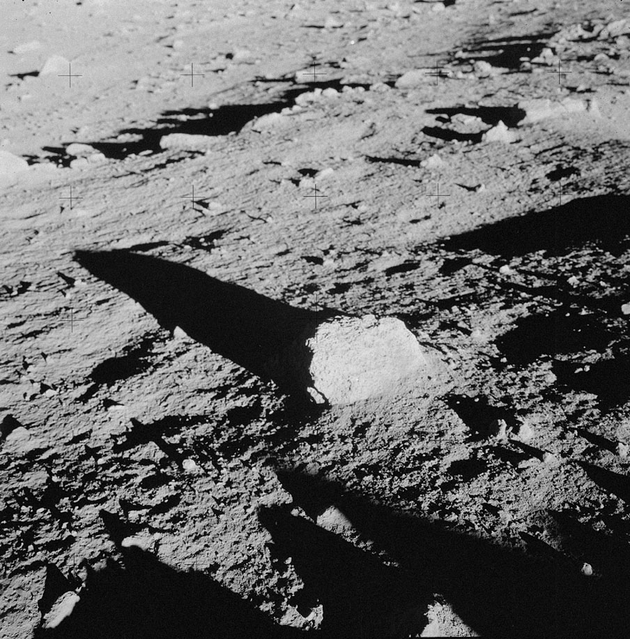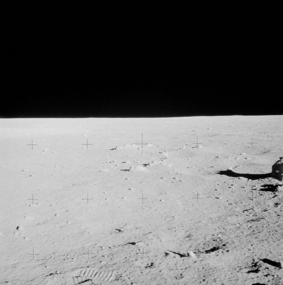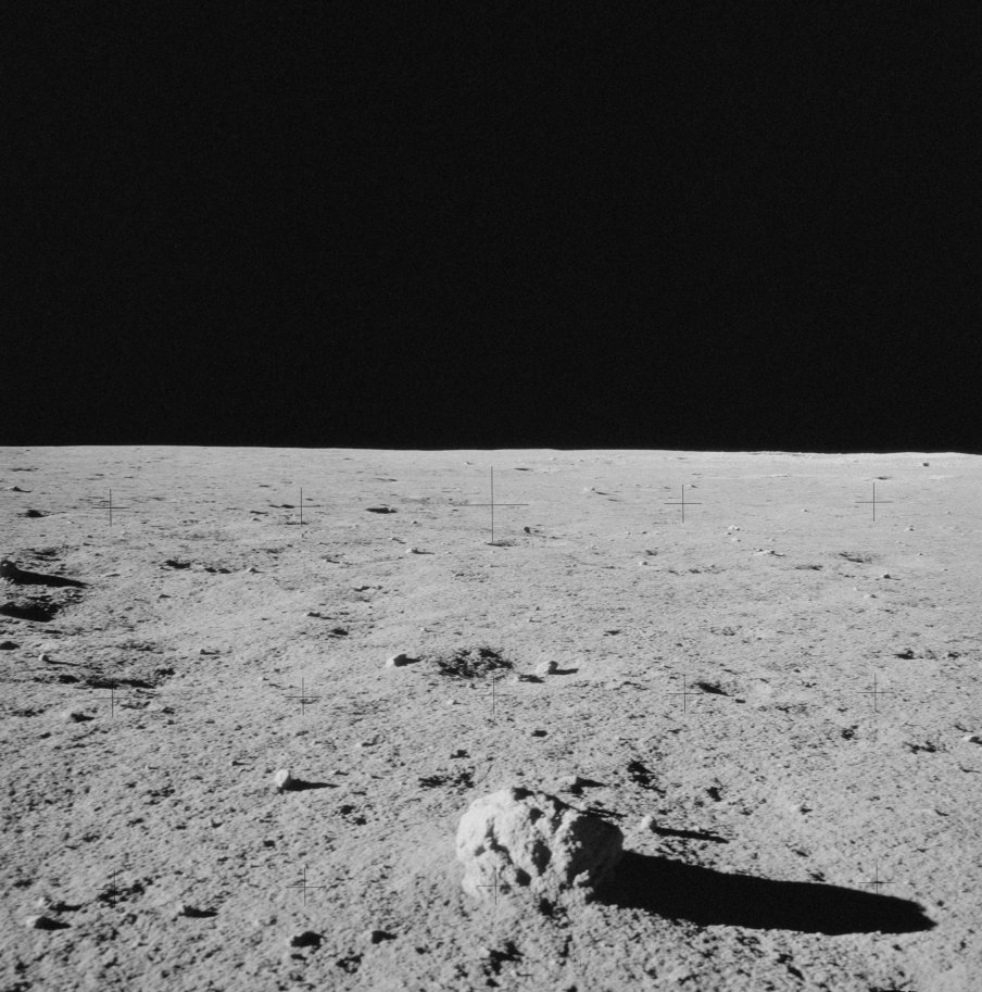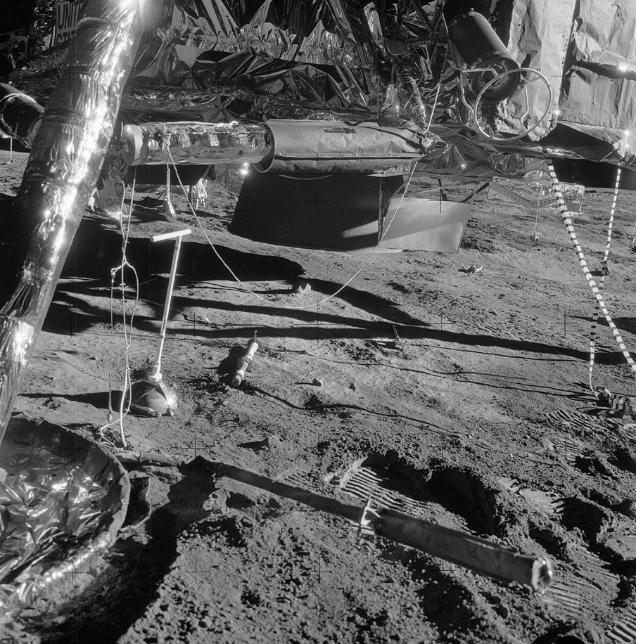 The raw image is M114104917R. See, also, a labeled version ( 0.8 Mb ). A labeled 2x detail shows features at the ALSEP site. Late in EVA-1, Pete and Al ran out to the rim of Middle Crescent Crater, where Pete took a pair of partial pans showing the crater. A variety of craters and boulders in the crater are identified in a comparison ( 5.1 Mb ) between Pete's first pan and the 29 Nov 2009 LROC image.09 January 2010 04:27:29 UTC; Solar El/Az 9.3/270.5; LRO altitude 43.1 km; resolution 0.49m/pixel ( 8.4 Mb )Deconvolved, 0.25 m/pixel (3.1 Mb TIF) and 0.5 m/pixel (3.4 Mb TIF) versions by GoneToPlaid.