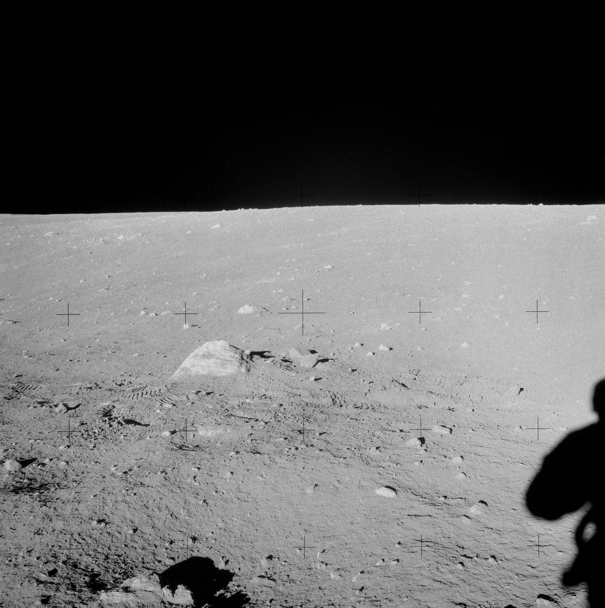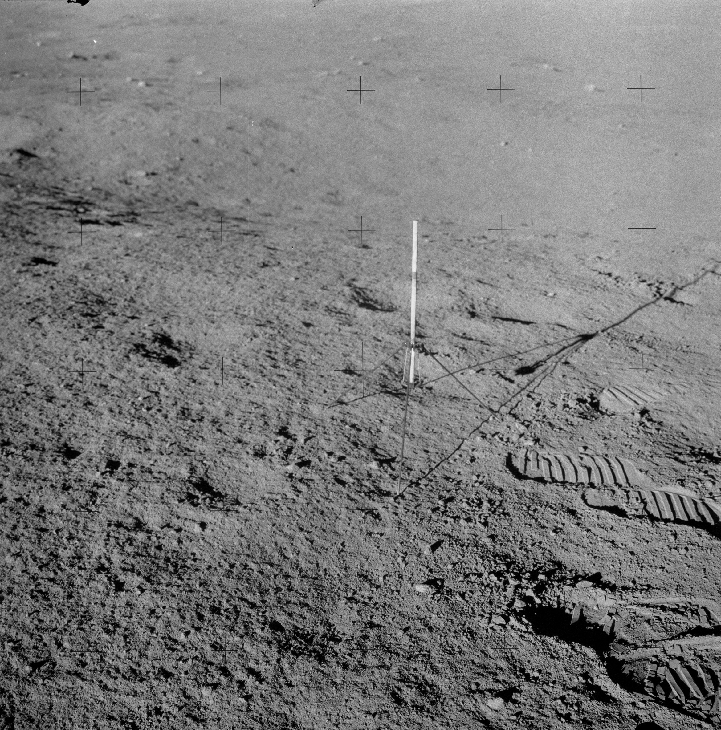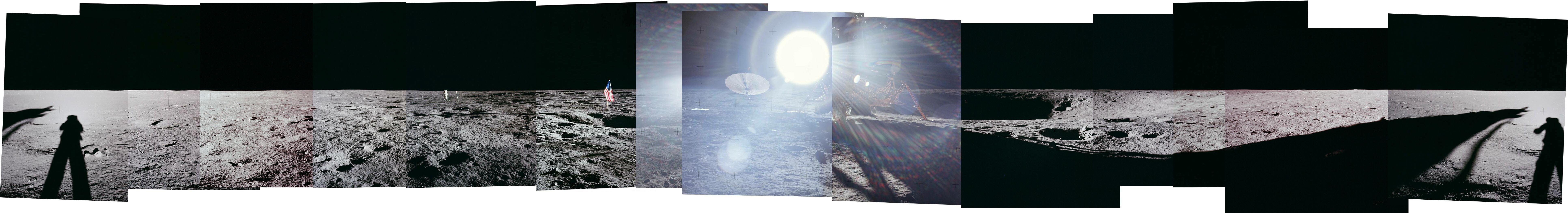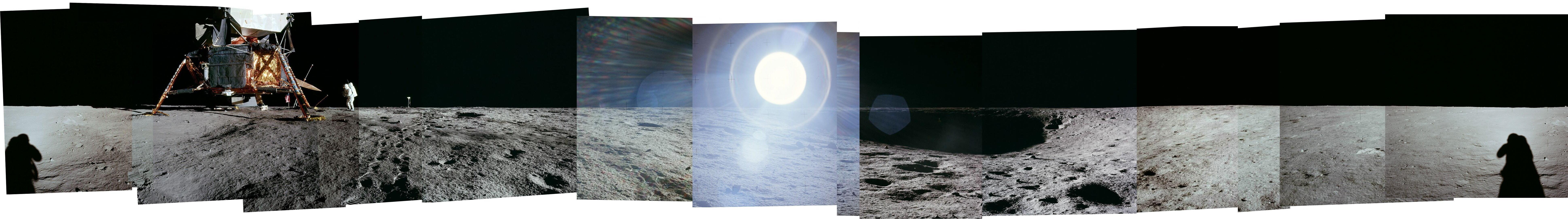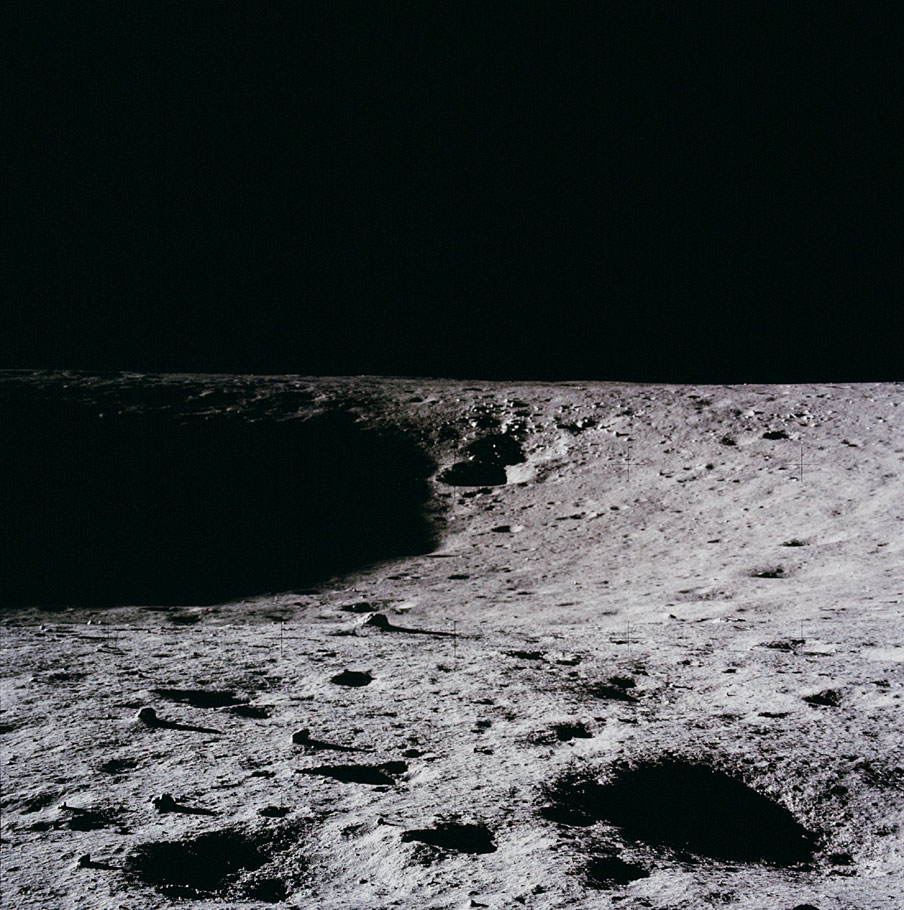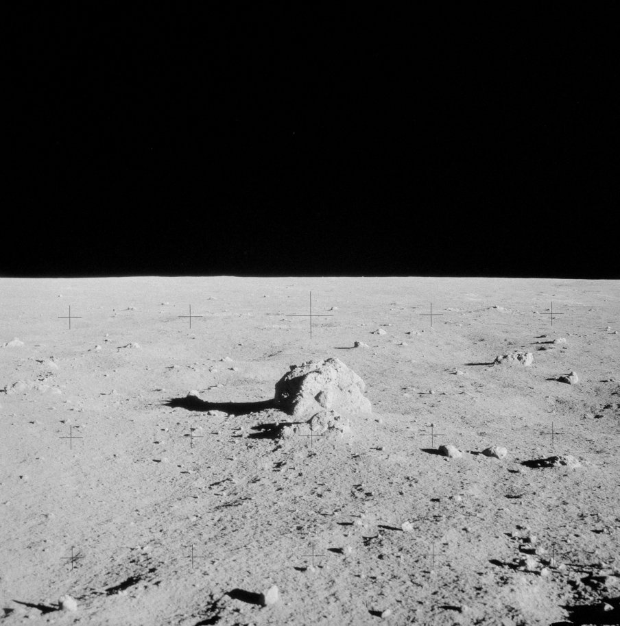 The raw image is M114104917R. See, also, a labeled version ( 0.8 Mb ). A labeled 2x detail shows features at the ALSEP site. Late in EVA-1, Pete and Al ran out to the rim of Middle Crescent Crater, where Pete took a pair of partial pans showing the crater. A variety of craters and boulders in the crater are identified in a comparison ( 5.1 Mb ) between Pete's first pan and the 29 Nov 2009 LROC image.09 January 2010 04:27:29 UTC; Solar El/Az 9.3/270.5; LRO altitude 43.1 km; resolution 0.49m/pixel ( 8.4 Mb )Deconvolved, 0.25 m/pixel (3.1 Mb TIF) and 0.5 m/pixel (3.4 Mb TIF) versions by GoneToPlaid.