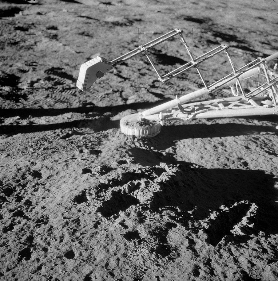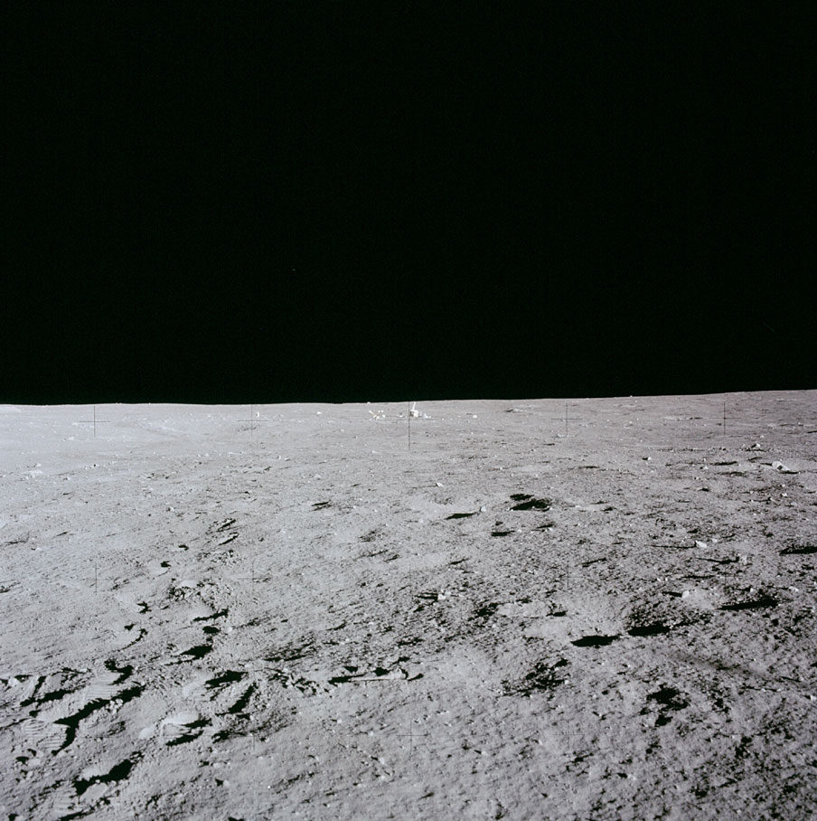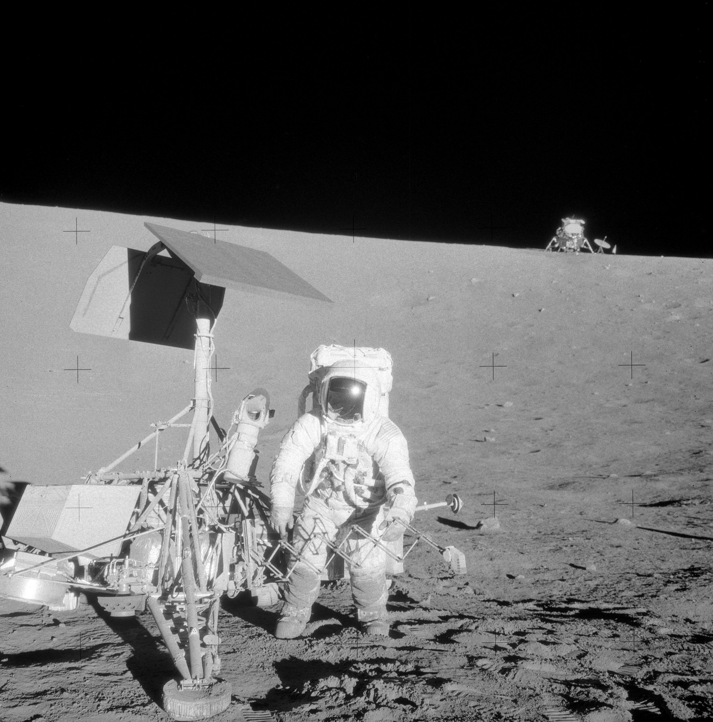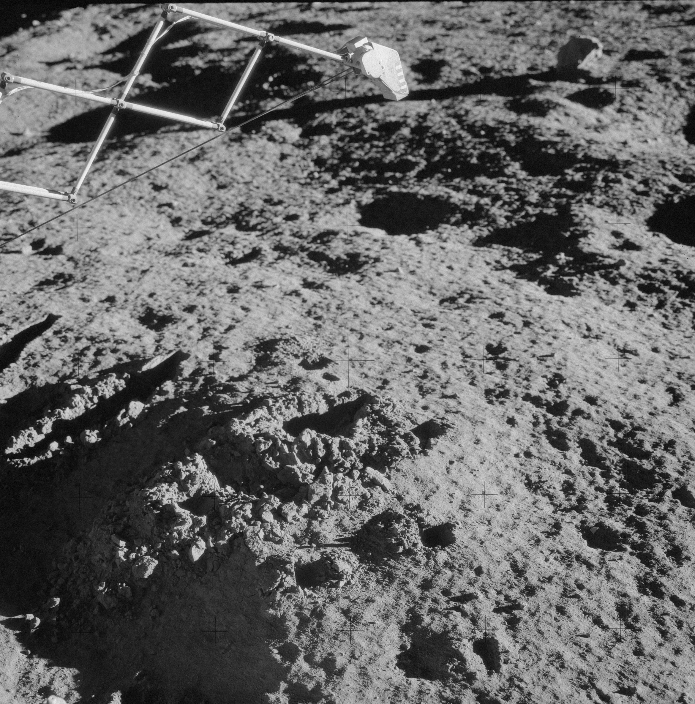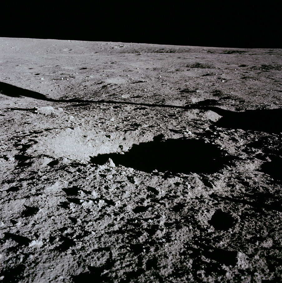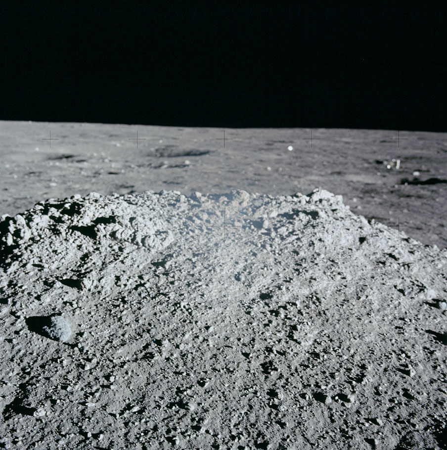 The raw image is M114104917R. See, also, a labeled version ( 0.8 Mb ). A labeled 2x detail shows features at the ALSEP site. Late in EVA-1, Pete and Al ran out to the rim of Middle Crescent Crater, where Pete took a pair of partial pans showing the crater. A variety of craters and boulders in the crater are identified in a comparison ( 5.1 Mb ) between Pete's first pan and the 29 Nov 2009 LROC image.09 January 2010 04:27:29 UTC; Solar El/Az 9.3/270.5; LRO altitude 43.1 km; resolution 0.49m/pixel ( 8.4 Mb )Deconvolved, 0.25 m/pixel (3.1 Mb TIF) and 0.5 m/pixel (3.4 Mb TIF) versions by GoneToPlaid.