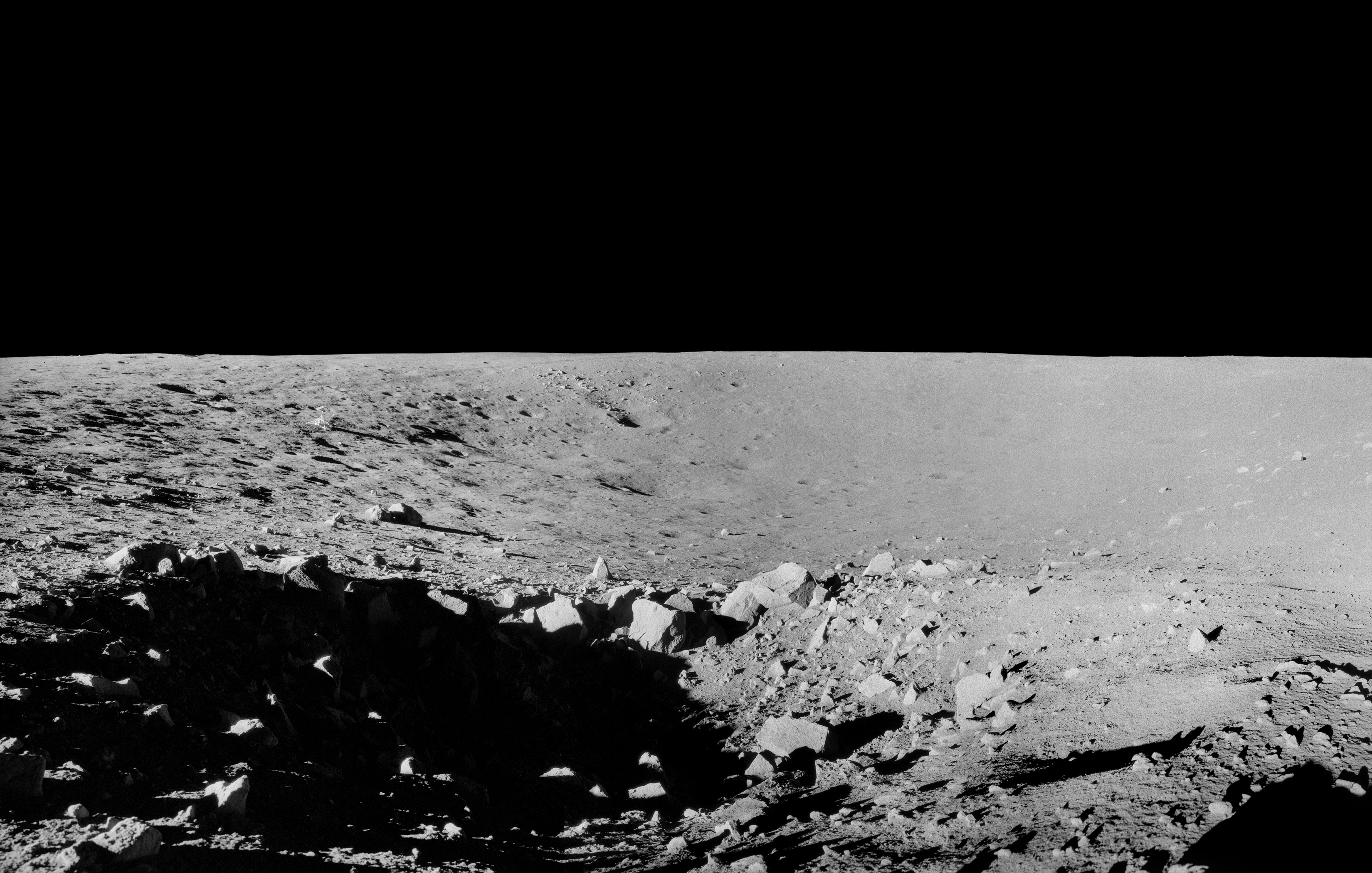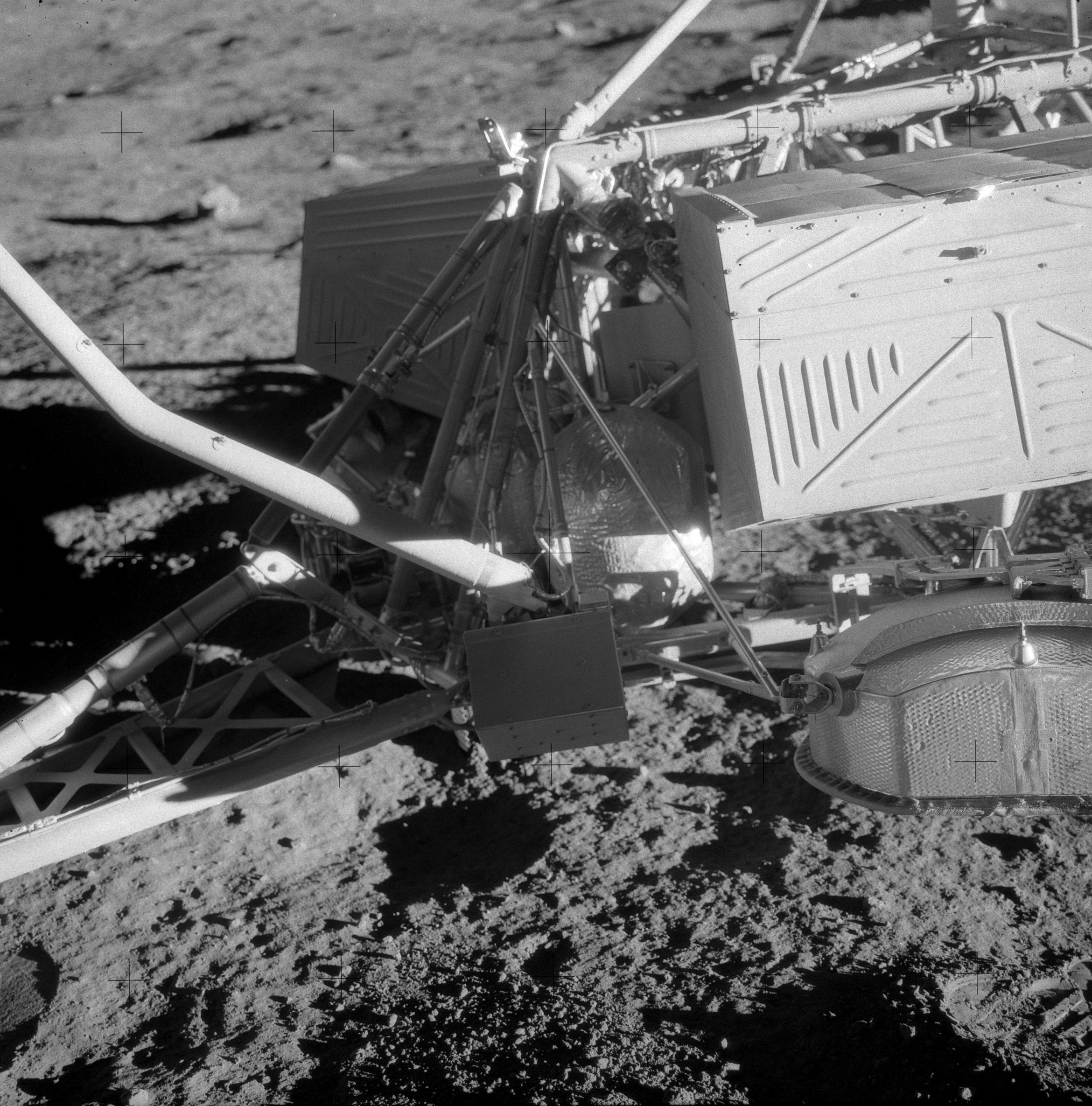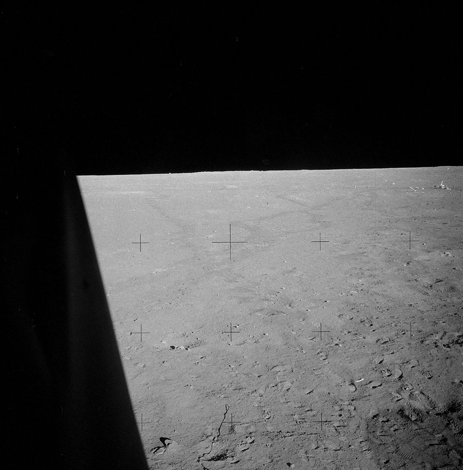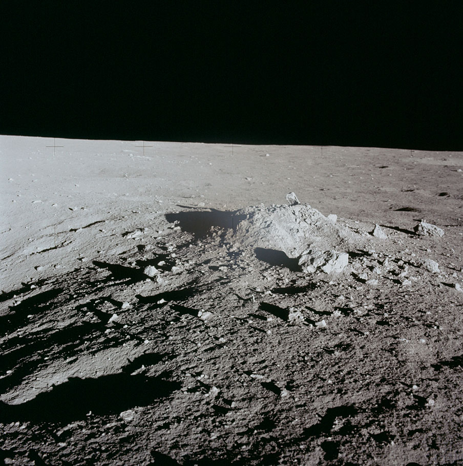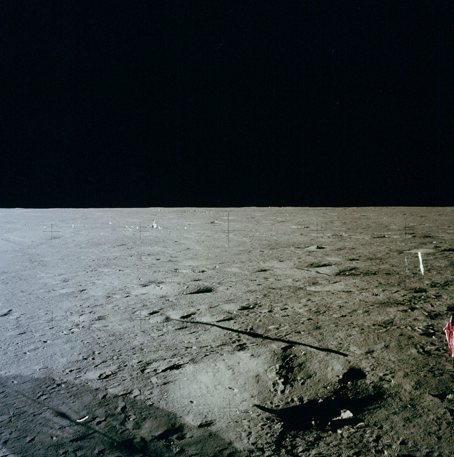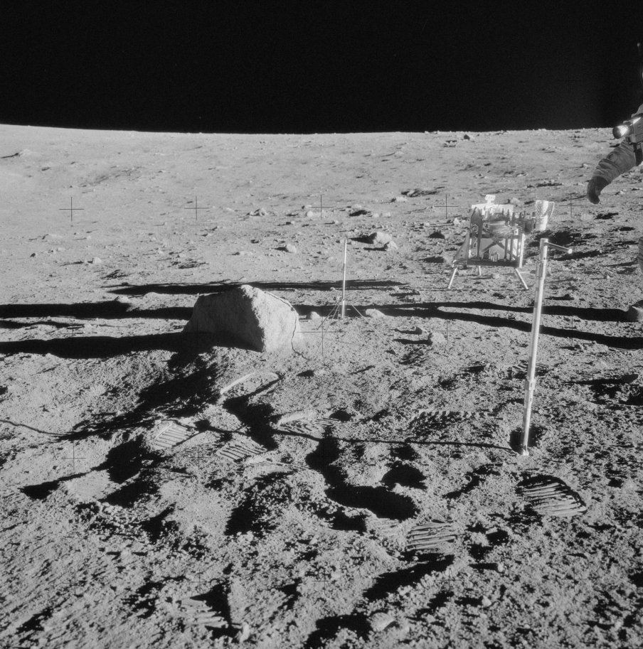 The raw image is M114104917R. See, also, a labeled version ( 0.8 Mb ). A labeled 2x detail shows features at the ALSEP site. Late in EVA-1, Pete and Al ran out to the rim of Middle Crescent Crater, where Pete took a pair of partial pans showing the crater. A variety of craters and boulders in the crater are identified in a comparison ( 5.1 Mb ) between Pete's first pan and the 29 Nov 2009 LROC image.09 January 2010 04:27:29 UTC; Solar El/Az 9.3/270.5; LRO altitude 43.1 km; resolution 0.49m/pixel ( 8.4 Mb )Deconvolved, 0.25 m/pixel (3.1 Mb TIF) and 0.5 m/pixel (3.4 Mb TIF) versions by GoneToPlaid.