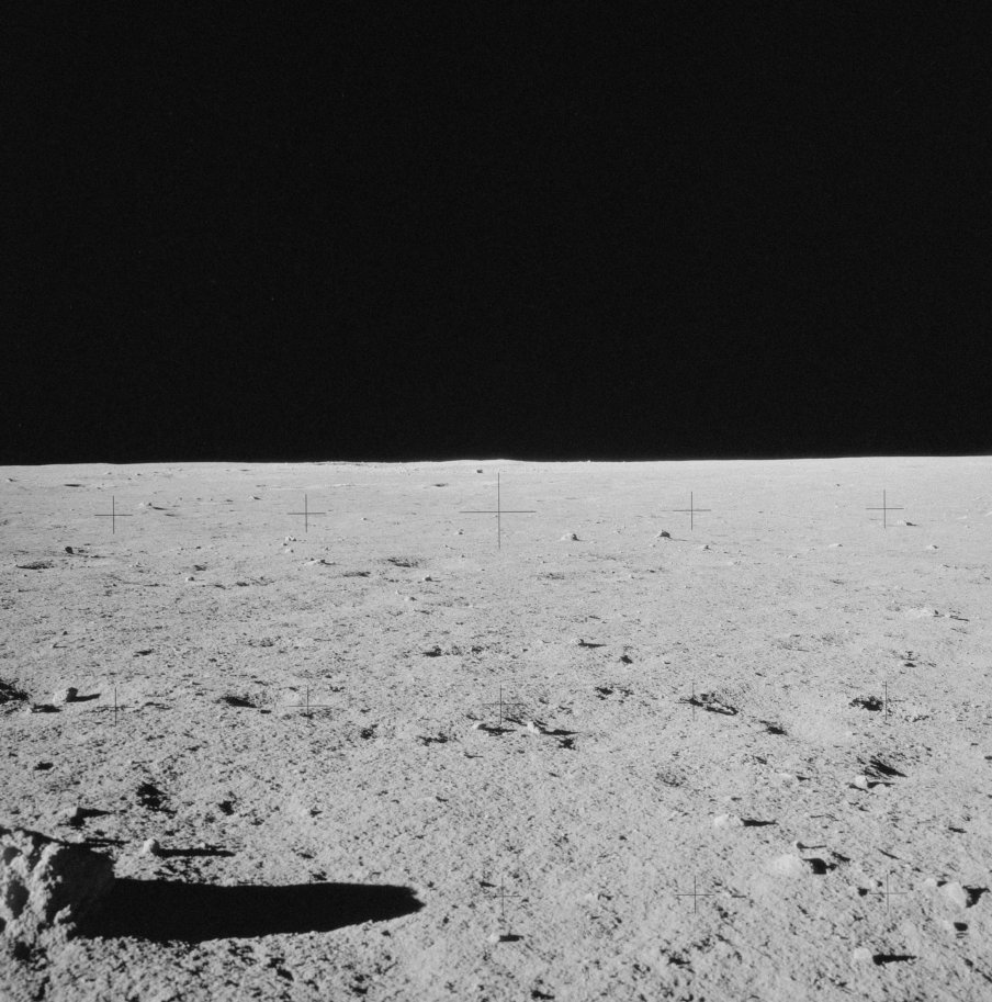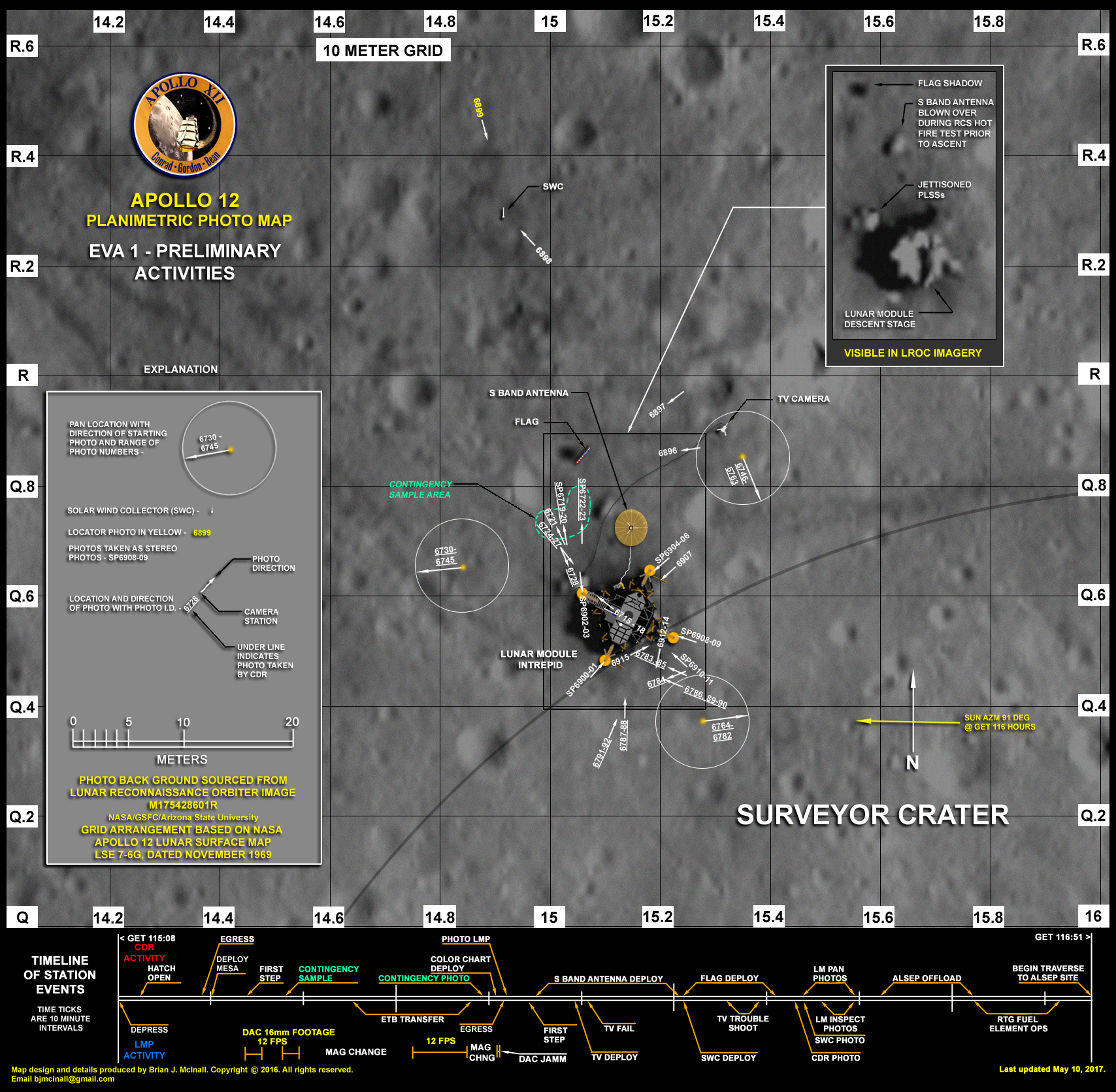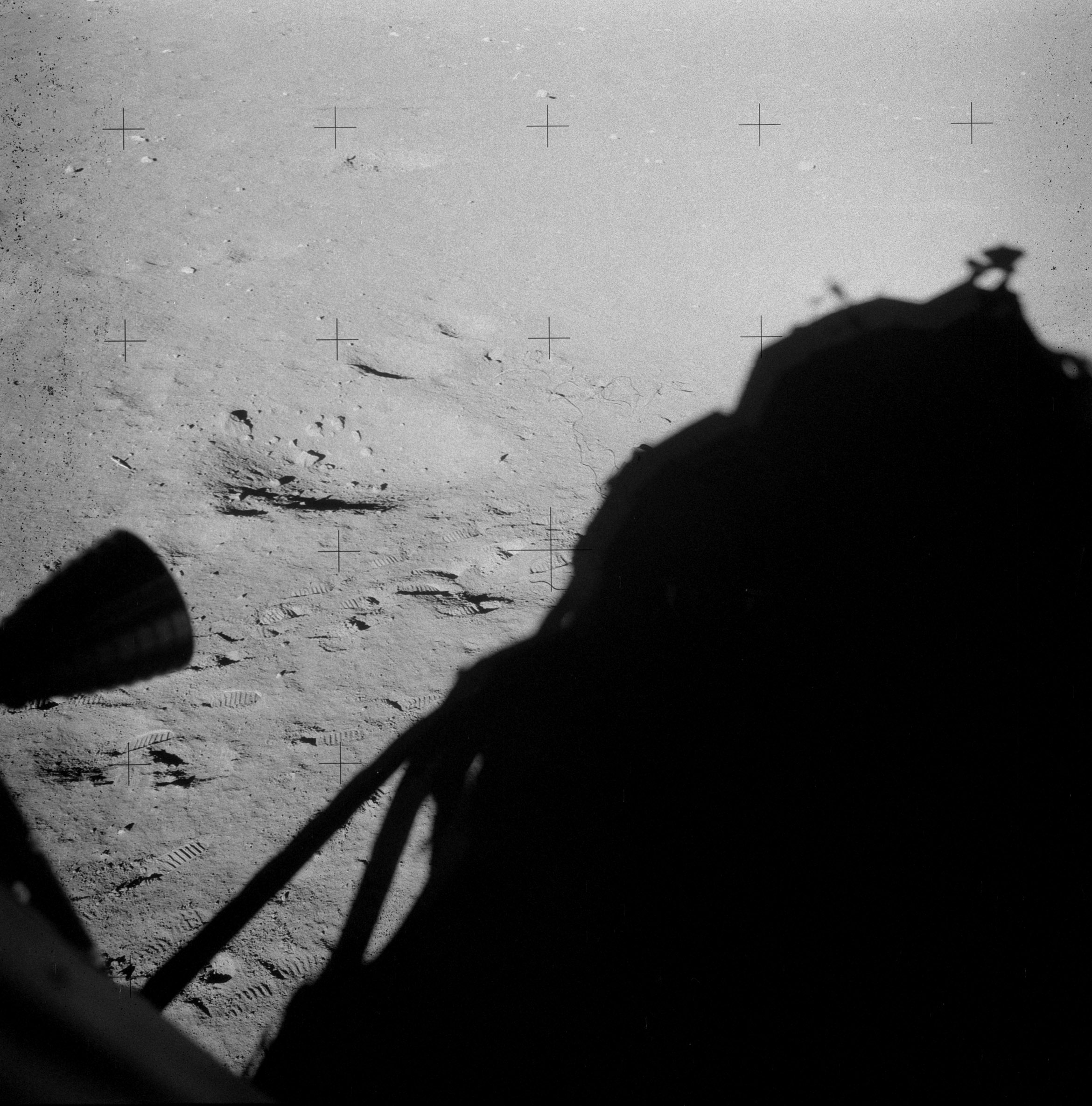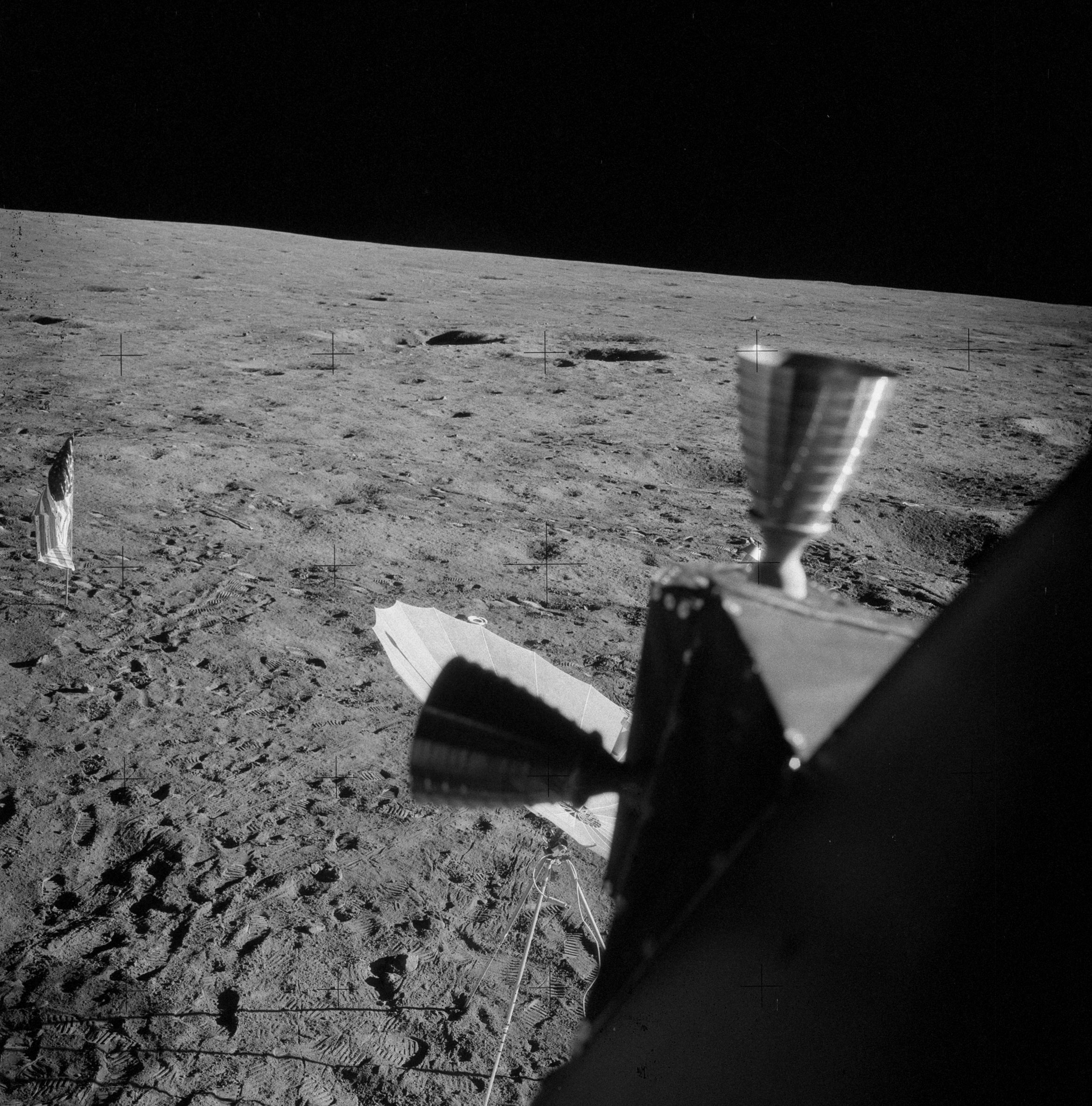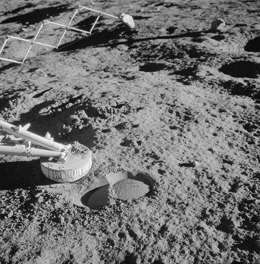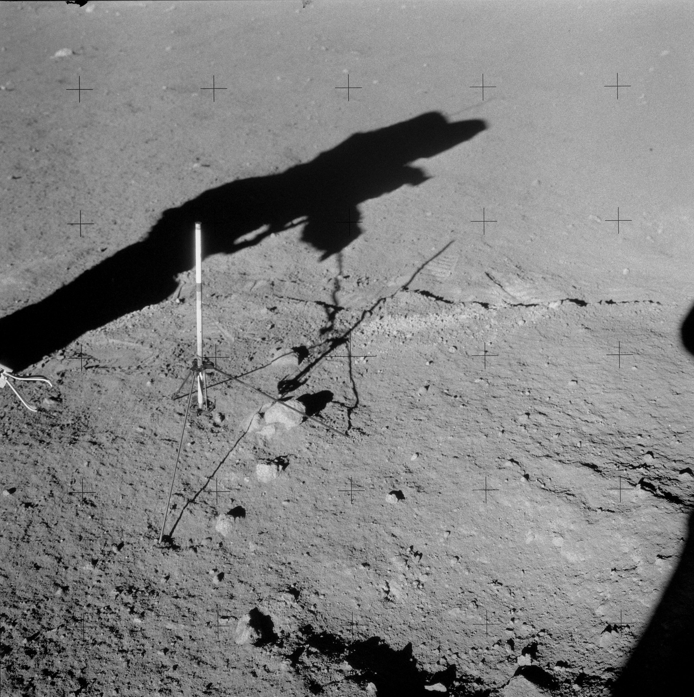 The raw image is M114104917R. See, also, a labeled version ( 0.8 Mb ). A labeled 2x detail shows features at the ALSEP site. Late in EVA-1, Pete and Al ran out to the rim of Middle Crescent Crater, where Pete took a pair of partial pans showing the crater. A variety of craters and boulders in the crater are identified in a comparison ( 5.1 Mb ) between Pete's first pan and the 29 Nov 2009 LROC image.09 January 2010 04:27:29 UTC; Solar El/Az 9.3/270.5; LRO altitude 43.1 km; resolution 0.49m/pixel ( 8.4 Mb )Deconvolved, 0.25 m/pixel (3.1 Mb TIF) and 0.5 m/pixel (3.4 Mb TIF) versions by GoneToPlaid.