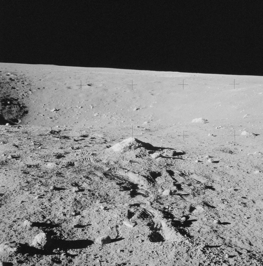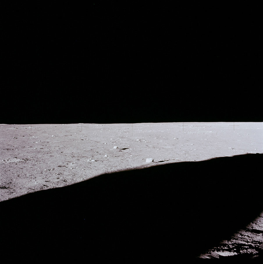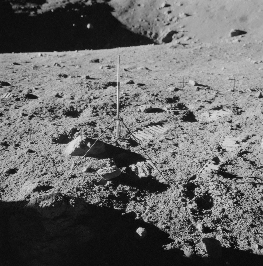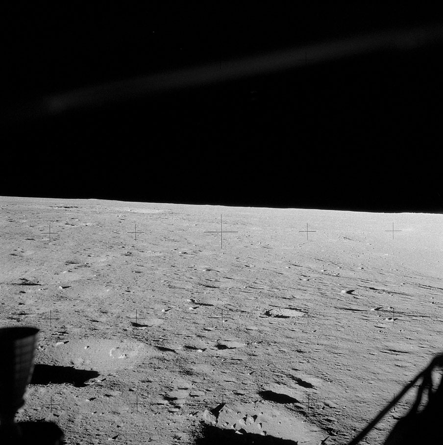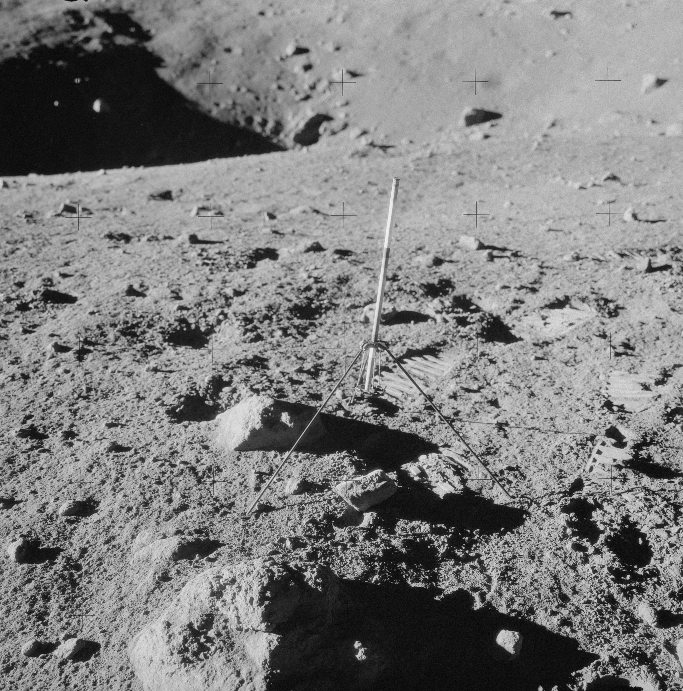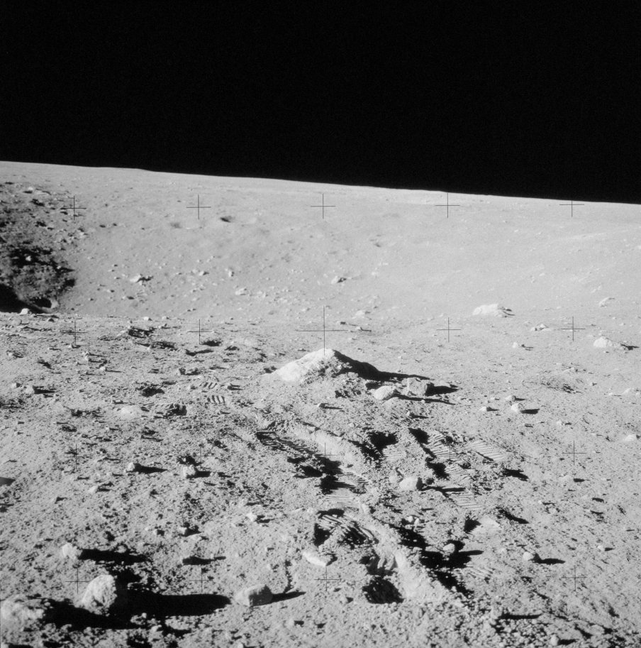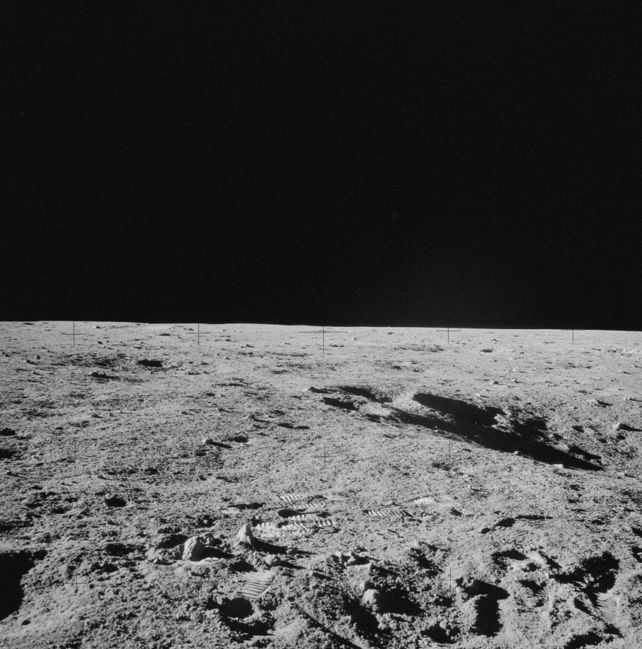 The raw image is M114104917R. See, also, a labeled version ( 0.8 Mb ). A labeled 2x detail shows features at the ALSEP site. Late in EVA-1, Pete and Al ran out to the rim of Middle Crescent Crater, where Pete took a pair of partial pans showing the crater. A variety of craters and boulders in the crater are identified in a comparison ( 5.1 Mb ) between Pete's first pan and the 29 Nov 2009 LROC image.09 January 2010 04:27:29 UTC; Solar El/Az 9.3/270.5; LRO altitude 43.1 km; resolution 0.49m/pixel ( 8.4 Mb )Deconvolved, 0.25 m/pixel (3.1 Mb TIF) and 0.5 m/pixel (3.4 Mb TIF) versions by GoneToPlaid.