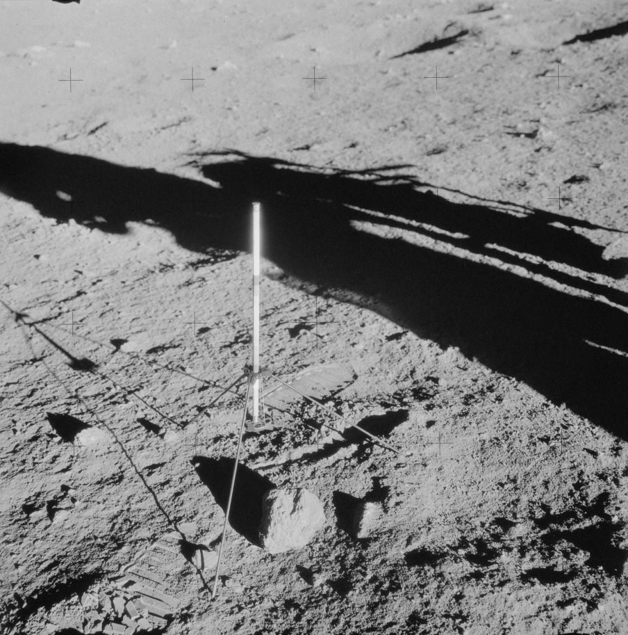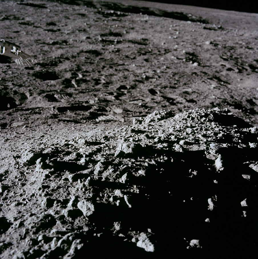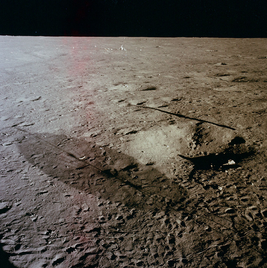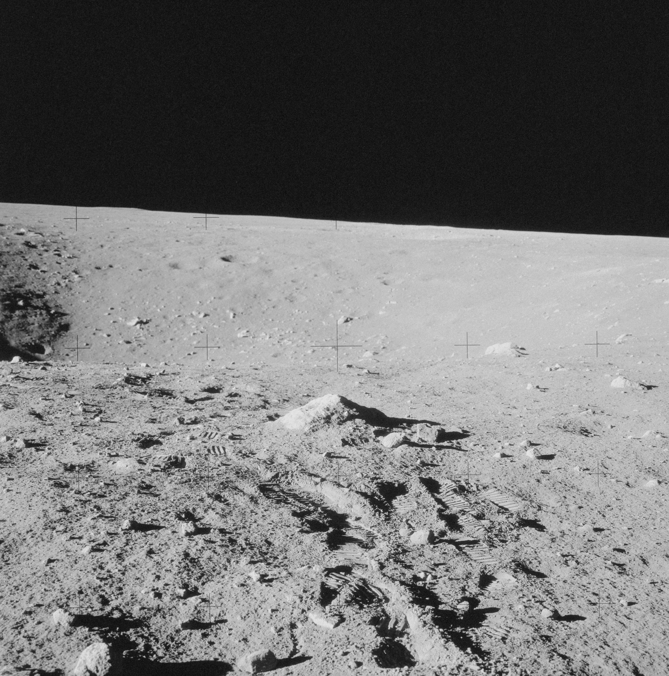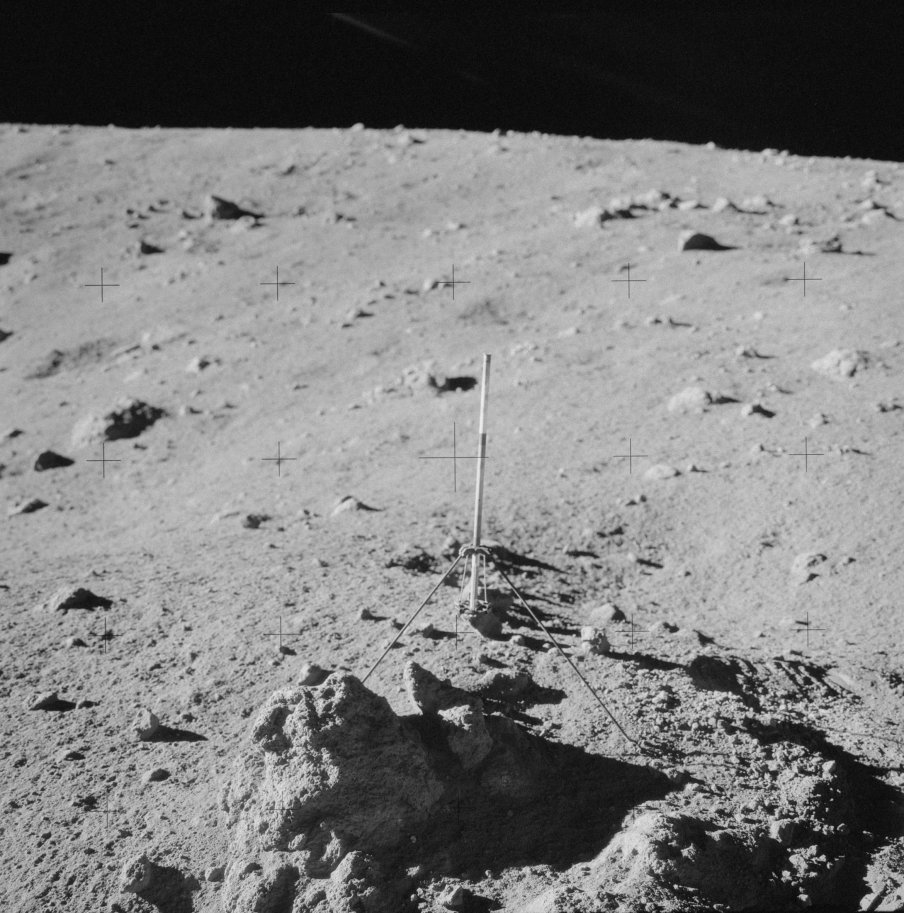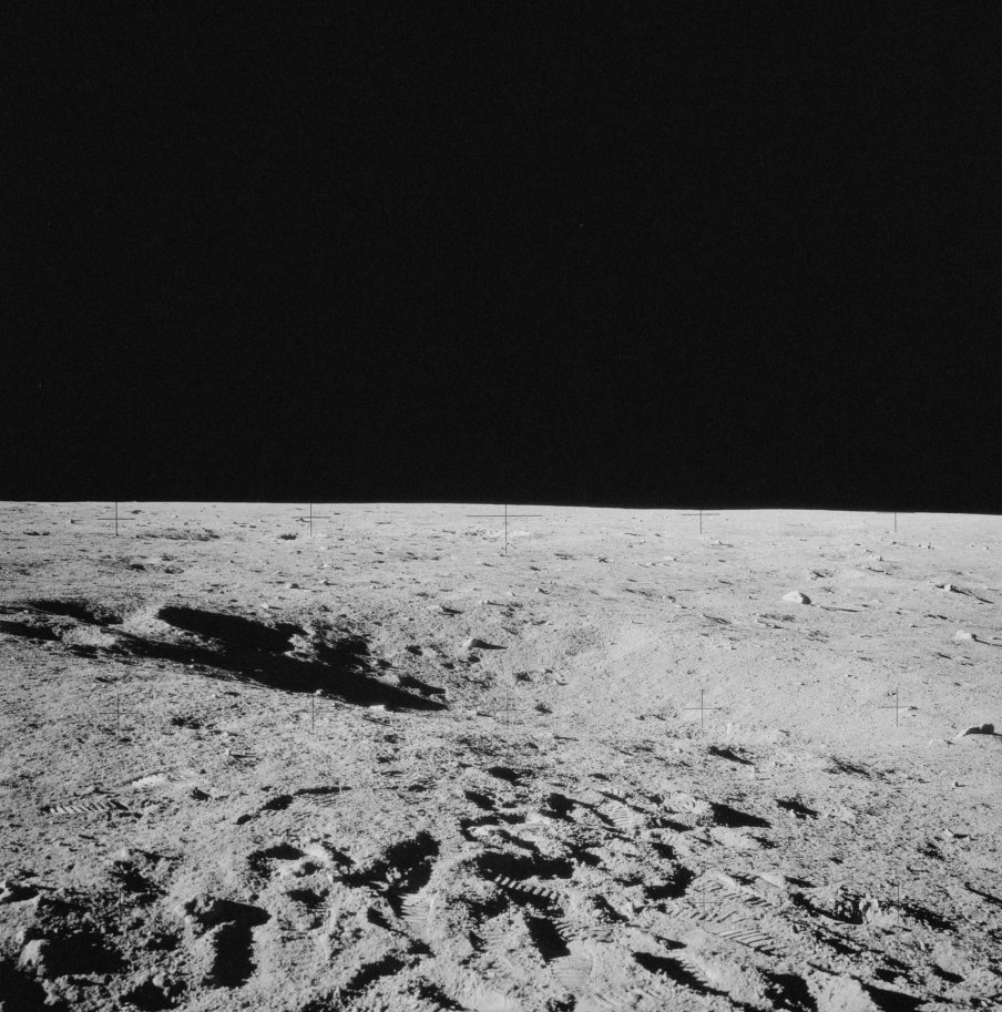 The raw image is M114104917R. See, also, a labeled version ( 0.8 Mb ). A labeled 2x detail shows features at the ALSEP site. Late in EVA-1, Pete and Al ran out to the rim of Middle Crescent Crater, where Pete took a pair of partial pans showing the crater. A variety of craters and boulders in the crater are identified in a comparison ( 5.1 Mb ) between Pete's first pan and the 29 Nov 2009 LROC image.09 January 2010 04:27:29 UTC; Solar El/Az 9.3/270.5; LRO altitude 43.1 km; resolution 0.49m/pixel ( 8.4 Mb )Deconvolved, 0.25 m/pixel (3.1 Mb TIF) and 0.5 m/pixel (3.4 Mb TIF) versions by GoneToPlaid.
