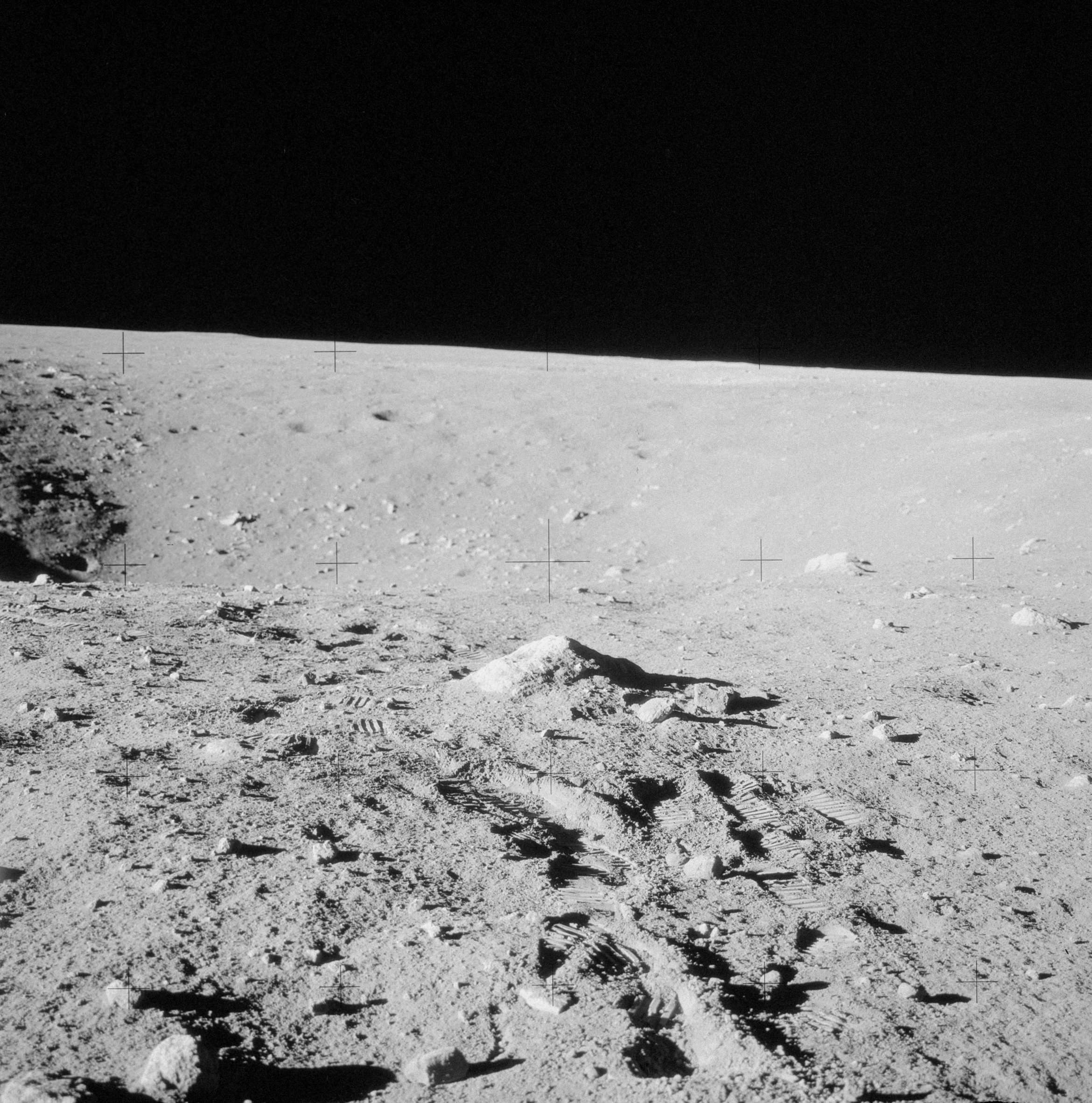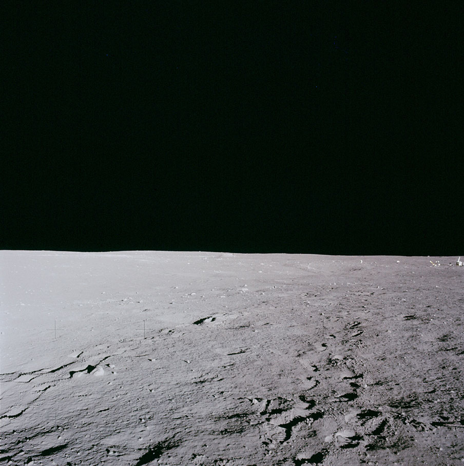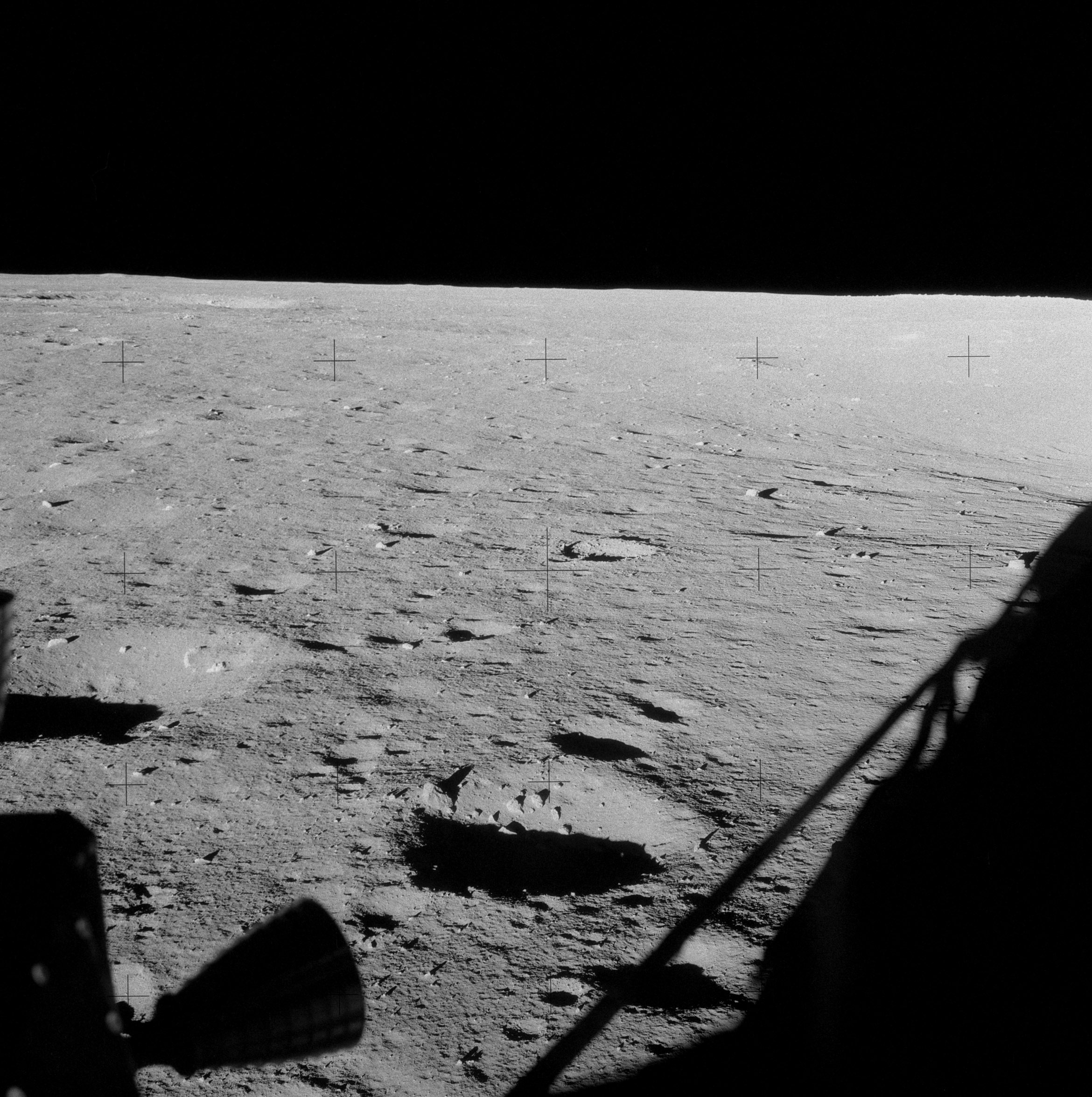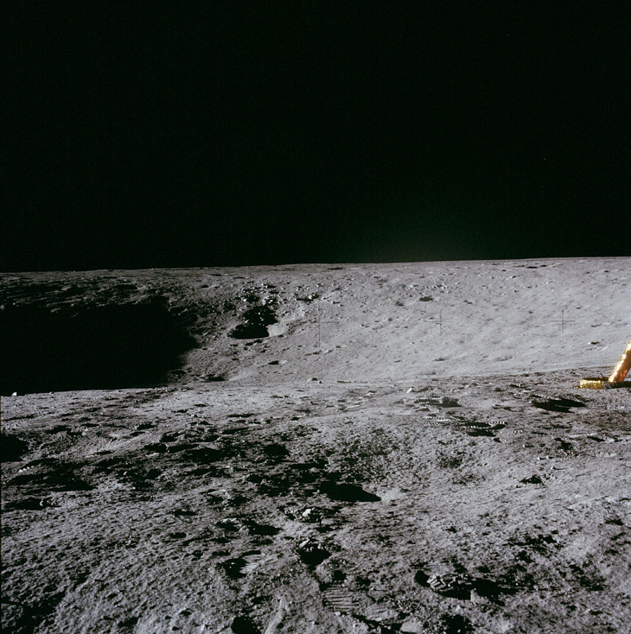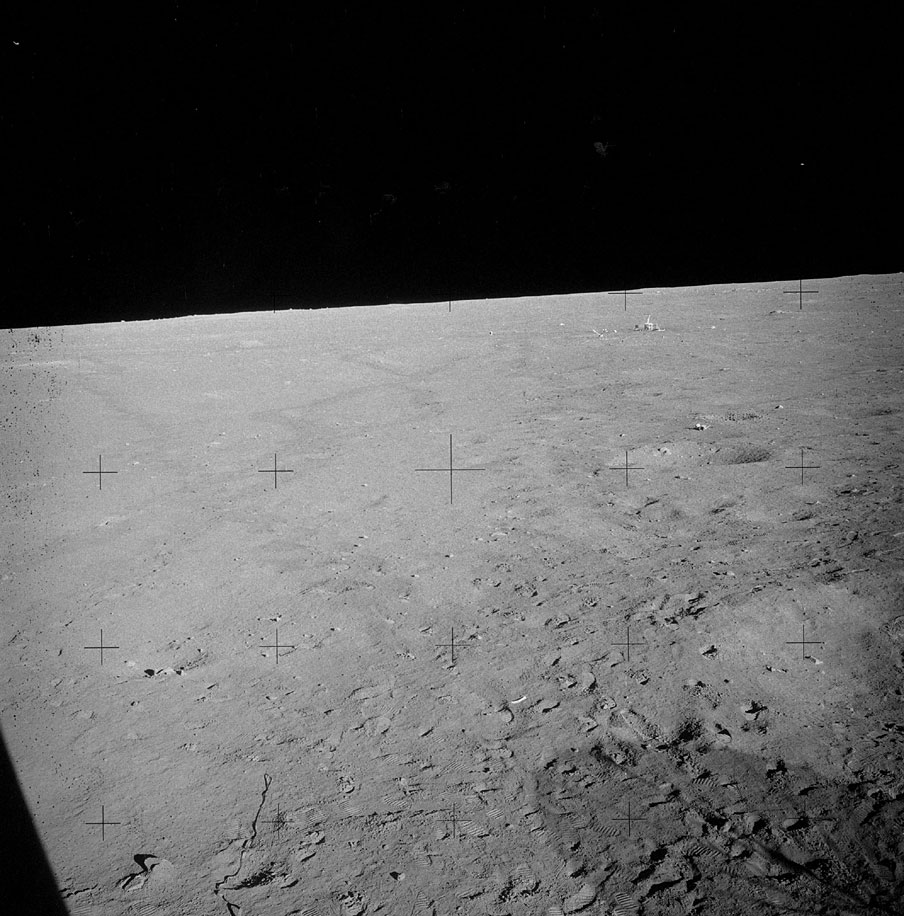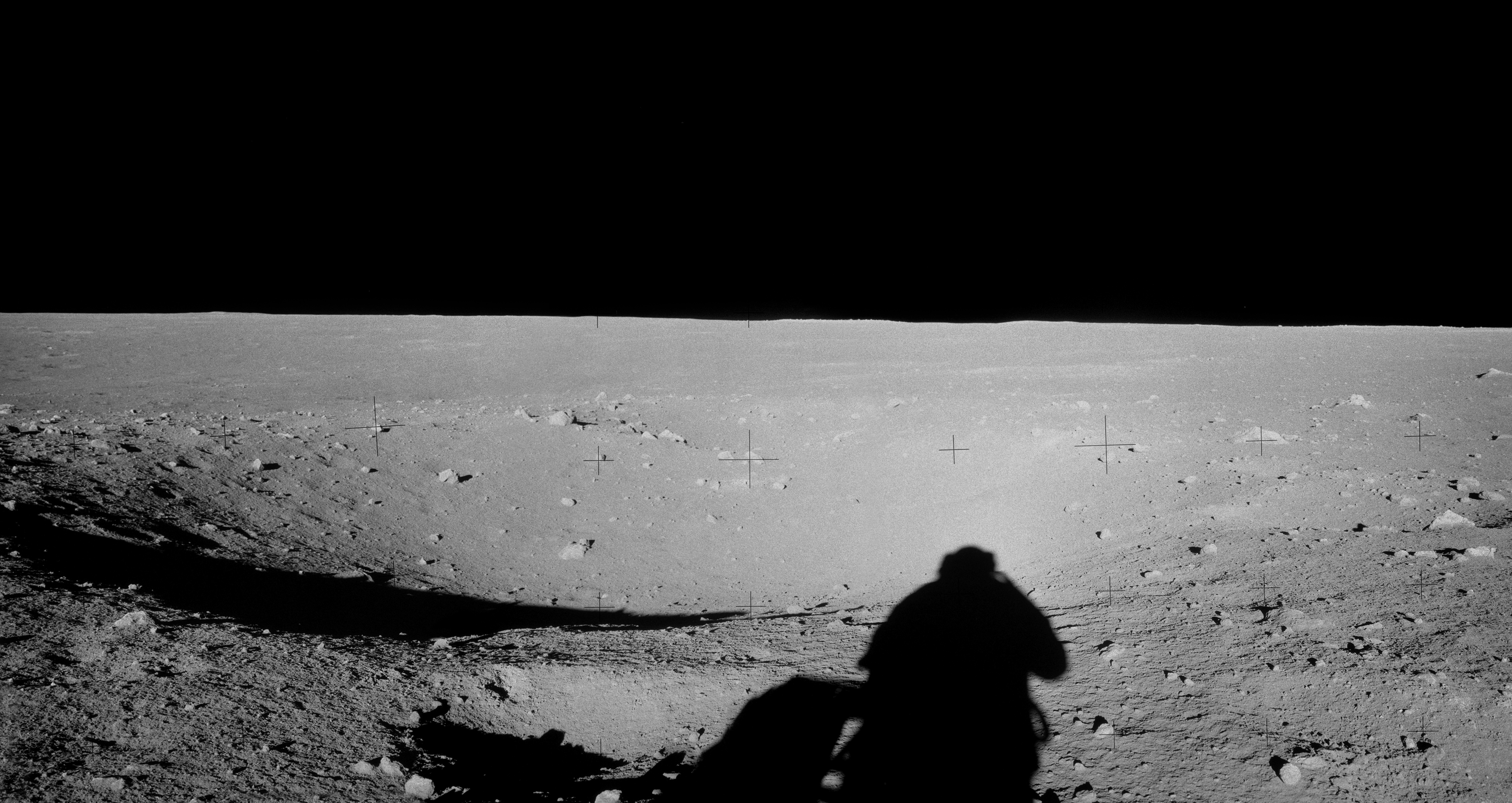 The raw image is M114104917R. See, also, a labeled version ( 0.8 Mb ). A labeled 2x detail shows features at the ALSEP site. Late in EVA-1, Pete and Al ran out to the rim of Middle Crescent Crater, where Pete took a pair of partial pans showing the crater. A variety of craters and boulders in the crater are identified in a comparison ( 5.1 Mb ) between Pete's first pan and the 29 Nov 2009 LROC image.09 January 2010 04:27:29 UTC; Solar El/Az 9.3/270.5; LRO altitude 43.1 km; resolution 0.49m/pixel ( 8.4 Mb )Deconvolved, 0.25 m/pixel (3.1 Mb TIF) and 0.5 m/pixel (3.4 Mb TIF) versions by GoneToPlaid.