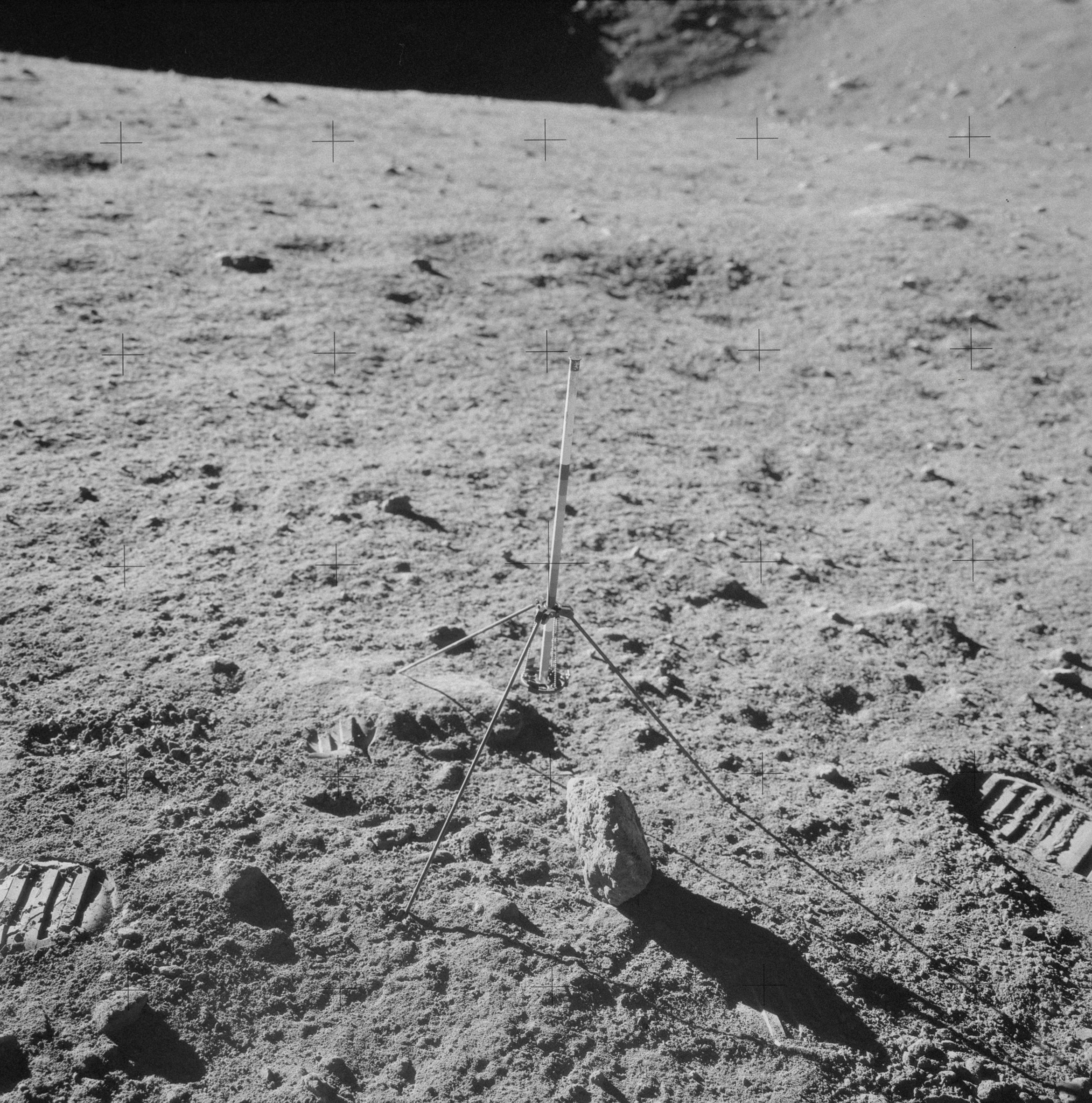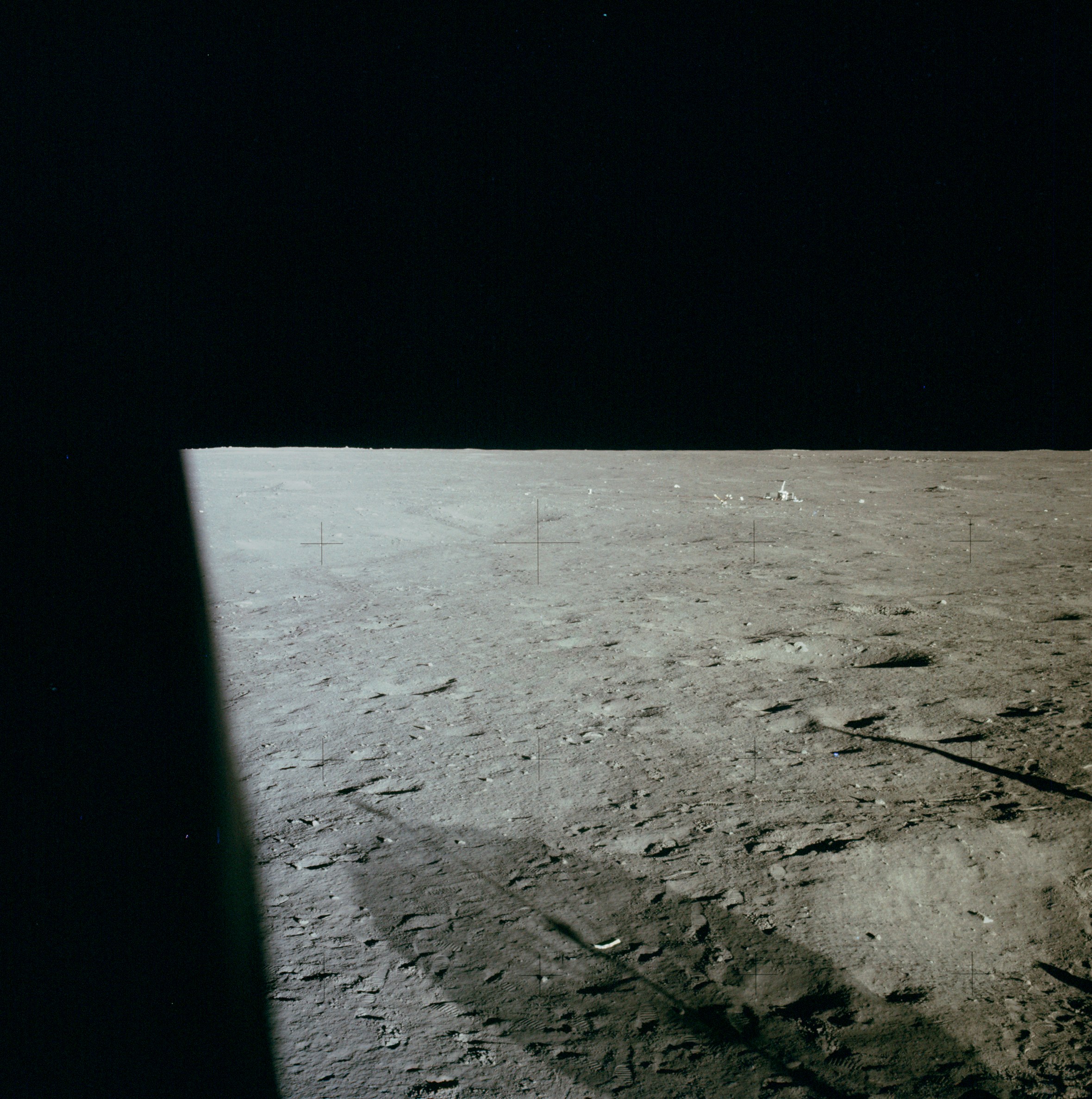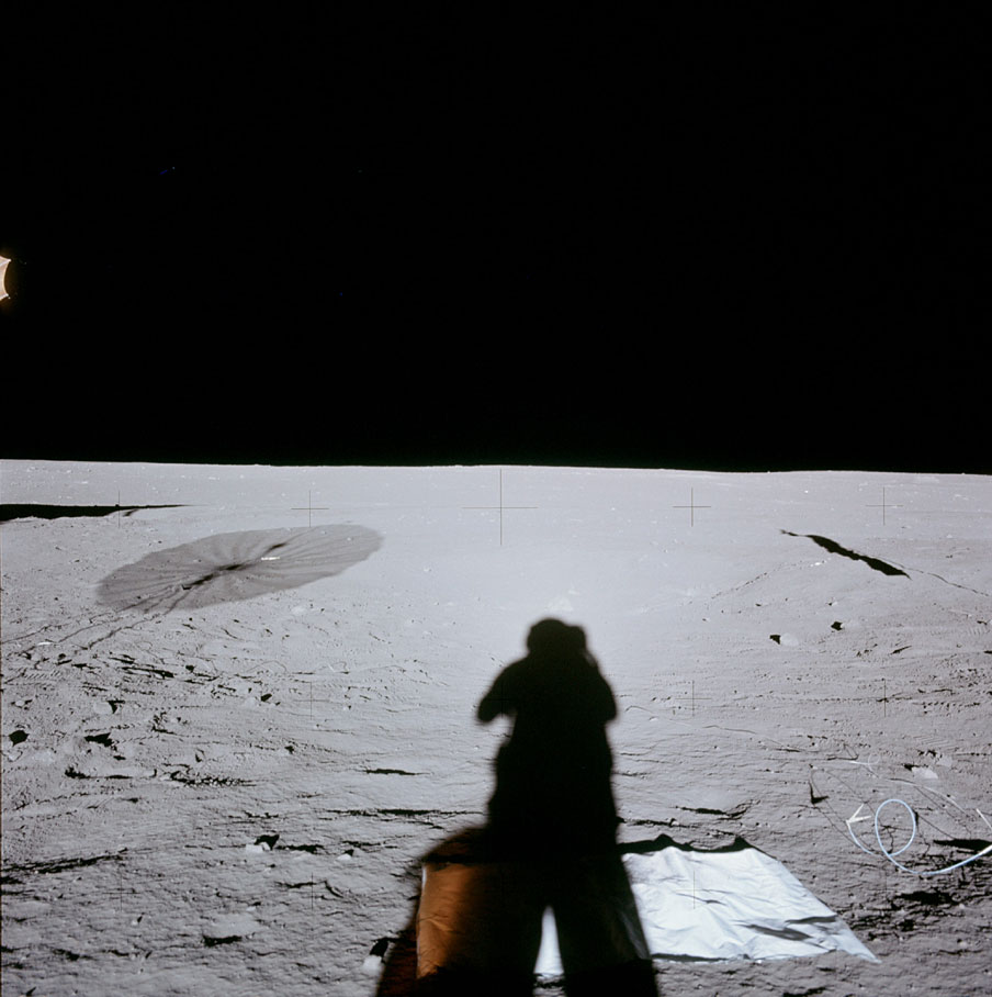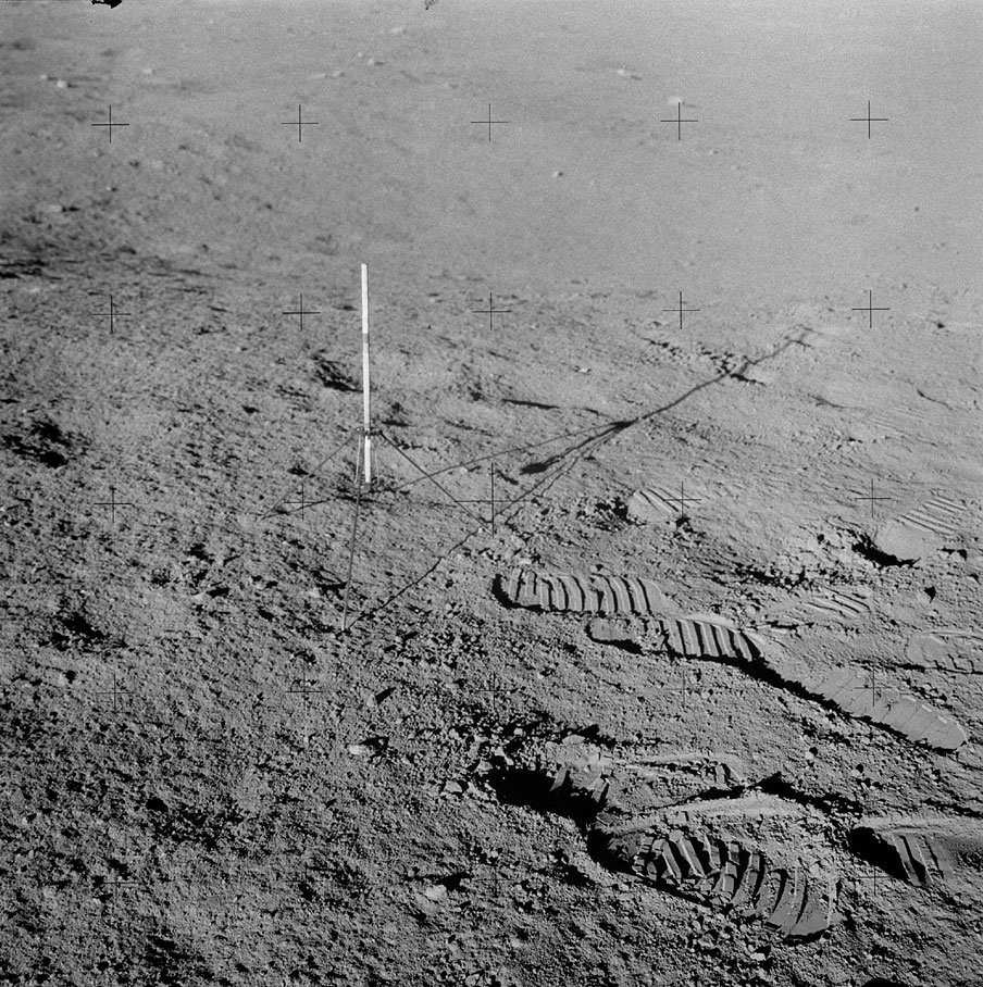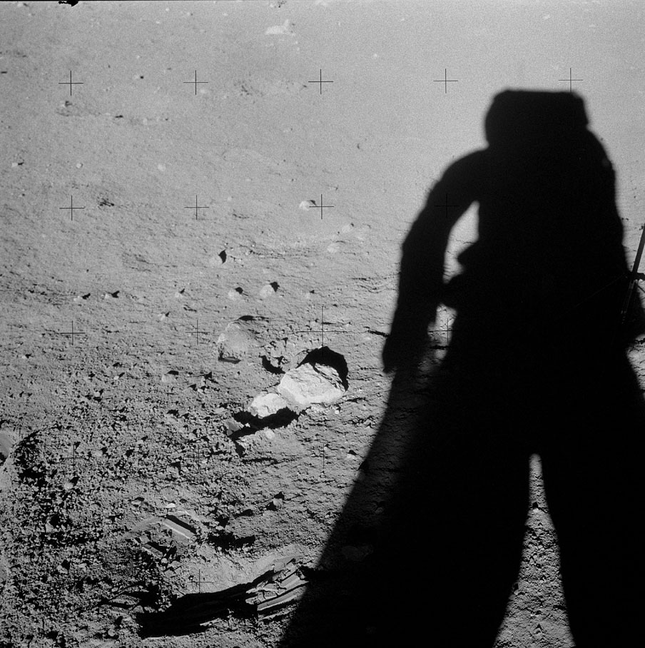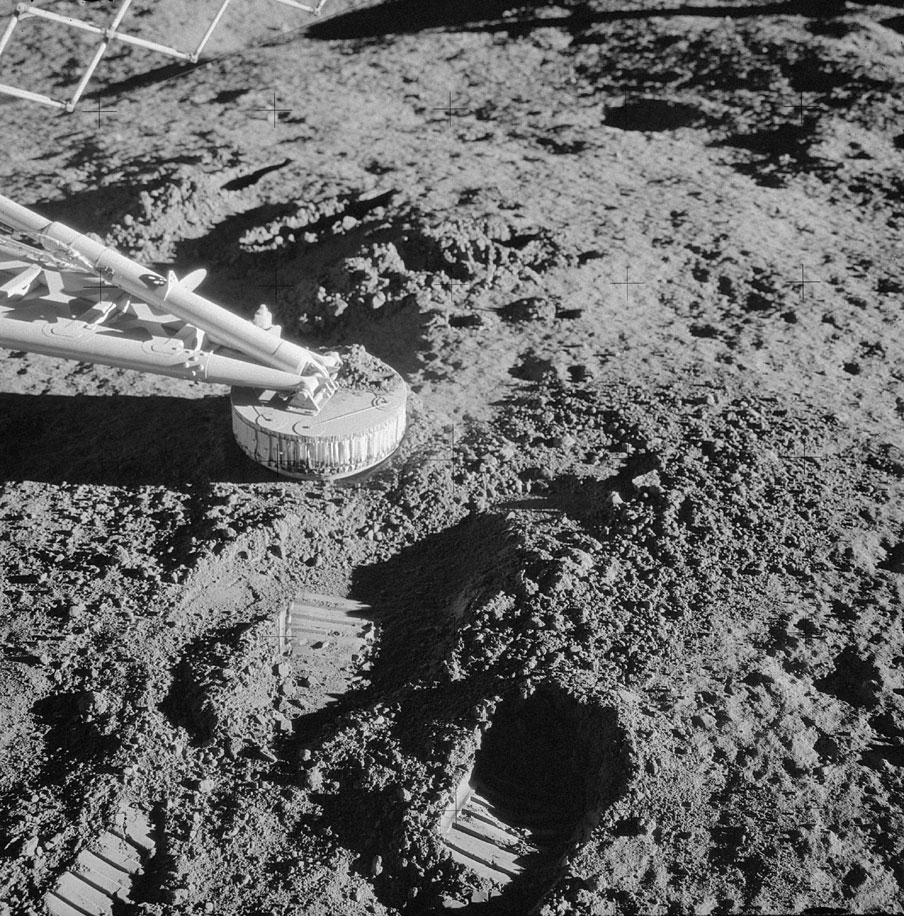The raw image is M114104917R. See, also, a labeled version ( 0.8 Mb ). A labeled 2x detail shows features at the ALSEP site. Late in EVA-1, Pete and Al ran out to the rim of Middle Crescent Crater, where Pete took a pair of partial pans showing the crater. A variety of craters and boulders in the crater are identified in a comparison ( 5.1 Mb ) between Pete's first pan and the 29 Nov 2009 LROC image.09 January 2010 04:27:29 UTC; Solar El/Az 9.3/270.5; LRO altitude 43.1 km; resolution 0.49m/pixel ( 8.4 Mb )Deconvolved, 0.25 m/pixel (3.1 Mb TIF) and 0.5 m/pixel (3.4 Mb TIF) versions by GoneToPlaid.