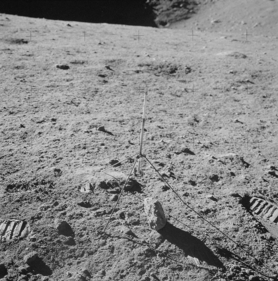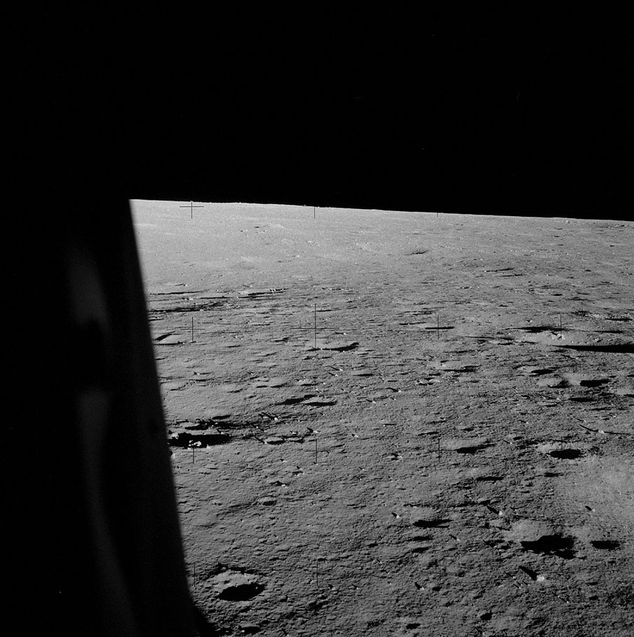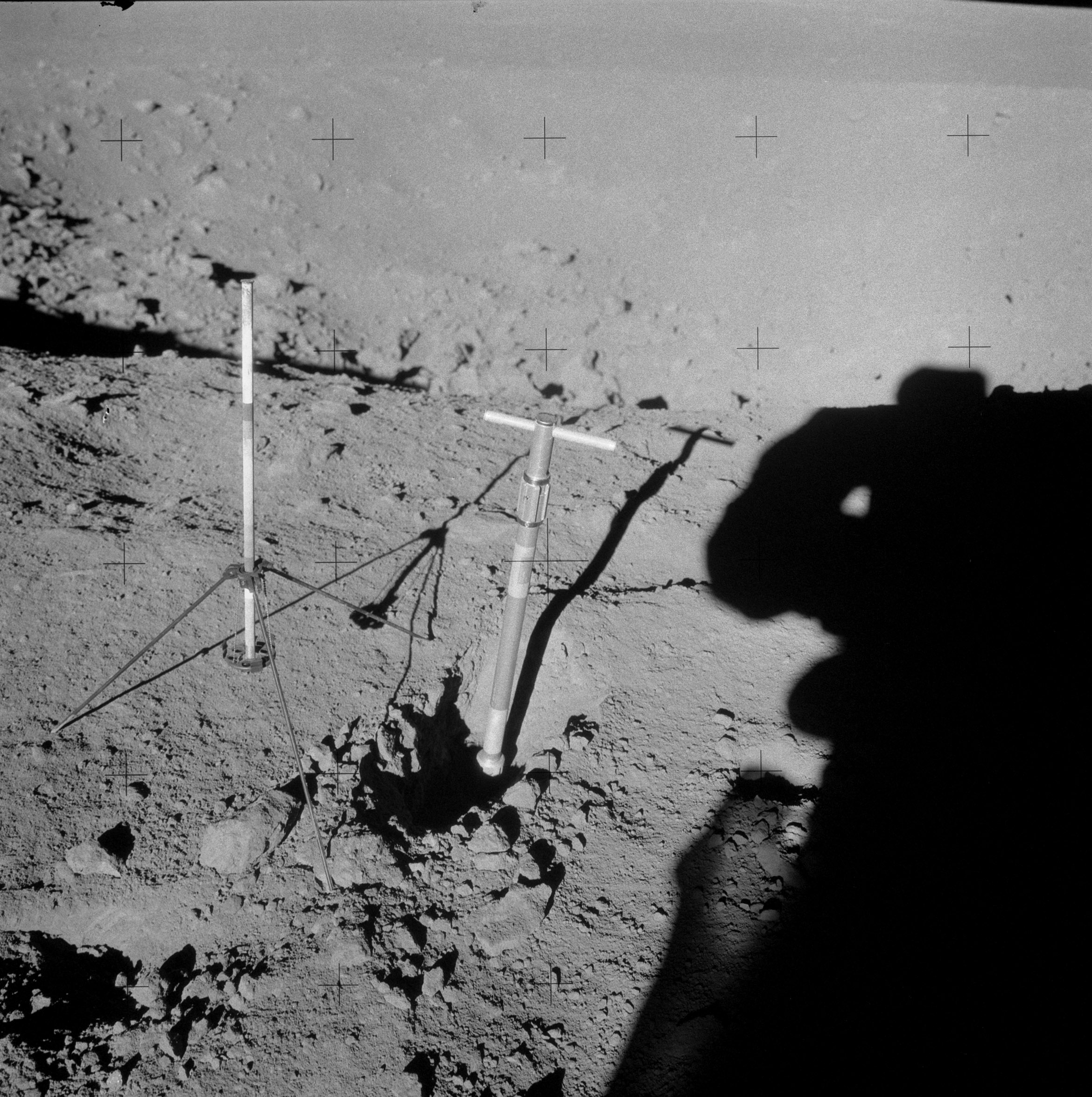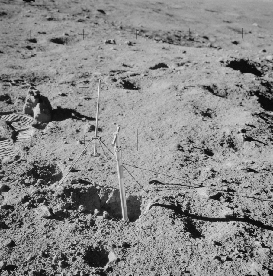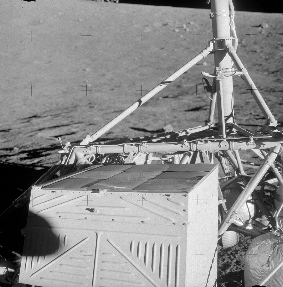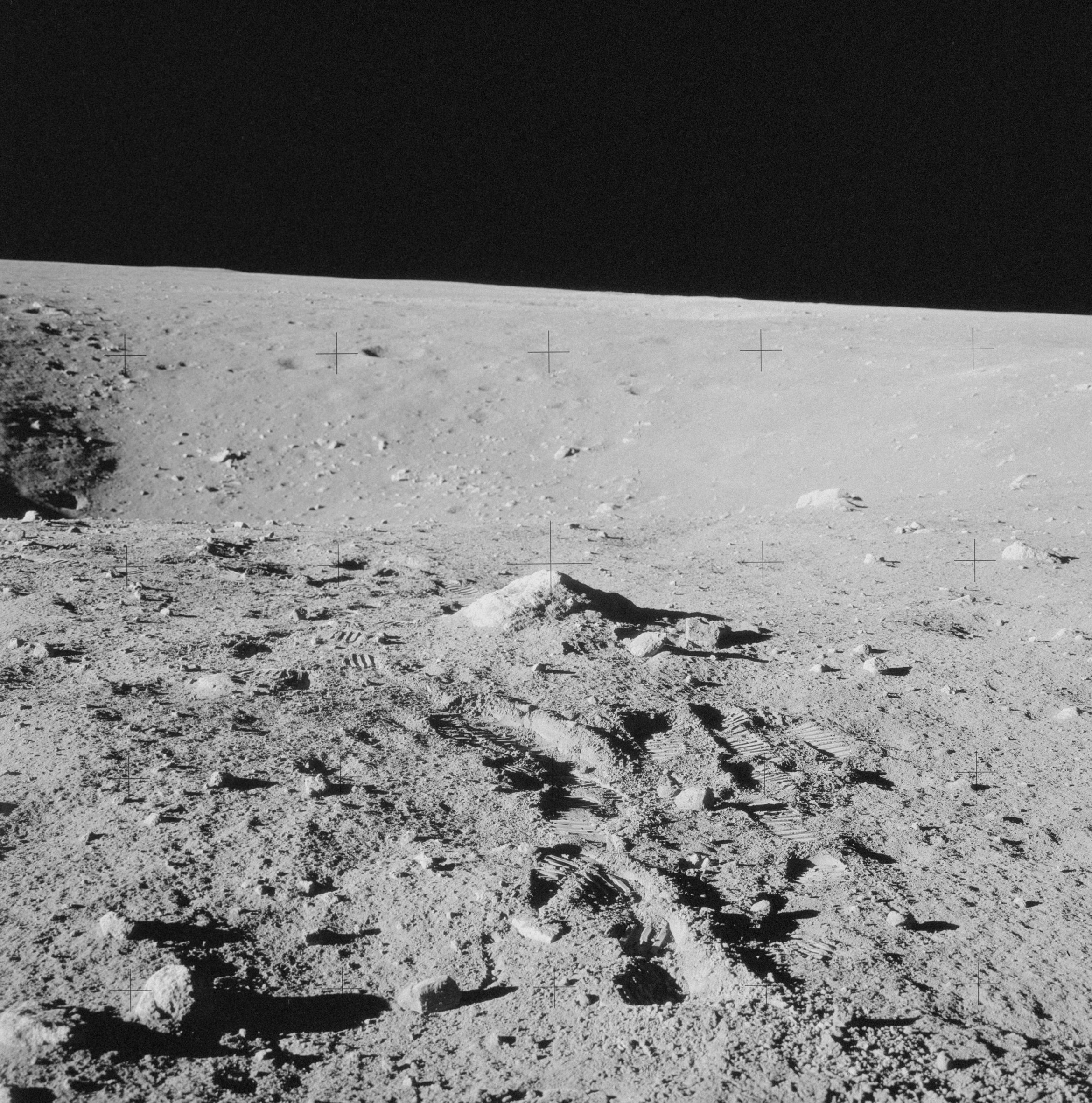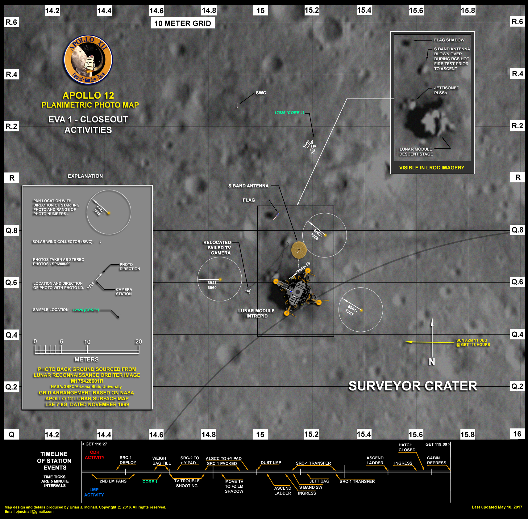The raw image is M114104917R. See, also, a labeled version ( 0.8 Mb ). A labeled 2x detail shows features at the ALSEP site. Late in EVA-1, Pete and Al ran out to the rim of Middle Crescent Crater, where Pete took a pair of partial pans showing the crater. A variety of craters and boulders in the crater are identified in a comparison ( 5.1 Mb ) between Pete's first pan and the 29 Nov 2009 LROC image.09 January 2010 04:27:29 UTC; Solar El/Az 9.3/270.5; LRO altitude 43.1 km; resolution 0.49m/pixel ( 8.4 Mb )Deconvolved, 0.25 m/pixel (3.1 Mb TIF) and 0.5 m/pixel (3.4 Mb TIF) versions by GoneToPlaid.