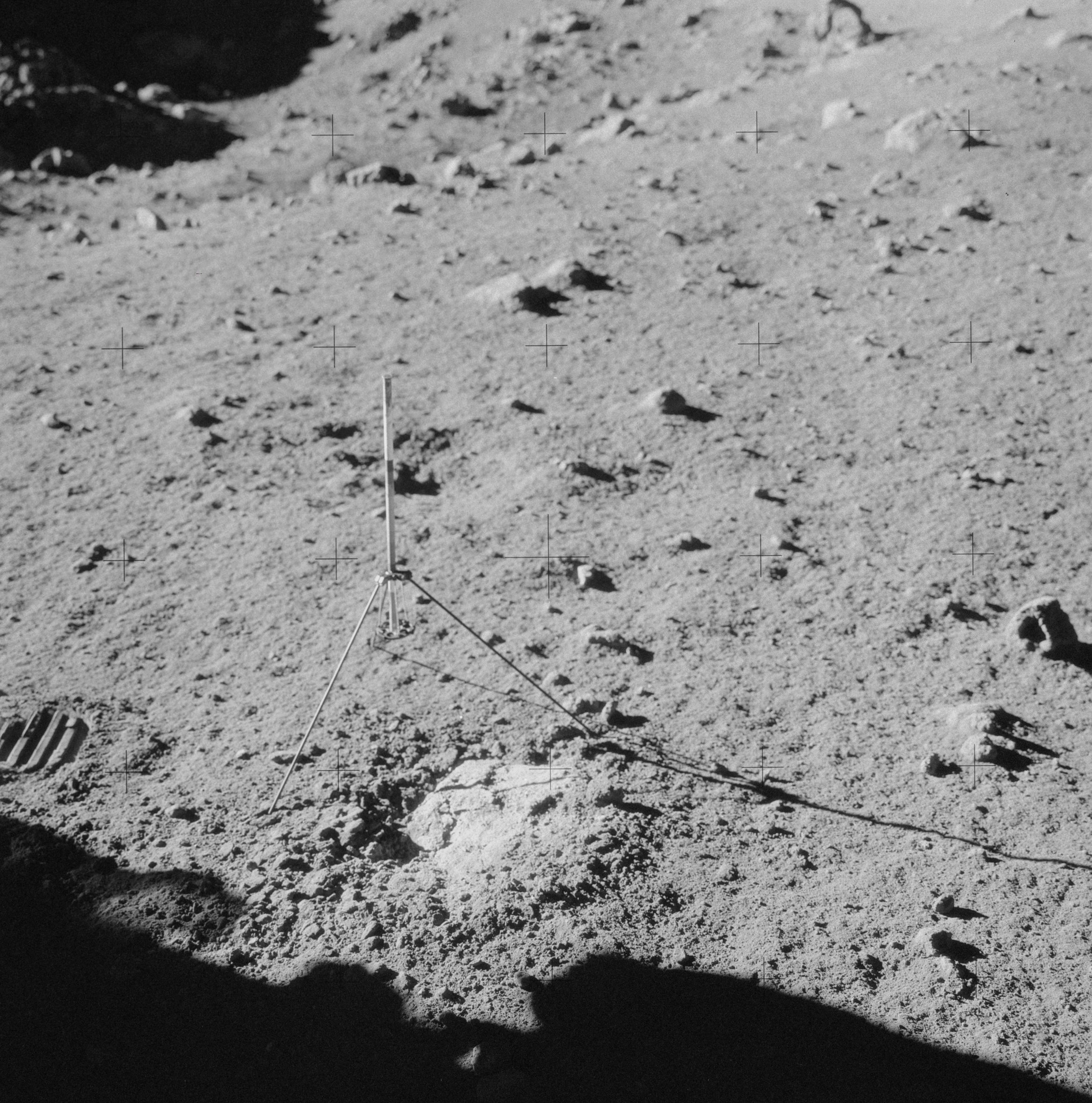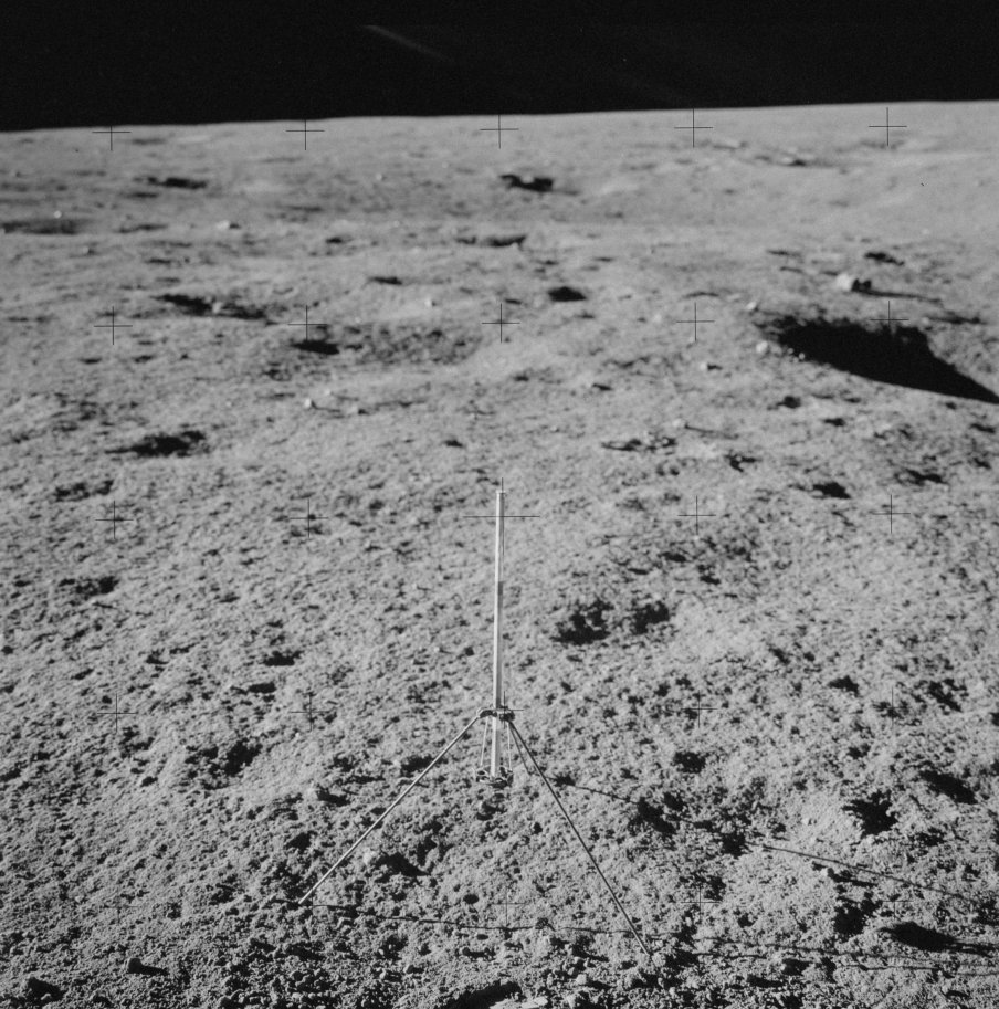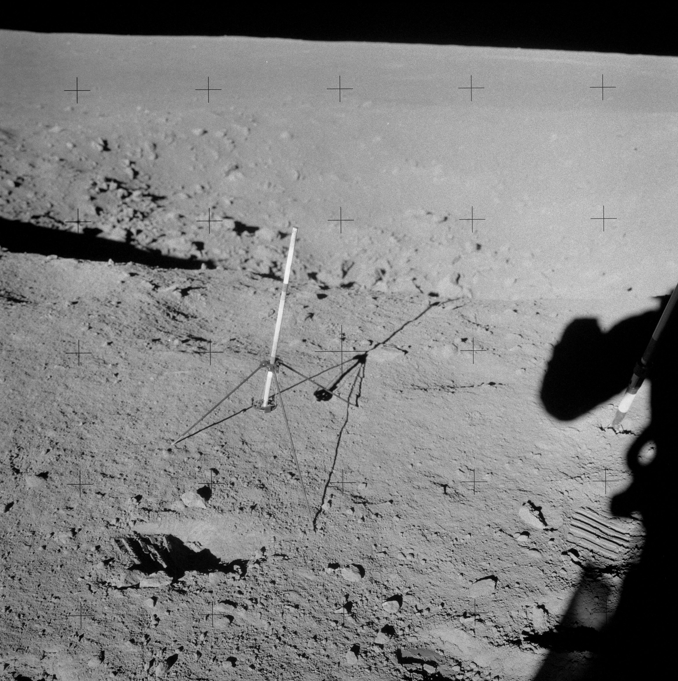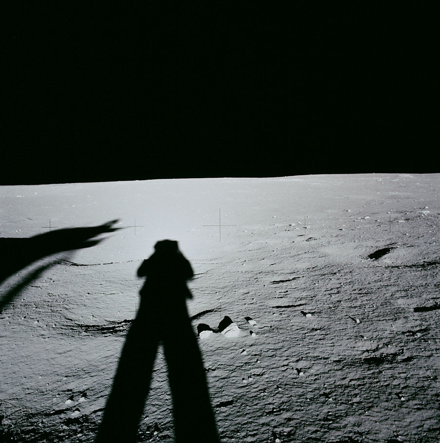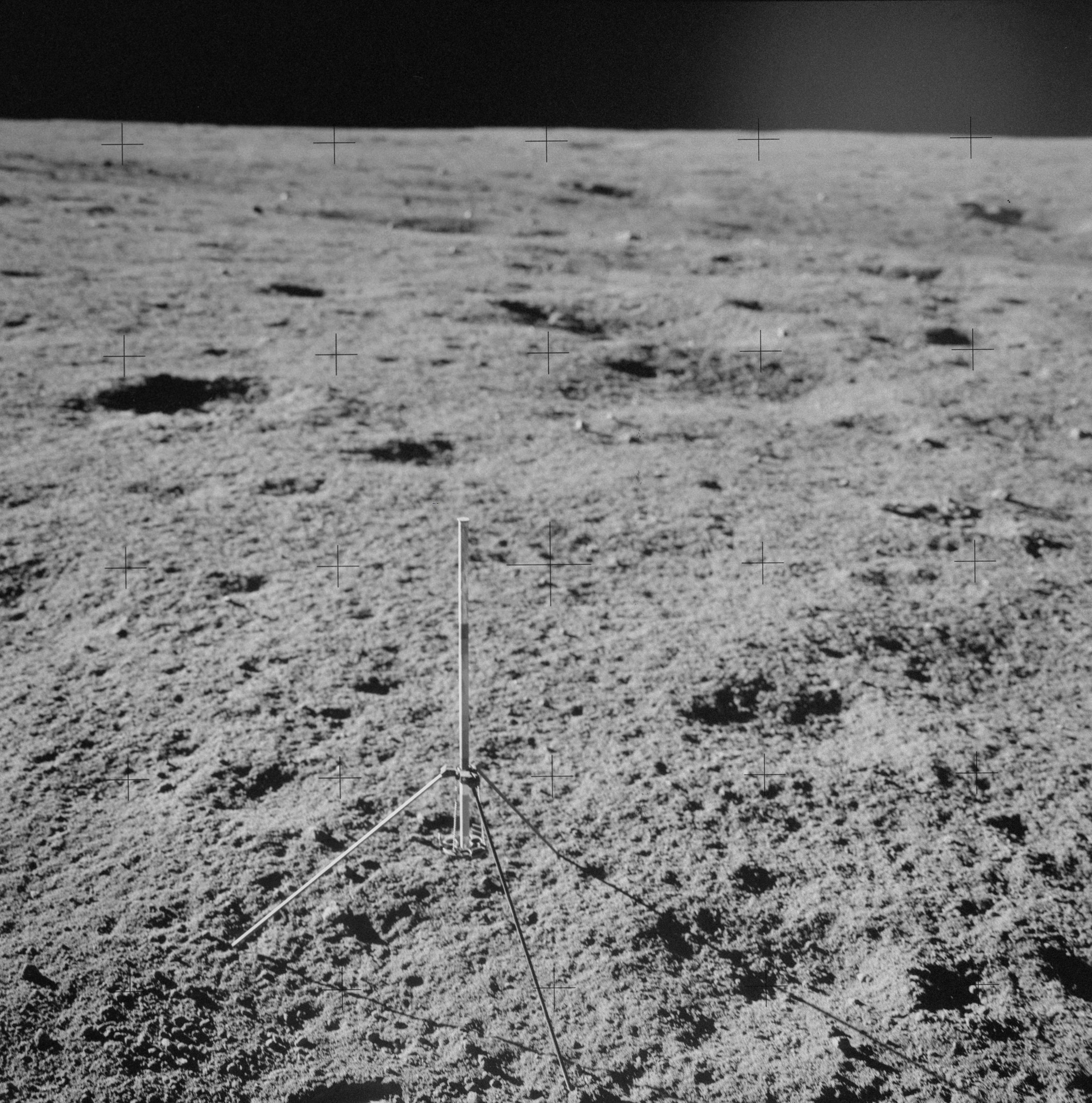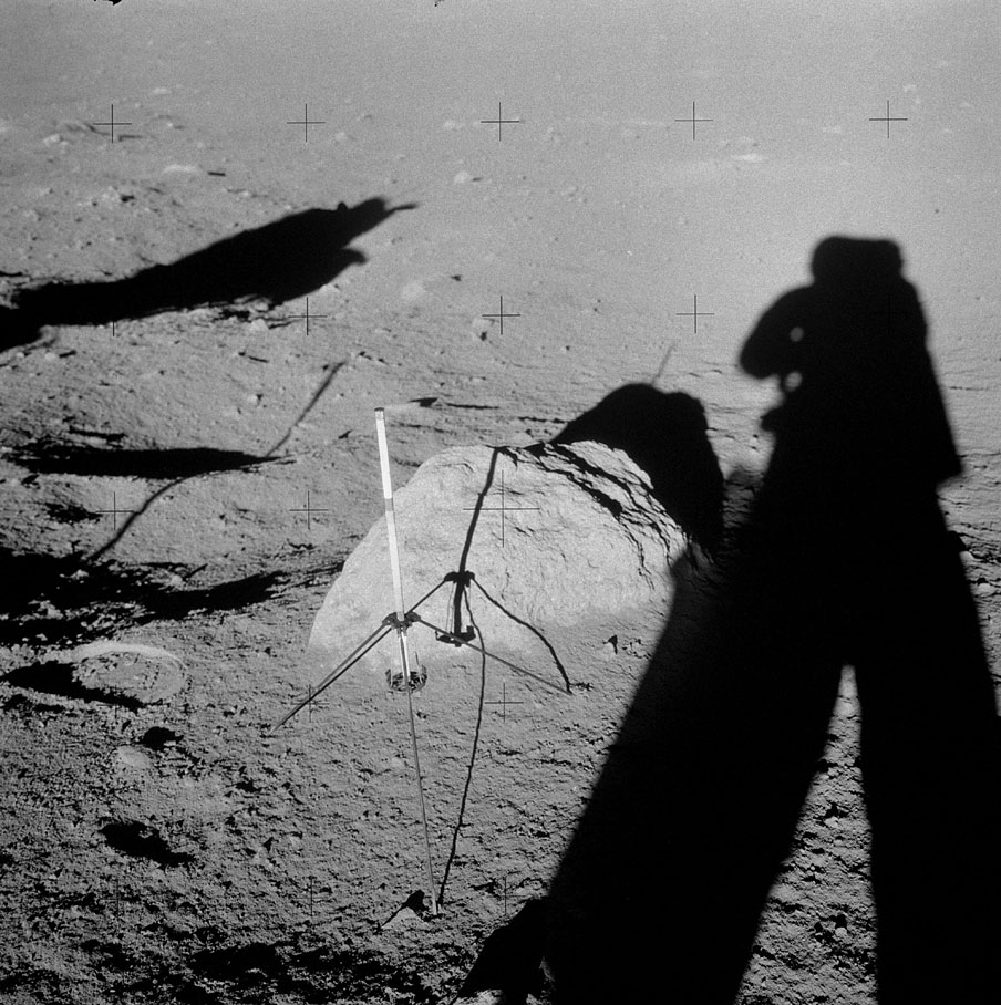 The raw image is M114104917R. See, also, a labeled version ( 0.8 Mb ). A labeled 2x detail shows features at the ALSEP site. Late in EVA-1, Pete and Al ran out to the rim of Middle Crescent Crater, where Pete took a pair of partial pans showing the crater. A variety of craters and boulders in the crater are identified in a comparison ( 5.1 Mb ) between Pete's first pan and the 29 Nov 2009 LROC image.09 January 2010 04:27:29 UTC; Solar El/Az 9.3/270.5; LRO altitude 43.1 km; resolution 0.49m/pixel ( 8.4 Mb )Deconvolved, 0.25 m/pixel (3.1 Mb TIF) and 0.5 m/pixel (3.4 Mb TIF) versions by GoneToPlaid.