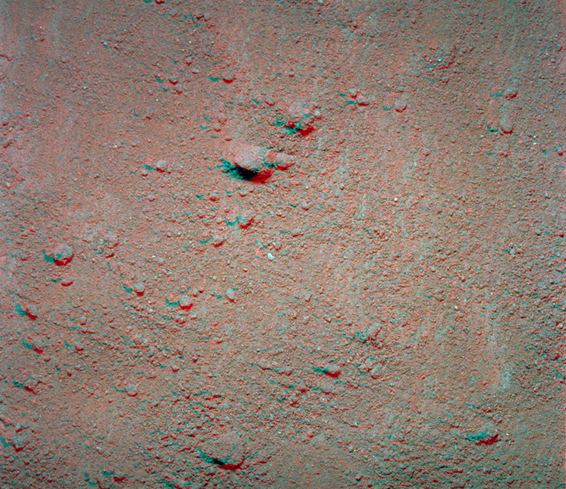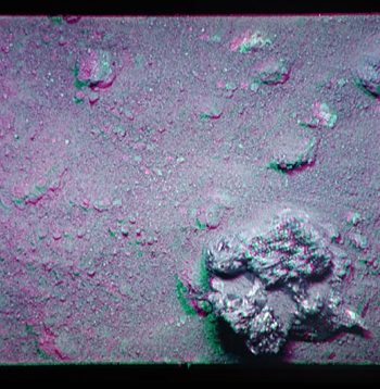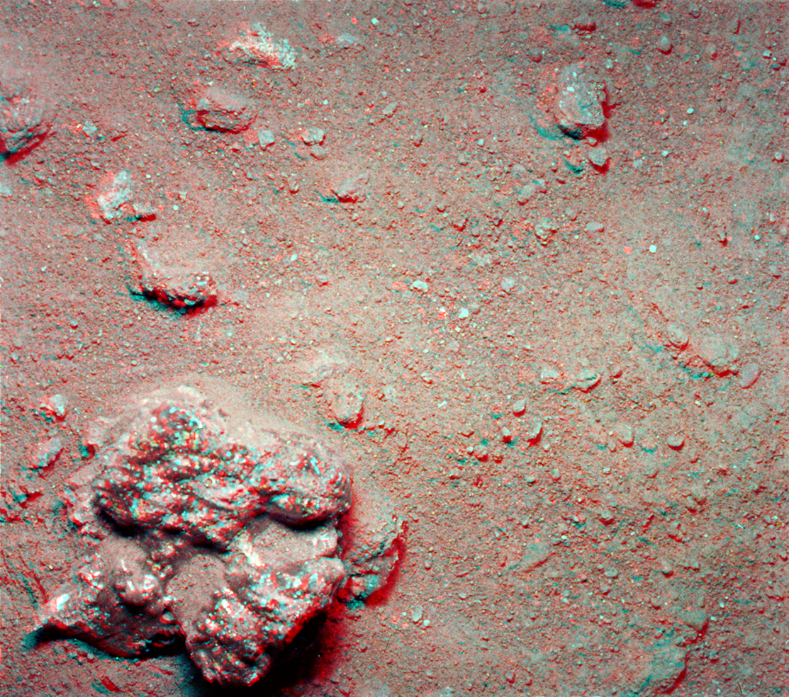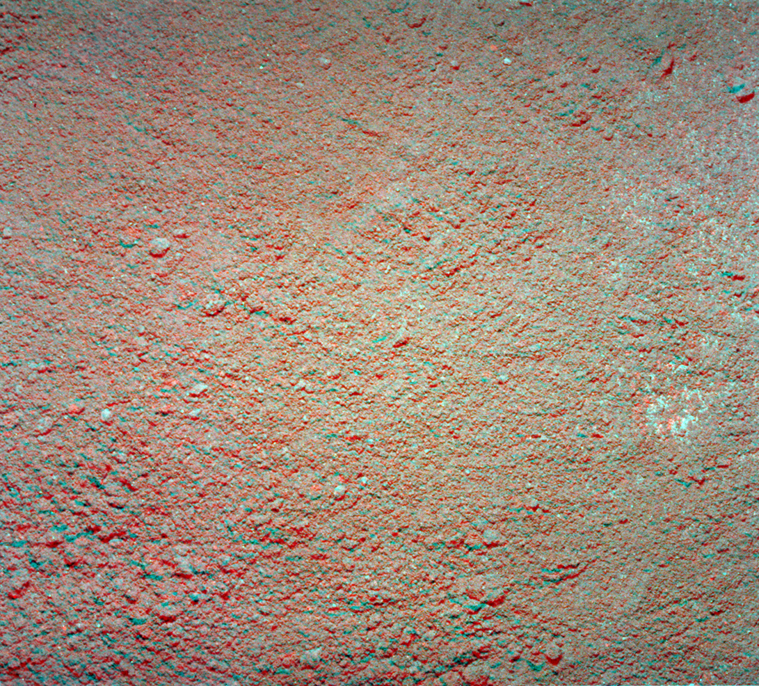 Many of the zap pits are surround by light-colored halos, which Jack Schmitt says represents a region where plagioclase crystals have been shattered. Red-blue anaglyph created by Erwin D'Hoore.AS12-57-8447 ( 1.9Mb )