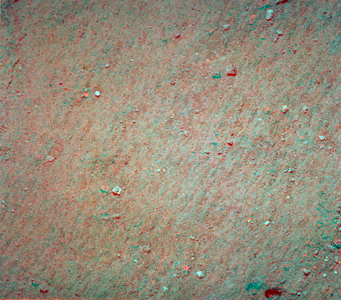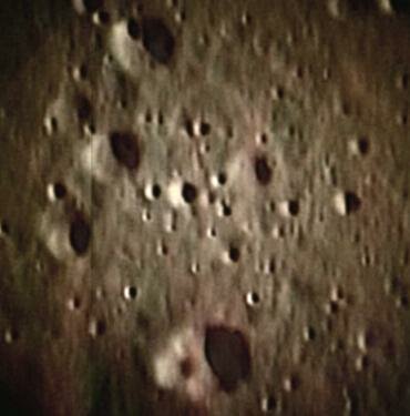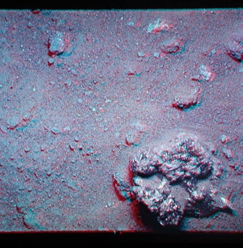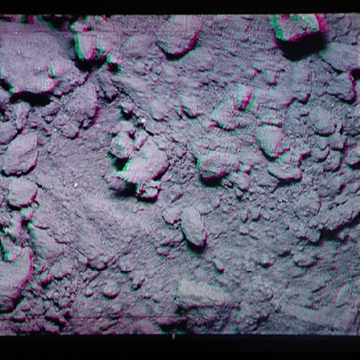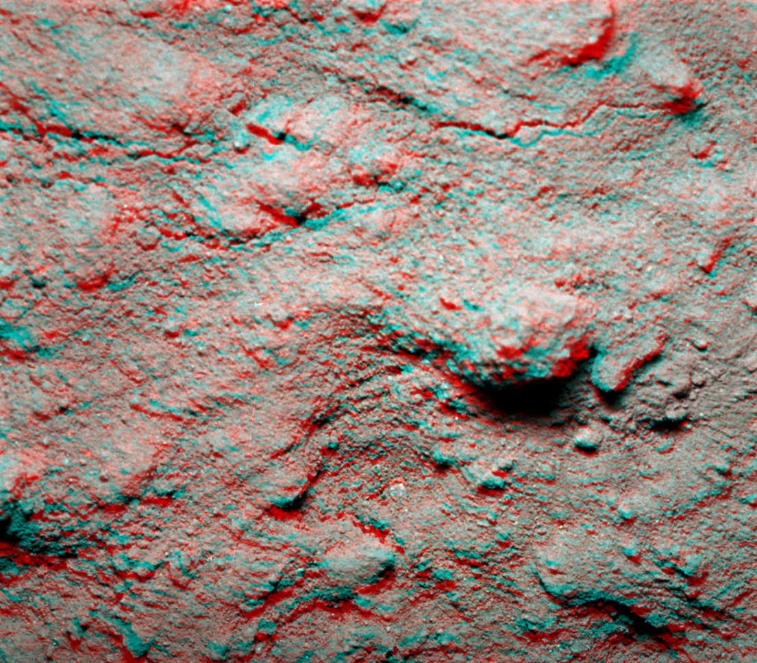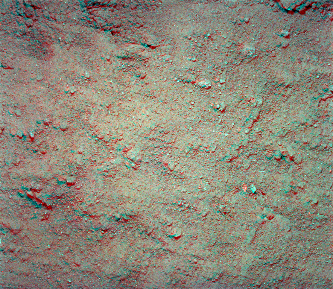 Many of the zap pits are surround by light-colored halos, which Jack Schmitt says represents a region where plagioclase crystals have been shattered. Red-blue anaglyph created by Erwin D'Hoore.AS12-57-8447 ( 1.9Mb )