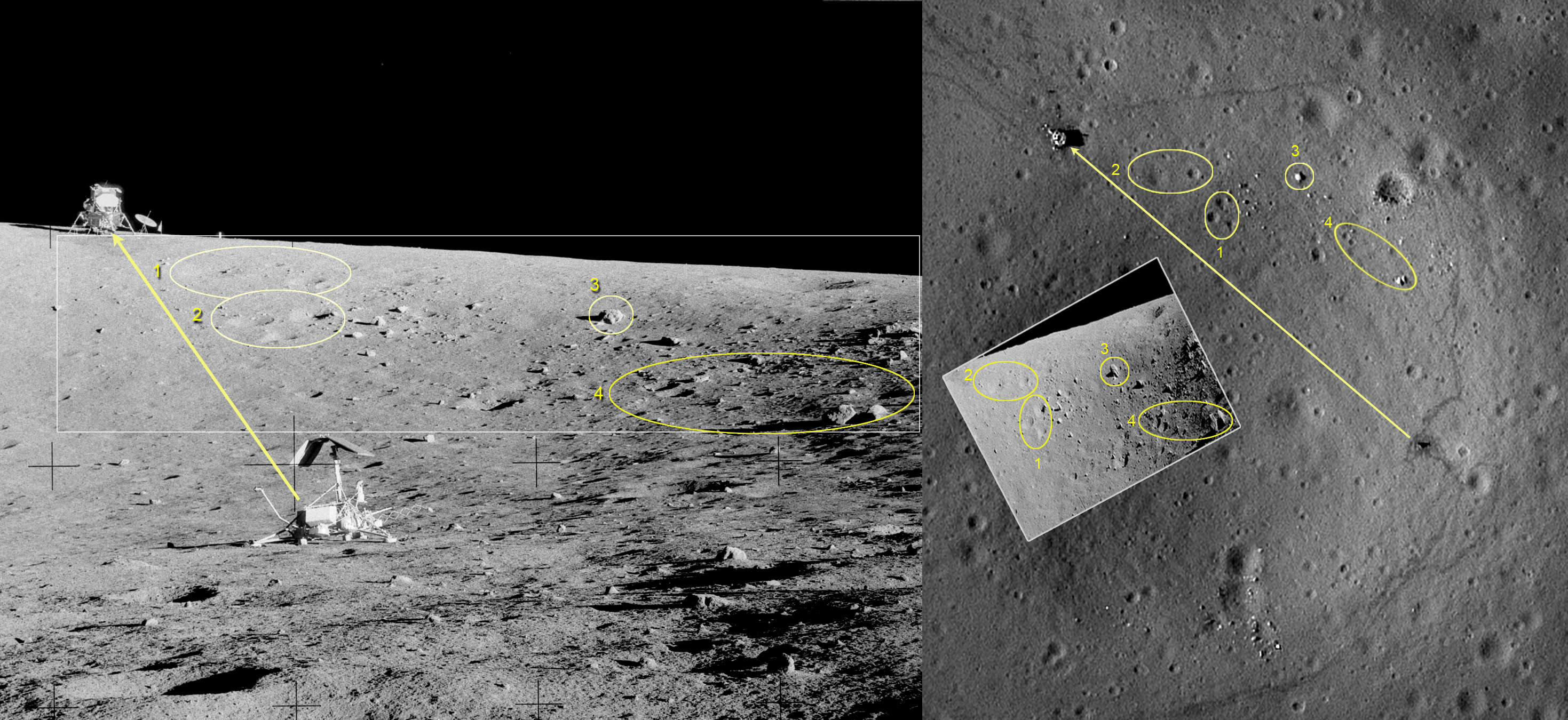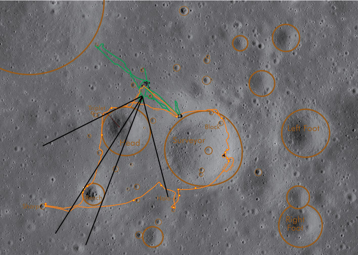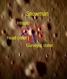 Yuri Krasilnikov has created an animated gif comparing the LROC image with the post-flight traverse map downloaded from the LPI site. Labeled versions and a link to the raw file (M104662862R) are available at the LROC website.08 September 2009 07:48:39 UTC; Solar El/Az 65.1/274.3; LRO altitude 109.3 km; resolution 1.15m/pixel. (1.1 Mb)Thomas Schwagmeier has created a composite highlighting the component craters of the Snowman.