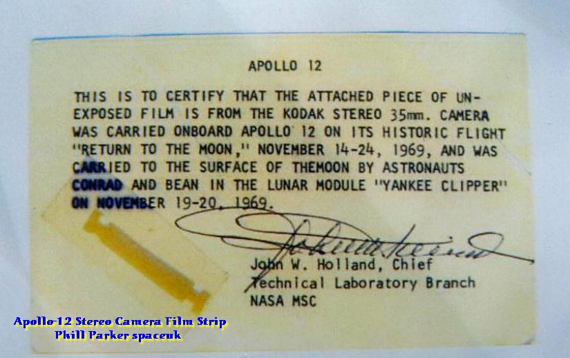 Phill Parker writes, "Here is the image of the Apollo-12 stereo camera film strip I have in my collection. These strips are probably the 'easiest' film items to collect from Apollo . They do not come up very often but there are several of them 'out there'." Note that, John W. Holland, the person who authenticated the fragment, mistakenly calls the Apollo 12 Lunar Module 'Yankee Clipper'. Sigh.Apollo 12 Geology Scoop ( 125k )