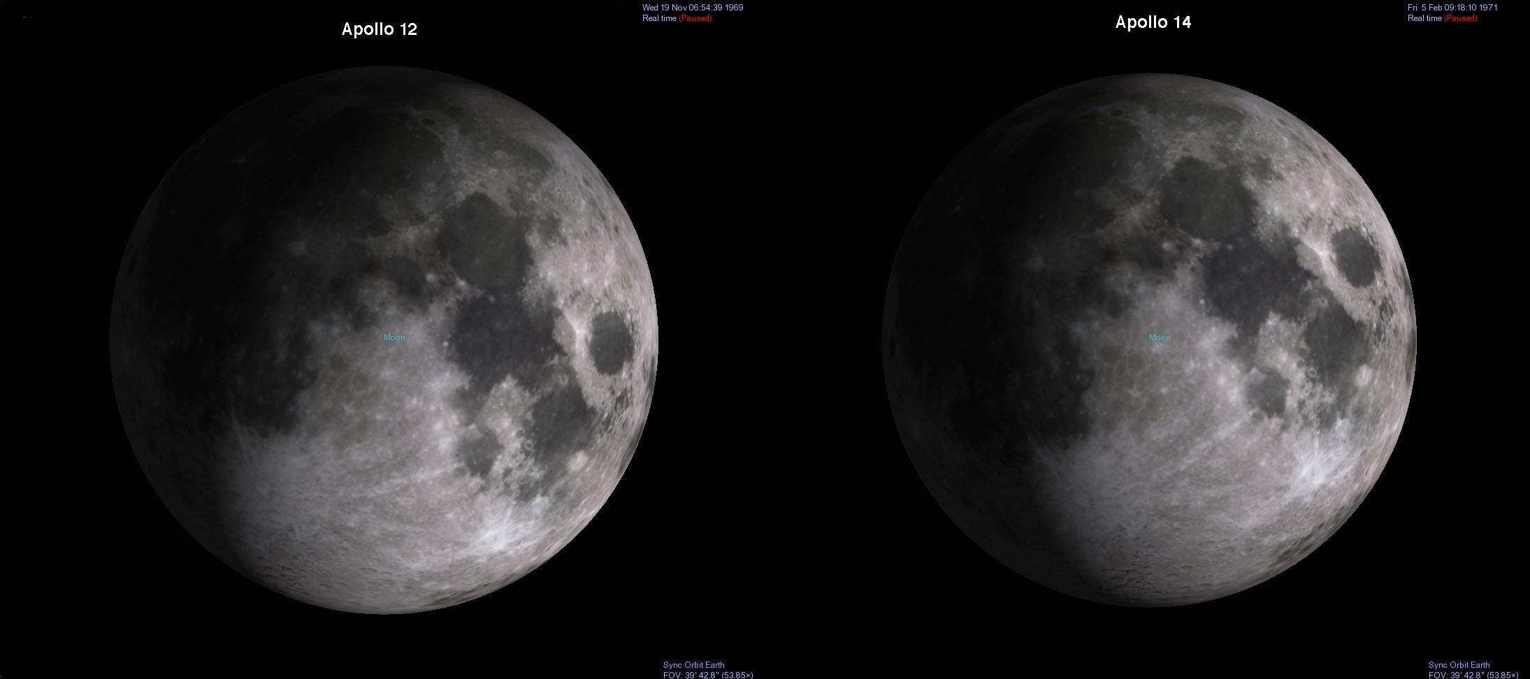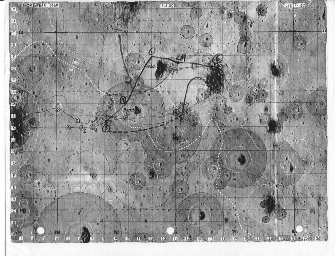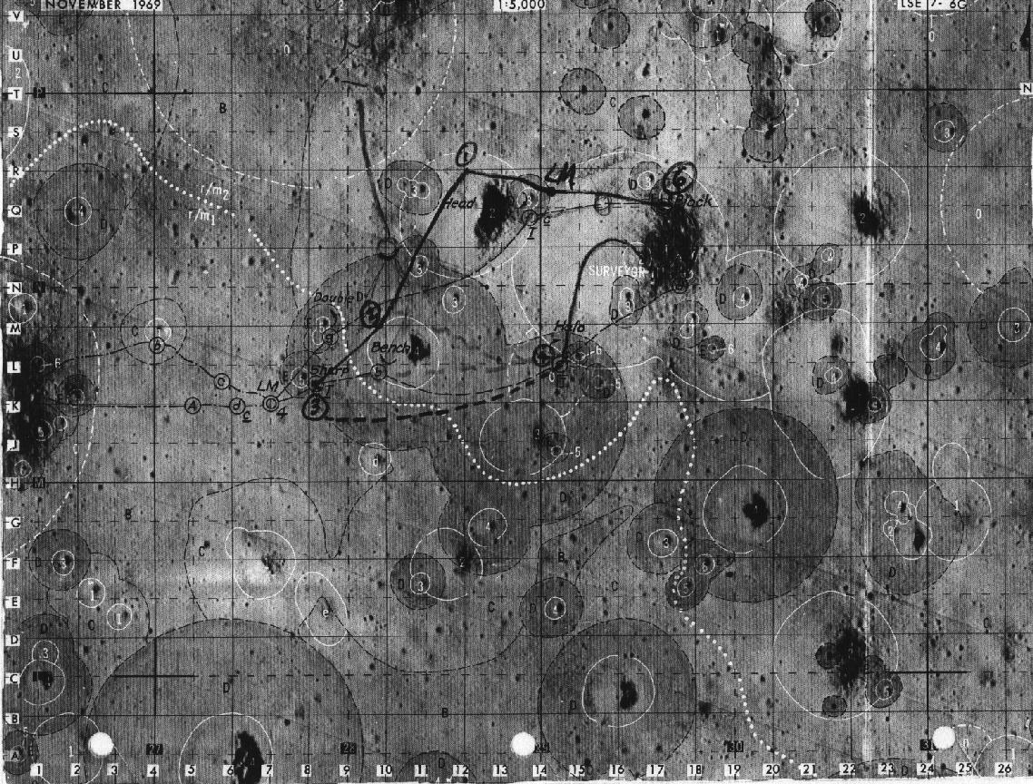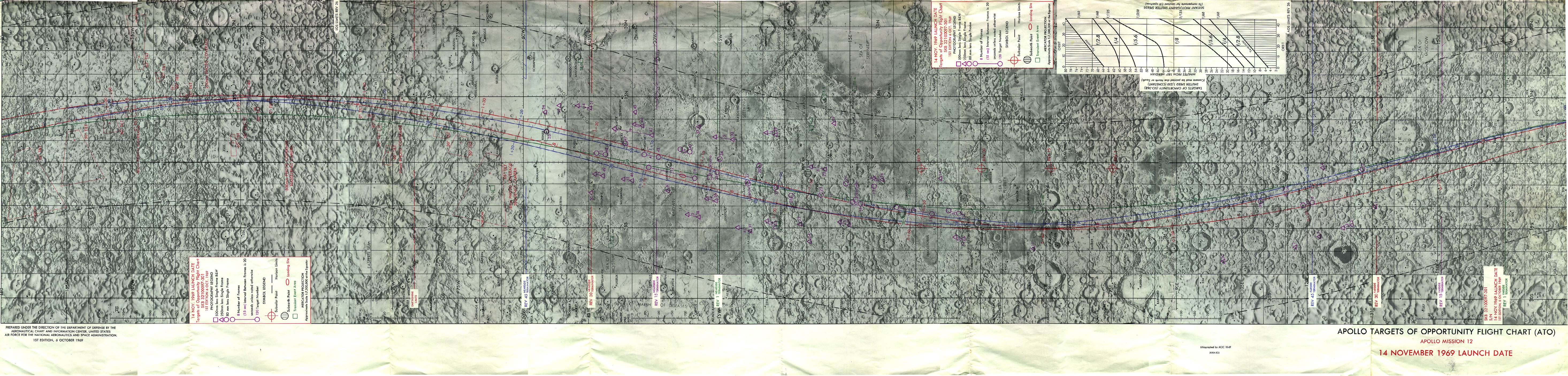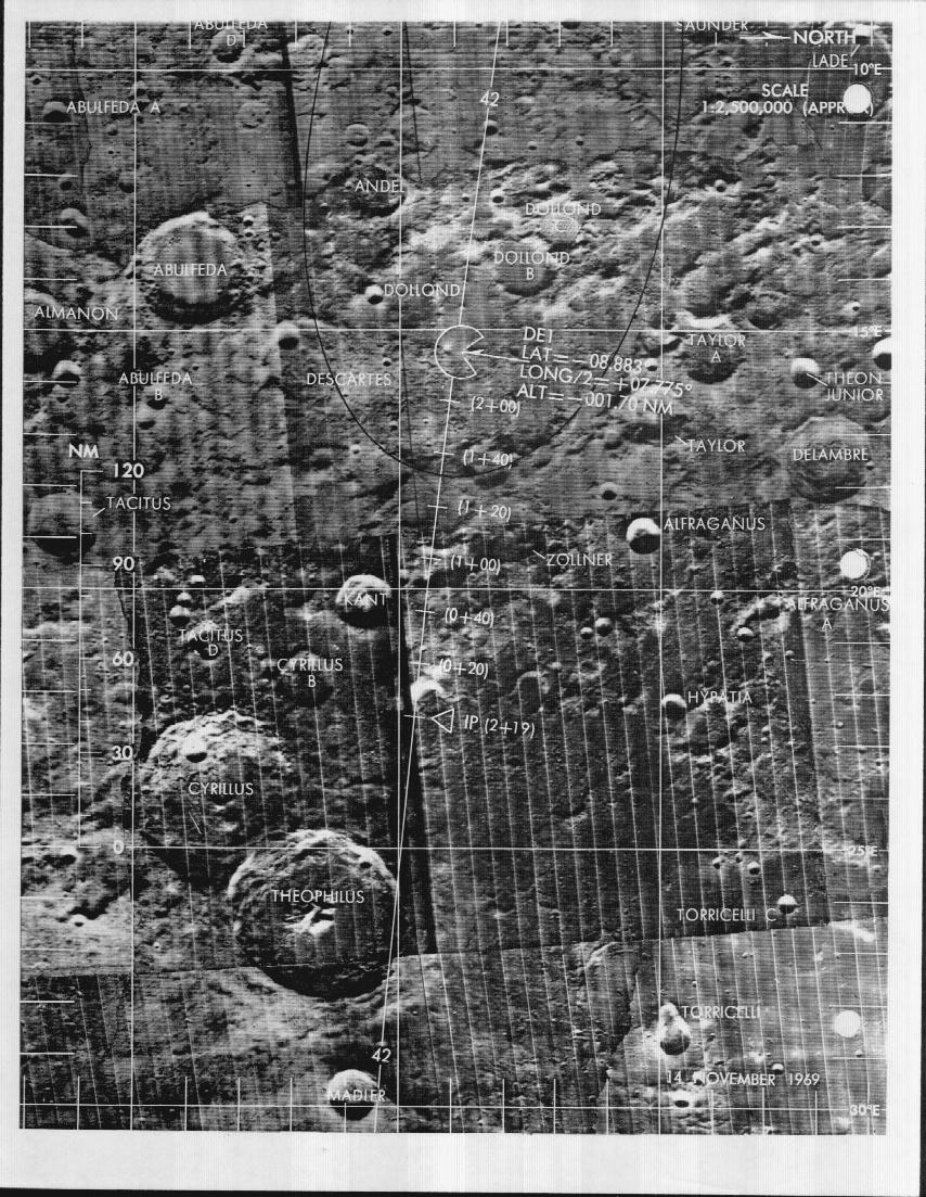 Pete and Al trained for a landing at this western site prior to the selection of the Surveyor III site for their landing. Frank O'Brien has provided an approach map (1090k) and a map showing the landing ellipse (821k) for ALS 5. See the discussion at 113:03:55.Targets of Opportunity