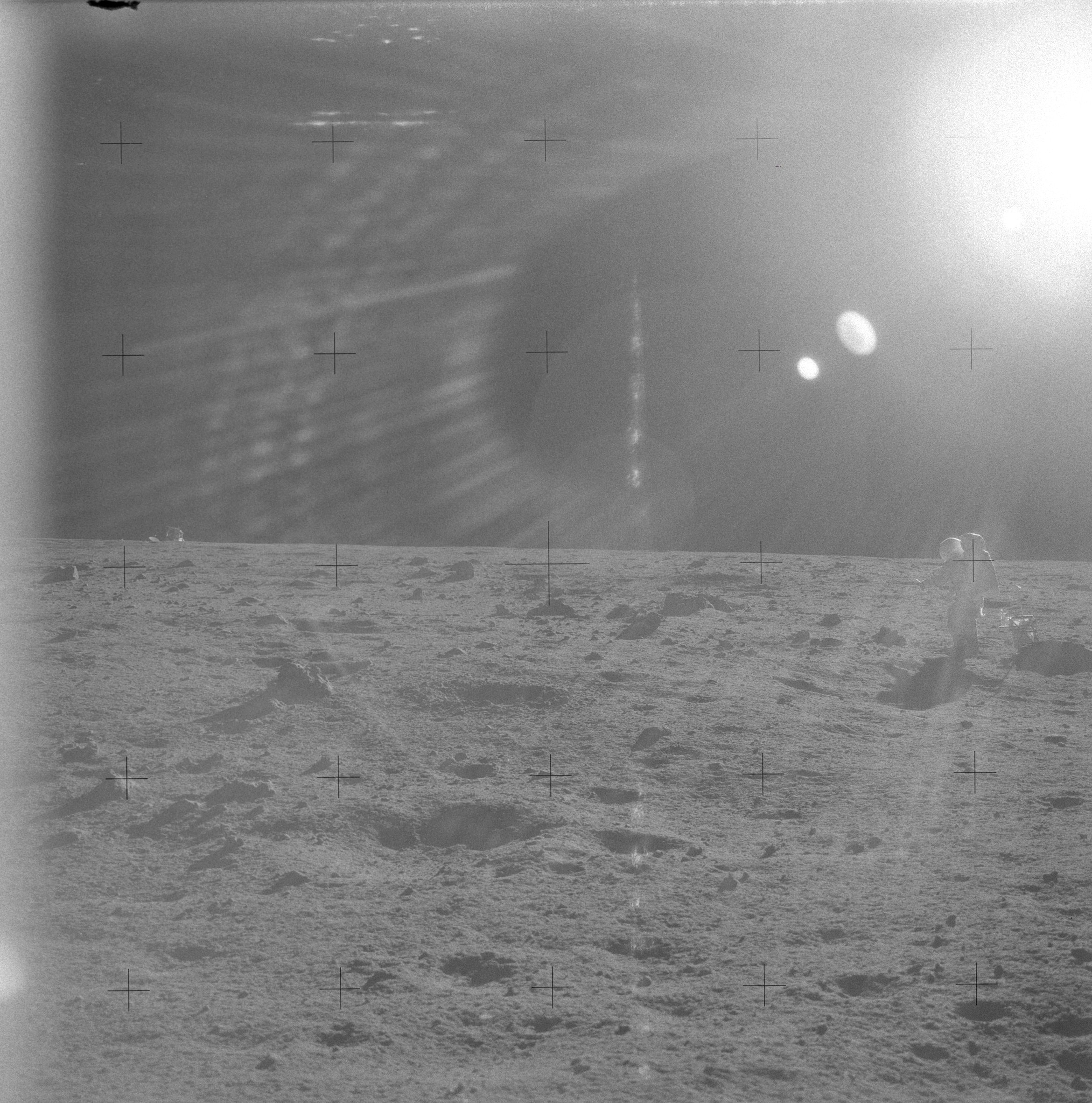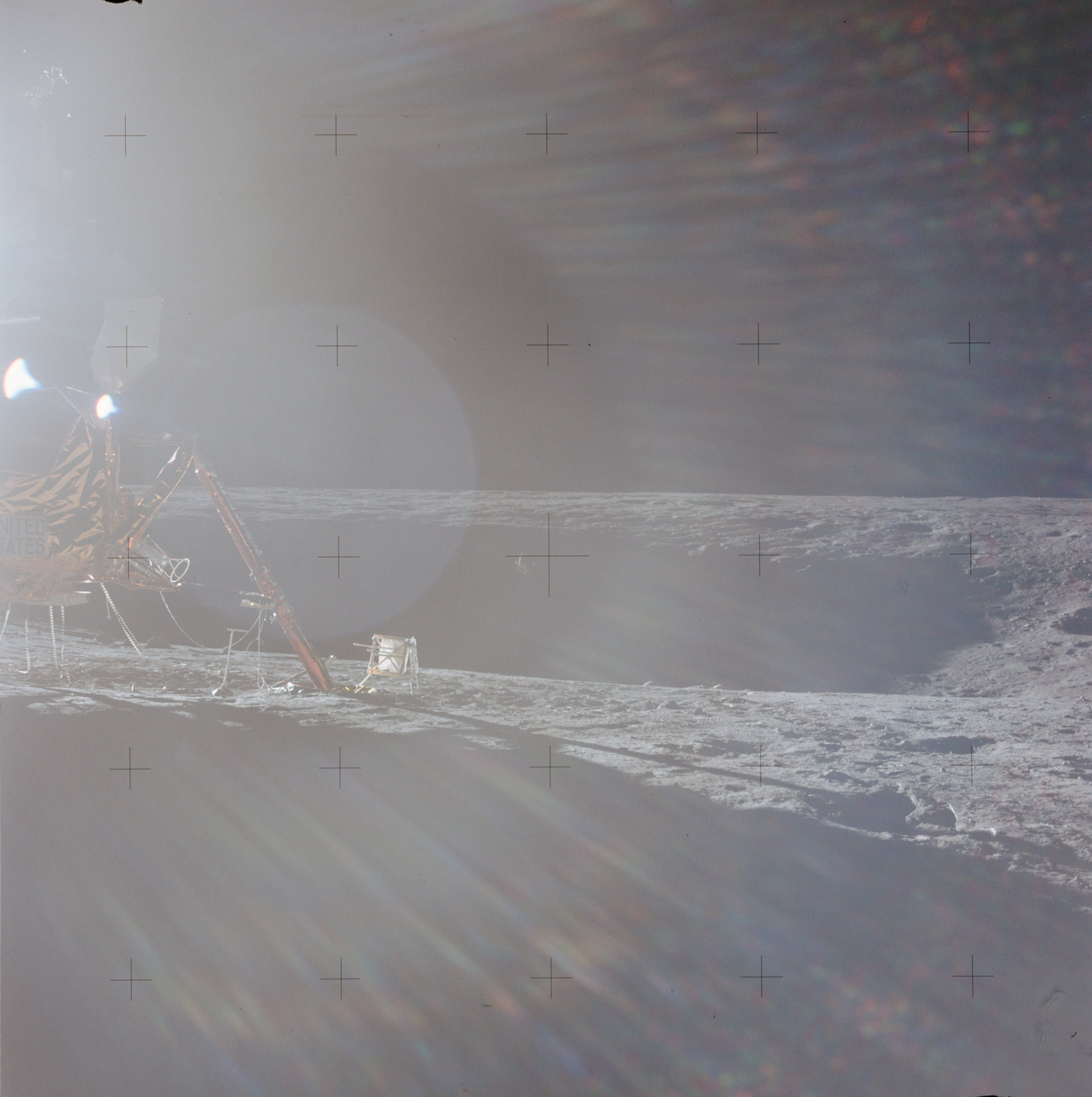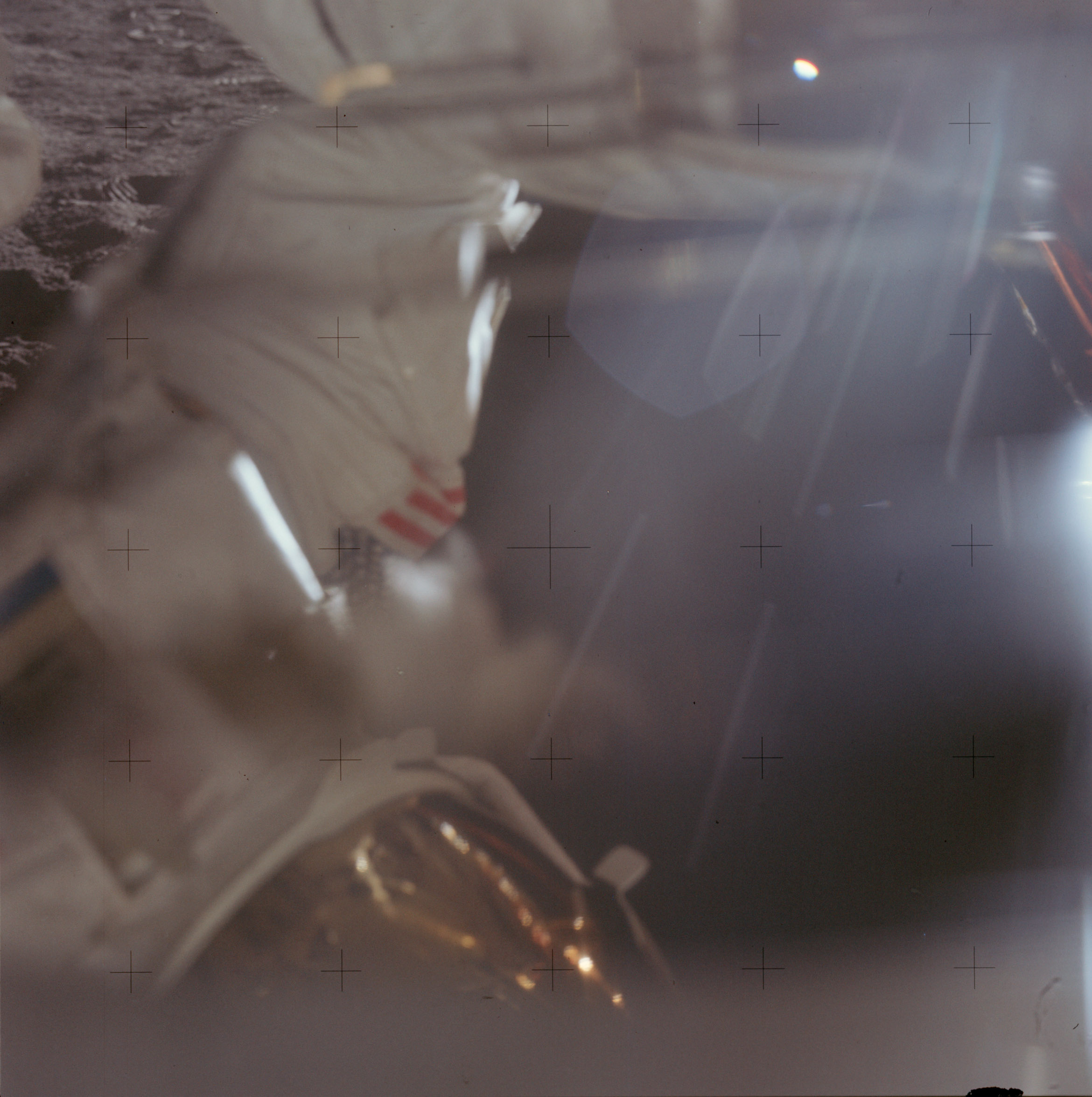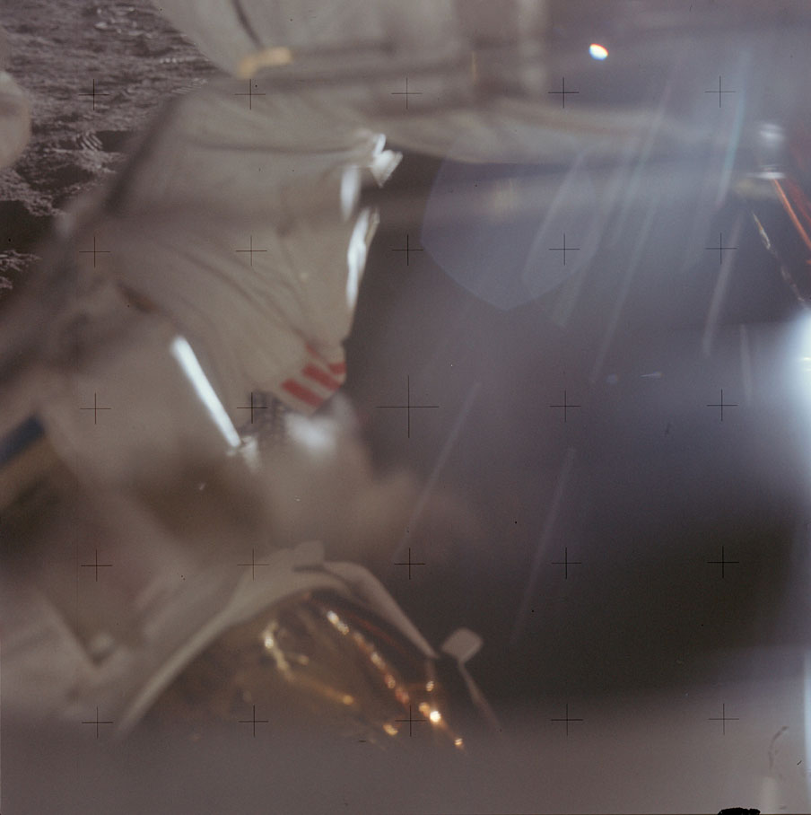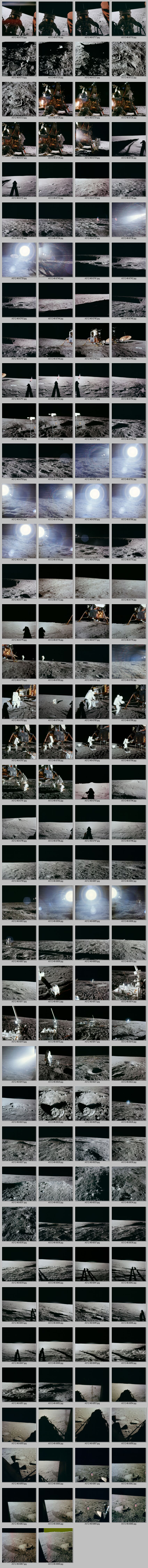 We have begun adding scans of the original film. These scans are being done by NASA Johnson, with some post-processing by Kipp Teague. The film is scanned at 4096 x 4096 pixels per image. (See a discussion from Arizona State University about the scanning process.) Kipp reduces each digital image to approximately 2350 x 2350 pixels (equivalent to 300 dpi) and does minor adjustments of levels to ensure that (1) brightly lit areas of lunar soil are neutral grey, (2) objects with known colors (such as the CDR stripes or the LCRU blankets) look right, and (3) information in bright or dark areas is not lost. These images from original film are indicated by the notation 'OF300' in the image description. In each case, a 900 x 900 pixel version is also provided.
