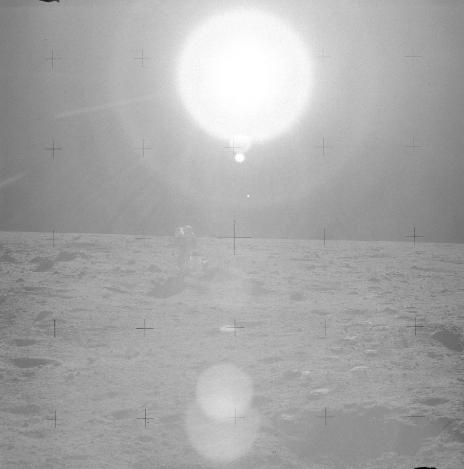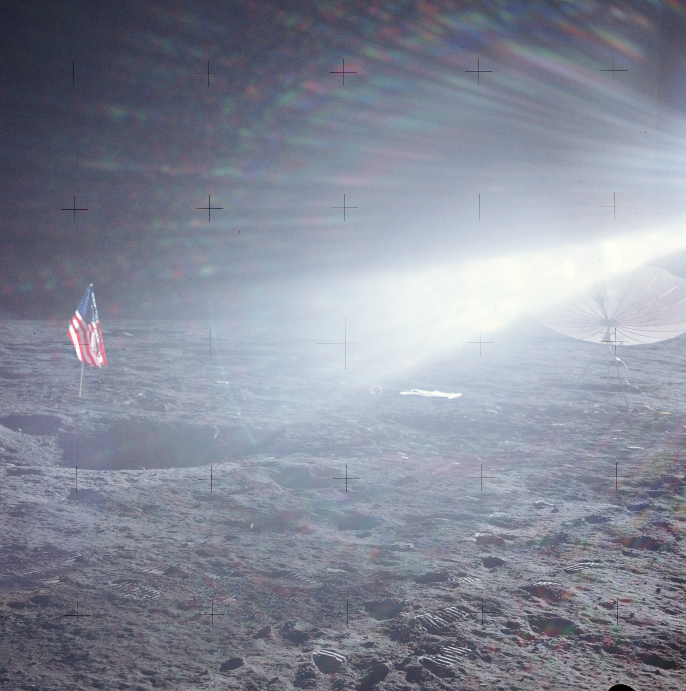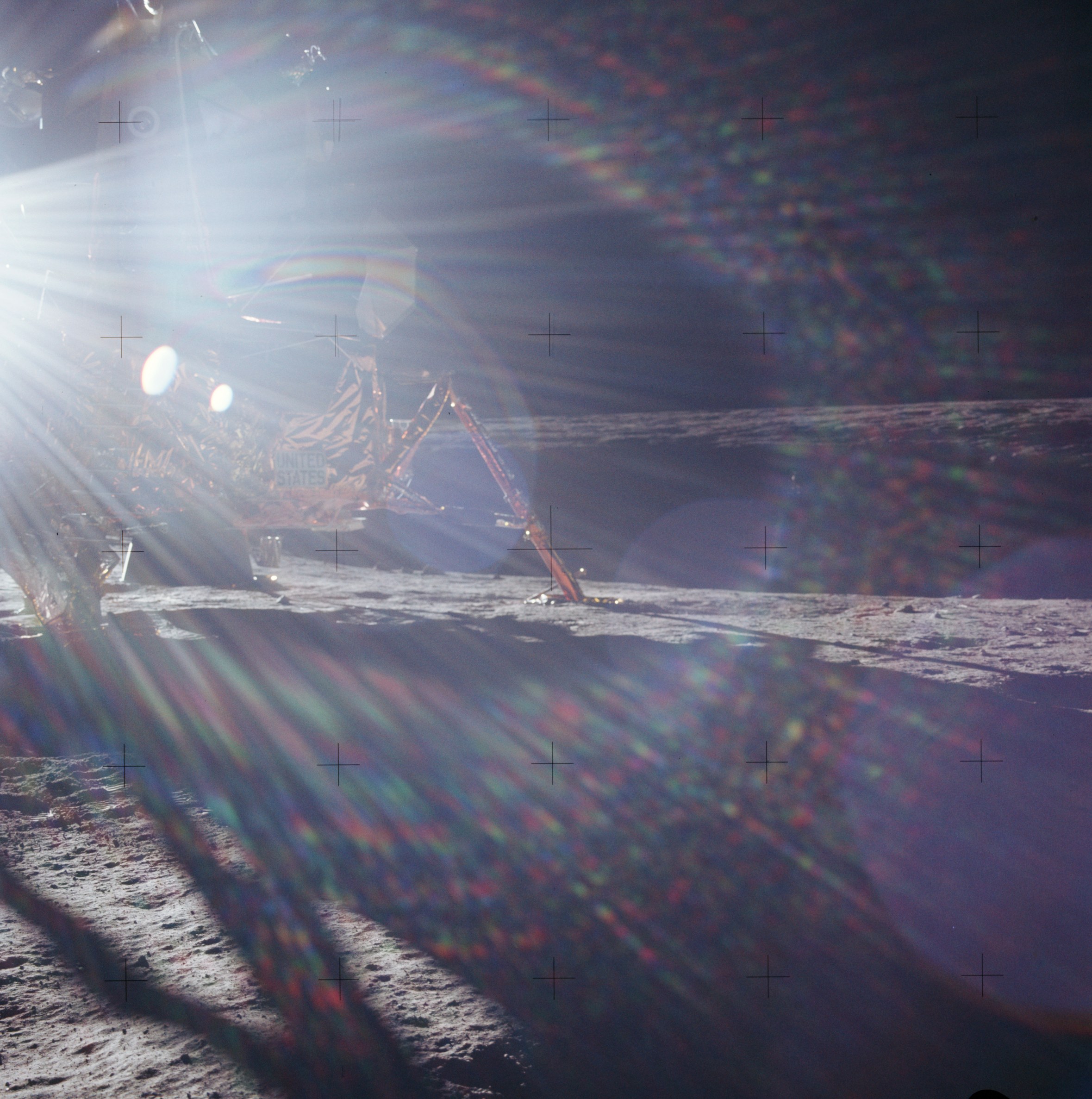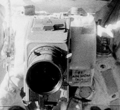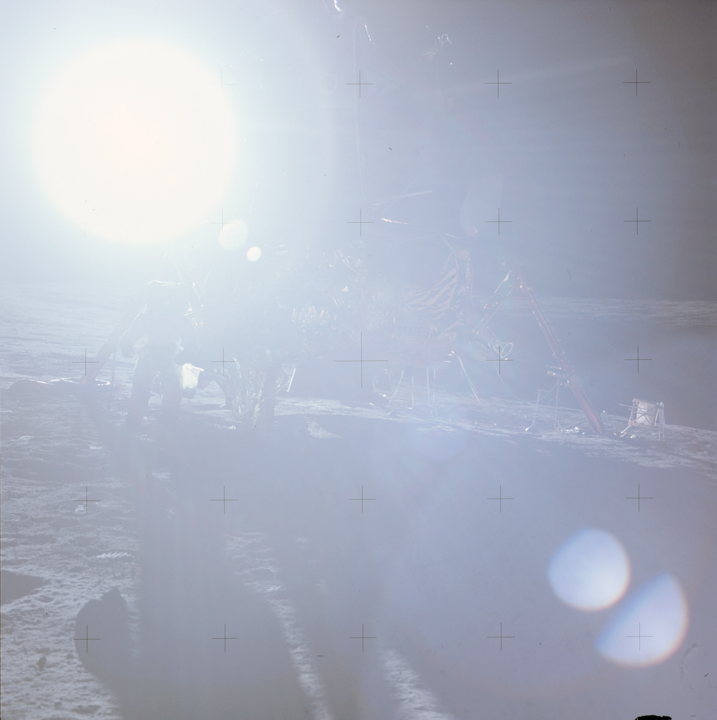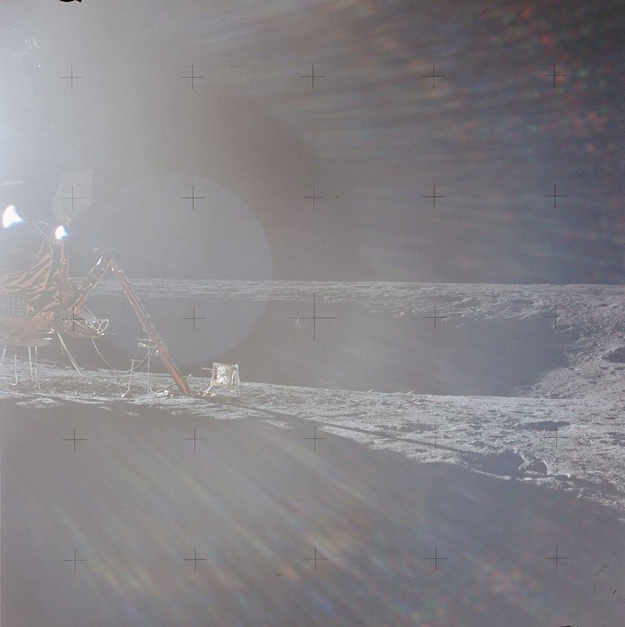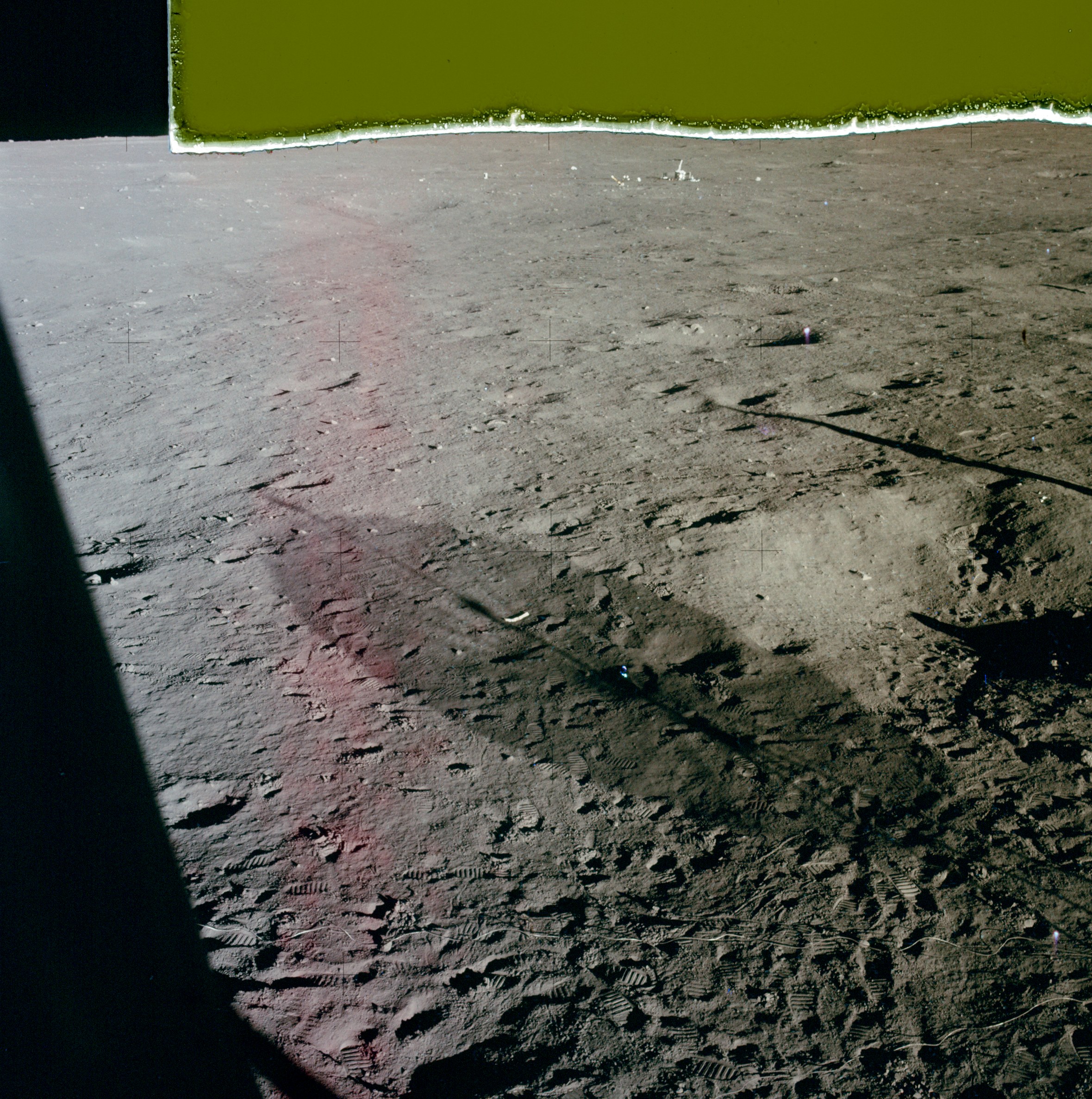 We have begun adding scans of the original film. These scans are being done by NASA Johnson, with some post-processing by Kipp Teague. The film is scanned at 4096 x 4096 pixels per image. (See a discussion from Arizona State University about the scanning process.) Kipp reduces each digital image to approximately 2350 x 2350 pixels (equivalent to 300 dpi) and does minor adjustments of levels to ensure that (1) brightly lit areas of lunar soil are neutral grey, (2) objects with known colors (such as the CDR stripes or the LCRU blankets) look right, and (3) information in bright or dark areas is not lost. These images from original film are indicated by the notation 'OF300' in the image description. In each case, a 900 x 900 pixel version is also provided.