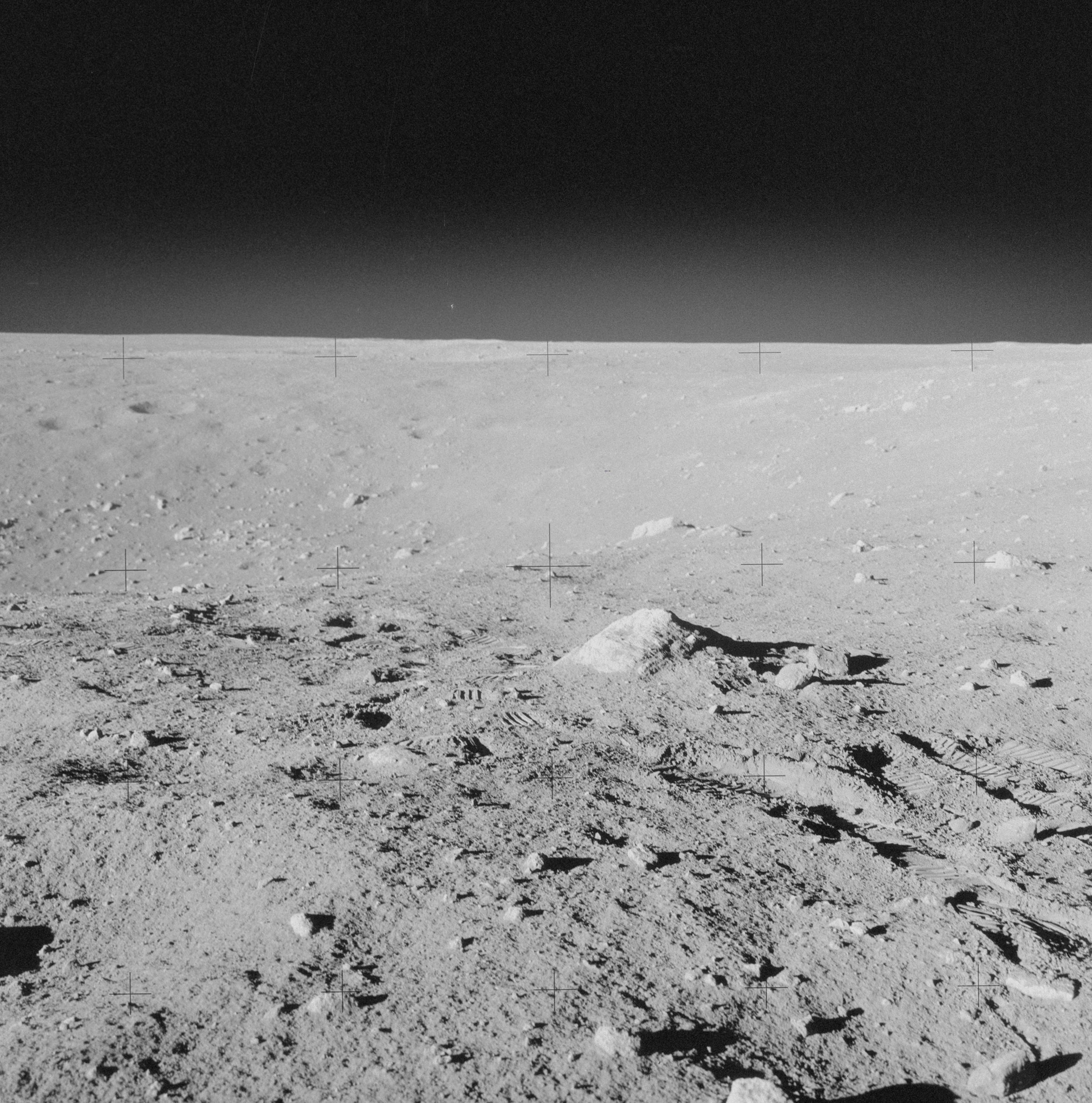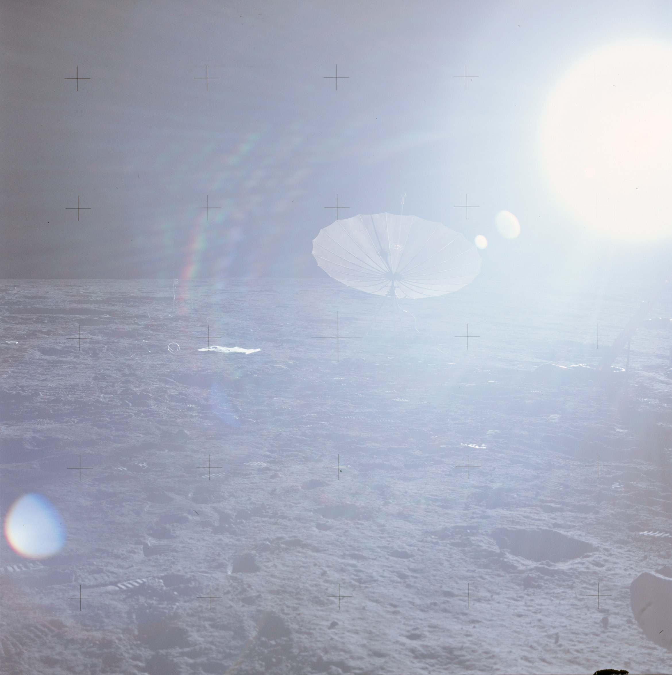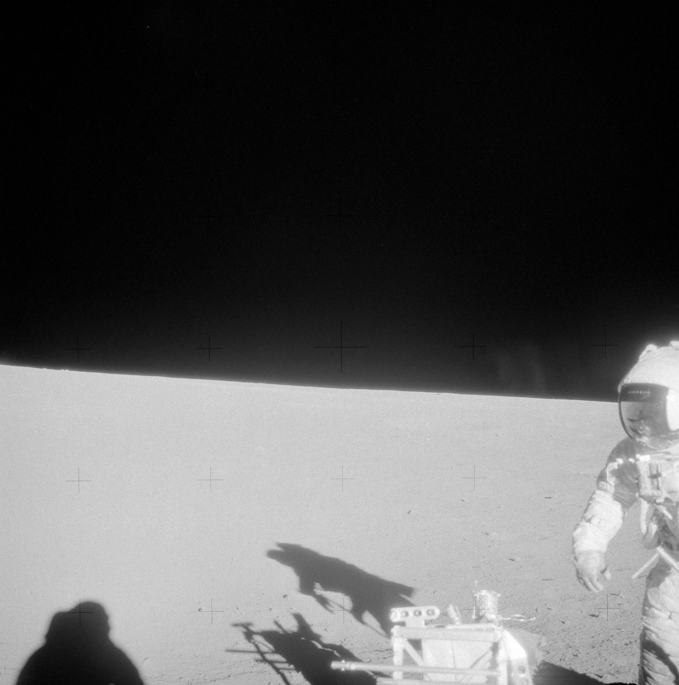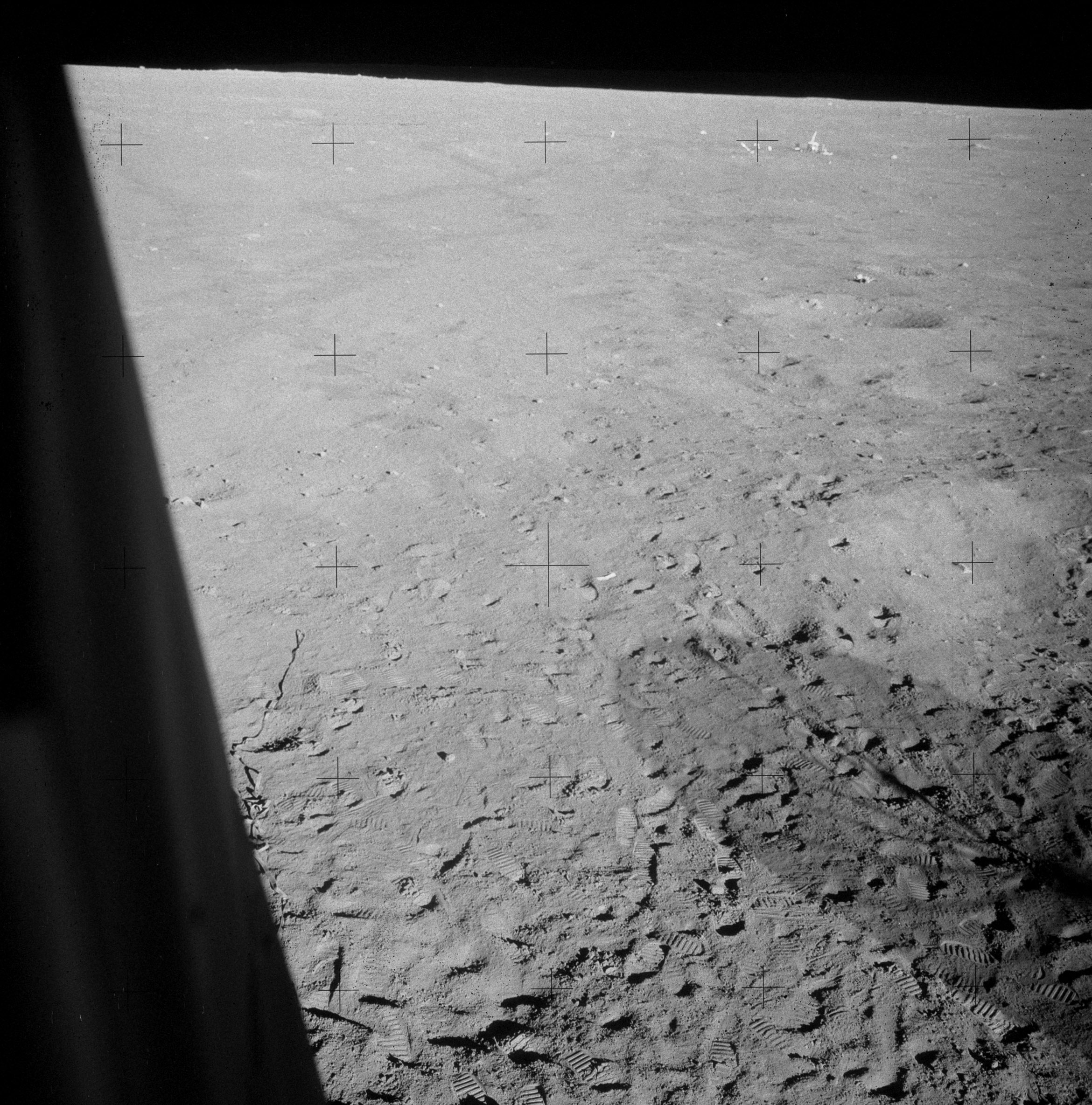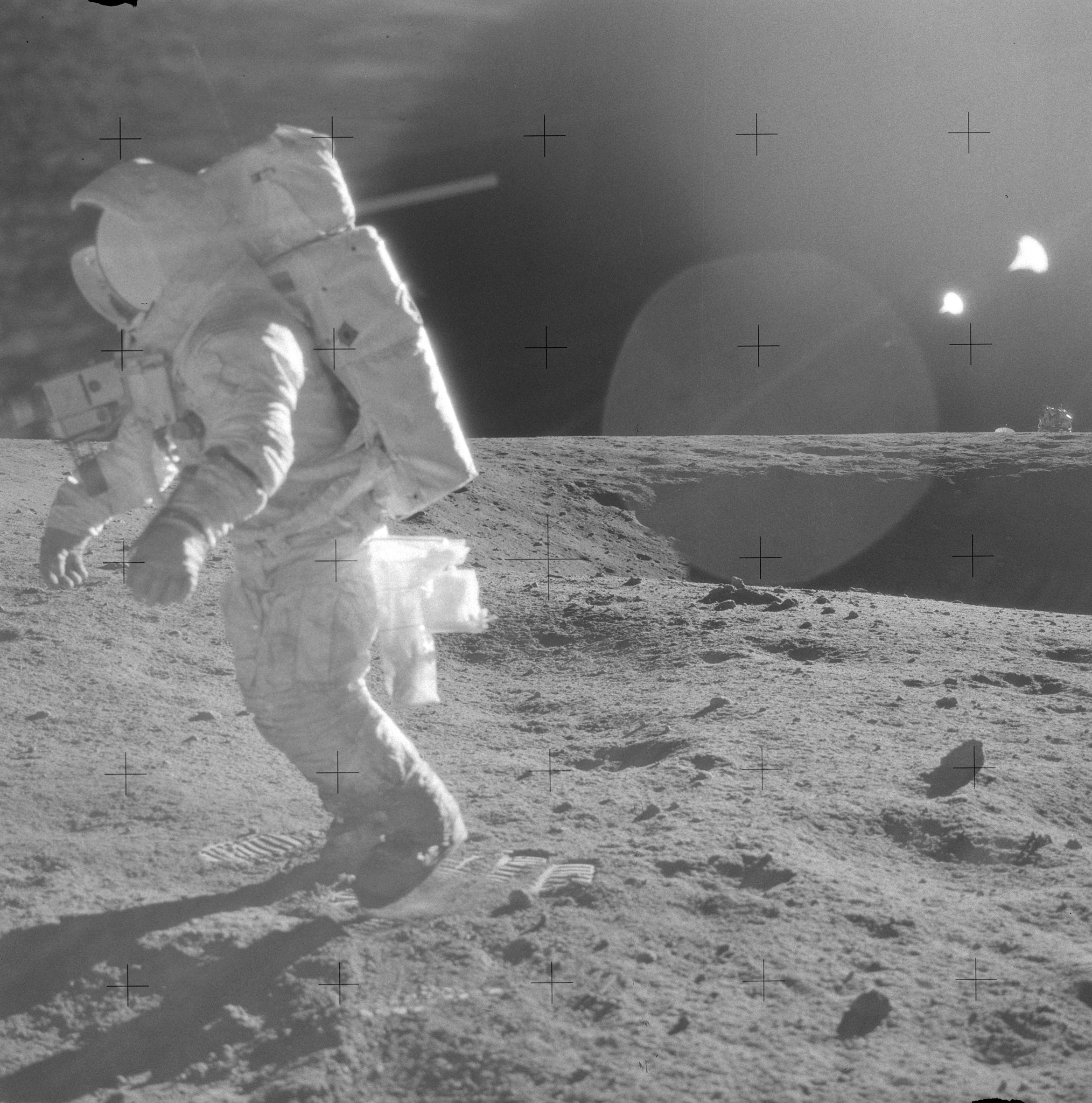We have begun adding scans of the original film. These scans are being done by NASA Johnson, with some post-processing by Kipp Teague. The film is scanned at 4096 x 4096 pixels per image. (See a discussion from Arizona State University about the scanning process.) Kipp reduces each digital image to approximately 2350 x 2350 pixels (equivalent to 300 dpi) and does minor adjustments of levels to ensure that (1) brightly lit areas of lunar soil are neutral grey, (2) objects with known colors (such as the CDR stripes or the LCRU blankets) look right, and (3) information in bright or dark areas is not lost. These images from original film are indicated by the notation 'OF300' in the image description. In each case, a 900 x 900 pixel version is also provided.